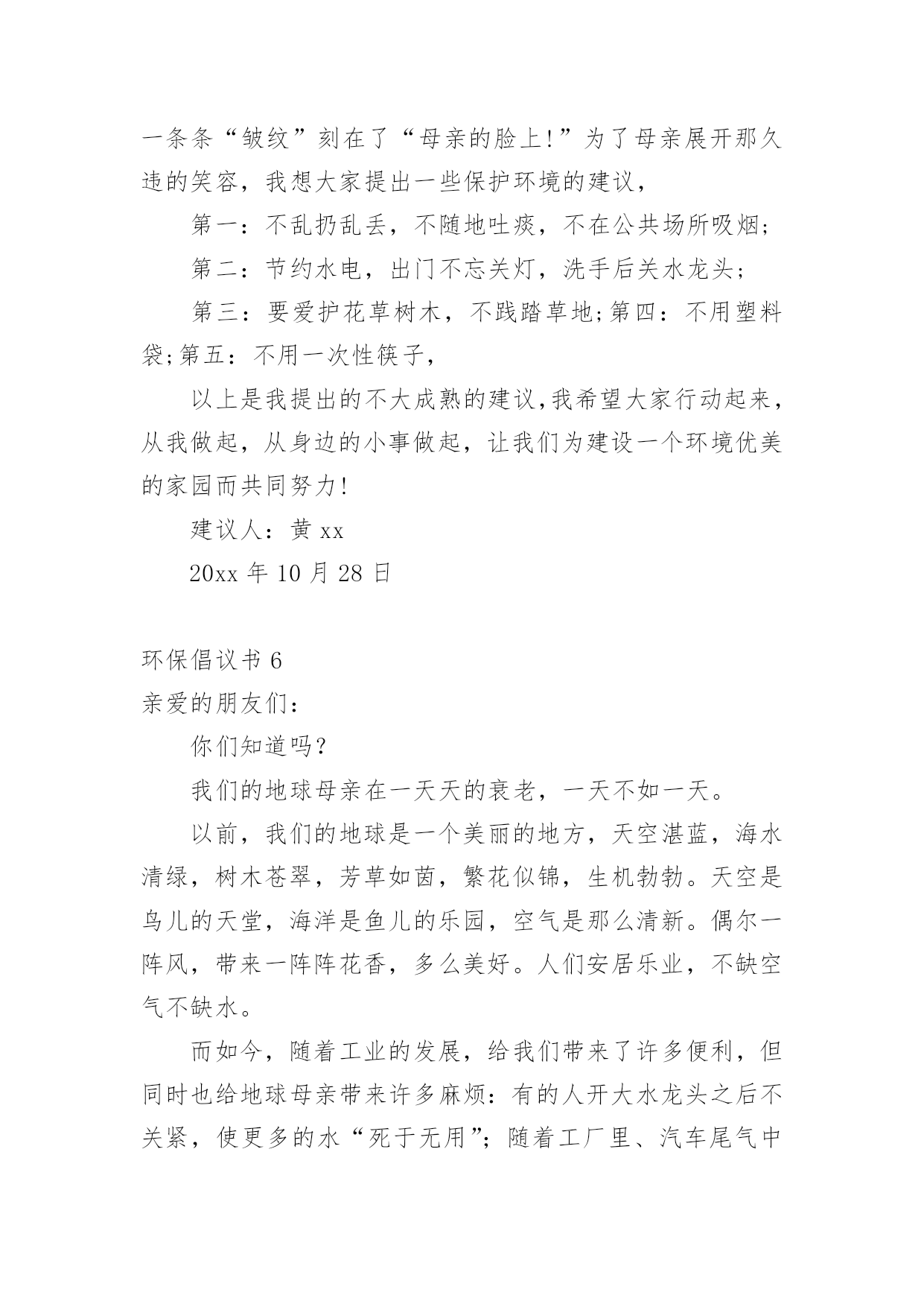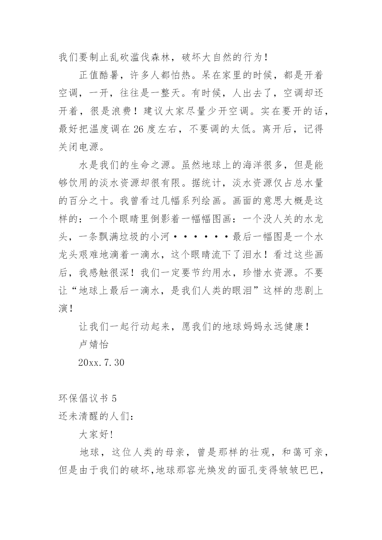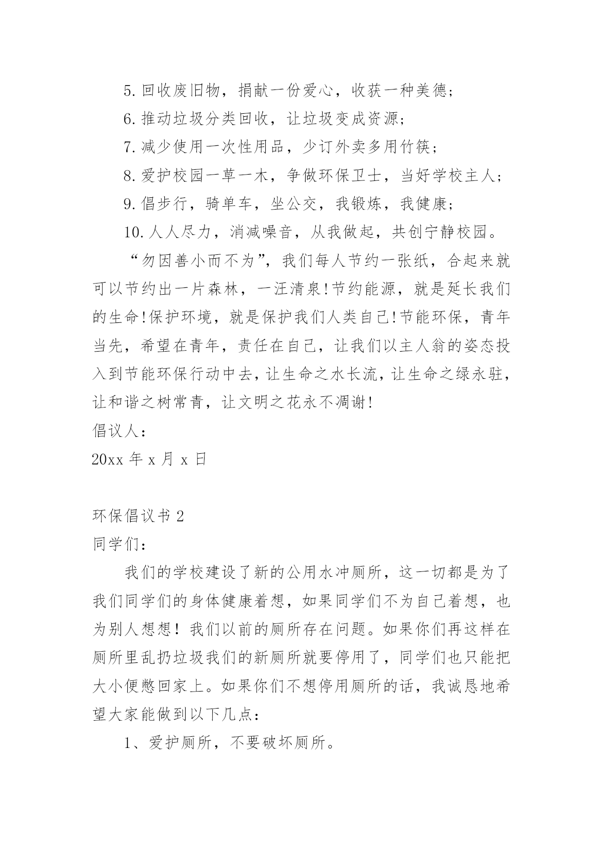 环保倡议书环保倡议书【荐】在快速变化和不断变革的新时代,越来越多人会去使用倡议书,倡议书一般由标题、称呼、正文、结尾、落款五部分组成。相信写倡议书是一个让许多人都头痛的问题,以下是小编为大家收集的环保倡议书,希望能够帮助到大家。环保倡议书1亲爱的同学们:地球只有一个,美丽和谐的家园需要我们所有人共同努力来维护。现状已不容乐观,为了让建设好资源节约型、环境友好型社会的美好目标不再遥不可及,让山更青一些、天更蓝一些,我们呼吁所有同学和我们一起携手,从我做起,从身边事做起,从小事做起,为节能环保献出一份力量。当代大学生是节能环保的主力军,应时时为节能环保做好先锋模范作用。为此,我们特向全校青年大学生们发出以下倡议:1.离开寝室、教室牢记随手关灯,做到“无人在,无灯开”;2.用水完毕千万拧紧水龙头,勿让生命之水常空流;3.每天上网时间减少一小时,减少不必要的待机状态;4.节约用纸,双面使用,珍惜有限森林资源;5.回收废旧物,捐献一份爱心,收获一种美德;6.推动垃圾分类回收,让垃圾变成资源;7.减少使用一次性用品,少订外卖多用竹筷;8.爱护校园一草一木,争做环保卫士,当好学校主人;9.倡步行,骑单车,坐公交,我锻炼,我健康;10.人人尽力,消减噪音,从我做起,共创宁静校园。“勿因善小而不为”,我们每人节约一张纸,合起来就可以节约出一片森林,一汪清泉!节约能源,就是延长我们的生命!保护环境,就是保护我们人类自己!节能环保,青年当先,希望在青年,责任在自己,让我们以主人翁的姿态投入到节能环保行动中去,让生命之水长流,让生命之绿永驻,让和谐之树常青,让文明之花永不凋谢!倡议人:20xx年x月x日环保倡议书2同学们:我们的学校建设了新的公用水冲厕所,这一切都是为了我们同学们的身体健康着想,如果同学们不为自己着想,也为别人想想!我们以前的厕所存在问题。如果你们再这样在厕所里乱扔垃圾我们的新厕所就要停用了,同学们也只能把大小便憋回家上。如果你们不想停用厕所的话,我诚恳地希望大家能做到以下几点:1、爱护厕所,不要破坏厕所。2、不在马桶里扔垃圾和杂物。3、不在厕所里打闹或戏弄他人。4、上完厕所后及时冲厕所。文明公厕,从我做起,从身边的小事做起,同学们让我们行动起来吧!倡议人:六二班王XX环保倡议书3每年中秋节,都会有大批游客和群众前来遮浪奇观景区观海、听涛、赏月。欢度佳节期间,乱扔垃圾、随意烧烤、燃放烟花爆竹等行为时有发生,给景区管理和环境保护带来不少问题。为保护好难得的滨海资源,弘扬传统文化、树立文明新风,引导全区人民群众过一个温馨、节俭、文明、和谐的中秋佳节,团团君特向广大游客和群众提出以下倡议:01讲文明,我做起,确保垃圾不落地。让“垃圾不落地”成为我们的自觉行动,不乱扔垃圾、果皮、纸屑,不随地吐痰,让景区保持干净卫生,让心情保持舒畅美丽。食物吃完或烧烤结束后,用塑料袋装好扔进垃圾桶里或随手把垃圾装袋带走。02讲文明,共传递,减少烟花更美丽。请大家奔走相告,为了保护美丽的沙滩,景区内严禁燃放烟花炮竹和孔明灯,当然也严禁烧烤。在景区外的区域也请大家尽量减少烟花炮竹、孔明灯燃放,减少炮竹垃圾产生,对空气的污染,让我们呼吸清新空气。环保倡议书4亲爱的地球同胞们:大家好!我是一名小学生。由于环境污染给我们的生存空间带来了严重的威胁,我们赖以生存的地球环境逐渐恶化。所以,我写了这封建议书,倡导大家爱护环境,保护我们的地球!我们知道,一直孕育着我们人类的是地球妈妈。如果没有她,我们将无法生存。人类有其他动物所没有的智慧,因此我们被赋予了高等动物的桂冠。我们利用这些智慧,创造了各式各样的工具,建造了许许多多的工厂,为我们现在的生活带来了许多的便利。但是,我们在享受日益富裕物质生活的同时,是不是也该考虑下我们地球妈妈的健康问题?如今,白色垃圾到处可见,淡水污染严重,空气质量也越来越差,这些是不是应该引起我们的注意呢?随着人们生活水平的提高,如今有私家车的家庭越来越多!而汽车在方便人们的同时,也带来越来越严重的污染。汽车排出的尾气每天都在污染着我们呼吸的空气!在炎热的夏季,马路上全是汽车。只要一靠近车身,就会感到阵阵热浪扑面而来!还有刺鼻的气味,实在难闻!针对这种现象,我倡导多步行、骑自行车或坐公交车,少开私家车。同时,我们还要植树造林。森林能吸收二氧化碳,帮我们净化空气!我们要制止乱砍滥伐森林,破坏大自然的行为!正值酷暑,许多人都怕热。呆在家里的时候,都是开着空调,一开,往往是一整天。有时候,人出去了,空调却还开着,很是浪费!建议大家尽量少开空调。实在要开的话,最好把温度调在26度左右,不要调的太低。离开后,记得关闭电源。水是我们的生命之源。虽然地球上的海洋很多,但是能够饮用的淡水资源却很有限。据统计,淡水资源仅占总水量的百分之十。我曾看过几幅系列绘画。画面