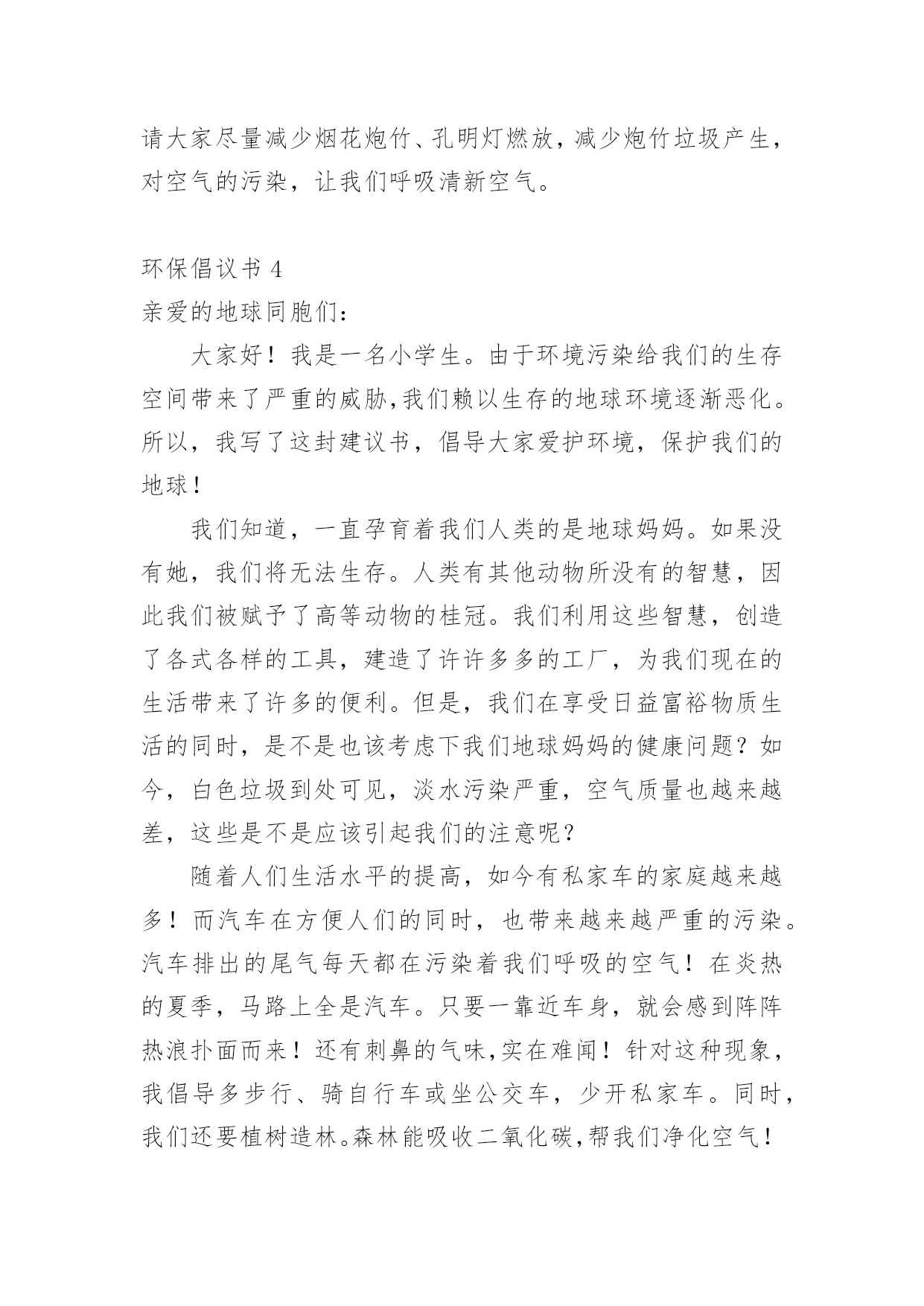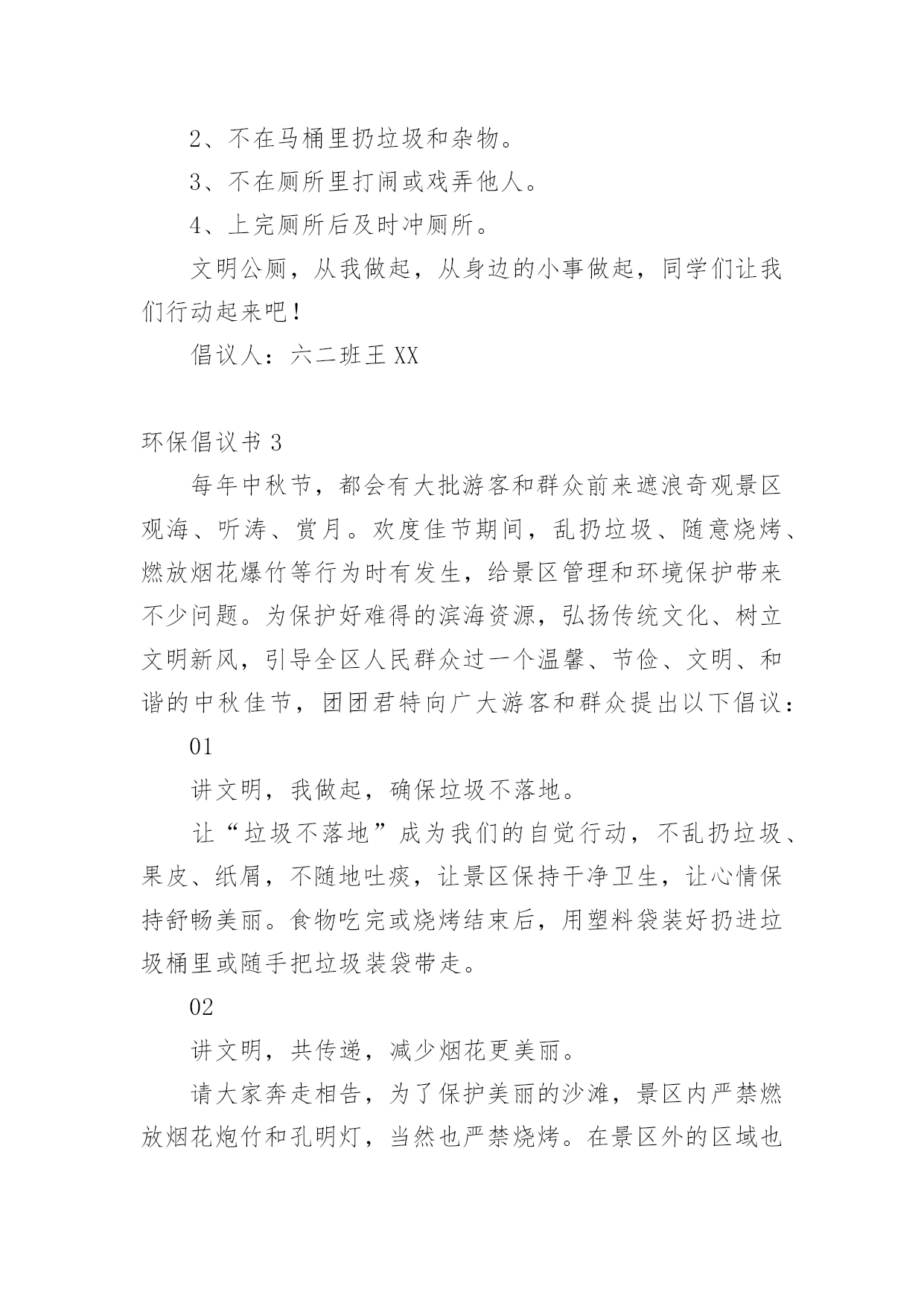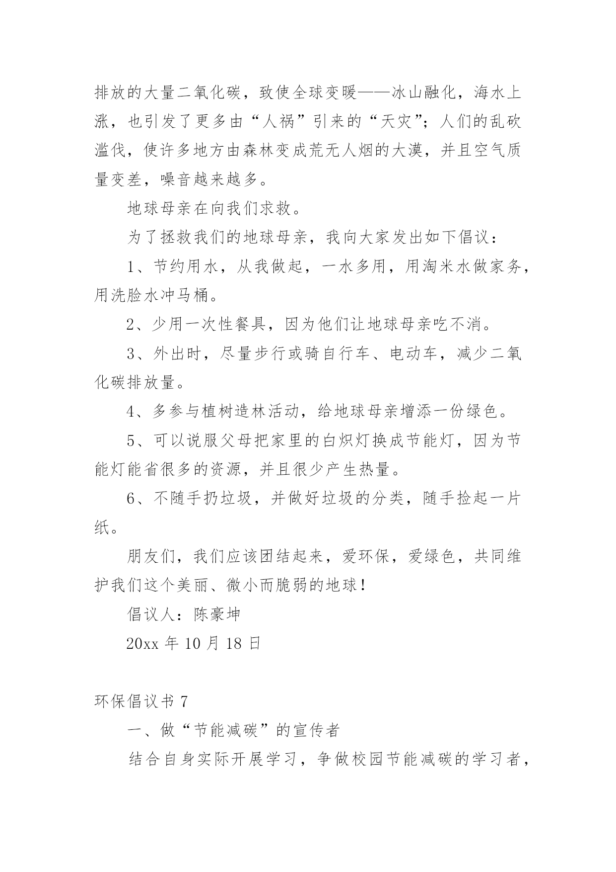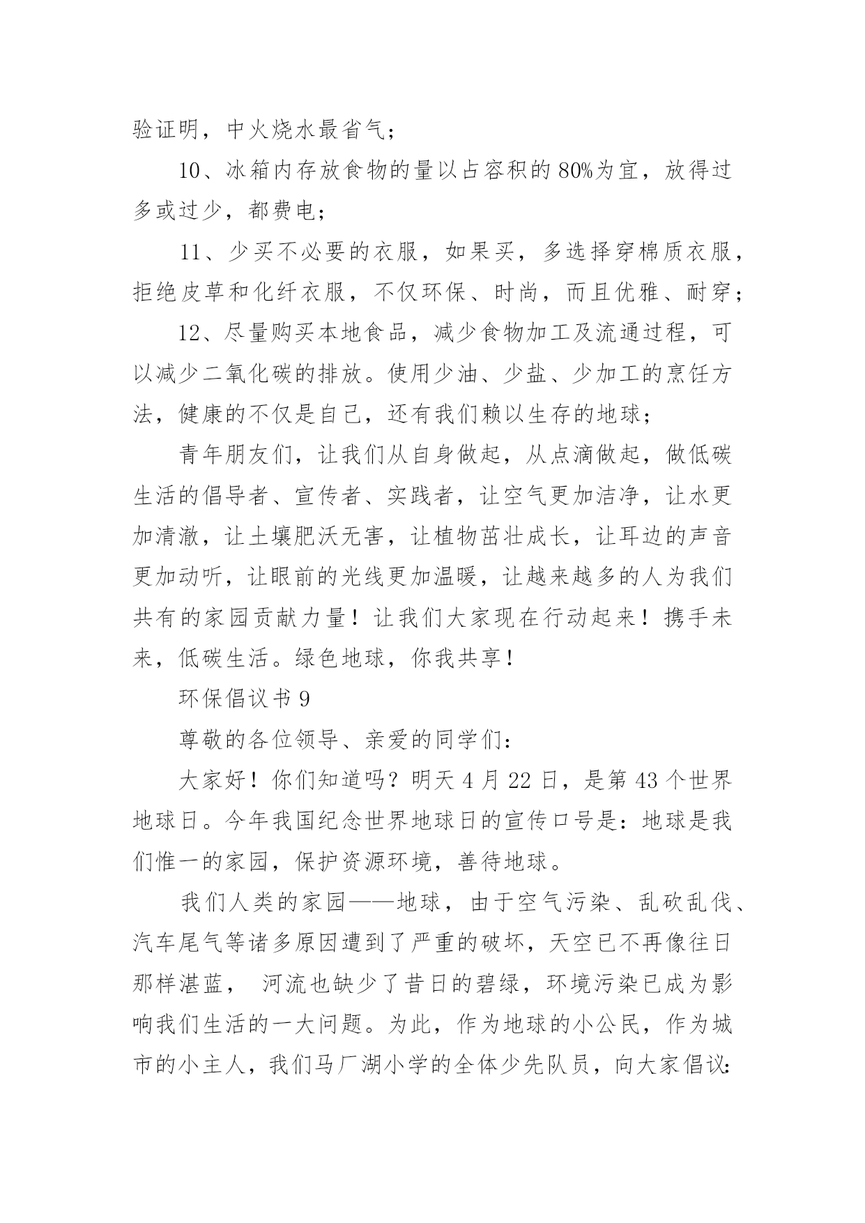 环保倡议书环保倡议书【荐】在快速变化和不断变革的新时代,越来越多人会去使用倡议书,倡议书一般由标题、称呼、正文、结尾、落款五部分组成。相信写倡议书是一个让许多人都头痛的问题,以下是小编为大家收集的环保倡议书,希望能够帮助到大家。环保倡议书1亲爱的同学们:地球只有一个,美丽和谐的家园需要我们所有人共同努力来维护。现状已不容乐观,为了让建设好资源节约型、环境友好型社会的美好目标不再遥不可及,让山更青一些、天更蓝一些,我们呼吁所有同学和我们一起携手,从我做起,从身边事做起,从小事做起,为节能环保献出一份力量。当代大学生是节能环保的主力军,应时时为节能环保做好先锋模范作用。为此,我们特向全校青年大学生们发出以下倡议:1.离开寝室、教室牢记随手关灯,做到“无人在,无灯开”;2.用水完毕千万拧紧水龙头,勿让生命之水常空流;3.每天上网时间减少一小时,减少不必要的待机状态;4.节约用纸,双面使用,珍惜有限森林资源;5.回收废旧物,捐献一份爱心,收获一种美德;6.推动垃圾分类回收,让垃圾变成资源;7.减少使用一次性用品,少订外卖多用竹筷;8.爱护校园一草一木,争做环保卫士,当好学校主人;9.倡步行,骑单车,坐公交,我锻炼,我健康;10.人人尽力,消减噪音,从我做起,共创宁静校园。“勿因善小而不为”,我们每人节约一张纸,合起来就可以节约出一片森林,一汪清泉!节约能源,就是延长我们的生命!保护环境,就是保护我们人类自己!节能环保,青年当先,希望在青年,责任在自己,让我们以主人翁的姿态投入到节能环保行动中去,让生命之水长流,让生命之绿永驻,让和谐之树常青,让文明之花永不凋谢!倡议人:20xx年x月x日环保倡议书2同学们:我们的学校建设了新的公用水冲厕所,这一切都是为了我们同学们的身体健康着想,如果同学们不为自己着想,也为别人想想!我们以前的厕所存在问题。如果你们再这样在厕所里乱扔垃圾我们的新厕所就要停用了,同学们也只能把大小便憋回家上。如果你们不想停用厕所的话,我诚恳地希望大家能做到以下几点:1、爱护厕所,不要破坏厕所。2、不在马桶里扔垃圾和杂物。3、不在厕所里打闹或戏弄他人。4、上完厕所后及时冲厕所。文明公厕,从我做起,从身边的小事做起,同学们让我们行动起来吧!倡议人:六二班王XX环保倡议书3每年中秋节,都会有大批游客和群众前来遮浪奇观景区观海、听涛、赏月。欢度佳节期间,乱扔垃圾、随意烧烤、燃放烟花爆竹等行为时有发生,给景区管理和环境保护带来不少问题。为保护好难得的滨海资源,弘扬传统文化、树立文明新风,引导全区人民群众过一个温馨、节俭、文明、和谐的中秋佳节,团团君特向广大游客和群众提出以下倡议:01讲文明,我做起,确保垃圾不落地。让“垃圾不落地”成为我们的自觉行动,不乱扔垃圾、果皮、纸屑,不随地吐痰,让景区保持干净卫生,让心情保持舒畅美丽。食物吃完或烧烤结束后,用塑料袋装好扔进垃圾桶里或随手把垃圾装袋带走。02讲文明,共传递,减少烟花更美丽。请大家奔走相告,为了保护美丽的沙滩,景区内严禁燃放烟花炮竹和孔明灯,当然也严禁烧烤。在景区外的区域也请大家尽量减少烟花炮竹、孔明灯燃放,减少炮竹垃圾产生,对空气的污染,让我们呼吸清新空气。环保倡议书4亲爱的地球同胞们:大家好!我是一名小学生。由于环境污染给我们的生存空间带来了严重的威胁,我们赖以生存的地球环境逐渐恶化。所以,我写了这封建议书,倡导大家爱护环境,保护我们的地球!我们知道,一直孕育着我们人类的是地球妈妈。如果没有她,我们将无法生存。人类有其他动物所没有的智慧,因此我们被赋予了高等动物的桂冠。我们利用这些智慧,创造了各式各样的工具,建造了许许多多的工厂,为我们现在的生活带来了许多的便利。但是,我们在享受日益富裕物质生活的同时,是不是也该考虑下我们地球妈妈的健康问题?如今,白色垃圾到处可见,淡水污染严重,空气质量也越来越差,这些是不是应该引起我们的注意呢?随着人们生活水平的提高,如今有私家车的家庭越来越多!而汽车在方便人们的同时,也带来越来越严重的污染。汽车排出的尾气每天都在污染着我们呼吸的空气!在炎热的夏季,马路上全是汽车。只要一靠近车身,就会感到阵阵热浪扑面而来!还有刺鼻的气味,实在难闻!针对这种现象,我倡导多步行、骑自行车或坐公交车,少开私家车。同时,我们还要植树造林。森林能吸收二氧化碳,帮我们净化空气!我们要制止乱砍滥伐森林,破坏大自然的行为!正值酷暑,许多人都怕热。呆在家里的时候,都是开着空调,一开,往往是一整天。有时候,人出去了,空调却还开着,很是浪费!建议大家尽量少开空调。实在要开的话,最好把温度调在26度左右,不要调的太低。离开后,记得关闭电源。水是我们的生命之源。虽然地球上的海洋很多,但是能够饮用的淡水资源却很有限。据统计,淡水资源仅占总水量的百分之十。我曾看过几幅系列绘画。画面