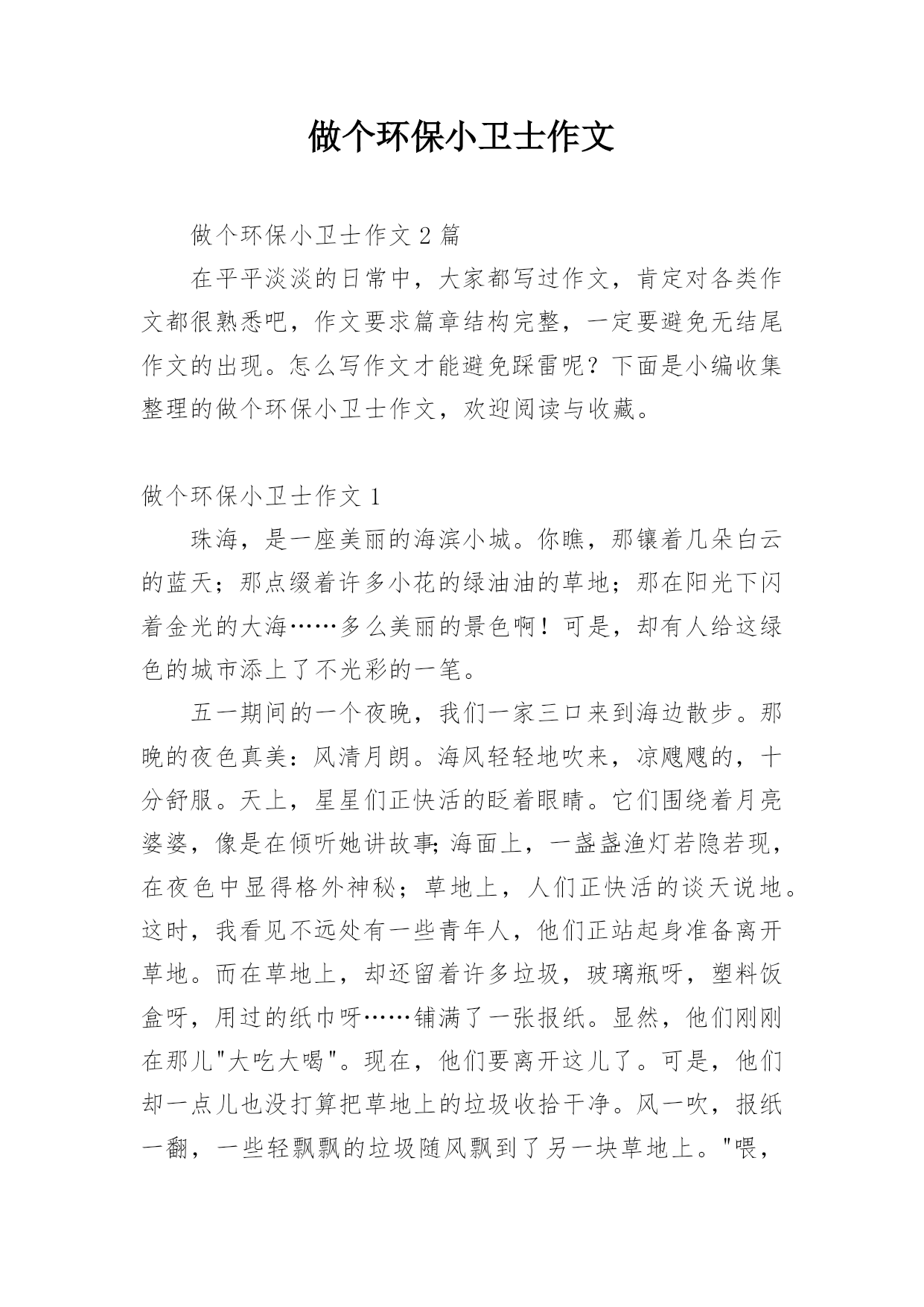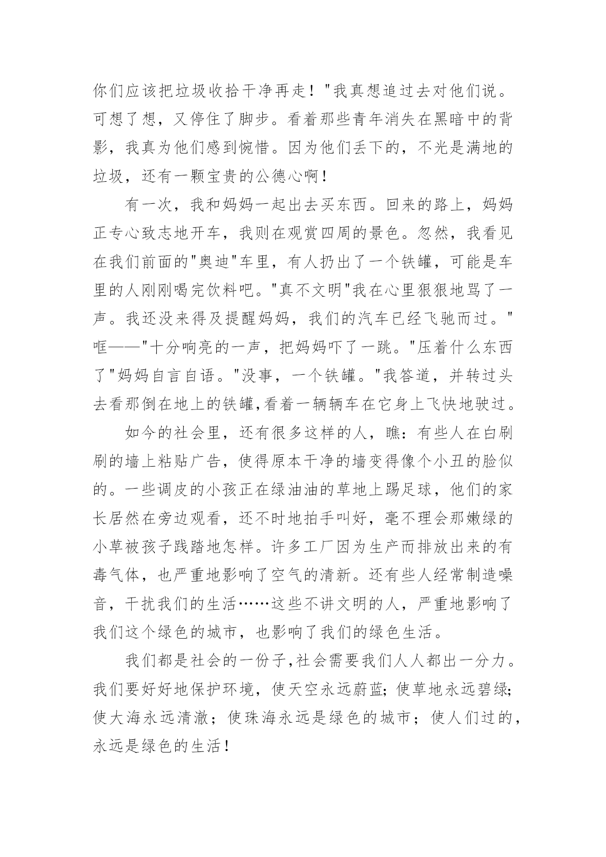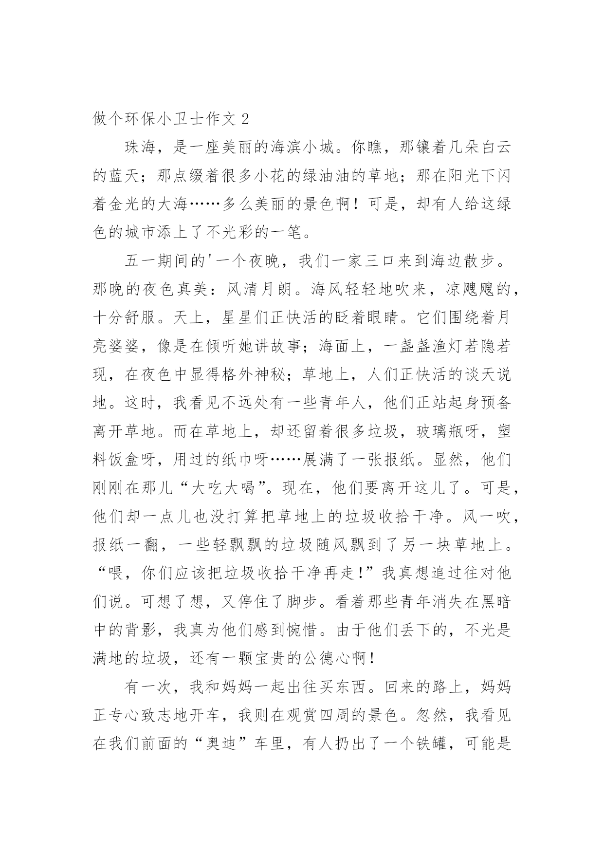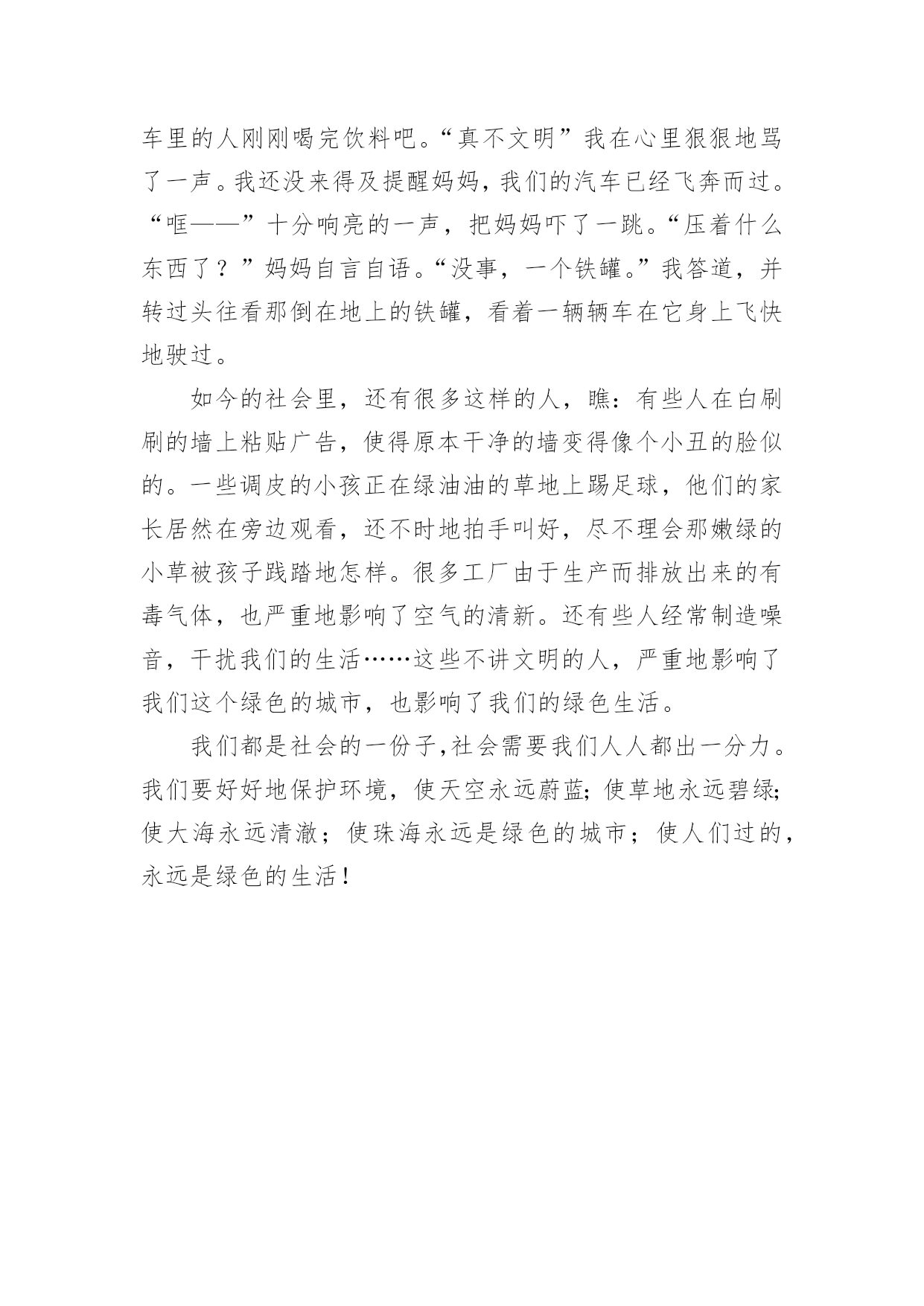 做个环保小卫士作文做个环保小卫士作文2篇在平平淡淡的日常中,大家都写过作文,肯定对各类作文都很熟悉吧,作文要求篇章结构完整,一定要避免无结尾作文的出现。怎么写作文才能避免踩雷呢?下面是小编收集整理的做个环保小卫士作文,欢迎阅读与收藏。做个环保小卫士作文1珠海,是一座美丽的海滨小城。你瞧,那镶着几朵白云的蓝天;那点缀着许多小花的绿油油的草地;那在阳光下闪着金光的大海……多么美丽的景色啊!可是,却有人给这绿色的城市添上了不光彩的一笔。五一期间的一个夜晚,我们一家三口来到海边散步。那晚的夜色真美:风清月朗。海风轻轻地吹来,凉飕飕的,十分舒服。天上,星星们正快活的眨着眼睛。它们围绕着月亮婆婆,像是在倾听她讲故事;海面上,一盏盏渔灯若隐若现,在夜色中显得格外神秘;草地上,人们正快活的谈天说地。这时,我看见不远处有一些青年人,他们正站起身准备离开草地。而在草地上,却还留着许多垃圾,玻璃瓶呀,塑料饭盒呀,用过的纸巾呀……铺满了一张报纸。显然,他们刚刚在那儿"大吃大喝"。现在,他们要离开这儿了。可是,他们却一点儿也没打算把草地上的垃圾收拾干净。风一吹,报纸一翻,一些轻飘飘的垃圾随风飘到了另一块草地上。"喂,你们应该把垃圾收拾干净再走!"我真想追过去对他们说。可想了想,又停住了脚步。看着那些青年消失在黑暗中的背影,我真为他们感到惋惜。因为他们丢下的,不光是满地的垃圾,还有一颗宝贵的公德心啊!有一次,我和妈妈一起出去买东西。回来的路上,妈妈正专心致志地开车,我则在观赏四周的景色。忽然,我看见在我们前面的"奥迪"车里,有人扔出了一个铁罐,可能是车里的人刚刚喝完饮料吧。"真不文明"我在心里狠狠地骂了一声。我还没来得及提醒妈妈,我们的汽车已经飞驰而过。"哐——"十分响亮的一声,把妈妈吓了一跳。"压着什么东西了"妈妈自言自语。"没事,一个铁罐。"我答道,并转过头去看那倒在地上的铁罐,看着一辆辆车在它身上飞快地驶过。如今的社会里,还有很多这样的人,瞧:有些人在白刷刷的墙上粘贴广告,使得原本干净的墙变得像个小丑的脸似的。一些调皮的小孩正在绿油油的草地上踢足球,他们的家长居然在旁边观看,还不时地拍手叫好,毫不理会那嫩绿的小草被孩子践踏地怎样。许多工厂因为生产而排放出来的有毒气体,也严重地影响了空气的清新。还有些人经常制造噪音,干扰我们的生活……这些不讲文明的人,严重地影响了我们这个绿色的城市,也影响了我们的绿色生活。我们都是社会的一份子,社会需要我们人人都出一分力。我们要好好地保护环境,使天空永远蔚蓝;使草地永远碧绿;使大海永远清澈;使珠海永远是绿色的城市;使人们过的,永远是绿色的生活!做个环保小卫士作文2珠海,是一座美丽的海滨小城。你瞧,那镶着几朵白云的蓝天;那点缀着很多小花的绿油油的草地;那在阳光下闪着金光的大海……多么美丽的景色啊!可是,却有人给这绿色的城市添上了不光彩的一笔。五一期间的'一个夜晚,我们一家三口来到海边散步。那晚的夜色真美:风清月朗。海风轻轻地吹来,凉飕飕的,十分舒服。天上,星星们正快活的眨着眼睛。它们围绕着月亮婆婆,像是在倾听她讲故事;海面上,一盏盏渔灯若隐若现,在夜色中显得格外神秘;草地上,人们正快活的谈天说地。这时,我看见不远处有一些青年人,他们正站起身预备离开草地。而在草地上,却还留着很多垃圾,玻璃瓶呀,塑料饭盒呀,用过的纸巾呀……展满了一张报纸。显然,他们刚刚在那儿“大吃大喝”。现在,他们要离开这儿了。可是,他们却一点儿也没打算把草地上的垃圾收拾干净。风一吹,报纸一翻,一些轻飘飘的垃圾随风飘到了另一块草地上。“喂,你们应该把垃圾收拾干净再走!”我真想追过往对他们说。可想了想,又停住了脚步。看着那些青年消失在黑暗中的背影,我真为他们感到惋惜。由于他们丢下的,不光是满地的垃圾,还有一颗宝贵的公德心啊!有一次,我和妈妈一起出往买东西。回来的路上,妈妈正专心致志地开车,我则在观赏四周的景色。忽然,我看见在我们前面的“奥迪”车里,有人扔出了一个铁罐,可能是车里的人刚刚喝完饮料吧。“真不文明”我在心里狠狠地骂了一声。我还没来得及提醒妈妈,我们的汽车已经飞奔而过。“哐——”十分响亮的一声,把妈妈吓了一跳。“压着什么东西了?”妈妈自言自语。“没事,一个铁罐。”我答道,并转过头往看那倒在地上的铁罐,看着一辆辆车在它身上飞快地驶过。如今的社会里,还有很多这样的人,瞧:有些人在白刷刷的墙上粘贴广告,使得原本干净的墙变得像个小丑的脸似的。一些调皮的小孩正在绿油油的草地上踢足球,他们的家长居然在旁边观看,还不时地拍手叫好,尽不理会那嫩绿的小草被孩子践踏地怎样。很多工厂由于生产而排放出来的有毒气体,也严重地影响了空气的清新。还有些人经常制造噪音,干扰我们的生活……这些不讲文明的人,严重地影响了我们这个绿色的城市,也影响了我们的绿色生活。我们都是社会的一