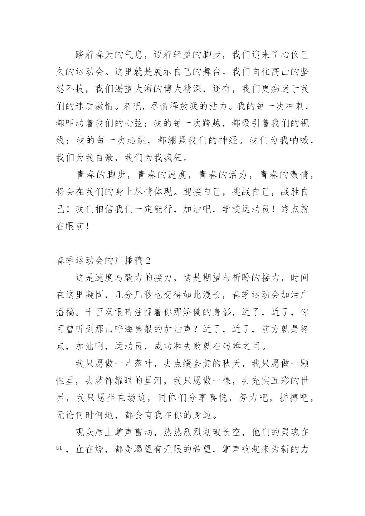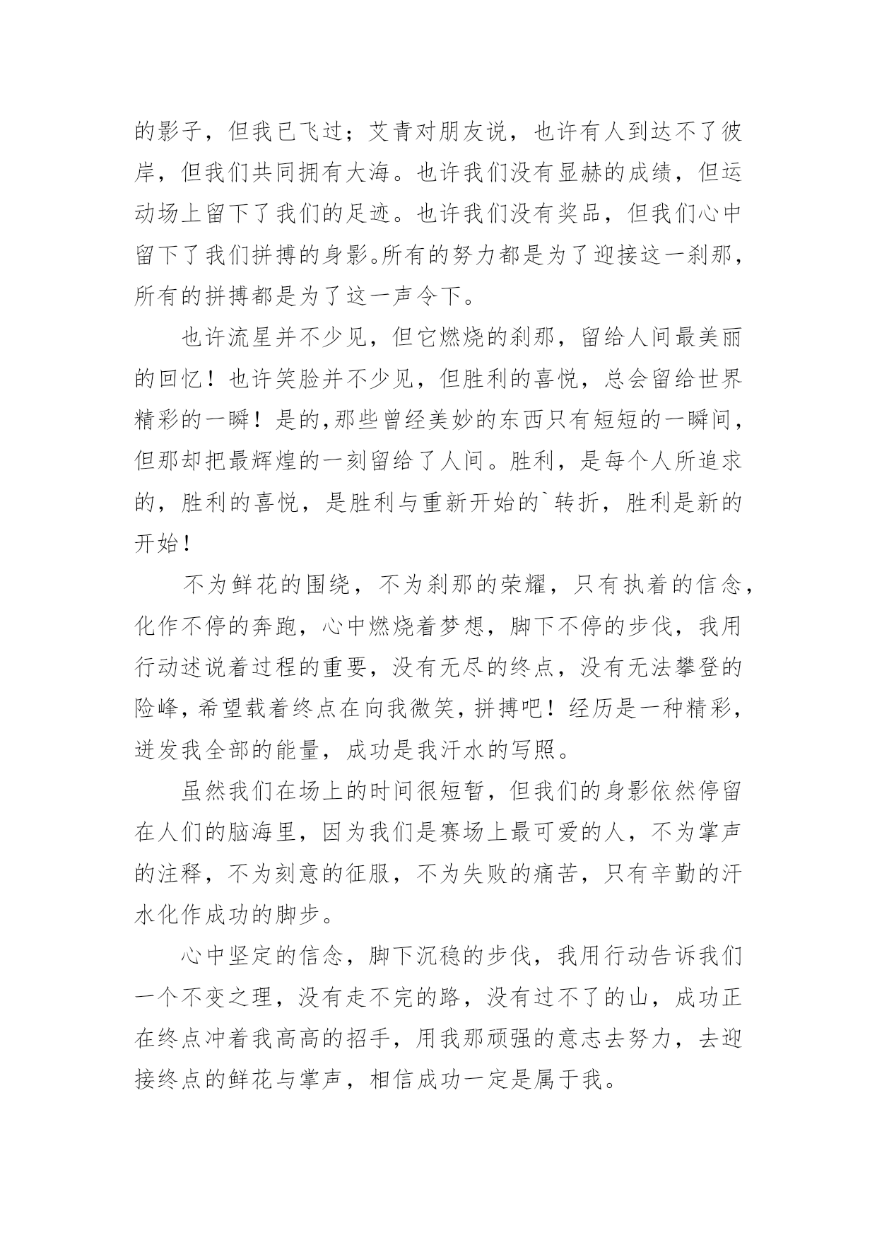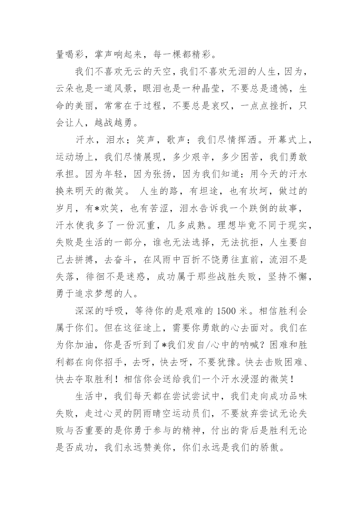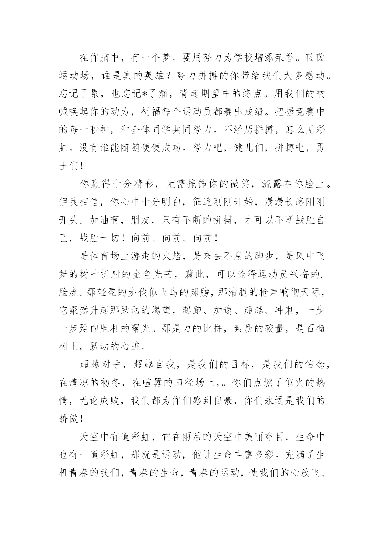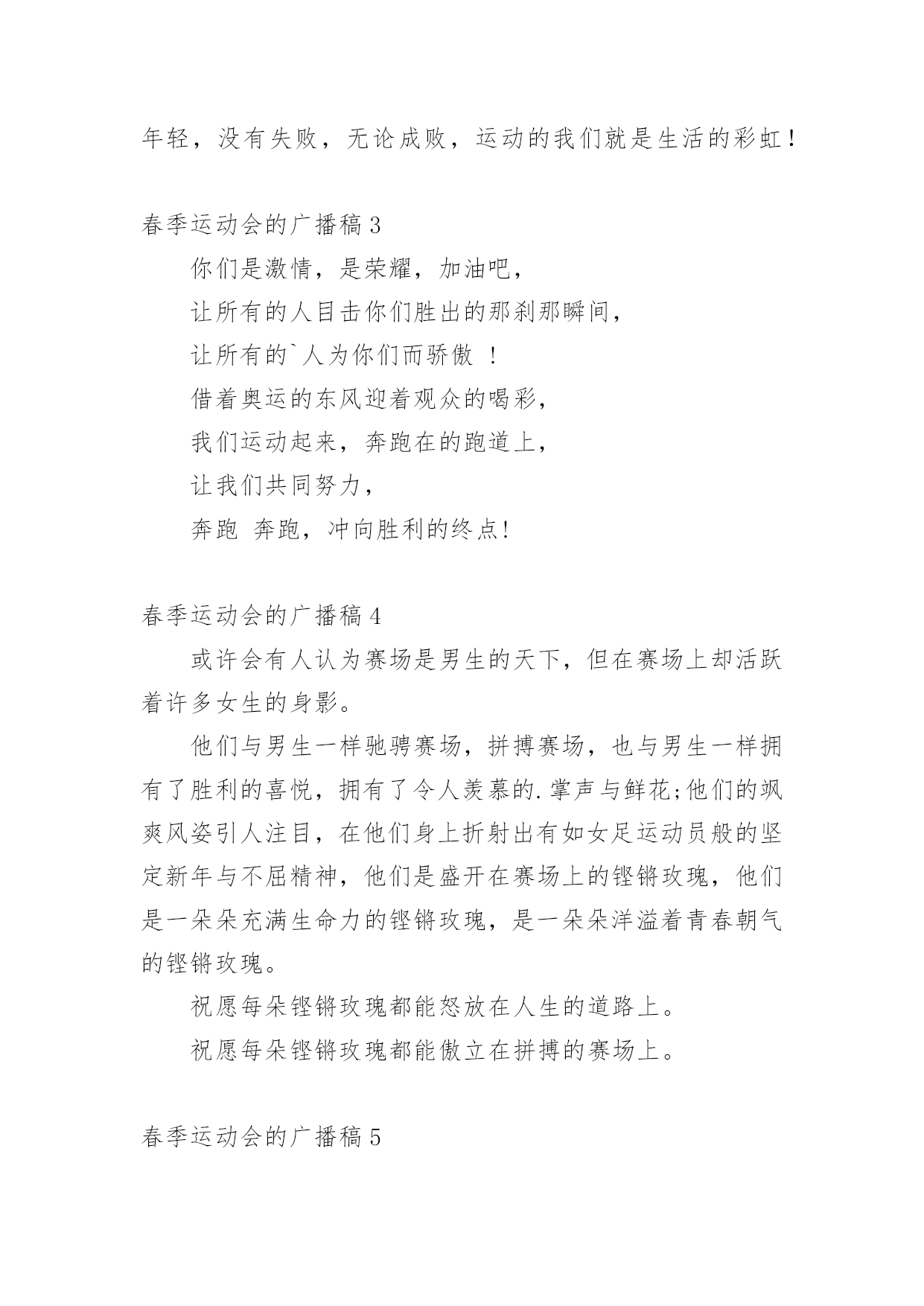 春季运动会的广播稿有在广播站锻炼的学生,我们广播前都会预先做好广播稿,好的广播稿会带来更好的节目效果,那么什么样的广播稿才是好的呢?以下是小编为大家整理的春季运动会的广播稿,希望对大家有所帮助。春季运动会的广播稿1踏上跑道,是一种选择。离开起点,是一种勇气。驰骋赛场,是一种胜利。运动健将们,用我的实力,用我的精神,去开拓出,一片属于我的长跑天地!有多少次挥汗如雨,伤痛曾添满记忆,只因为始终相信,去拼搏才能胜利。总在鼓舞自己,要成功就得努力。热血在赛场沸腾,巨人在赛场升起。相信自己,我将赢得胜利,创造奇迹;相信自己,梦想在我手中,这是我的天地。当一切过去,我们将是第一。相信自己,我们将超越极限,超越自己!相信自己,加油吧,健儿们,相信我自己。年轻的我们自信飞扬,青春的气息如同出生的朝阳,蓬勃的力量如同阳光的挥洒。此时此刻,跑道便是我们精彩的舞台,声声加油便是我们最高的奖项!论何成功,谈何荣辱,心中的信念只有一个:拼搏!萧瑟的秋风,挡不住我们破竹的锐气。广阔的绿茵场,是为我们搭建的舞台。张扬吧,年轻的心,我们将为我永远喝彩!泰戈尔在诗中说,天空没有翅膀的影子,但我已飞过;艾青对朋友说,也许有人到达不了彼岸,但我们共同拥有大海。也许我们没有显赫的成绩,但运动场上留下了我们的足迹。也许我们没有奖品,但我们心中留下了我们拼搏的身影。所有的努力都是为了迎接这一刹那,所有的拼搏都是为了这一声令下。也许流星并不少见,但它燃烧的刹那,留给人间最美丽的回忆!也许笑脸并不少见,但胜利的喜悦,总会留给世界精彩的一瞬!是的,那些曾经美妙的东西只有短短的一瞬间,但那却把最辉煌的一刻留给了人间。胜利,是每个人所追求的,胜利的喜悦,是胜利与重新开始的`转折,胜利是新的开始!不为鲜花的围绕,不为刹那的荣耀,只有执着的信念,化作不停的奔跑,心中燃烧着梦想,脚下不停的步伐,我用行动述说着过程的重要,没有无尽的终点,没有无法攀登的险峰,希望载着终点在向我微笑,拼搏吧!经历是一种精彩,迸发我全部的能量,成功是我汗水的写照。虽然我们在场上的时间很短暂,但我们的身影依然停留在人们的脑海里,因为我们是赛场上最可爱的人,不为掌声的注释,不为刻意的征服,不为失败的痛苦,只有辛勤的汗水化作成功的脚步。心中坚定的信念,脚下沉稳的步伐,我用行动告诉我们一个不变之理,没有走不完的路,没有过不了的山,成功正在终点冲着我高高的招手,用我那顽强的意志去努力,去迎接终点的鲜花与掌声,相信成功一定是属于我。踏着春天的气息,迈着轻盈的脚步,我们迎来了心仪已久的运动会。这里就是展示自己的舞台。我们向往高山的坚忍不拔,我们渴望大海的博大精深,还有,我们更痴迷于我们的速度激情。来吧,尽情释放我的活力。我的每一次冲刺,都叩动着我们的心弦;我的每一次跨越,都吸引着我们的视线;我的每一次起跳,都绷紧我们的神经。我们为我呐喊,我们为我自豪,我们为我疯狂。青春的脚步,青春的速度,青春的活力,青春的激情,将会在我们的身上尽情体现。迎接自己,挑战自己,战胜自己!我们相信我们一定能行,加油吧,学校运动员!终点就在眼前!春季运动会的广播稿2这是速度与毅力的接力,这是期望与祈盼的接力,时间在这里凝固,几分几秒也变得如此漫长,春季运动会加油广播稿。千百双眼睛注视着你那矫健的身影,近了,近了,你可曾听到那山呼海啸般的加油声?近了,近了,前方就是终点,加油啊,运动员,成功和失败就在转瞬之间。我只愿做一片落叶,去点缀金黄的秋天,我只愿做一颗恒星,去装饰耀眼的星河,我只愿做一棵,去充实五彩的世界,我只愿坐在场边,同你们分享喜悦,努力吧,拼搏吧,无论何时何地,都会有我在你的身边。观众席上掌声雷动,热热烈烈划破长空,他们的灵魂在叫,血在烧,都是渴望有无限的希望,掌声响起来为新的力量喝彩,掌声响起来,每一棵都精彩。我们不喜欢无云的天空,我们不喜欢无泪的人生,因为,云朵也是一道风景,眼泪也是一种晶莹,不要总是遗憾,生命的美丽,常常在于过程,不要总是哀叹,一点点挫折,只会让人,越战越勇。汗水,泪水;笑声,歌声;我们尽情挥洒。开幕式上,运动场上,我们尽情展现,多少艰辛,多少困苦,我们勇敢承担。因为年轻,因为张扬,因为我们知道:用今天的汗水换来明天的微笑。人生的路,有坦途,也有坎坷,做过的岁月,有*欢笑,也有苦涩,泪水告诉我一个跌倒的故事,汗水使我多了一份沉重,几多成熟。理想毕竟不同于现实,失败是生活的一部分,谁也无法选择,无法抗拒,人生要自己去拼搏,去奋斗,在风雨中百折不饶勇往直前,流泪不是失落,徘徊不是迷惑,成功属于那些战胜失败,坚持不懈,勇于追求梦想的人。深深的呼吸,等待你的是艰难的1500米。相信胜利会属于你们。但在这征途上,需要你勇敢的心去面对。我们在为你加油,你是否听到了*我们发自/心中的呐喊?困难和胜利都在向你招手,去呀,快去呀