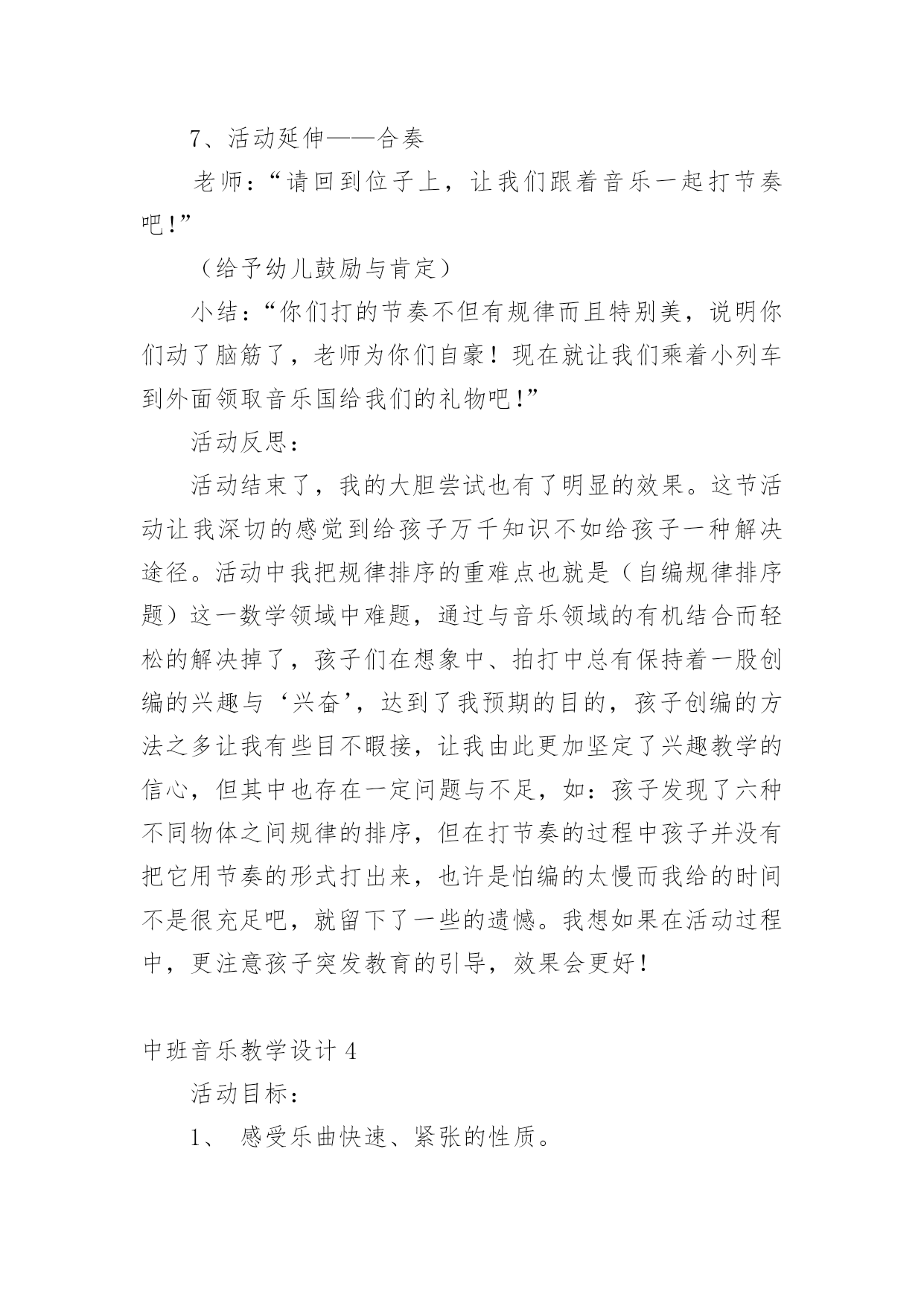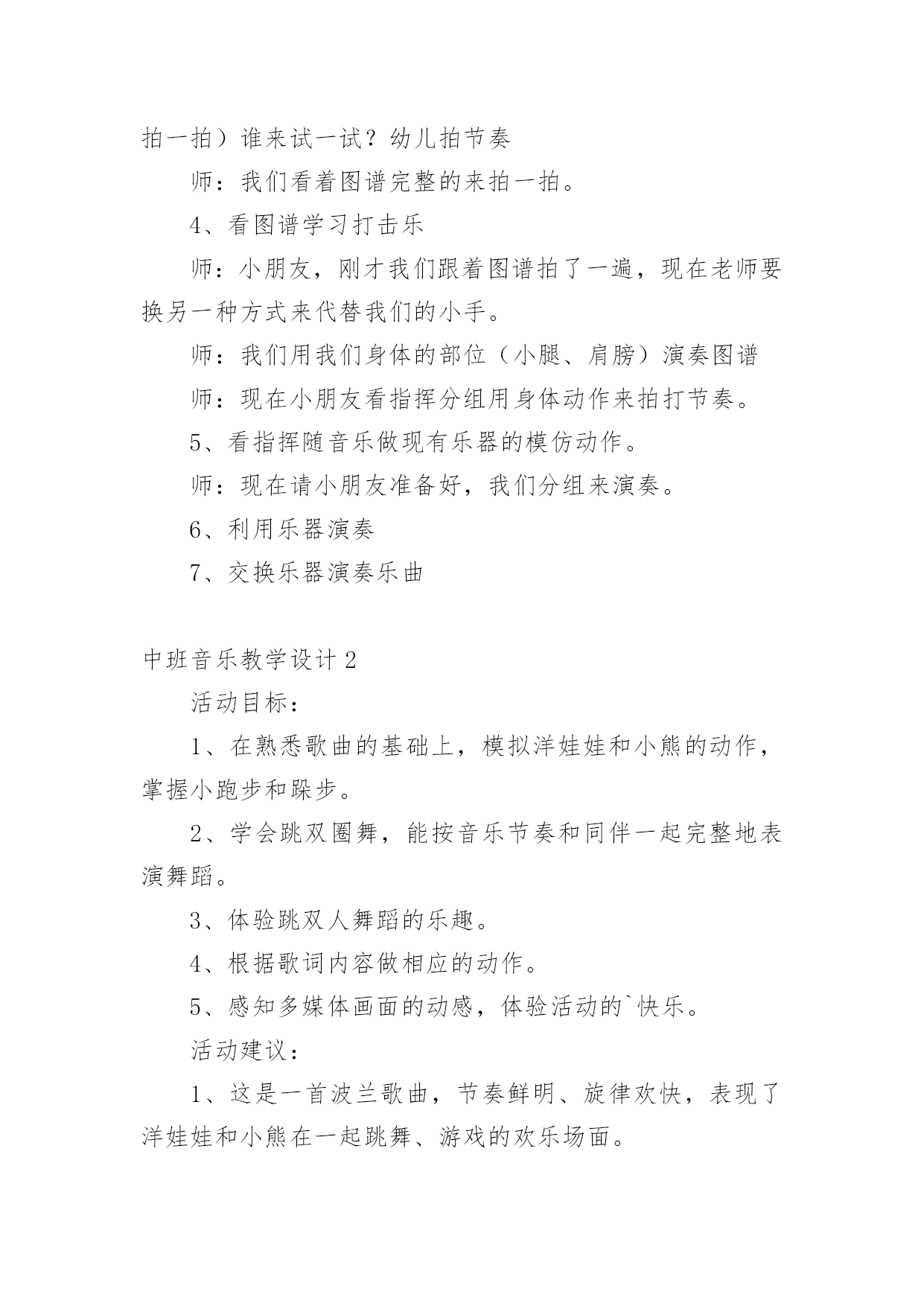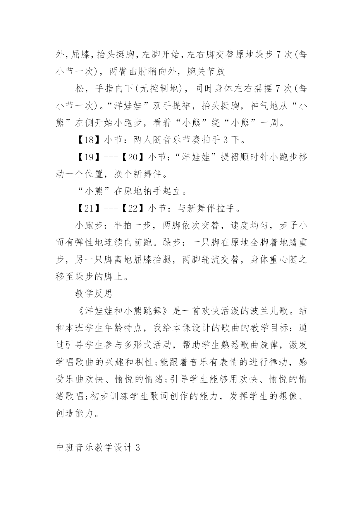 中班音乐教学设计作为一名默默奉献的教育工作者,常常要根据教学需要编写教学设计,借助教学设计可使学生在单位时间内能够学到更多的知识。那要怎么写好教学设计呢?以下是小编精心整理的中班音乐教学设计,仅供参考,希望能够帮助到大家。中班音乐教学设计1一、活动目标1、学习拍打正确的节奏。2、学习看指挥演奏打击乐器。3、能正确使用乐器,遵守打击乐活动的规则。二、活动准备铃鼓、小铃、圆舞板、图谱等。三、活动过程1、导入:(熟悉乐曲)小朋友,今天老师带来了一段音乐,我们一起欣赏一下。这首乐曲的名字叫《杨柳青》。我们一起说一说。2、熟悉音乐的旋律师:这么优美的音乐,我们一起伸出小手跟着拍一拍。3、出示图谱师:刚才我们拍了这首乐曲,现在老师带来了一副关于这个音乐的'图谱。我们一起看看,看看能怎么拍?XX|XX|;X-|X-|;XXX|XXX|(小朋友可以伸出小手自己来拍一拍)谁来试一试?幼儿拍节奏师:我们看着图谱完整的来拍一拍。4、看图谱学习打击乐师:小朋友,刚才我们跟着图谱拍了一遍,现在老师要换另一种方式来代替我们的小手。师:我们用我们身体的部位(小腿、肩膀)演奏图谱师:现在小朋友看指挥分组用身体动作来拍打节奏。5、看指挥随音乐做现有乐器的模仿动作。师:现在请小朋友准备好,我们分组来演奏。6、利用乐器演奏7、交换乐器演奏乐曲中班音乐教学设计2活动目标:1、在熟悉歌曲的基础上,模拟洋娃娃和小熊的动作,掌握小跑步和跺步。2、学会跳双圈舞,能按音乐节奏和同伴一起完整地表演舞蹈。3、体验跳双人舞蹈的乐趣。4、根据歌词内容做相应的动作。5、感知多媒体画面的动感,体验活动的`快乐。活动建议:1、这是一首波兰歌曲,节奏鲜明、旋律欢快,表现了洋娃娃和小熊在一起跳舞、游戏的欢乐场面。2、活动前可先教幼儿学会演唱歌曲,表现出歌曲欢快活泼的情绪。活动时可用分组对唱的形式复习歌曲,男孩扮演小熊,女孩扮洋娃娃,这也同时为后面分角色舞蹈做好铺垫。3、教师可创设“舞会”情境组织教学,如提问:“我们一起去参加舞会,应该准备些什么?你会跳什么动作?”幼儿在自由表现的基础上学习基本舞步:小跑步、跺步。4、活动的重点是“洋娃娃”和“小熊”结对做动作。教师应提示幼儿按音乐节奏和同伴一起表演舞蹈,鼓励幼儿在结束句与同伴创造性的合作摆好造型并交换新舞伴,体验跳双人舞的快乐。动作建议:全体幼儿站成双圈,逆时针方向成对站立,外圈幼儿为“小熊”,里圈幼儿为“洋娃娃”。【1】---【2】小节:两人一手叉腰(外圈右手,里圈左手),另一只手想我,随音乐双脚起踵,每拍一下,共4下。【3】---【4】小节:两人内侧脚向前小跑步8次,同时相握的手划至前上方。【5】小节:继续小跑步4次,相握的手划至体后方,两人眼神对视。【6】小节:随音乐节奏跺三下脚,发出响声。【7】---【10】小节:动作同【3】---【6】小节,但最后一小节两人面对面站立。【11】---【17】小节:“小熊”两脚开立,两膝盖稍向外,屈膝,抬头挺胸,左脚开始,左右脚交替原地跺步7次(每小节一次),两臂曲肘稍向外,腕关节放松,手指向下(无控制地),同时身体左右摇摆7次(每小节一次)。“洋娃娃”双手提裙,抬头挺胸,神气地从“小熊”左侧开始小跑步,看着“小熊”绕“小熊”一周。【18】小节:两人随音乐节奏拍手3下。【19】---【20】小节:“洋娃娃”提裙顺时针小跑步移动一个位置,换个新舞伴。“小熊”在原地拍手起立。【21】---【22】小节:与新舞伴拉手。小跑步:半拍一步,两脚依次交替,速度均匀,步子小而有弹性地连续向前跑。跺步:一只脚在原地全脚着地踏重步,另一只脚离地屈膝抬腿,两脚轮流交替,身体重心随之移至跺步的脚上。教学反思《洋娃娃和小熊跳舞》是一首欢快活泼的波兰儿歌。结和本班学生年龄特点,我给本课设计的歌曲的教学目标:通过引导学生参与多形式活动,帮助学生熟悉歌曲旋律,激发学唱歌曲的兴趣和积性;能跟着音乐有表情的进行律动,感受乐曲欢快、愉悦的情绪;引导学生能够用欢快、愉悦的情绪歌唱;初步训练学生歌词创作的能力,发挥学生的想像、创造能力。中班音乐教学设计3活动目标:1、通过音乐激发孩子创编的灵感和兴趣。2、通过活动让幼儿掌握几种创编规律的方法。活动准备:小兔子头饰;1开大白纸一张;碰铃、铃鼓、手铃、沙锤若干。活动过程:1、激发兴趣“小朋友们,今天呀音乐国将举行一场盛大的音乐会,你们想不想去看看呀?”“想”“咦,小兔子把它的拿手好戏——节奏表演也带来了,咱们一起来欣赏一下吧!”(兔子演员登台表演音乐节奏)2、发现规律老师:“小朋友,你在刚才的节目中发现了什么?”(引导幼儿说出节奏有规律)老师:“对了,刚才小兔子的节奏表演不仅好看而且十分有规律,谁能说说看它的规律是什么?(Х0×0|×0×0|)3、创编有规律的节奏老师:“谁能自己创编一个有规律