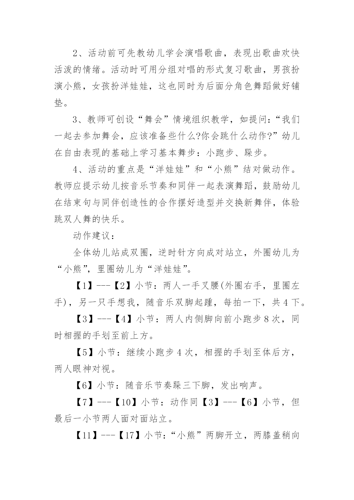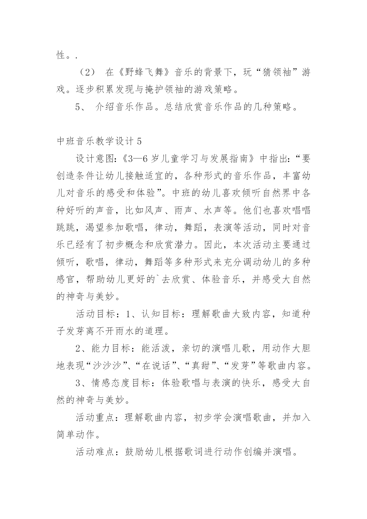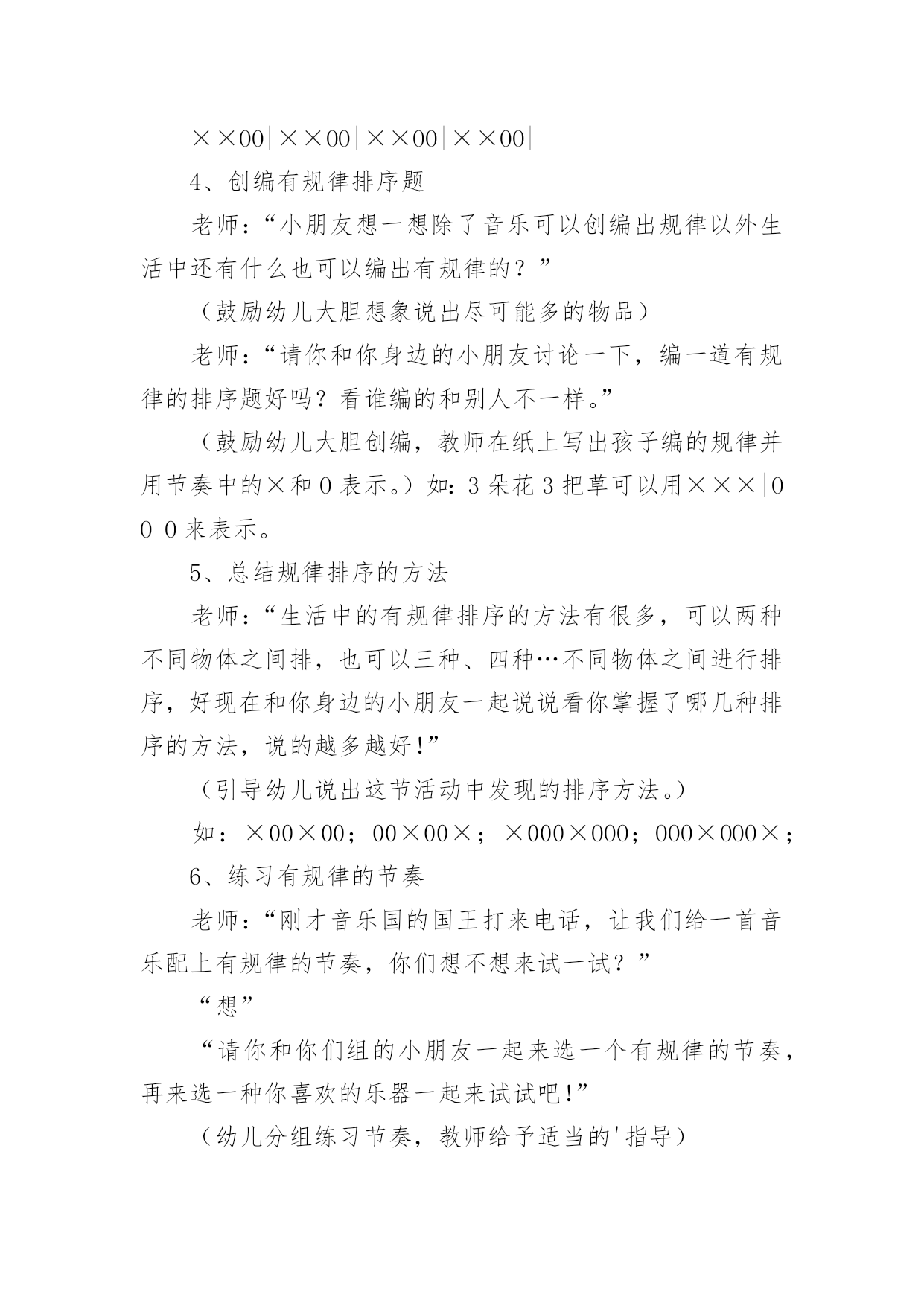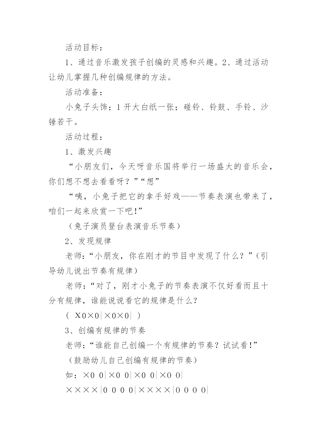 中班音乐教学设计作为一名默默奉献的教育工作者,常常要根据教学需要编写教学设计,借助教学设计可使学生在单位时间内能够学到更多的知识。那要怎么写好教学设计呢?以下是小编精心整理的中班音乐教学设计,仅供参考,希望能够帮助到大家。中班音乐教学设计1一、活动目标1、学习拍打正确的节奏。2、学习看指挥演奏打击乐器。3、能正确使用乐器,遵守打击乐活动的规则。二、活动准备铃鼓、小铃、圆舞板、图谱等。三、活动过程1、导入:(熟悉乐曲)小朋友,今天老师带来了一段音乐,我们一起欣赏一下。这首乐曲的名字叫《杨柳青》。我们一起说一说。2、熟悉音乐的旋律师:这么优美的音乐,我们一起伸出小手跟着拍一拍。3、出示图谱师:刚才我们拍了这首乐曲,现在老师带来了一副关于这个音乐的'图谱。我们一起看看,看看能怎么拍?XX|XX|;X-|X-|;XXX|XXX|(小朋友可以伸出小手自己来拍一拍)谁来试一试?幼儿拍节奏师:我们看着图谱完整的来拍一拍。4、看图谱学习打击乐师:小朋友,刚才我们跟着图谱拍了一遍,现在老师要换另一种方式来代替我们的小手。师:我们用我们身体的部位(小腿、肩膀)演奏图谱师:现在小朋友看指挥分组用身体动作来拍打节奏。5、看指挥随音乐做现有乐器的模仿动作。师:现在请小朋友准备好,我们分组来演奏。6、利用乐器演奏7、交换乐器演奏乐曲中班音乐教学设计2活动目标:1、在熟悉歌曲的基础上,模拟洋娃娃和小熊的动作,掌握小跑步和跺步。2、学会跳双圈舞,能按音乐节奏和同伴一起完整地表演舞蹈。3、体验跳双人舞蹈的乐趣。4、根据歌词内容做相应的动作。5、感知多媒体画面的动感,体验活动的`快乐。活动建议:1、这是一首波兰歌曲,节奏鲜明、旋律欢快,表现了洋娃娃和小熊在一起跳舞、游戏的欢乐场面。2、活动前可先教幼儿学会演唱歌曲,表现出歌曲欢快活泼的情绪。活动时可用分组对唱的形式复习歌曲,男孩扮演小熊,女孩扮洋娃娃,这也同时为后面分角色舞蹈做好铺垫。3、教师可创设“舞会”情境组织教学,如提问:“我们一起去参加舞会,应该准备些什么?你会跳什么动作?”幼儿在自由表现的基础上学习基本舞步:小跑步、跺步。4、活动的重点是“洋娃娃”和“小熊”结对做动作。教师应提示幼儿按音乐节奏和同伴一起表演舞蹈,鼓励幼儿在结束句与同伴创造性的合作摆好造型并交换新舞伴,体验跳双人舞的快乐。动作建议:全体幼儿站成双圈,逆时针方向成对站立,外圈幼儿为“小熊”,里圈幼儿为“洋娃娃”。【1】---【2】小节:两人一手叉腰(外圈右手,里圈左手),另一只手想我,随音乐双脚起踵,每拍一下,共4下。【3】---【4】小节:两人内侧脚向前小跑步8次,同时相握的手划至前上方。【5】小节:继续小跑步4次,相握的手划至体后方,两人眼神对视。【6】小节:随音乐节奏跺三下脚,发出响声。【7】---【10】小节:动作同【3】---【6】小节,但最后一小节两人面对面站立。【11】---【17】小节:“小熊”两脚开立,两膝盖稍向外,屈膝,抬头挺胸,左脚开始,左右脚交替原地跺步7次(每小节一次),两臂曲肘稍向外,腕关节放松,手指向下(无控制地),同时身体左右摇摆7次(每小节一次)。“洋娃娃”双手提裙,抬头挺胸,神气地从“小熊”左侧开始小跑步,看着“小熊”绕“小熊”一周。【18】小节:两人随音乐节奏拍手3下。【19】---【20】小节:“洋娃娃”提裙顺时针小跑步移动一个位置,换个新舞伴。“小熊”在原地拍手起立。【21】---【22】小节:与新舞伴拉手。小跑步:半拍一步,两脚依次交替,速度均匀,步子小而有弹性地连续向前跑。跺步:一只脚在原地全脚着地踏重步,另一只脚离地屈膝抬腿,两脚轮流交替,身体重心随之移至跺步的脚上。教学反思《洋娃娃和小熊跳舞》是一首欢快活泼的波兰儿歌。结和本班学生年龄特点,我给本课设计的歌曲的教学目标:通过引导学生参与多形式活动,帮助学生熟悉歌曲旋律,激发学唱歌曲的兴趣和积性;能跟着音乐有表情的进行律动,感受乐曲欢快、愉悦的情绪;引导学生能够用欢快、愉悦的情绪歌唱;初步训练学生歌词创作的能力,发挥学生的想像、创造能力。中班音乐教学设计3活动目标:1、通过音乐激发孩子创编的灵感和兴趣。2、通过活动让幼儿掌握几种创编规律的方法。活动准备:小兔子头饰;1开大白纸一张;碰铃、铃鼓、手铃、沙锤若干。活动过程:1、激发兴趣“小朋友们,今天呀音乐国将举行一场盛大的音乐会,你们想不想去看看呀?”“想”“咦,小兔子把它的拿手好戏——节奏表演也带来了,咱们一起来欣赏一下吧!”(兔子演员登台表演音乐节奏)2、发现规律老师:“小朋友,你在刚才的节目中发现了什么?”(引导幼儿说出节奏有规律)老师:“对了,刚才小兔子的节奏表演不仅好看而且十分有规律,谁能说说看它的规律是什么?(Х0×0|×0×0|)3、创编有规律的节奏老师:“谁能自己创编一个有规律
