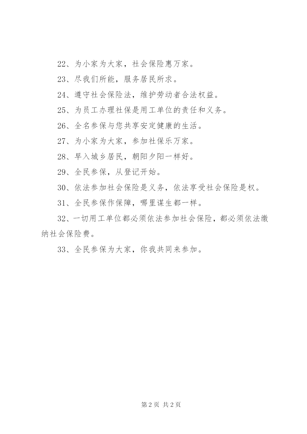 第PAGE\*Arabic\*MERGEFORMAT2页共NUMPAGES\*MERGEFORMAT2页社会保险宣传标语2、少壮不参保,老来无依靠。3、参加社会保险,实现社会公平。4、为小家为大家,全民参保乐万家。5、绽放“社保”红花,丰收“幸福”硕果。6、社会保险与您风雨同舟。7、实施全民参保,共享发展成果。8、社会保险作保障,哪里谋生都一样。9、社会保险入我家,受惠得益你我他。10、参加社保是所有劳动者的法定权利和根本利益。11、社会保险进万家,真情温暖你我他。12、全民参保是大事,及时参保最明智。13、社保手牵手,民生心连心。14、全民参保是所有劳动者的法定权利和根本利益。15、社会保险与您共享安定健康的生活。16、社会保险没参保,手中有粮心也慌。17、为参保者服务是社会保险经办机构的职责。18、社会保险保民生,全民参与促和谐。19、社保在手中,踏实在心中。20、全民参保进万家,真情温暖你我他。21、社会保险为大家,你我共同来参加。22、为小家为大家,社会保险惠万家。23、尽我们所能,服务居民所求。24、遵守社会保险法,维护劳动者合法权益。25、为员工办理社保是用工单位的责任和义务。26、全名参保与您共享安定健康的生活。27、为小家为大家,参加社保乐万家。28、早入城乡居民,朝阳夕阳一样好。29、全民参保,从登记开始。30、依法参加社会保险是义务,依法享受社会保险是权。31、全民参保作保障,哪里谋生都一样。32、一切用工单位都必须依法参加社会保险,都必须依法缴纳社会保险费。33、全民参保为大家,你我共同来参加。