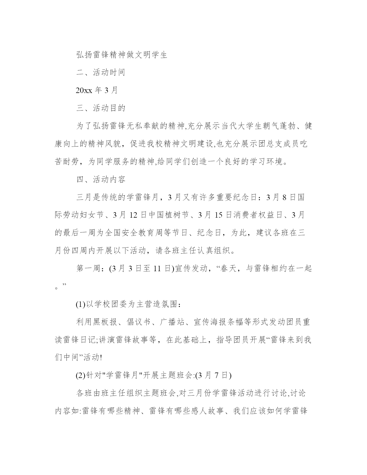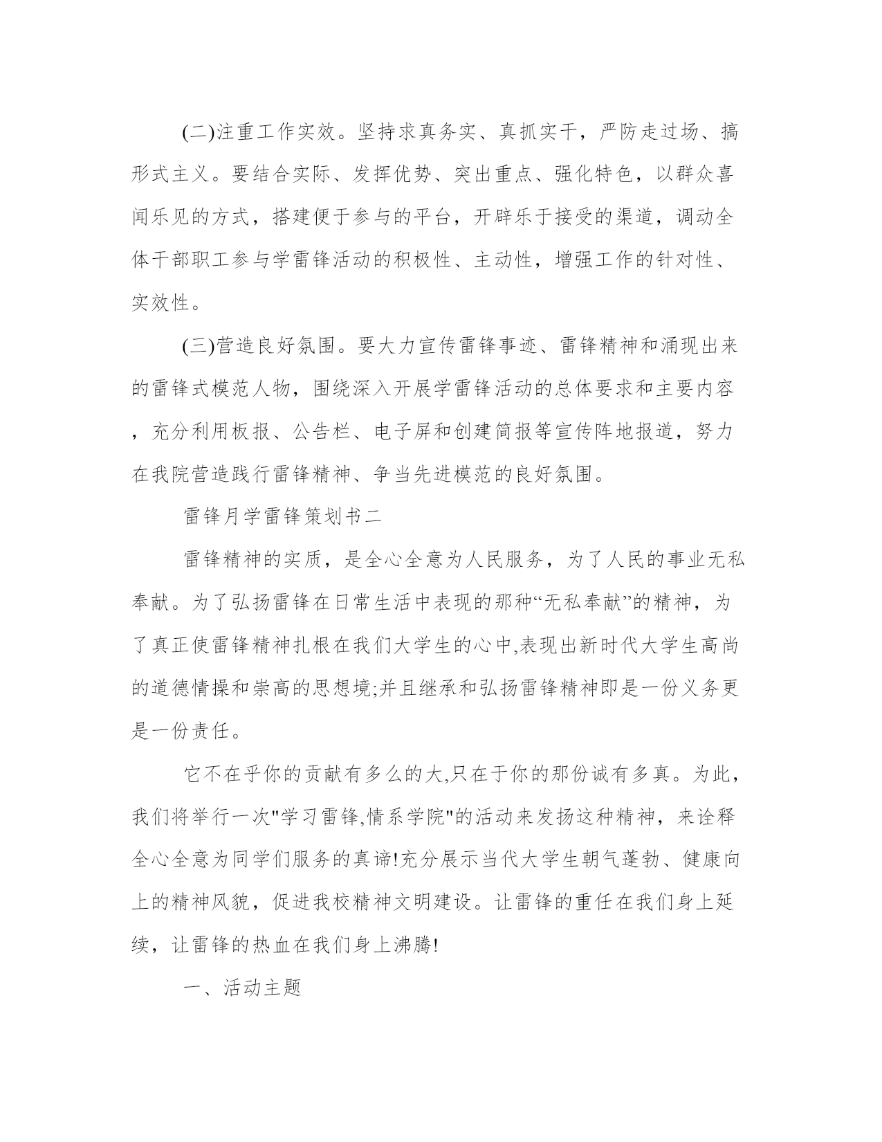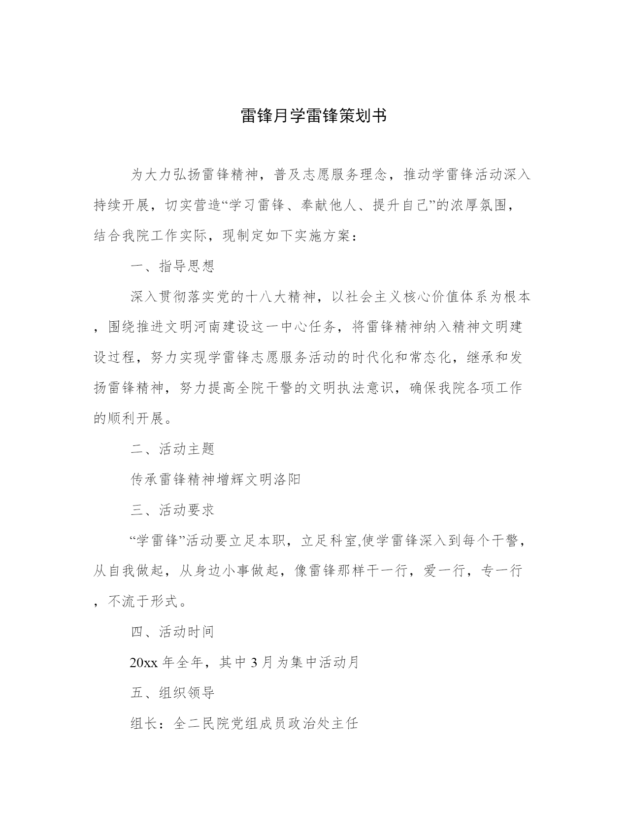雷锋月学雷锋策划书为大力弘扬雷锋精神,普及志愿服务理念,推动学雷锋活动深入持续开展,切实营造“学习雷锋、奉献他人、提升自己”的浓厚氛围,结合我院工作实际,现制定如下实施方案:一、指导思想深入贯彻落实党的十八大精神,以社会主义核心价值体系为根本,围绕推进文明河南建设这一中心任务,将雷锋精神纳入精神文明建设过程,努力实现学雷锋志愿服务活动的时代化和常态化,继承和发扬雷锋精神,努力提高全院干警的文明执法意识,确保我院各项工作的顺利开展。二、活动主题传承雷锋精神增辉文明洛阳三、活动要求“学雷锋”活动要立足本职,立足科室,使学雷锋深入到每个干警,从自我做起,从身边小事做起,像雷锋那样干一行,爱一行,专一行,不流于形式。四、活动时间20xx年全年,其中3月为集中活动月五、组织领导组长:全二民院党组成员政治处主任副组长:李瑛人事科科长田炜宣传科科长成员:张新治崔瑞珠周静董国强六、活动内容(一)大力弘扬核心价值观。按照党的十八大和十八届三中全会精神,认真学习宣传中央颁布的社会主义核心价值观,抓好学习教育和主题实践,加强对雷锋精神的认知认同,使学雷锋活动常态化、持久化。(二)推进志愿服务活动。要把开展社会志愿服务作为学雷锋活动常态化的重要抓手,切实发挥学雷锋志愿服务队的示范作用,积极引导全院干警积极参与社会志愿服务活动,自觉履行公民义务和社会责任,促进形成“人人为我、我为人人”的良好社会风尚。(三)发挥先进典型作用。要把学雷锋与创先争优以及省级文明单位创建活动有机结合,树立学雷锋典型,大力宣传雷锋精神和雷锋式模范人物,积极培养学雷锋、志愿服务活动中涌现的先进典型,用身边的人和事感召激励广大干警。七、工作要求(一)加强组织领导。各科室要充分认识深入开展学雷锋活动的现实意义,抓紧抓实抓出成效。要紧密结合自身工作实际,对深入开展学雷锋活动进行认真准备、周密安排、精心部署,迅速掀起学雷锋活动的高潮。(二)注重工作实效。坚持求真务实、真抓实干,严防走过场、搞形式主义。要结合实际、发挥优势、突出重点、强化特色,以群众喜闻乐见的方式,搭建便于参与的平台,开辟乐于接受的渠道,调动全体干部职工参与学雷锋活动的积极性、主动性,增强工作的针对性、实效性。(三)营造良好氛围。要大力宣传雷锋事迹、雷锋精神和涌现出来的雷锋式模范人物,围绕深入开展学雷锋活动的总体要求和主要内容,充分利用板报、公告栏、电子屏和创建简报等宣传阵地报道,努力在我院营造践行雷锋精神、争当先进模范的良好氛围。雷锋月学雷锋策划书二雷锋精神的实质,是全心全意为人民服务,为了人民的事业无私奉献。为了弘扬雷锋在日常生活中表现的那种“无私奉献”的精神,为了真正使雷锋精神扎根在我们大学生的心中,表现出新时代大学生高尚的道德情操和崇高的思想境;并且继承和弘扬雷锋精神即是一份义务更是一份责任。它不在乎你的贡献有多么的大,只在于你的那份诚有多真。为此,我们将举行一次"学习雷锋,情系学院"的活动来发扬这种精神,来诠释全心全意为同学们服务的真谛!充分展示当代大学生朝气蓬勃、健康向上的精神风貌,促进我校精神文明建设。让雷锋的重任在我们身上延续,让雷锋的热血在我们身上沸腾!一、活动主题弘扬雷锋精神做文明学生二、活动时间20xx年3月三、活动目的为了弘扬雷锋无私奉献的精神,充分展示当代大学生朝气蓬勃、健康向上的精神风貌,促进我校精神文明建设,也充分展示团总支成员吃苦耐劳,为同学服务的精神,给同学们创造一个良好的学习环境。四、活动内容三月是传统的学雷锋月,3月又有许多重要纪念日:3月8日国际劳动妇女节、3月12日中国植树节、3月15日消费者权益日、3月的最后一周为全国安全教育周等节日、纪念日,为此,建议各班在三月份四周内开展以下活动,请各班主任认真组织。第一周:(3月3日至11日)宣传发动,“春天,与雷锋相约在一起。”(1)以学校团委为主营造氛围:利用黑板报、倡议书、广播站、宣传海报条幅等形式发动团员重读雷锋日记;讲演雷锋故事等,在此基础上,指导团员开展“雷锋来到我们中间”活动!(2)针对"学雷锋月"开展主题班会:(3月7日)各班由班主任组织主题班会,对三月份学雷锋活动进行讨论,讨论内容如:雷锋有哪些精神、雷锋有哪些感人故事、我们应该如何学雷锋、你认为现代的雷锋精神是什么等。让同学们认识到雷锋精神处处可体现,在现实生活当中处处学习、体现雷锋精神。(3)以班级为主,辐射浓厚气氛:各班出好一期有关雷锋的板报。要求:板报主题要鲜明,内容要切合班里的实际,大力宣传班中的好人好事,找出最有代表性、最有意义的好人好事来做典型。由各班宣传委员负责组织出好这一期板报。(3月11日进行评比)第二周:(3月12日至17日)实施阶段,“学雷锋从我做起,从小事做起。”