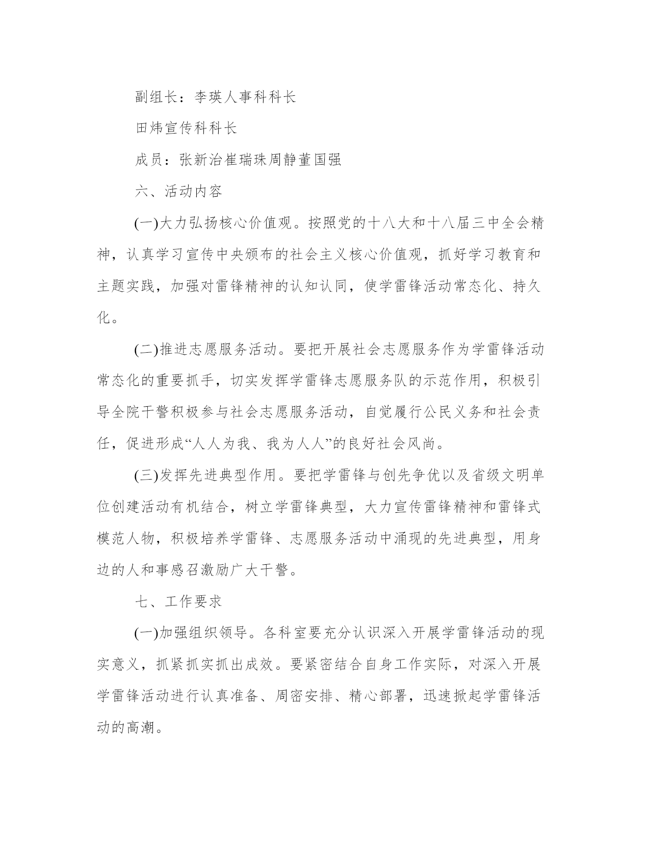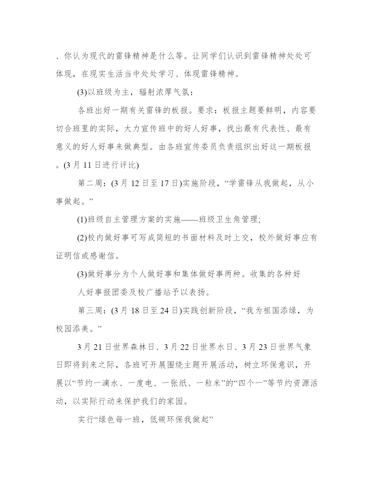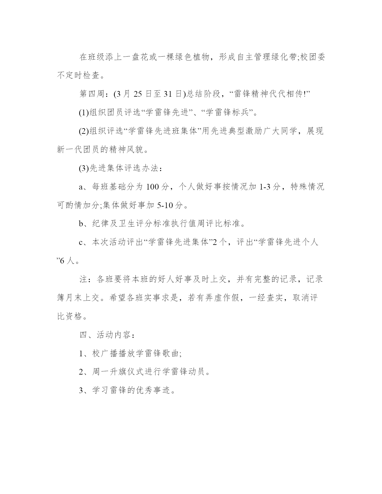 雷锋月学雷锋策划书为大力弘扬雷锋精神,普及志愿服务理念,推动学雷锋活动深入持续开展,切实营造“学习雷锋、奉献他人、提升自己”的浓厚氛围,结合我院工作实际,现制定如下实施方案:一、指导思想深入贯彻落实党的十八大精神,以社会主义核心价值体系为根本,围绕推进文明河南建设这一中心任务,将雷锋精神纳入精神文明建设过程,努力实现学雷锋志愿服务活动的时代化和常态化,继承和发扬雷锋精神,努力提高全院干警的文明执法意识,确保我院各项工作的顺利开展。二、活动主题传承雷锋精神增辉文明洛阳三、活动要求“学雷锋”活动要立足本职,立足科室,使学雷锋深入到每个干警,从自我做起,从身边小事做起,像雷锋那样干一行,爱一行,专一行,不流于形式。四、活动时间20xx年全年,其中3月为集中活动月五、组织领导组长:全二民院党组成员政治处主任副组长:李瑛人事科科长田炜宣传科科长成员:张新治崔瑞珠周静董国强六、活动内容(一)大力弘扬核心价值观。按照党的十八大和十八届三中全会精神,认真学习宣传中央颁布的社会主义核心价值观,抓好学习教育和主题实践,加强对雷锋精神的认知认同,使学雷锋活动常态化、持久化。(二)推进志愿服务活动。要把开展社会志愿服务作为学雷锋活动常态化的重要抓手,切实发挥学雷锋志愿服务队的示范作用,积极引导全院干警积极参与社会志愿服务活动,自觉履行公民义务和社会责任,促进形成“人人为我、我为人人”的良好社会风尚。(三)发挥先进典型作用。要把学雷锋与创先争优以及省级文明单位创建活动有机结合,树立学雷锋典型,大力宣传雷锋精神和雷锋式模范人物,积极培养学雷锋、志愿服务活动中涌现的先进典型,用身边的人和事感召激励广大干警。七、工作要求(一)加强组织领导。各科室要充分认识深入开展学雷锋活动的现实意义,抓紧抓实抓出成效。要紧密结合自身工作实际,对深入开展学雷锋活动进行认真准备、周密安排、精心部署,迅速掀起学雷锋活动的高潮。(二)注重工作实效。坚持求真务实、真抓实干,严防走过场、搞形式主义。要结合实际、发挥优势、突出重点、强化特色,以群众喜闻乐见的方式,搭建便于参与的平台,开辟乐于接受的渠道,调动全体干部职工参与学雷锋活动的积极性、主动性,增强工作的针对性、实效性。(三)营造良好氛围。要大力宣传雷锋事迹、雷锋精神和涌现出来的雷锋式模范人物,围绕深入开展学雷锋活动的总体要求和主要内容,充分利用板报、公告栏、电子屏和创建简报等宣传阵地报道,努力在我院营造践行雷锋精神、争当先进模范的良好氛围。雷锋月学雷锋策划书二雷锋精神的实质,是全心全意为人民服务,为了人民的事业无私奉献。为了弘扬雷锋在日常生活中表现的那种“无私奉献”的精神,为了真正使雷锋精神扎根在我们大学生的心中,表现出新时代大学生高尚的道德情操和崇高的思想境;并且继承和弘扬雷锋精神即是一份义务更是一份责任。它不在乎你的贡献有多么的大,只在于你的那份诚有多真。为此,我们将举行一次"学习雷锋,情系学院"的活动来发扬这种精神,来诠释全心全意为同学们服务的真谛!充分展示当代大学生朝气蓬勃、健康向上的精神风貌,促进我校精神文明建设。让雷锋的重任在我们身上延续,让雷锋的热血在我们身上沸腾!一、活动主题弘扬雷锋精神做文明学生二、活动时间20xx年3月三、活动目的为了弘扬雷锋无私奉献的精神,充分展示当代大学生朝气蓬勃、健康向上的精神风貌,促进我校精神文明建设,也充分展示团总支成员吃苦耐劳,为同学服务的精神,给同学们创造一个良好的学习环境。四、活动内容三月是传统的学雷锋月,3月又有许多重要纪念日:3月8日国际劳动妇女节、3月12日中国植树节、3月15日消费者权益日、3月的最后一周为全国安全教育周等节日、纪念日,为此,建议各班在三月份四周内开展以下活动,请各班主任认真组织。第一周:(3月3日至11日)宣传发动,“春天,与雷锋相约在一起。”(1)以学校团委为主营造氛围:利用黑板报、倡议书、广播站、宣传海报条幅等形式发动团员重读雷锋日记;讲演雷锋故事等,在此基础上,指导团员开展“雷锋来到我们中间”活动!(2)针对"学雷锋月"开展主题班会:(3月7日)各班由班主任组织主题班会,对三月份学雷锋活动进行讨论,讨论内容如:雷锋有哪些精神、雷锋有哪些感人故事、我们应该如何学雷锋、你认为现代的雷锋精神是什么等。让同学们认识到雷锋精神处处可体现,在现实生活当中处处学习、体现雷锋精神。(3)以班级为主,辐射浓厚气氛:各班出好一期有关雷锋的板报。要求:板报主题要鲜明,内容要切合班里的实际,大力宣传班中的好人好事,找出最有代表性、最有意义的好人好事来做典型。由各班宣传委员负责组织出好这一期板报。(3月11日进行评比)第二周:(3月12日至17日)实施阶段,“学雷锋从我做起,从小事做起。”