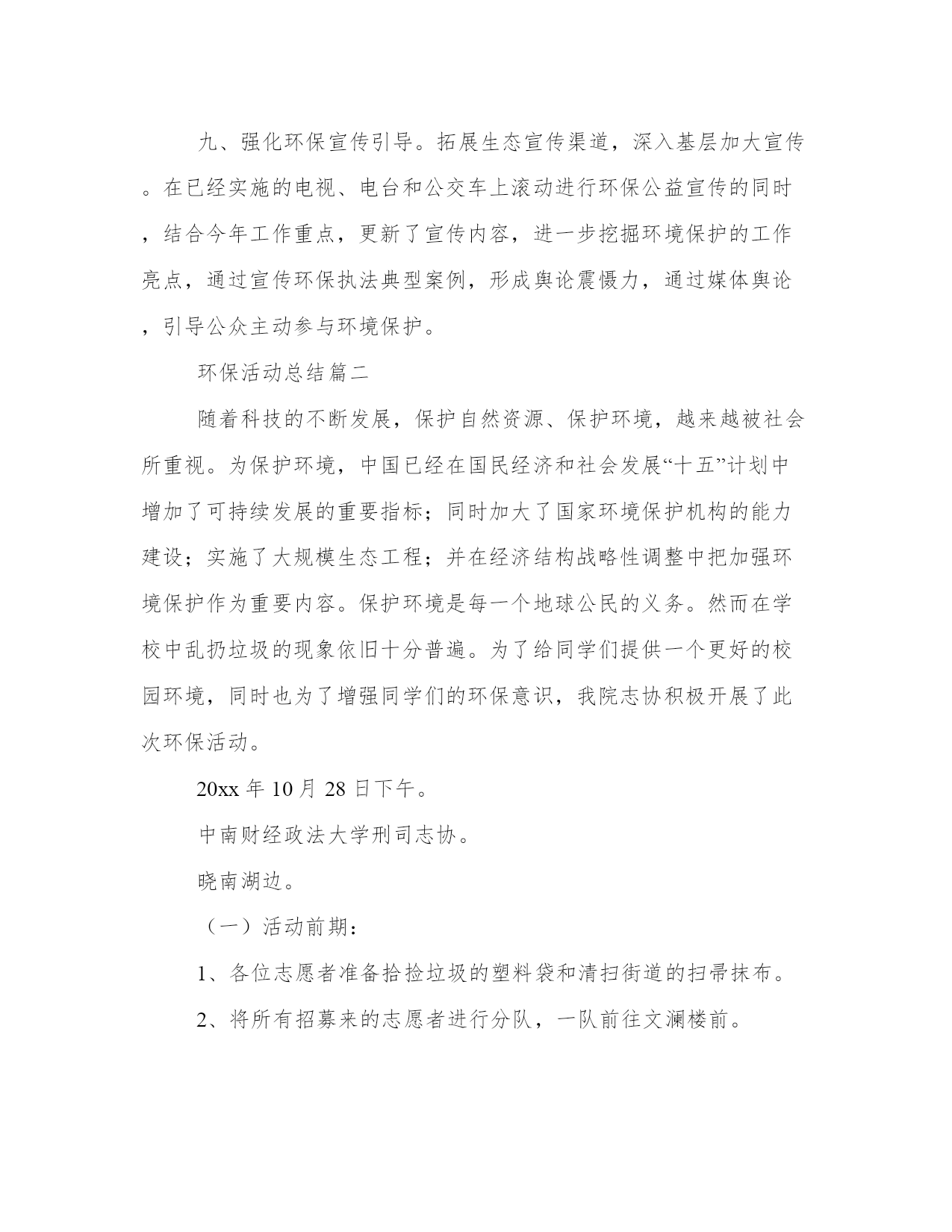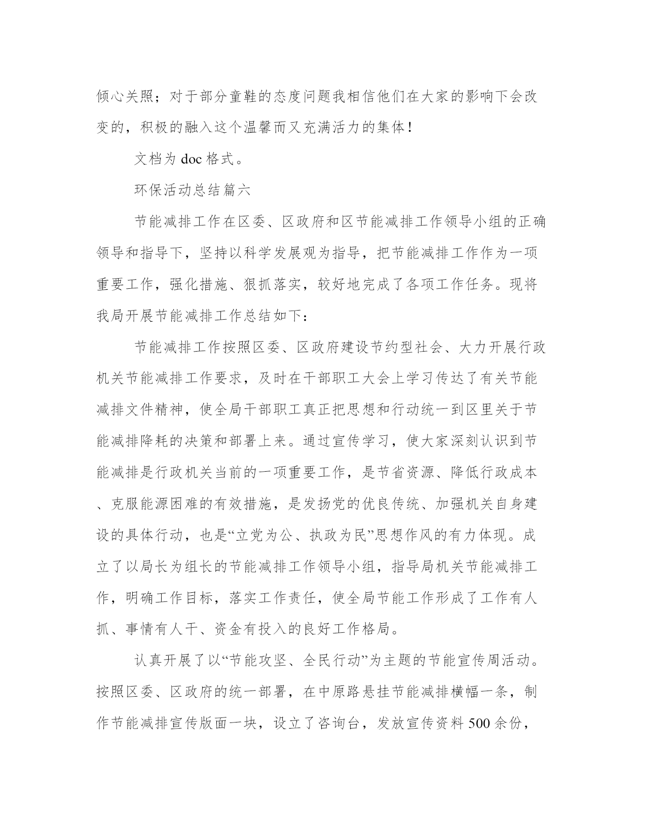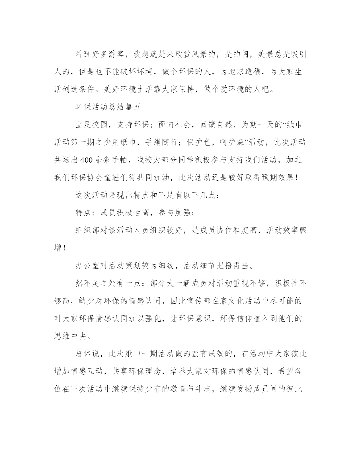 环保活动总结(模板17篇)总结是一种总结和概括学习、工作、生活等表现的书面材料。要写一篇完美的总结,首先要明确总结的目的和对象。总结工作中的得失,我理解到要保持积极的心态和正确的工作方法,这对工作的顺利进行非常重要。环保活动总结篇一一、健全“清三河”“防反弹”长效机制。开展常态化工作督查,对40条区级河长制河道和111条黑臭河实行每月一次监测,每月一次检查,每月一次通报,落实河道管理的长效机制,有效改善辖区水环境质量。二、强化环境执法监管。整合全局执法力量,开展重点区域、重点企业的排摸,通过夜查、错时查、异地执法查、突击检查等方式,严厉打击违法排污现象。上半年,全局开展“亮剑”执法行动、错时错地(联合)执法等70余次,检查企业3200余家次,对80余家企业和个人实施了行政处罚,对违法企业采取查封扣押15次,因环境违法行为向公安部门移交刑事(治安)案件4起,采取刑事强制措施4人,行政拘留1人,有力惩处环境违法行为。三、加强污染源头管控。严格把好建设项目准入关,依法办理环保审批手续。今年对405个项目进行了现场踏勘,因选址不当或不符合环保审批原则等原因否决的项目94个,项目否决率23.2%。提前介入参加项目评审,对新建项目提出选址、审批等环保相关要求,促使建设项目从设计阶段遵守环保规定、符合环保要求。四、开展污染行业整治。进一步巩固印染、造纸、化工、食品加工等行业的整治提升成果,并深化电镀、铸造、金属表面处理、蔺草、矿山等行业整治。五、推进vocs整治工作。开展12类重点vocs排放行业的治理,制定了工作方案、治理方案,完成了污染源调查工作,摸清整治企业底数,组织整治企业参加市、区的挥发性有机物污染治理技术培训,指导督促企业对照污染物排放标准和治理规范,制定“一厂一策”。六、加快黄标车淘汰及黄标车限行工作。通过精确排查、上门宣讲、执法倒逼淘汰等方式,已全部完成黄标车淘汰任务。同时,我局与交警部门联合开展机动车排气道路抽测工作,促进全区黄标车限行工作常态化管理。七、加强环境监测。完成饮用水源监测、地表水监测、交接断面监测及县控点位地表水监测,同时实时开展环境空气、大气降尘及酸雨监测,开展道路及区域环境噪声监测,做好监测数据支撑。八、推进生态任务落实。制订了20xx年度鄞州区生态环保工作任务书,将任务分解至36个生态区创建工作领导小组成员单位。细化了考核评分标准,并重新修订了鄞州生态文明建设工作目标年度考核实施办法,进一步明确各乡镇(街道)的生态任务和考核办法,同时,积极推进国家生态文明建设示范区创建规划编制等前期工作。九、强化环保宣传引导。拓展生态宣传渠道,深入基层加大宣传。在已经实施的电视、电台和公交车上滚动进行环保公益宣传的同时,结合今年工作重点,更新了宣传内容,进一步挖掘环境保护的工作亮点,通过宣传环保执法典型案例,形成舆论震慑力,通过媒体舆论,引导公众主动参与环境保护。环保活动总结篇二随着科技的不断发展,保护自然资源、保护环境,越来越被社会所重视。为保护环境,中国已经在国民经济和社会发展“十五”计划中增加了可持续发展的重要指标;同时加大了国家环境保护机构的能力建设;实施了大规模生态工程;并在经济结构战略性调整中把加强环境保护作为重要内容。保护环境是每一个地球公民的义务。然而在学校中乱扔垃圾的现象依旧十分普遍。为了给同学们提供一个更好的校园环境,同时也为了增强同学们的环保意识,我院志协积极开展了此次环保活动。20xx年10月28日下午。中南财经政法大学刑司志协。晓南湖边。(一)活动前期:1、各位志愿者准备拾捡垃圾的塑料袋和清扫街道的扫帚抹布。2、将所有招募来的志愿者进行分队,一队前往文澜楼前。草地及主干道,另一队前往九孔桥边草地及主干道。每队人员继续分成三小组,每组三至六人,每一组选择一个组长,分别负责清扫垃圾,二次检查清扫和监督检查清扫情况。(二)活动中期:1、组织并带领志愿者在下午四点准时文潭楼前集合。2、人员到达各自的地点后,四点十五活动正式开始,按照分组所分配的任务处理相关事宜。3、五点钟活动结束,各组同学们将拾捡清扫的垃圾汇总,统一运到垃圾处理站,并清理现场。(三)活动后期:1、协会秘书处写活动总结,并在协会负责人的带领下开展总结大会,总结此次活动的得与失。2、宣传部做好后期的宣传工作,可以制作成展板等形式,鼓励志愿者自己写感受并向校报投稿。通过此次环保活动,带动同学们一起行动,为保护环境贡献了自己的力量,也提高了大家自觉保护环境的意识。同时让志愿者体会到志愿服务的精神,提高了大家参加志愿者活动的积极性,促进志愿者活动的进一步发展。环保活动总结篇三为提高广大市民环境保护意识和环保知晓率,20xx年6月8月我街道在全辖区开展“环保知识宣传进院落活动”,现总结如