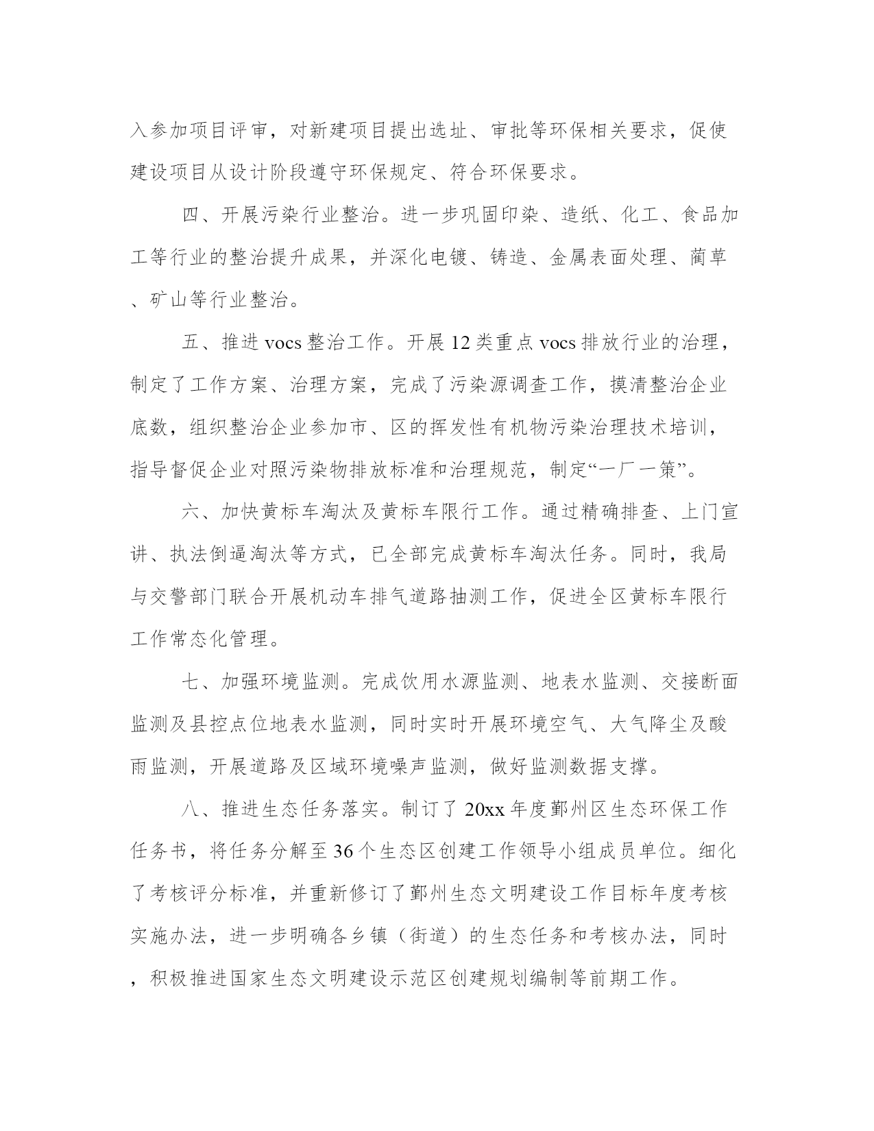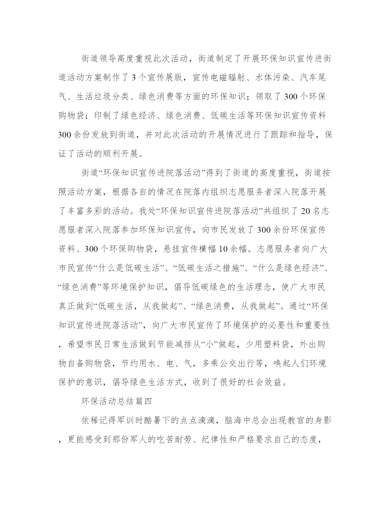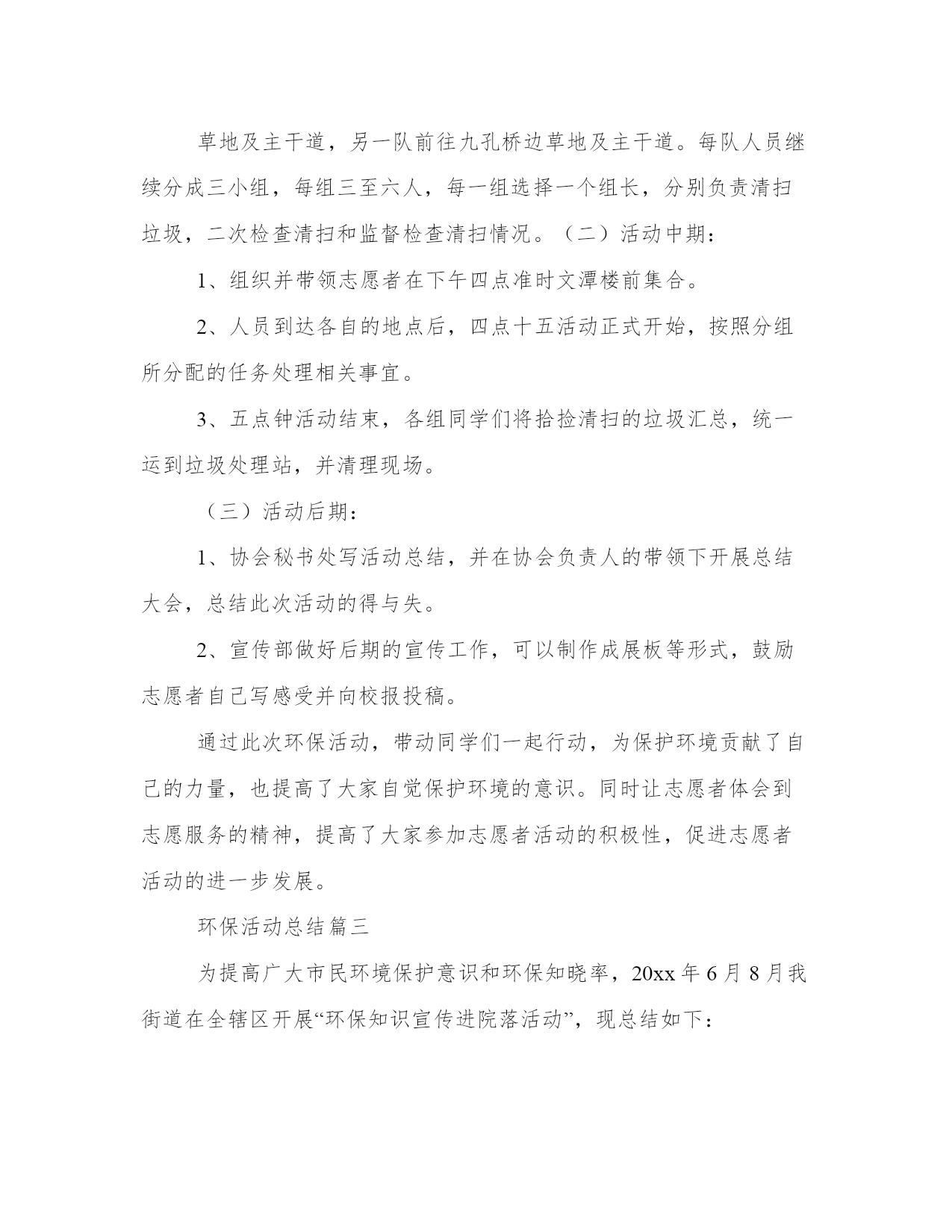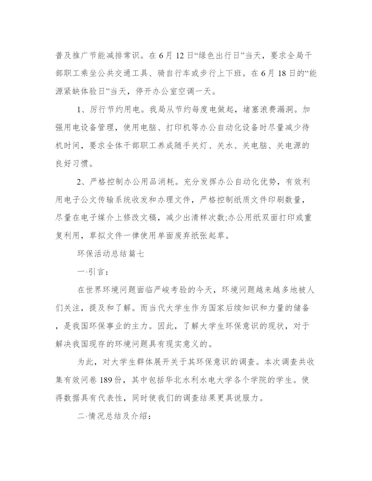 环保活动总结(模板17篇)总结是一种总结和概括学习、工作、生活等表现的书面材料。要写一篇完美的总结,首先要明确总结的目的和对象。总结工作中的得失,我理解到要保持积极的心态和正确的工作方法,这对工作的顺利进行非常重要。环保活动总结篇一一、健全“清三河”“防反弹”长效机制。开展常态化工作督查,对40条区级河长制河道和111条黑臭河实行每月一次监测,每月一次检查,每月一次通报,落实河道管理的长效机制,有效改善辖区水环境质量。二、强化环境执法监管。整合全局执法力量,开展重点区域、重点企业的排摸,通过夜查、错时查、异地执法查、突击检查等方式,严厉打击违法排污现象。上半年,全局开展“亮剑”执法行动、错时错地(联合)执法等70余次,检查企业3200余家次,对80余家企业和个人实施了行政处罚,对违法企业采取查封扣押15次,因环境违法行为向公安部门移交刑事(治安)案件4起,采取刑事强制措施4人,行政拘留1人,有力惩处环境违法行为。三、加强污染源头管控。严格把好建设项目准入关,依法办理环保审批手续。今年对405个项目进行了现场踏勘,因选址不当或不符合环保审批原则等原因否决的项目94个,项目否决率23.2%。提前介入参加项目评审,对新建项目提出选址、审批等环保相关要求,促使建设项目从设计阶段遵守环保规定、符合环保要求。四、开展污染行业整治。进一步巩固印染、造纸、化工、食品加工等行业的整治提升成果,并深化电镀、铸造、金属表面处理、蔺草、矿山等行业整治。五、推进vocs整治工作。开展12类重点vocs排放行业的治理,制定了工作方案、治理方案,完成了污染源调查工作,摸清整治企业底数,组织整治企业参加市、区的挥发性有机物污染治理技术培训,指导督促企业对照污染物排放标准和治理规范,制定“一厂一策”。六、加快黄标车淘汰及黄标车限行工作。通过精确排查、上门宣讲、执法倒逼淘汰等方式,已全部完成黄标车淘汰任务。同时,我局与交警部门联合开展机动车排气道路抽测工作,促进全区黄标车限行工作常态化管理。七、加强环境监测。完成饮用水源监测、地表水监测、交接断面监测及县控点位地表水监测,同时实时开展环境空气、大气降尘及酸雨监测,开展道路及区域环境噪声监测,做好监测数据支撑。八、推进生态任务落实。制订了20xx年度鄞州区生态环保工作任务书,将任务分解至36个生态区创建工作领导小组成员单位。细化了考核评分标准,并重新修订了鄞州生态文明建设工作目标年度考核实施办法,进一步明确各乡镇(街道)的生态任务和考核办法,同时,积极推进国家生态文明建设示范区创建规划编制等前期工作。九、强化环保宣传引导。拓展生态宣传渠道,深入基层加大宣传。在已经实施的电视、电台和公交车上滚动进行环保公益宣传的同时,结合今年工作重点,更新了宣传内容,进一步挖掘环境保护的工作亮点,通过宣传环保执法典型案例,形成舆论震慑力,通过媒体舆论,引导公众主动参与环境保护。环保活动总结篇二随着科技的不断发展,保护自然资源、保护环境,越来越被社会所重视。为保护环境,中国已经在国民经济和社会发展“十五”计划中增加了可持续发展的重要指标;同时加大了国家环境保护机构的能力建设;实施了大规模生态工程;并在经济结构战略性调整中把加强环境保护作为重要内容。保护环境是每一个地球公民的义务。然而在学校中乱扔垃圾的现象依旧十分普遍。为了给同学们提供一个更好的校园环境,同时也为了增强同学们的环保意识,我院志协积极开展了此次环保活动。20xx年10月28日下午。中南财经政法大学刑司志协。晓南湖边。(一)活动前期:1、各位志愿者准备拾捡垃圾的塑料袋和清扫街道的扫帚抹布。2、将所有招募来的志愿者进行分队,一队前往文澜楼前。草地及主干道,另一队前往九孔桥边草地及主干道。每队人员继续分成三小组,每组三至六人,每一组选择一个组长,分别负责清扫垃圾,二次检查清扫和监督检查清扫情况。(二)活动中期:1、组织并带领志愿者在下午四点准时文潭楼前集合。2、人员到达各自的地点后,四点十五活动正式开始,按照分组所分配的任务处理相关事宜。3、五点钟活动结束,各组同学们将拾捡清扫的垃圾汇总,统一运到垃圾处理站,并清理现场。(三)活动后期:1、协会秘书处写活动总结,并在协会负责人的带领下开展总结大会,总结此次活动的得与失。2、宣传部做好后期的宣传工作,可以制作成展板等形式,鼓励志愿者自己写感受并向校报投稿。通过此次环保活动,带动同学们一起行动,为保护环境贡献了自己的力量,也提高了大家自觉保护环境的意识。同时让志愿者体会到志愿服务的精神,提高了大家参加志愿者活动的积极性,促进志愿者活动的进一步发展。环保活动总结篇三为提高广大市民环境保护意识和环保知晓率,20xx年6月8月我街道在全辖区开展“环保知识宣传进院落活动”,现总结如