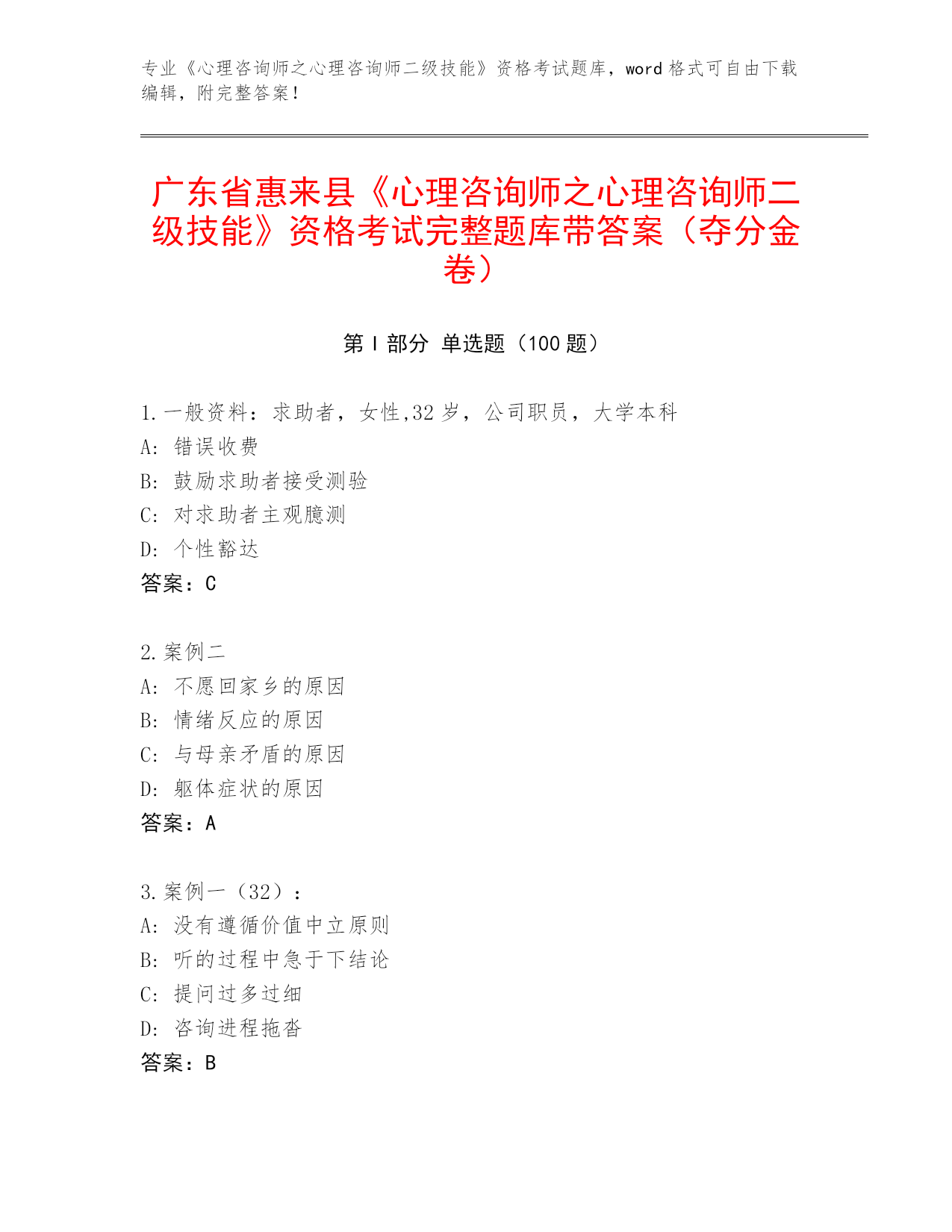 广东省惠来县《心理咨询师之心理咨询师二级技能》资格考试完整题库带答案(夺分金卷)