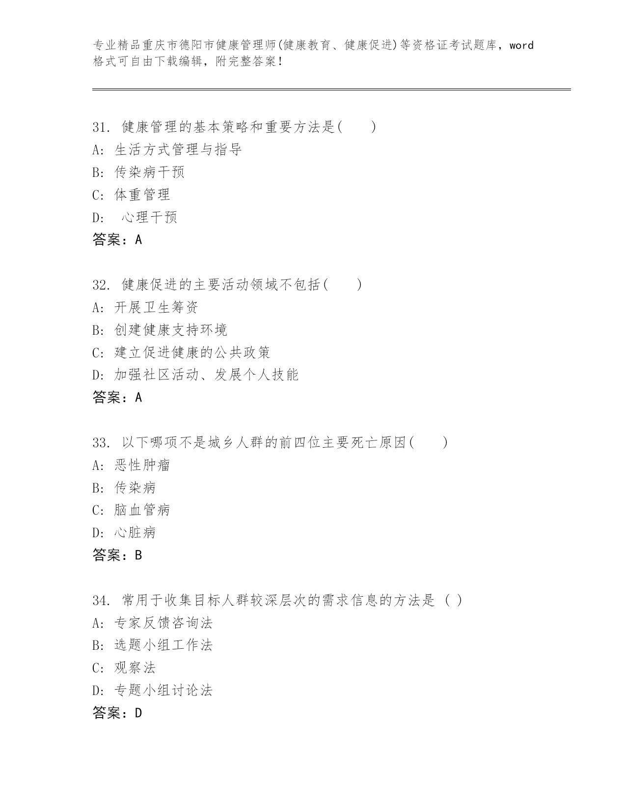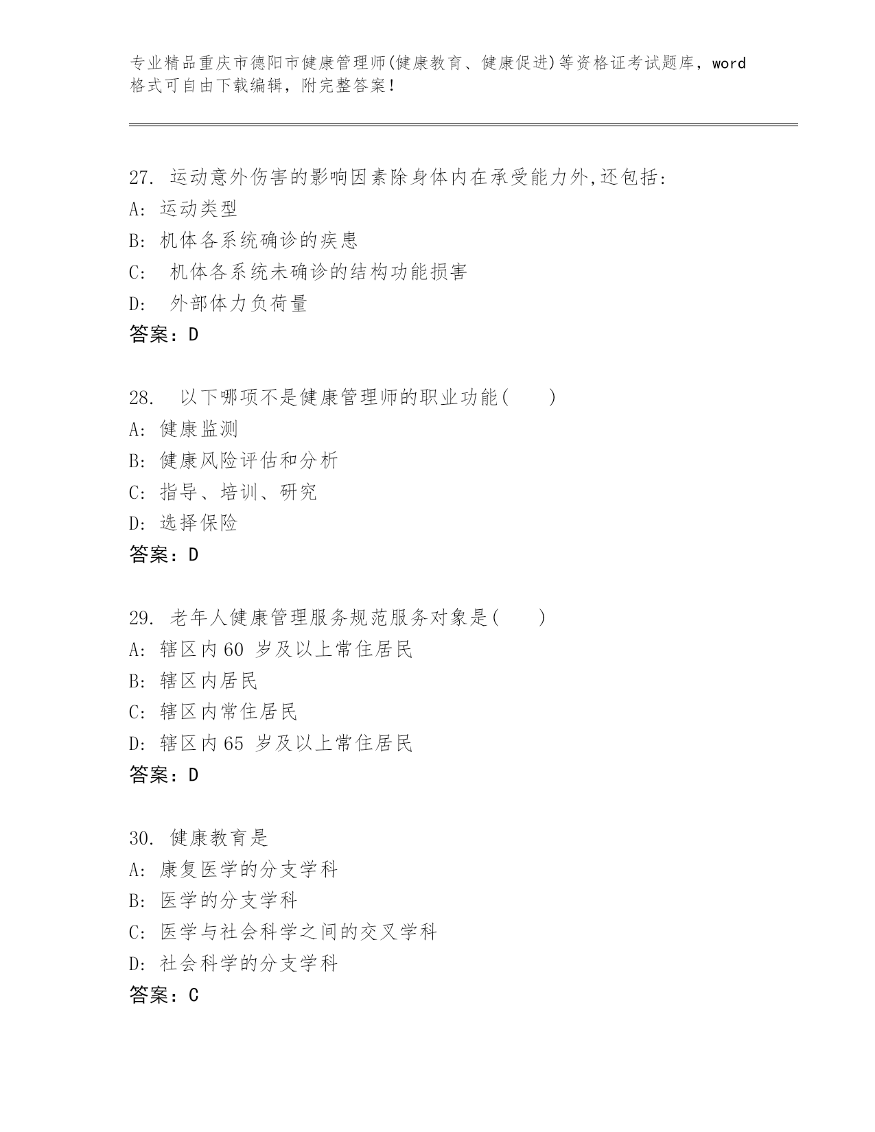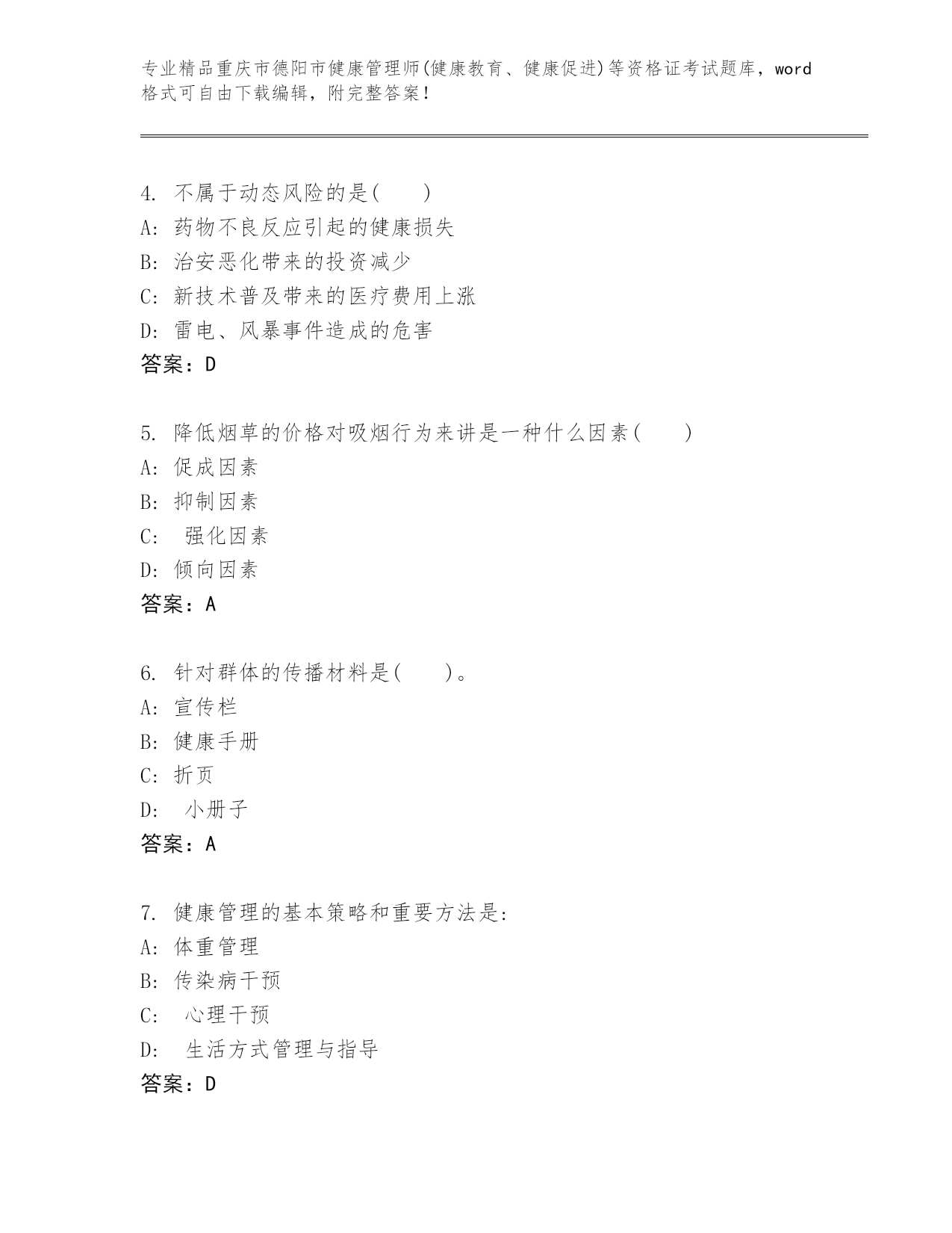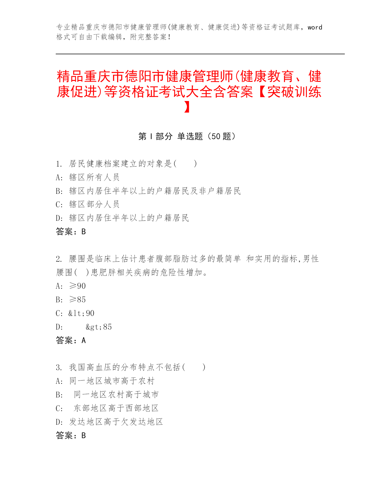 精品重庆市德阳市健康管理师(健康教育、健康促进)等资格证考试大全含答案【突破训练】.docx