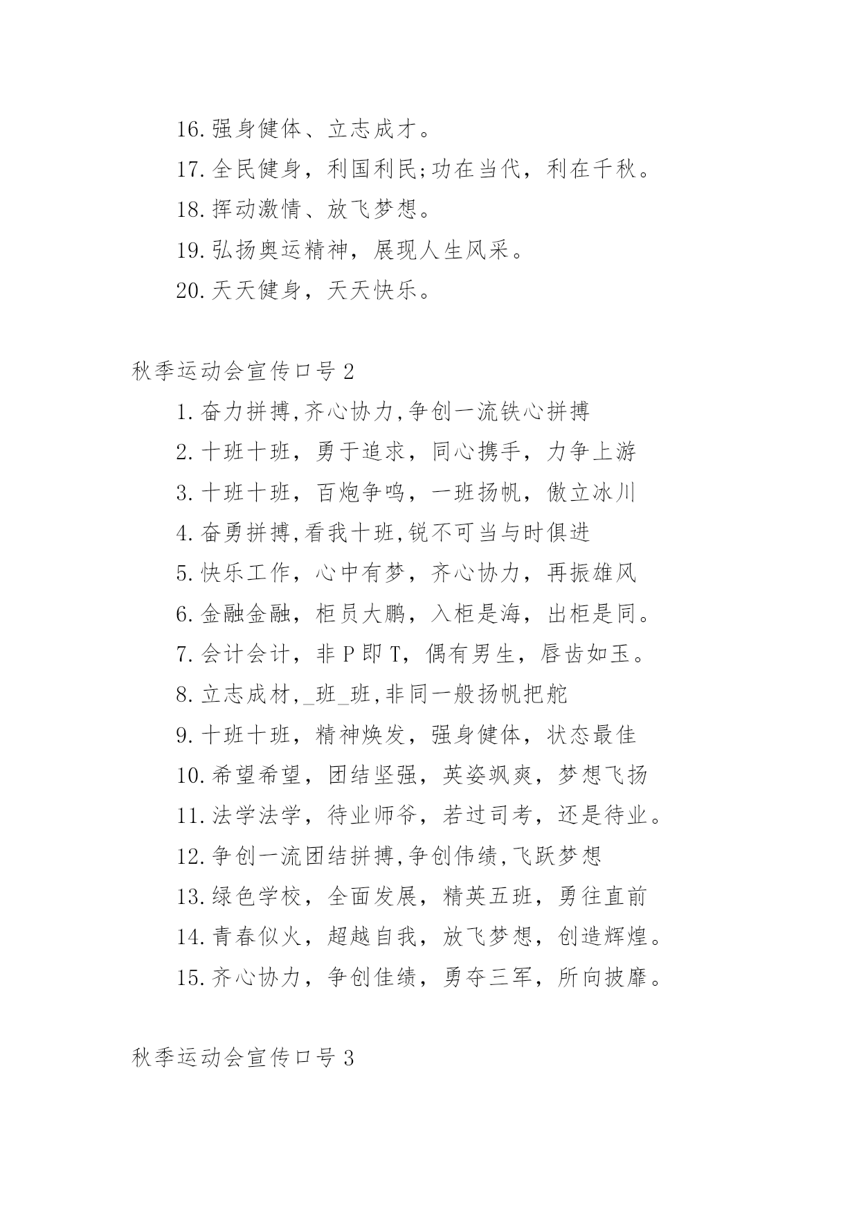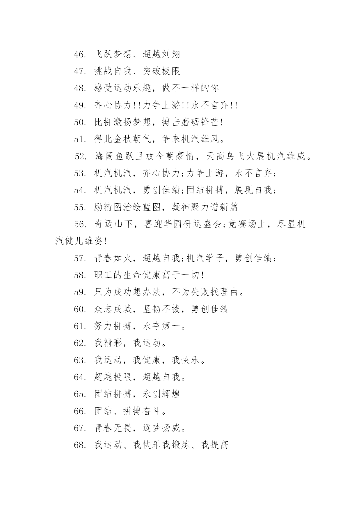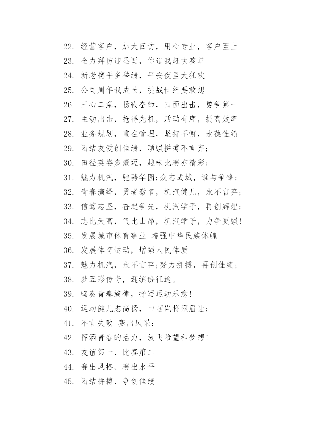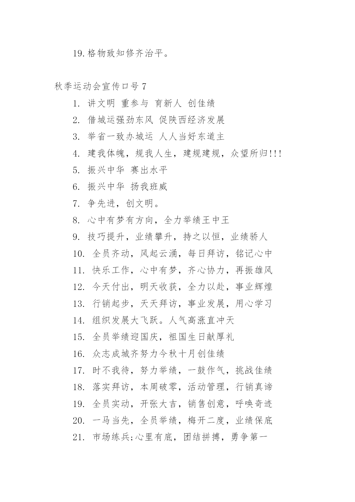 秋季运动会宣传口号在学习、工作乃至生活中,大家对口号都再熟悉不过了吧,简短的句式、朴素的遣词造句方式、流畅的音韵效果,是口号的一大形式特征。还苦于找不到好的口号?下面是小编帮大家整理的秋季运动会宣传口号,欢迎阅读,希望大家能够喜欢。秋季运动会宣传口号11.体育的盛会,我们的节日。2.每天锻炼一小时、快乐工作每一天、健康生活一辈子。3.磨砺意志、奋发冲刺4.锻炼身体,增强体质;报效祖国,造福人类5.全民健身,利国利民,功在当代,利在千秋。6.健康生活,快乐运动。7.拼搏奋进、永远进步。8.挑战运动极限,演绎健美人学9.发展体育运动,增强人民体质。10.青春无悔、激情无限。11.快乐健身,想动就动。12.全民健身,你我同行。13.奥运精神、永驻我心。14.顽强拼搏、勇夺第一。15.赛团结,赛意志;赛风格,赛水平。16.强身健体、立志成才。17.全民健身,利国利民;功在当代,利在千秋。18.挥动激情、放飞梦想。19.弘扬奥运精神,展现人生风采。20.天天健身,天天快乐。秋季运动会宣传口号21.奋力拼搏,齐心协力,争创一流铁心拼搏2.十班十班,勇于追求,同心携手,力争上游3.十班十班,百炮争鸣,一班扬帆,傲立冰川4.奋勇拼搏,看我十班,锐不可当与时俱进5.快乐工作,心中有梦,齐心协力,再振雄风6.金融金融,柜员大鹏,入柜是海,出柜是同。7.会计会计,非P即T,偶有男生,唇齿如玉。8.立志成材,_班_班,非同一般扬帆把舵9.十班十班,精神焕发,强身健体,状态最佳10.希望希望,团结坚强,英姿飒爽,梦想飞扬11.法学法学,待业师爷,若过司考,还是待业。12.争创一流团结拼搏,争创伟绩,飞跃梦想13.绿色学校,全面发展,精英五班,勇往直前14.青春似火,超越自我,放飞梦想,创造辉煌。15.齐心协力,争创佳绩,勇夺三军,所向披靡。秋季运动会宣传口号31、激流永进,永不言弃。2、大踏步向前,让生命实现我们的光彩。3、努力拼搏,锐意进取,携手奋进,共创佳绩。4、青春无畏,逐梦扬威。5、我运动、我快乐我锻炼、我提高6、比出风采、超越自我。7、更强我能、更快更高。8、拼搏追娶善学勤。9、团结拼搏拼搏进。10、努力奋斗勇敢争先。11、文明守纪拥抱胜利。12、在奋斗的路上切莫徘徊,在拼搏的途中切莫踌躇。13、挑战自我,征服自我,超越自我。14、自信、努力、超越、成功!15、怀学生心,做最强人。16、传承体育精神,共享竞技成功。17、我运动,我健康,我快乐。18、超越极限,超越自我。19、团结拼搏,永创辉煌,20、团结、拼搏奋斗。秋季运动会宣传口号41.公司周年我成长,挑战世纪要敢想2.心中有梦有方向,全力举绩王中王3.技巧提升,业绩攀升,持之以恒,业绩骄人4.全员齐动,风起云涌,每日拜访,铭记心中5.快乐工作,心中有梦,齐心协力,再振雄风6.一马当先,全员举绩,梅开二度,业绩保底7.扬帆把舵、奋勇拼搏、看我三班、锐不可当。8.互相学习、取长补短、再接再厉、勇攀高峰。9.九班九班、勇夺桂冠、齐心协力、共创辉煌。10.全民健身、利国利民、功在当代、利在千秋!11.互相学习、取长补短、再接再厉、勇攀高峰。12.强身健体、立志成材、班班、非同一般。13.雄鹰展翅振臂飞翔团结拼搏共创辉煌14.超越自己永不放弃15.高二十班冲锋在前为了明日凤舞九天16.七八七八精神焕发强身健体状态最佳17.我爱十九我爱七四团结奋进永不放弃18.努力拼搏为校争光同心同德再创辉煌19.飞跃长空勇攀高峰齐心协力一班称雄20.八年二班、猛虎出山、八年二班、锐不可当。21.励精图治、开拓进取、超越刘翔、从我做起。22.十班、十班、锐不可当、超越自我、再创辉煌。23.团结拼搏、争创伟绩、飞跃梦想、自强不息。24.看我六班、影子飒爽、奋勇拼搏、展现自我。25.比出风采、超越自我。团结拼搏、奋发有为。26.行销起步,天天拜访,事业发展,用心学习27.组织发展大飞跃、人气高涨直冲天28.众志成城齐努力.今秋十月创佳绩29.全力拜访迎圣诞,你追我赶快签单30.新老携手多举绩,平安夜里大狂欢31.群雄竞技各领风骚唯我九班独占鳌头32.严肃活泼奋勇拼搏团结争先荣誉如山33.二四精神无所畏惧挥洒青春永不言弃34.超越自我勇于拼搏青春无畏追梦无悔35.六班六班非同一般团结一心勇往直前36.努力拼搏追求梦想同心同德再创辉煌37.十九雄风争荣立功二班精英谁与争锋38.追逐梦想放飞希望金色季节再放光芒39.时不我待,努力举绩,一鼓作气,挑战佳绩40.落实拜访,本周破零,活动管理,行销真谛41.全员实动,开张大吉,销售创意,呼唤奇迹42.市场练兵;心里有底,团结拼搏,勇争第一43.经营客户,加大回访,用心专业,客户至上44.今天付出,明天收获,全力以赴,事业辉煌45.八班一出、谁与争锋、横扫赛场、唯我称雄。46.
