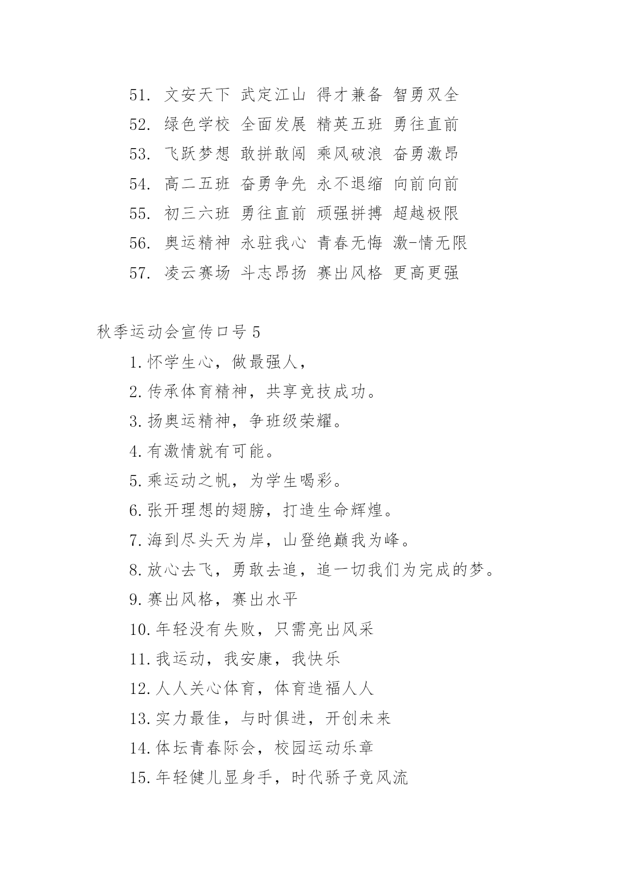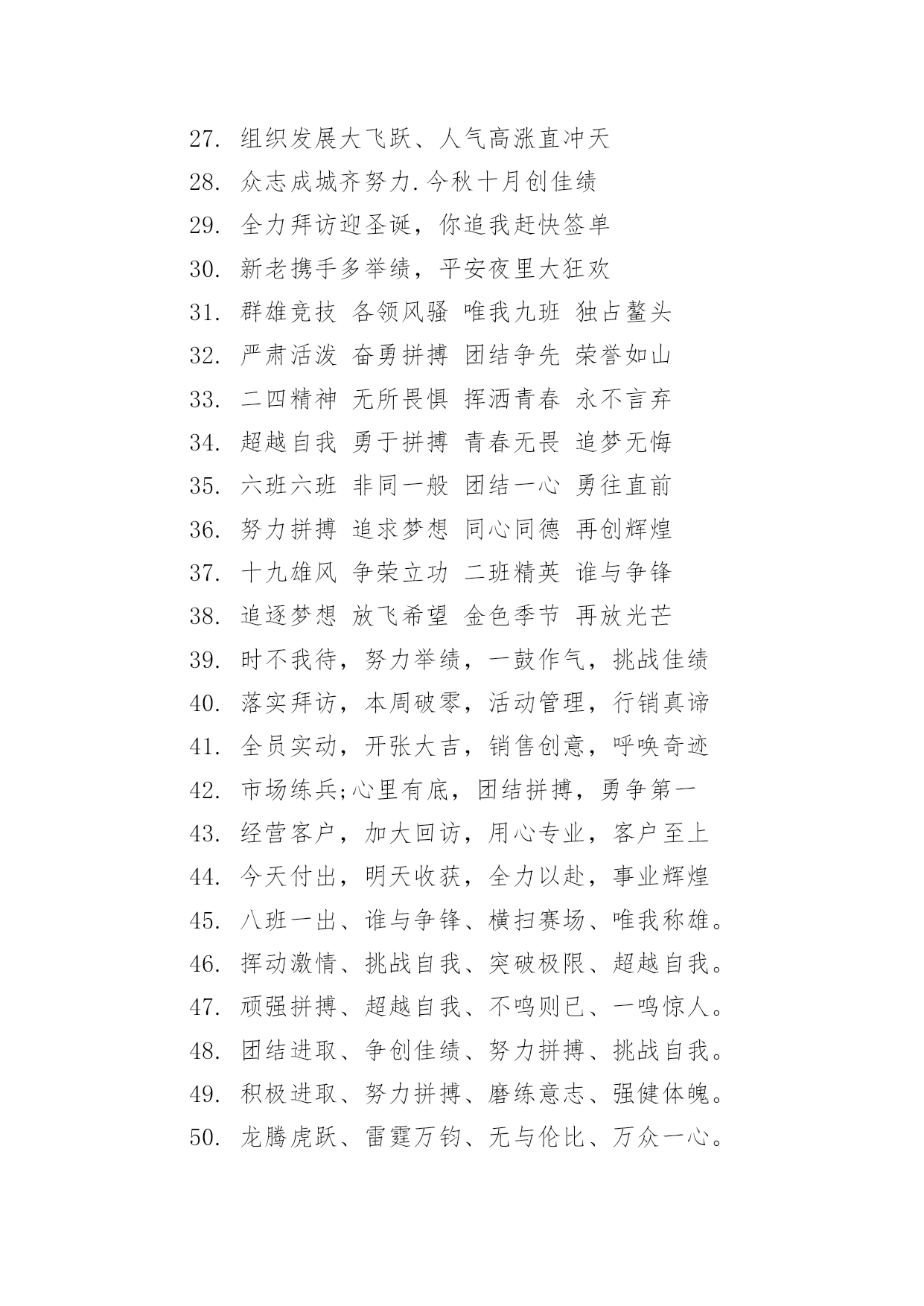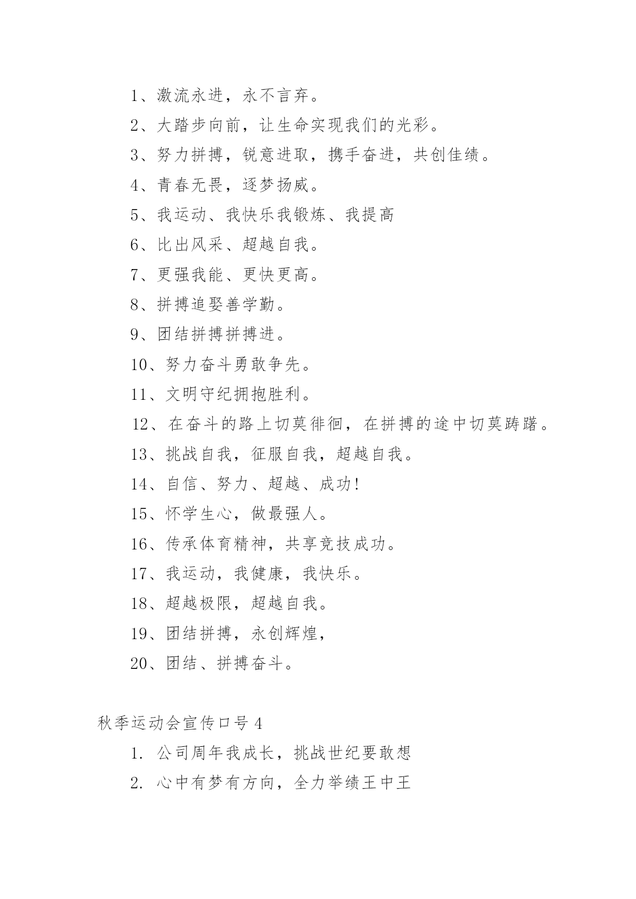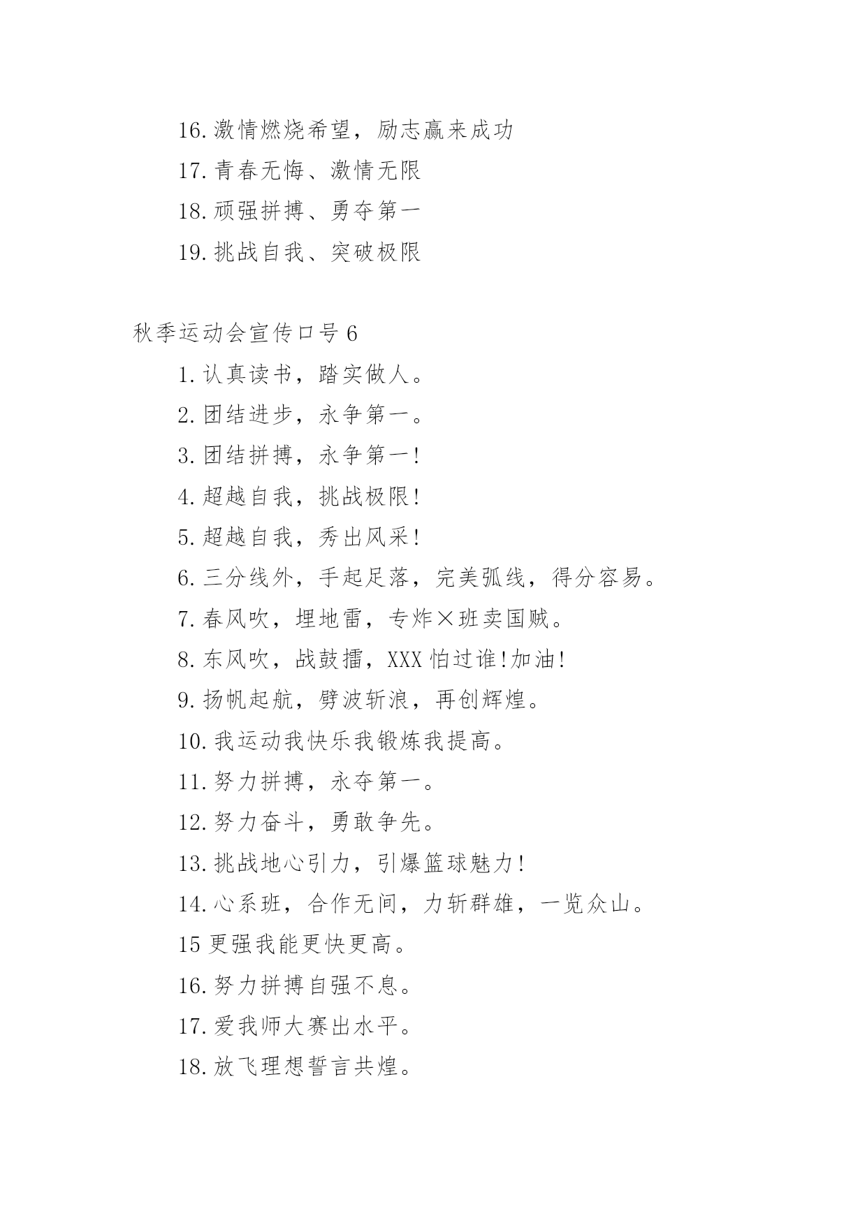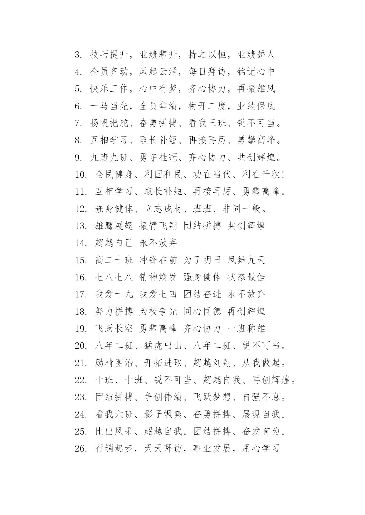 秋季运动会宣传口号在学习、工作乃至生活中,大家对口号都再熟悉不过了吧,简短的句式、朴素的遣词造句方式、流畅的音韵效果,是口号的一大形式特征。还苦于找不到好的口号?下面是小编帮大家整理的秋季运动会宣传口号,欢迎阅读,希望大家能够喜欢。秋季运动会宣传口号11.体育的盛会,我们的节日。2.每天锻炼一小时、快乐工作每一天、健康生活一辈子。3.磨砺意志、奋发冲刺4.锻炼身体,增强体质;报效祖国,造福人类5.全民健身,利国利民,功在当代,利在千秋。6.健康生活,快乐运动。7.拼搏奋进、永远进步。8.挑战运动极限,演绎健美人学9.发展体育运动,增强人民体质。10.青春无悔、激情无限。11.快乐健身,想动就动。12.全民健身,你我同行。13.奥运精神、永驻我心。14.顽强拼搏、勇夺第一。15.赛团结,赛意志;赛风格,赛水平。16.强身健体、立志成才。17.全民健身,利国利民;功在当代,利在千秋。18.挥动激情、放飞梦想。19.弘扬奥运精神,展现人生风采。20.天天健身,天天快乐。秋季运动会宣传口号21.奋力拼搏,齐心协力,争创一流铁心拼搏2.十班十班,勇于追求,同心携手,力争上游3.十班十班,百炮争鸣,一班扬帆,傲立冰川4.奋勇拼搏,看我十班,锐不可当与时俱进5.快乐工作,心中有梦,齐心协力,再振雄风6.金融金融,柜员大鹏,入柜是海,出柜是同。7.会计会计,非P即T,偶有男生,唇齿如玉。8.立志成材,_班_班,非同一般扬帆把舵9.十班十班,精神焕发,强身健体,状态最佳10.希望希望,团结坚强,英姿飒爽,梦想飞扬11.法学法学,待业师爷,若过司考,还是待业。12.争创一流团结拼搏,争创伟绩,飞跃梦想13.绿色学校,全面发展,精英五班,勇往直前14.青春似火,超越自我,放飞梦想,创造辉煌。15.齐心协力,争创佳绩,勇夺三军,所向披靡。秋季运动会宣传口号31、激流永进,永不言弃。2、大踏步向前,让生命实现我们的光彩。3、努力拼搏,锐意进取,携手奋进,共创佳绩。4、青春无畏,逐梦扬威。5、我运动、我快乐我锻炼、我提高6、比出风采、超越自我。7、更强我能、更快更高。8、拼搏追娶善学勤。9、团结拼搏拼搏进。10、努力奋斗勇敢争先。11、文明守纪拥抱胜利。12、在奋斗的路上切莫徘徊,在拼搏的途中切莫踌躇。13、挑战自我,征服自我,超越自我。14、自信、努力、超越、成功!15、怀学生心,做最强人。16、传承体育精神,共享竞技成功。17、我运动,我健康,我快乐。18、超越极限,超越自我。19、团结拼搏,永创辉煌,20、团结、拼搏奋斗。秋季运动会宣传口号41.公司周年我成长,挑战世纪要敢想2.心中有梦有方向,全力举绩王中王3.技巧提升,业绩攀升,持之以恒,业绩骄人4.全员齐动,风起云涌,每日拜访,铭记心中5.快乐工作,心中有梦,齐心协力,再振雄风6.一马当先,全员举绩,梅开二度,业绩保底7.扬帆把舵、奋勇拼搏、看我三班、锐不可当。8.互相学习、取长补短、再接再厉、勇攀高峰。9.九班九班、勇夺桂冠、齐心协力、共创辉煌。10.全民健身、利国利民、功在当代、利在千秋!11.互相学习、取长补短、再接再厉、勇攀高峰。12.强身健体、立志成材、班班、非同一般。13.雄鹰展翅振臂飞翔团结拼搏共创辉煌14.超越自己永不放弃15.高二十班冲锋在前为了明日凤舞九天16.七八七八精神焕发强身健体状态最佳17.我爱十九我爱七四团结奋进永不放弃18.努力拼搏为校争光同心同德再创辉煌19.飞跃长空勇攀高峰齐心协力一班称雄20.八年二班、猛虎出山、八年二班、锐不可当。21.励精图治、开拓进取、超越刘翔、从我做起。22.十班、十班、锐不可当、超越自我、再创辉煌。23.团结拼搏、争创伟绩、飞跃梦想、自强不息。24.看我六班、影子飒爽、奋勇拼搏、展现自我。25.比出风采、超越自我。团结拼搏、奋发有为。26.行销起步,天天拜访,事业发展,用心学习27.组织发展大飞跃、人气高涨直冲天28.众志成城齐努力.今秋十月创佳绩29.全力拜访迎圣诞,你追我赶快签单30.新老携手多举绩,平安夜里大狂欢31.群雄竞技各领风骚唯我九班独占鳌头32.严肃活泼奋勇拼搏团结争先荣誉如山33.二四精神无所畏惧挥洒青春永不言弃34.超越自我勇于拼搏青春无畏追梦无悔35.六班六班非同一般团结一心勇往直前36.努力拼搏追求梦想同心同德再创辉煌37.十九雄风争荣立功二班精英谁与争锋38.追逐梦想放飞希望金色季节再放光芒39.时不我待,努力举绩,一鼓作气,挑战佳绩40.落实拜访,本周破零,活动管理,行销真谛41.全员实动,开张大吉,销售创意,呼唤奇迹42.市场练兵;心里有底,团结拼搏,勇争第一43.经营客户,加大回访,用心专业,客户至上44.今天付出,明天收获,全力以赴,事业辉煌45.八班一出、谁与争锋、横扫赛场、唯我称雄。46.