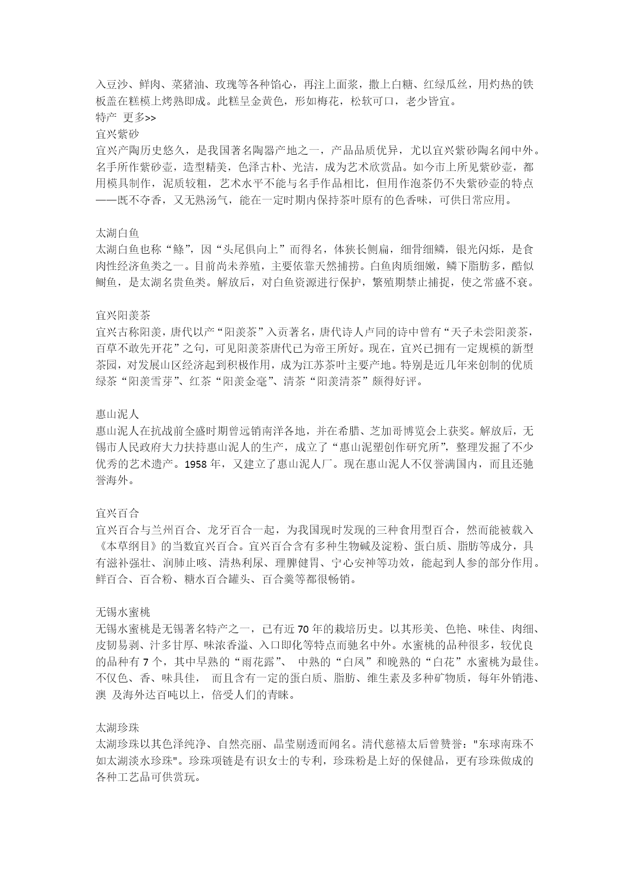 人说,无锡的建筑都是古色古香的,秀丽雅致,一梁一柱都彰显江南的风韵,哪里会如广州上海那些鳞次栉比的摩天建筑,处处透着逼仄与功利。那些商务地带,也有很多耸峙的高楼,也有很多通衢的大道,都市当然繁华。然而,无锡的简朴,厚实,带着江南书香之家的风范,一如生于此的钱钟书的文采风流,于风景之间散漫。运河的支流在暮色中也是宁静的绝响,尤其是那些依河而建的古老房子,走一段冷路,而后见到了繁华的闹市,无锡的魅力便隐于其间。行程推荐更多>>鼋头渚→蠡园这里尽得太湖水之美妙,假山耸翠,亭台水榭,花红柳绿,幽曲典雅。东林书院→南禅寺→锡惠公园包罗古街、园林等元素,是无锡旅游经典路线。三国城→水浒城→崇安寺无锡影视基地座落在美丽的太湖之滨,军嶂山麓,亲山亲水。崇安寺坐北朝南,二进院落,创建年代无考,从现存建筑结构看,大部分为明、清遗物,部分构件仍保留着宋、金、元特征。主要建筑为山门、过殿、大雄宝殿、西插花楼。美食更多>>春卷春卷是无锡时令小吃。它用上白面粉烙成圆形皮子,然后将制好的陷心摊放在皮子上,将两头折起,卷成长卷下油锅炸成金黄色即可。春卷皮薄酥脆、馅心香软,别具风味,是春季的时令佳品。豆腐花豆腐花是无锡传统小吃。它将豆腐花制作在大口坛内,边烤边卖,既嫩又热。食时,加上熟酱油、葱花、紫菜、虾皮、榨菜末、白糖、麻油等调味品,是无锡老少都喜欢的风味小吃。银丝面无锡特色名点之一。它选用精白粉,放入鸡蛋,经过糅合,轧成面条,用肉骨头、鸡肉吊汤。银丝面色白似雪,条细似弦,汤清味鲜,柔滑软爽,美味可口,是市内外顾客喜爱的点心。方糕无锡名点。一九四三年由崇安寺六芳斋师傅王禹清引进湖州大方糕改制而成。方糕用特制的方型木质模板,筛入糕粉,显出凹型,分别放入鲜肉、豆沙、菜猪油等馅心,再筛上一层糕粉,刮平,用刀划成块线,上笼用旺火蒸熟即成。糕呈白色,粉质柔软,馅心丰满,具有浓郁的江南风味。海棠糕创制于清代,因糕形似海棠花而得名。它将面粉,酵粉用冷水调成浆状,在特制模具里刷上少许水油,注入面浆放入豆沙、鲜肉、菜猪油等馅心,再用面浆盖面,加上糖猪油丁和红、绿瓜丝、瓜子仁等,盖上撒白糖的铁板放在煤炉上烤熟即成。海棠糕香甜可口,热食尤佳。梅花糕梅花糕是无锡的风味小吃。它选用上等面粉,酵粉和水拌成浆状,注入烤热的梅花模具,放入豆沙、鲜肉、菜猪油、玫瑰等各种馅心,再注上面浆,撒上白糖、红绿瓜丝,用灼热的铁板盖在糕模上烤熟即成。此糕呈金黄色,形如梅花,松软可口,老少皆宜。特产更多>>宜兴紫砂宜兴产陶历史悠久,是我国著名陶器产地之一,产品品质优异,尤以宜兴紫砂陶名闻中外。名手所作紫砂壶,造型精美,色泽古朴、光洁,成为艺术欣赏品。如今市上所见紫砂壶,都用模具制作,泥质较粗,艺术水平不能与名手作品相比,但用作泡茶仍不失紫砂壶的特点——既不夺香,又无熟汤气,能在一定时期内保持茶叶原有的色香味,可供日常应用。太湖白鱼太湖白鱼也称“鲦”,因“头尾俱向上”而得名,体狭长侧扁,细骨细鳞,银光闪烁,是食肉性经济鱼类之一。目前尚未养殖,主要依靠天然捕捞。白鱼肉质细嫩,鳞下脂肪多,酷似鲥鱼,是太湖名贵鱼类。解放后,对白鱼资源进行保护,繁殖期禁止捕捉,使之常盛不衰。宜兴阳羡茶宜兴古称阳羡,唐代以产“阳羡茶”入贡著名,唐代诗人卢同的诗中曾有“天子未尝阳羡茶,百草不敢先开花”之句,可见阳羡茶唐代已为帝王所好。现在,宜兴已拥有一定规模的新型茶园,对发展山区经济起到积极作用,成为江苏茶叶主要产地。特别是近几年来创制的优质绿茶“阳羡雪芽”、红茶“阳羡金毫”、清茶“阳羡清茶”颇得好评。惠山泥人惠山泥人在抗战前全盛时期曾远销南洋各地,并在希腊、芝加哥博览会上获奖。解放后,无锡市人民政府大力扶持惠山泥人的生产,成立了“惠山泥塑创作研究所”,整理发掘了不少优秀的艺术遗产。1958年,又建立了惠山泥人厂。现在惠山泥人不仅誉满国内,而且还驰誉海外。宜兴百合宜兴百合与兰州百合、龙牙百合一起,为我国现时发现的三种食用型百合,然而能被载入《本草纲目》的当数宜兴百合。宜兴百合含有多种生物碱及淀粉、蛋白质、脂肪等成分,具有滋补强壮、润肺止咳、清热利尿、理脾健胃、宁心安神等功效,能起到人参的部分作用。鲜百合、百合粉、糖水百合罐头、百合羹等都很畅销。无锡水蜜桃无锡水蜜桃是无锡著名特产之一,已有近70年的栽培历史。以其形美、色艳、味佳、肉细、皮韧易剥、汁多甘厚、味浓香溢、入口即化等特点而驰名中外。水蜜桃的品种很多,较优良的品种有7个,其中早熟的“雨花露”、中熟的“白凤”和晚熟的“白花”水蜜桃为最佳。不仅色、香、味具佳,而且含有一定的蛋白质、脂肪、维生素及多种矿物质,每年外销港、澳及海外达百吨以上,倍受人们的青睐。太湖珍珠太湖珍珠以其色泽纯净、自然亮