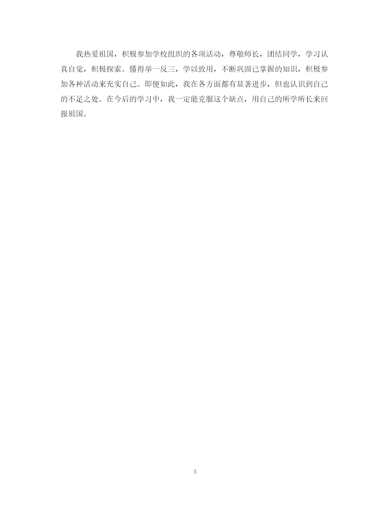 此资料由网络收集而来,如有侵权请告知上传者立即删除。资料共分享,我们负责传递知识。PAGEPAGE3简单优秀团员自我鉴定范文团员需要定期作自我鉴定,那么简单优秀团员自我鉴定是怎么样的呢?以下是范文网小编整理的3篇简单优秀团员自我鉴定范文,仅供参考,希望对大家有所帮助。简单优秀团员自我鉴定范文篇一本人自入学以来,一直遵守学校的各项规章制度,具有良好的思想道德品质,各方面表现优秀。有强烈的集体荣誉感和工作责任心,坚持实事求事的原则。本人思想端正,能吃苦耐劳,有崇高的理想和伟大的目标,注重个人道德修养,养成良好的生活作风,乐于助人,关心国家大事。在校期间,本人一直勤奋学习,刻苦钻研,通过系统地学习掌握较为扎实的基础知识。由于有良好的学习作风和明确的学习目标,曾获得“优秀团员“、“三好学生“等荣誉,得到了老师及同学们的肯定,树立了良好的学习榜样。在课余时间,本人积极参加体育锻炼,增强身体素质,也热爱劳动,积极参加校开展的各项文体活动,参加社会实践,继承和发扬了艰苦奋斗的精神,也参加了校文学社和书法协会,丰富了课余生活,使自己在各方面都得到了相应的提高,“宝剑锋从磨砺出,梅花香自苦寒来”。本人坚信通过不断地学习和努力,使自己成为一个有理想、有道德、有文化、有纪律的学生,以优异的成绩迎接挑战,为社会主义建设贡献我毕生的力量。简单优秀团员自我鉴定范文篇二本人近一年以来,能积极参加政治学习,关心国家大事,拥护党的各项方针政策。遵守校纪校规,尊敬师长,团结同学,政治上要求进步;学习目的明确,态度端正,钻研业务。勤奋刻苦,成绩优良;班委工作认真负责,关心同学,热爱集体。有一定奉献精神。不足是学习成绩需进一步提高。今后我一定发扬成绩,克服不足,争取更大进步。简单优秀团员自我鉴定范文篇三课上认真听讲,课下大量的阅读,积极参加校园活动和社会实践,始终以提高自身的综合素质为目标,以自我的全面发展为努力方向,树立了正确的人生观,价值观和世界观。在校学生会的培养下,更是塑造了我勇于面对,敢于解决的性格。灵活并且理性的的思维,让我面对问题充满了信心。即将离开熟悉的校园生活,步入社会,让我有些紧张却又充满了兴奋。我要用热情和活力,自信和学识来克服毕业后生活和工作中的各种困难,用自己的学习能力和分析处理问题的协调,管理能力去完成今后的美丽人生!简单优秀团员自我鉴定范文篇四本人在校热爱祖国,尊敬师长,团结同学,乐于助人,是老师的好帮手,同学的好朋友。我学习勤奋,积极向上,喜欢和同学讨论并解决问题,经常参加班级学校组织的各种课内外活动。在家尊老爱幼,经常帮爸爸妈妈做家务是家长的好孩子,邻居的好榜样。这几年,我学到了很多知识,思想比以前有了很大的提高,希望以后能做一个有理想,有抱负,有文化的人,为建设社会主义中国做出自己的努力。当然我也深刻认识到自己的不足,字写的不是很好,有时候做事情会只有三分钟热情,我相信只要克服这些问题,我就能做的更好。简单优秀团员自我鉴定范文篇五在高中这三年来,作为一个团员,我自觉地遵守学校和宿舍的各项规章制度,尊敬老师团结同学。与周边的人和睦相处。我有较强的集体荣誉感,努力为班为校做好事。以务实求真的精神热心参予学校的公益宣传和爱国主义活动。我平时认真学习,发扬了勤学好问的精神,使自己在各方面都得到了相应的提高。一直在追求人格的升华,注重自己的品行。坚持着自我反省且努力的完善自己的人格,学到别人的长处,认清自己的短处。经常向同学伸出了援助之手,因为,我知道帮助别人的同时也帮助自己,在贡献中实现自身的价值。但我还是有许多的不足之处,我也希望在以后的学习生活中得到老师的批评和指正。简单优秀团员自我鉴定范文篇六我初中已经入团,现在即将高中毕业。高中三年生活即将随着我的成长而慢慢逝去,回顾这三年的生活,我已在老师的辛勤培育下健康成长。这将永远铭记在我的心中。我热爱祖国,积极参加学校组织的各项活动,尊敬师长,团结同学,学习认真自觉,积极探索。懂得举一反三,学以致用,不断巩固已掌握的知识,积极参加各种活动来充实自己。即便如此,我在各方面都有显著进步,但也认识到自己的不足之处。在今后的学习中,我一定能克服这个缺点,用自己的所学所长来回报祖国。
