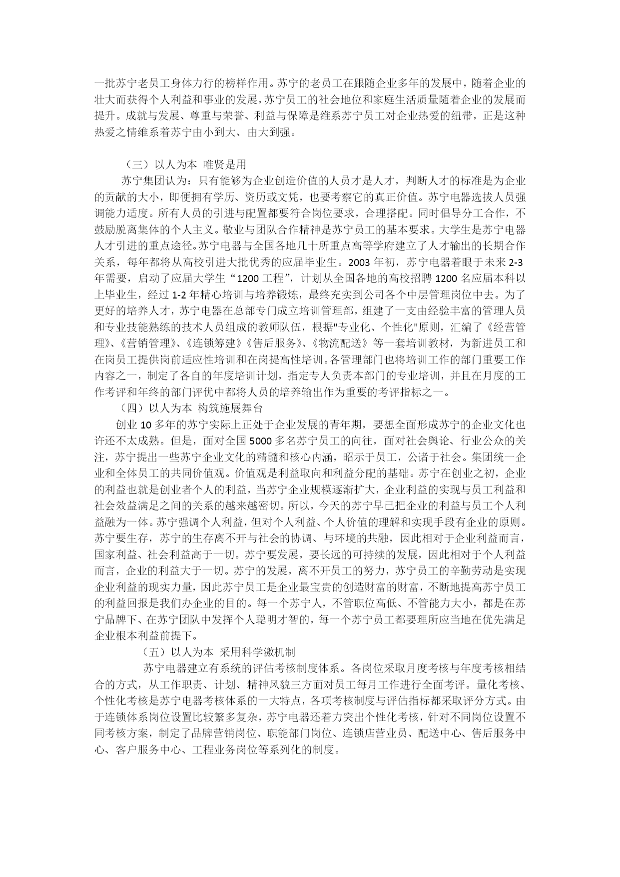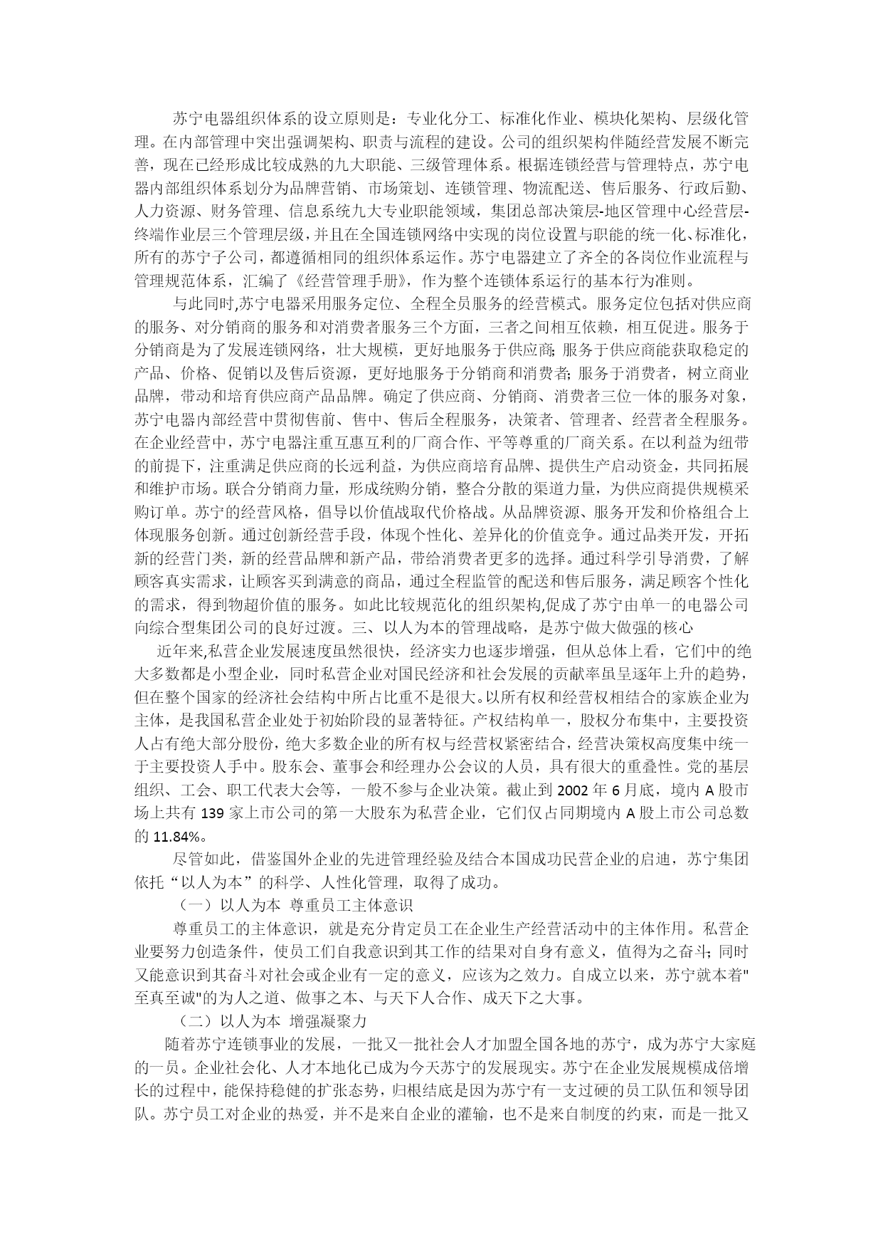 内容提要:私营经济的健康、可持续发展是当前社会关注的的热点之一。论文以著名的民营企业苏宁集团的成功,阐述只要正确运用政策、抓住机遇、科学管理,私营企业一定会有光明前景,同时也必将为我国的经济发展作出贡献。论文旨在阐明在新时代里,人们要敢于直面挑战,突破旧观念,私营企业也会大有作为。关键词:私营企业持续发展引论闻名全国的苏宁电器连锁集团始创于1990年,历经十余年的艰辛、奋力拼搏,苏宁现已发展成为年销售规模80多亿、上缴税收过3亿元、员工万余名、连锁企业遍及全国24个省市地区的大型零售连锁企业集团。先后获得中国最具影响力十大企业之一、全国民营企业10强、全国连锁企业10强、中国商业企业名牌企业、江苏省著名服务商标等殊荣。更可喜的是自1995年起,是苏宁率先在中国家电流通领域尝试连锁经营的模式。在江苏省内及北京、上海、广州、重庆、天津、成都、合肥、杭州、西安、深圳等地以直营和特许形式建立了数百家连锁店。自2000年苏宁确立了以综合电器升级,连锁扩张提速为战略的二次创业阶段。2003年在南京山西路开设18000平方米的专业自营旗舰店堪称亚洲电器单体店之首,这意味着苏宁电器从空调专营到综合家电经营,再到信息家电拓展的第三次腾飞。在经营品类上,苏宁在做大做强传统家电的同时,大力培育信息家电;在连锁网络建设上,苏宁坚持以时间换空间、数量决定质量,快速建设苏宁在全国的连锁网络。如此种种,我们作为消费者的同时,也见证了苏宁从无到有,从小到大的成长历程。苏宁集团从当初的“小个体”铸就成今日的辉煌,它成功地昭示了我国私营经济的可持续发展。一、政策的开放,法律的完善是苏宁形成的根本苏宁的诞生,绝非偶然,它从一个侧面显示了我国经济发展的逐步完善。自1978年改革开放以来,我国经济中产生了两个重大的变化:一是以社会主义市场经济替代计划经济,二是以公有制为主,多种经济共同发展替代单一公有制经济,二者密不可分的。私营企业从无到有逐步发展起来,是中国社会主义市场经济的一个重要标志,并成为社会主义市场经济重要组成部分。非公有制经济促进了我国国民经济的发展,同时对我国政治、社会、人文等已产生长远的影响。更据资料显示,浙江、贵州、重庆等省、市的工商联合会会长由私营企业主担任。在刚刚闭幕的中共“十六”大上,至少有7位私营企业主党员的代表。十六大报告提出了我们进一步的强调要毫不动摇的发展私有制经济,而且提出了公有制经济和非公有制经济是共同的发展,在社会主义现代化的建设之中,不要把两者对立起来。据此,我们不难看出私营企业在我国正稳步地、持续发展,同时,关注私营企业的未来发展理应成为我国经济生活的热点和重点,我国私营企业的发展道理可谓曲折,它折射了我国特有的历史、文化、政治背景。50年代初期,个体、私营经济在我国城乡生产、流通领域中,占有相当重要的地位。建国初期,私营经济工业产值约占全国工业总产值75%以上。1993年底月,九届全国人大常委会第十一次会议在第二次审议稿的基础上通过了“中华人民共和国个人独资企业法”。而随着1992年小平同志南巡,民营经济在这个阶段得到了突飞猛进的发展,尤其是1992年到1995年这一段,民营经济每年增长的速度都保持在100%以上,甚至超过120%。1995年以后,国家加大了宏观调控力度,民营经济增长的势头有所回落,但依然是保持在20%以上。1998年修改后的宪法增加了“国家在社会主义初级阶段,坚持公有制为主体,多种所有制经济共同发展的基本经济制度,坚持按劳分配为主体、多种分配方式并存的分配制度”等内容,这对民营经济的发展起到了助推作用。这个阶段的一个明显特征是个体工商户数量减少了,但是私营企业的数量却有了很大的增量。苏宁集团成立于1990年,创业者以犀利的眼光,敏锐的市场嗅觉,从家电业寻找切入点,挑战国营企业,灵活经营,渐渐在市场中站稳脚跟。二、规范的组织机构,是苏宁快速成长的源泉苏宁电器组织体系的设立原则是:专业化分工、标准化作业、模块化架构、层级化管理。在内部管理中突出强调架构、职责与流程的建设。公司的组织架构伴随经营发展不断完善,现在已经形成比较成熟的九大职能、三级管理体系。根据连锁经营与管理特点,苏宁电器内部组织体系划分为品牌营销、市场策划、连锁管理、物流配送、售后服务、行政后勤、人力资源、财务管理、信息系统九大专业职能领域,集团总部决策层-地区管理中心经营层-终端作业层三个管理层级,并且在全国连锁网络中实现的岗位设置与职能的统一化、标准化,所有的苏宁子公司,都遵循相同的组织体系运作。苏宁电器建立了齐全的各岗位作业流程与管理规范体系,汇编了《经营管理手册》,作为整个连锁体系运行的基本行为准则。与此同时,苏宁电器采用服务定位、全程全员服务的经营模式。服务定位包括对供应商的服务、对分销商的服务和对消费者服务三个方面,