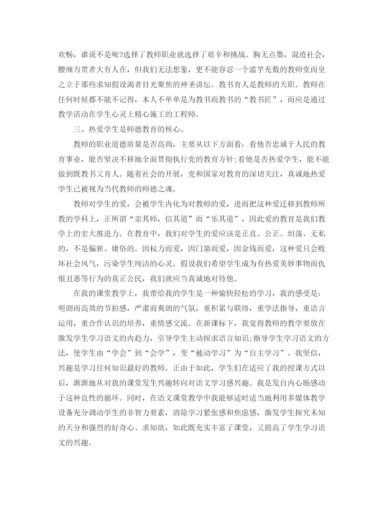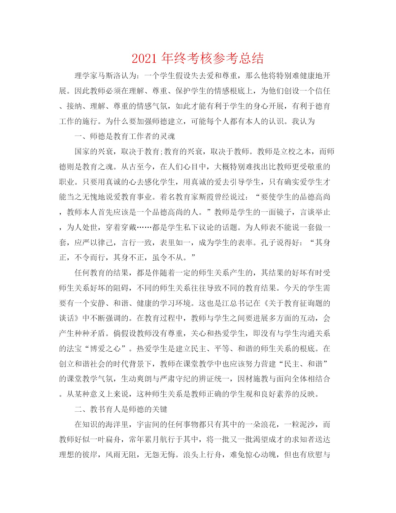 2021年终考核参考总结理学家马斯洛认为:一个学生假设失去爱和尊重,那么他将特别难健康地开展。因此教师必须在理解、尊重、保护学生的情感根底上,为他们创设一个信任、接纳、理解、尊重的情感气氛,如此才能有利于学生的身心开展,有利于德育工作的施行。为什么要加强师德建立,可能每个人都有本人的认识。我认为一、师德是教育工作者的灵魂国家的兴衰,取决于教育;教育的兴衰,取决于教师。教师是立校之本,而师德则是教育之魂。从古至今,在人们心目中,大概特别难找出比教师更受敬重的职业。只要用真诚的心去感化学生,用真诚的爱去引导学生,只有确实爱学生才能当之无愧地说爱教育事业。着名教育家斯霞曾经说过:“要使学生的品德高尚,教师本人首先应该是一个品德高尚的人。”教师是学生的一面镜子,言谈举止,为人处世,穿着穿戴……都是学生私下议论的话题。为人师表不能说一套做一套,应严以律己,言行一致,表里如一,成为学生的表率。孔子说得好:“其身正,不令而行,其身不正,虽令不从。”任何教育的结果,都是伴随着一定的师生关系产生的,其结果的好坏有时受师生关系好坏的阻碍,不同的师生关系往往导致不同的教育结果。今天的学生需要有一个安静、和谐、健康的学习环境。这也是江总书记在《关于教育征询题的谈话》中不断强调的。在教育过程中,教师与学生之间要进展多方面的互动,会产生种种矛盾。倘假设教师没有尊重,关心和热爱学生,即没有与学生沟通关系的法宝“博爱之心”。热爱学生是建立民主、平等、和谐的师生关系的根底。在创立和谐社会的时代背景下,教师在课堂教学中也应该努力营建“民主、和谐”的课堂教学气氛,生动爽朗与严肃守纪的辨证统一,因材施教与面向全体相结合。从某种意义上来说,这种师生关系是教师正确的学生观和良好素养的反映。二、教书育人是师德的关键在知识的海洋里,宇宙间的任何事物都只有其中的一朵浪花,一粒泥沙,而教师好似一叶扁舟,常年累月航行于其中,将一批又一批渴望成才的求知者送达理想的彼岸,风雨无阻,无怨无悔。浪头上行舟,难免惊心动魄,但也有欣慰与欢畅,谁说不是呢?选择了教师职业就选择了艰辛和挑战。胸无点墨,混迹社会,腰缠万贯者大有人在,但我们无法想象,更不能容忍一个滥竽充数的教师堂而皇之立于那些求知假设渴者目光聚焦的神圣讲坛。教书育人是教师的天职。教师在任何时候都不能不记得,本人不单单是为教书而教书的“教书匠”,而应是通过教学活动在学生心灵上精心施工的工程师。三、热爱学生是师德教育的核心。教师的职业道德质量是否高尚,主要从以下方面看:看他否忠诚于人民的教育事业,能否坚决不移地全面贯彻执行党的教育方针;看他是否热爱学生,能不能做到既教书又育人。随着社会的开展,党和国家对教育的深切关注,真诚地热爱学生已被视为当代教师的师德之魂。教师对学生的爱,会被学生内化为对教师的爱,进而把这种爱迁移到教师所教的学科上,正所谓“亲其师,信其道”而“乐其道”,因此爱的教育是我们教学上的宏大推进力。在教育中,我们对学生的爱应该是正直、公正、坦荡、无私的,不是偏狭、庸俗的。因权力而爱,因门第而爱,因金钱而爱,这种爱只会败坏社会风气,污染学生纯洁的心灵。假设我们希望学生成为有热爱美妙事物而仇恨丑恶等行为的真正公民,我们就应当真诚地对待他。在我的课堂教学上,我带给我的学生是一种愉快轻松的学习,我的感受是:明朗而高效的节拍感,严肃而爽朗的气氛,重积累与联络,重学法指导,重语言运用,重合作认识的培养,重情感交流。在新课标下,我觉得教师的教学要放在激发学生学习语文的内趋力,引导学生主动探求语言知识;指导学生学习语文的方法,使学生由“学会”到“会学”,变“被动学习”为“自主学习”。我坚信,兴趣是学习任何知识最好的教师。正由于如此,学生们在适应了我的授课方式以后,渐渐地从对我的课堂发生兴趣转向对语文学习感兴趣。我是发自内心肠感动于这种良性的循环。同时,在语文课堂教学中我能够适时适当地利用多媒体教学设备充分调动学生的非智力要素,消除学习紧张感和焦虑感,激发学生探究未知的天分和强烈的好奇心、求知欲,如此既充实丰富了课堂,又提高了学生学习语文的兴趣。爱是教师美丽的语言,我们教师应有那颗与学生沟通的法宝——博爱之心,用爱去对待学生,阻碍学生,关心他们的成长。我们应该用先进的理念、恰当的方法带给学生鲜活的知识与技能,努力培养出具有世界胸怀、中国灵魂、适应现代社会的有用之才。教学,是一曲爱的奉献,我们的生命会因奉献而精彩,因开拓而闪亮,因耕耘而芬芳,因奋斗而更美丽。