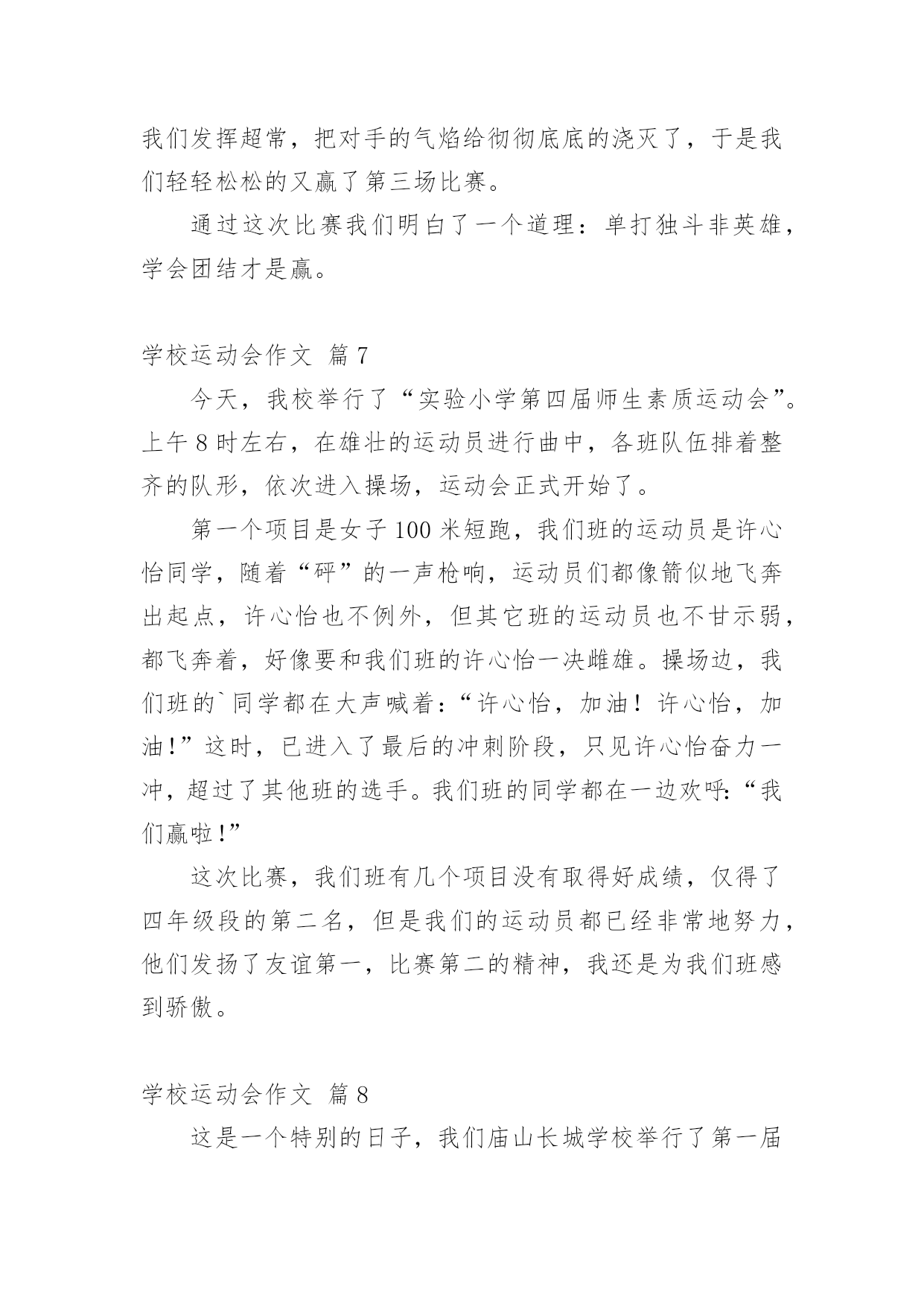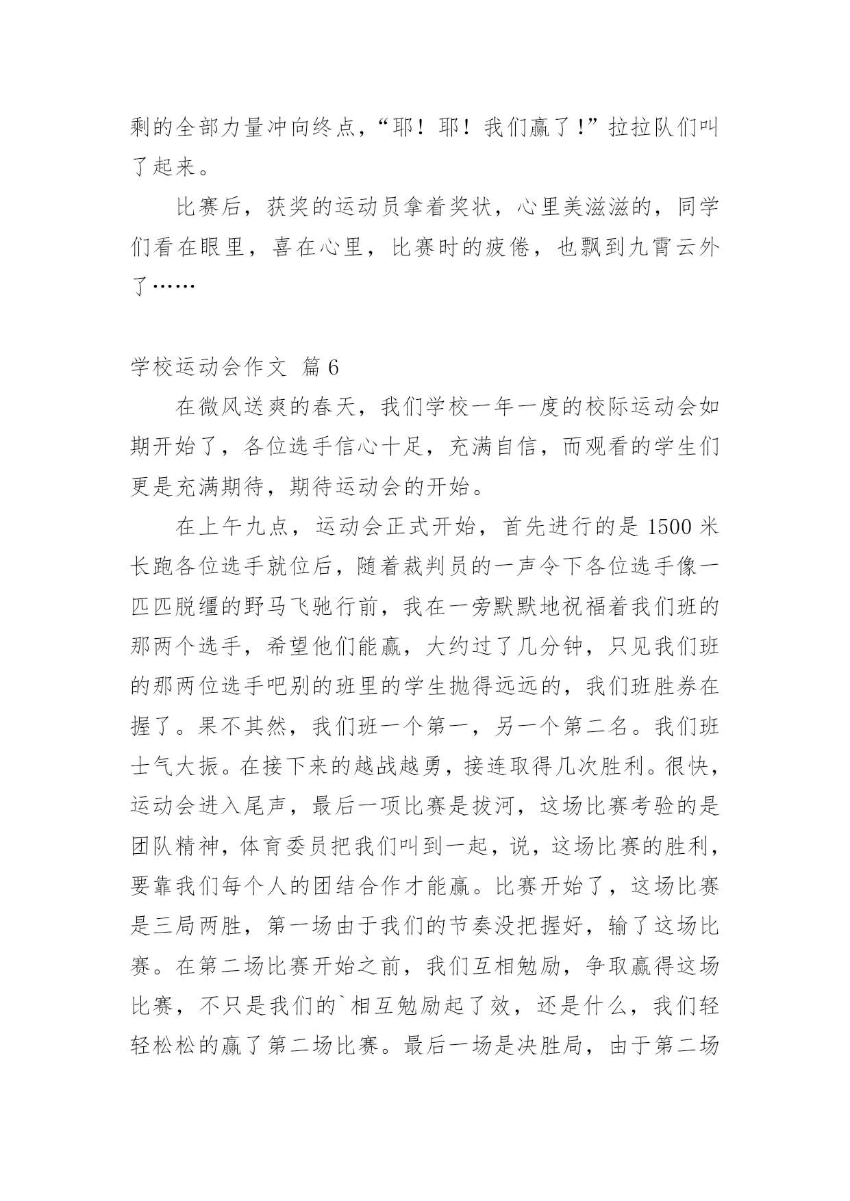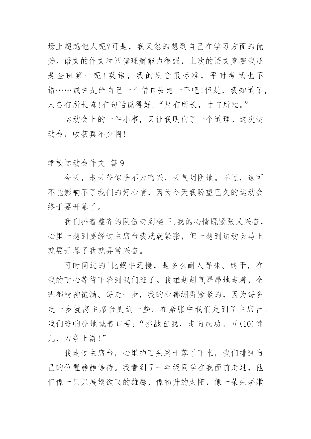 学校运动会作文【精选】学校运动会作文在平日的学习、工作和生活里,大家最不陌生的就是作文了吧,作文要求篇章结构完整,一定要避免无结尾作文的出现。相信许多人会觉得作文很难写吧,以下是小编帮大家整理的学校运动会作文9篇,仅供参考,大家一起来看看吧。学校运动会作文篇1今天,我们学校举行了紧张又激烈的运动会。我将参加400米跑步和垒球比赛。400米跑步比赛马上就要开始了,我按照规定站到了起跑线上,此刻我的心情既激动又紧张,身体在微微地发抖,手心里还冒着汗。想到前面的同学一个个都跑得那么快,我都感到有点力不从心了。正在我害怕的时候,突然,“砰”的一声,我们都像离弘的箭一样冲了出去。我脑子里一片空白,眼睛只看着前面,在同学们一声声地“加油”中拼命得向前跑去。我使劲摆动着手臂,加快着脚步。跑着跑着,我越来越有气无力了,心跳得越来越快,嘴也越来越干,呼吸变得越来越困难。我真有点不想再跑了,这时我想起了老师和我说过的'话:坚持到底,永不放弃!我咬紧牙关冲向了终点。400米跑步结束以后,我还参加了垒球比赛。这次运动会中,虽然我在400米跑步和垒球比赛中都没有得到名次,但是我还是很开心,因为我体会到了坚持到底就是胜利的道理。学校运动会作文篇2今天是学校举行运动会的日子,天空蔚蓝蔚蓝的,太阳公公睁着炯炯有神的大眼睛,用它那温暖的大手抚摸着整个校园。我来到学校的操场上,呀!那里人山人海,有的在那儿练习着自己要参加的比赛,样子非常认真;有的站在原地上打着哆嗦,样子好像很紧张;还有的呢就自信满满的样子,感觉胜利就在眼前。轮到我比赛400米跑步了,我的心一直都在怦怦地跳个不停,心中想着:会赢吗?会赢吗?只听“呯”的一声枪响,女选手们像离弦的箭一样冲出去,不一会儿,一个个女生都超过我了,我落在了最后面,失望极了,真想大哭一场。可是,怎么能给班级丢脸呢?这样会损害班级荣誉的!坚持一下吧,贺嘉熙,胜利就在眼前!我默默地鼓励着自己。当跑第二圈的时候,我拿出最大的力气来超过她们。我的速度越来越快,Yes!超过一个,接着超过二个,三个,四个……我终于跑到第二个来了,在我前面的`是一个很高的女孩子,她跑得像一匹马一样快。我想超过她,那是不可能的,心里这样想的时候,她却越跑越慢,似乎没有力气了。嗯!好机会来了,我的体力还有一点点,耳边传来了同学们的声音:“加油!贺嘉熙,加油……”同学们的加油呐喊声激励了我,让我再次充满了力量和信心。我闭上眼睛,快速地奔跑着,当我的腰碰到什么东西的时候,我睁开眼睛一看,“Yes!”我得了第一名,那个高个子女孩居然在我后面,太不可思议!同学们高兴得手舞足蹈,顷刻间,欢呼声,呐喊声汇成了美妙的乐章,我笑了,笑得那么灿烂,那么可爱。运动会在同学们的加油呐喊声中结束了。这次比赛让我感觉到了坚持是如此的珍贵!学校运动会作文篇3上午,我校举办了一场别开生面的秋季运动会。我参加了跳大绳比赛。运动会开始了,老师带领我们来到后操场,准备跳大绳。我捡了一块石头,在地上写出“六(3)班必胜!”几个大字。不一会,体育老师拎着一根皮跳绳来了,脖子上还挂着哨子、秒表,手里提着一个喇叭形扩音器,我们男生跃跃欲试,等待比赛开始。比赛开始了,我们男生一个接一个地冲上前去,在绳中央跳了一下后,绕到绳后面,继续跳。没想到,跳了两次之后,我的左腿抽筋了。但我忍着跳了两下,右腿也抽筋了。我只好休息一会儿,坐在水泥台上用左手捶腿。右腿刚好,我就忍着左腿的疼去跳。没想到因为左腿,我跳的不利索,跳了两次后,右腿再次抽筋!的用左手捶时,左手又碰到了水泥台,手又受伤了!唉,真倒霉!比赛完后,我们回到教室休息。第四节课后进行拔河比赛。我们班的'拔河队中有一个“败类”,他的劲还没有我大,就进了拔河队。我们班的男生拔河队以1:2惨败,女生拔河队上场,第一场以2:1蠃,第二场眼看要输,我急了,在对方“阵地”布了两个“地雷”(废弃纽扣电池),让对方成员滑倒,取得了胜利。这场运动会可真激烈呀!学校运动会作文篇4星期四下午,我们学校举行了趣味运动会。我们玩的可高兴了。那天下午,我们在操场中庄严地升起国旗。校长和主任怀着激动的心情为运动会致词,并宣读了运动会项目和规则。然后,我们开始了“较量”首先比赛的是五年级组男女混合接力赛。我们共同挑出了班里拔尖的同学。其他班也不甘示弱,放出了几匹“快马”。挨到我们五年级两个班比赛了。我们的数学老师是裁判,他手拿一个铁哨子,脸上充满笑容。“嘟”一声,哨子响了,运动员们都像一支支离了弦的`箭私的冲向终点。“加油,加油,加油......”一个运动员稍微迟了一点,下一个运动员跑的就比较吃力,运动健儿们一个接一个跑去,可是,我们班老是比人家班慢几步,正当焦急万分的时候,我们班的“飞毛腿”罗玉坤上阵了,只见她两三下,便把别人甩在了后面,然后,一个急转弯,又马不停蹄的跑了回来,潇洒
