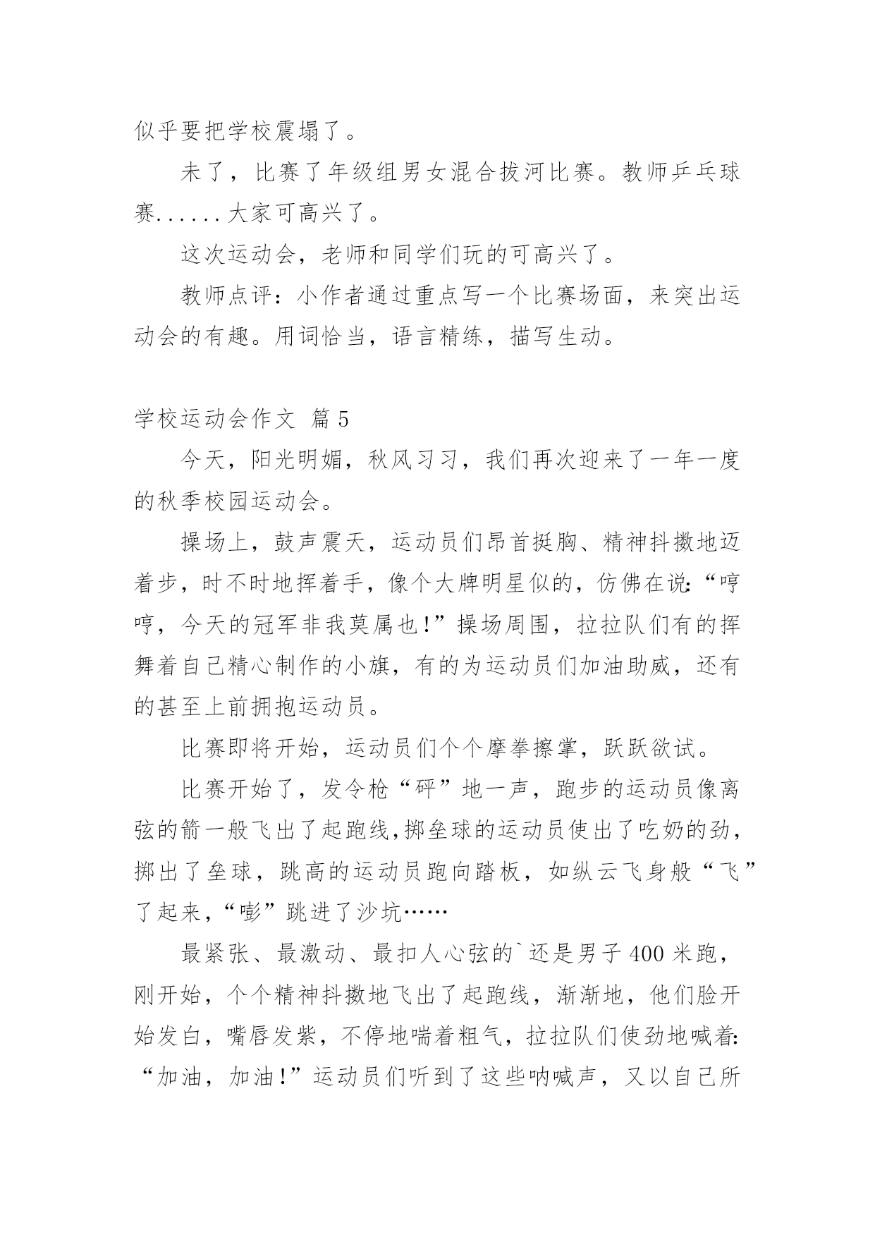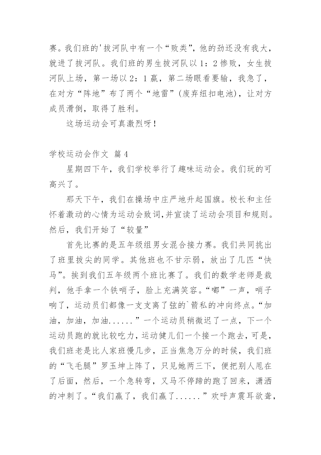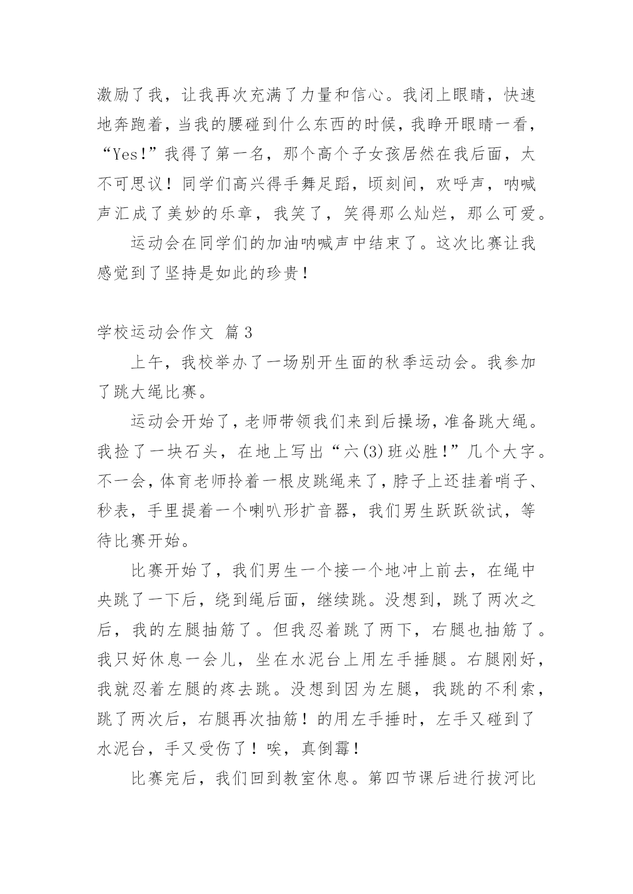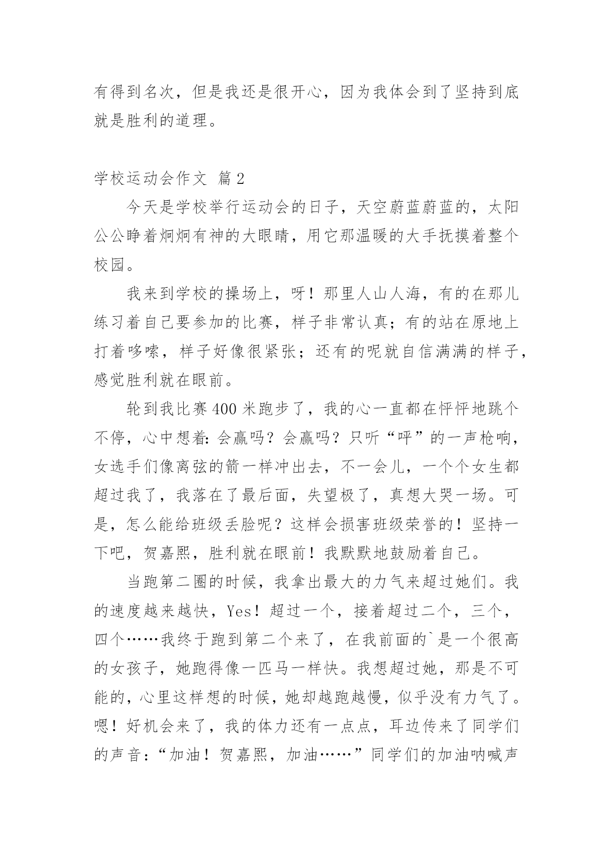 学校运动会作文【精选】学校运动会作文在平日的学习、工作和生活里,大家最不陌生的就是作文了吧,作文要求篇章结构完整,一定要避免无结尾作文的出现。相信许多人会觉得作文很难写吧,以下是小编帮大家整理的学校运动会作文9篇,仅供参考,大家一起来看看吧。学校运动会作文篇1今天,我们学校举行了紧张又激烈的运动会。我将参加400米跑步和垒球比赛。400米跑步比赛马上就要开始了,我按照规定站到了起跑线上,此刻我的心情既激动又紧张,身体在微微地发抖,手心里还冒着汗。想到前面的同学一个个都跑得那么快,我都感到有点力不从心了。正在我害怕的时候,突然,“砰”的一声,我们都像离弘的箭一样冲了出去。我脑子里一片空白,眼睛只看着前面,在同学们一声声地“加油”中拼命得向前跑去。我使劲摆动着手臂,加快着脚步。跑着跑着,我越来越有气无力了,心跳得越来越快,嘴也越来越干,呼吸变得越来越困难。我真有点不想再跑了,这时我想起了老师和我说过的'话:坚持到底,永不放弃!我咬紧牙关冲向了终点。400米跑步结束以后,我还参加了垒球比赛。这次运动会中,虽然我在400米跑步和垒球比赛中都没有得到名次,但是我还是很开心,因为我体会到了坚持到底就是胜利的道理。学校运动会作文篇2今天是学校举行运动会的日子,天空蔚蓝蔚蓝的,太阳公公睁着炯炯有神的大眼睛,用它那温暖的大手抚摸着整个校园。我来到学校的操场上,呀!那里人山人海,有的在那儿练习着自己要参加的比赛,样子非常认真;有的站在原地上打着哆嗦,样子好像很紧张;还有的呢就自信满满的样子,感觉胜利就在眼前。轮到我比赛400米跑步了,我的心一直都在怦怦地跳个不停,心中想着:会赢吗?会赢吗?只听“呯”的一声枪响,女选手们像离弦的箭一样冲出去,不一会儿,一个个女生都超过我了,我落在了最后面,失望极了,真想大哭一场。可是,怎么能给班级丢脸呢?这样会损害班级荣誉的!坚持一下吧,贺嘉熙,胜利就在眼前!我默默地鼓励着自己。当跑第二圈的时候,我拿出最大的力气来超过她们。我的速度越来越快,Yes!超过一个,接着超过二个,三个,四个……我终于跑到第二个来了,在我前面的`是一个很高的女孩子,她跑得像一匹马一样快。我想超过她,那是不可能的,心里这样想的时候,她却越跑越慢,似乎没有力气了。嗯!好机会来了,我的体力还有一点点,耳边传来了同学们的声音:“加油!贺嘉熙,加油……”同学们的加油呐喊声激励了我,让我再次充满了力量和信心。我闭上眼睛,快速地奔跑着,当我的腰碰到什么东西的时候,我睁开眼睛一看,“Yes!”我得了第一名,那个高个子女孩居然在我后面,太不可思议!同学们高兴得手舞足蹈,顷刻间,欢呼声,呐喊声汇成了美妙的乐章,我笑了,笑得那么灿烂,那么可爱。运动会在同学们的加油呐喊声中结束了。这次比赛让我感觉到了坚持是如此的珍贵!学校运动会作文篇3上午,我校举办了一场别开生面的秋季运动会。我参加了跳大绳比赛。运动会开始了,老师带领我们来到后操场,准备跳大绳。我捡了一块石头,在地上写出“六(3)班必胜!”几个大字。不一会,体育老师拎着一根皮跳绳来了,脖子上还挂着哨子、秒表,手里提着一个喇叭形扩音器,我们男生跃跃欲试,等待比赛开始。比赛开始了,我们男生一个接一个地冲上前去,在绳中央跳了一下后,绕到绳后面,继续跳。没想到,跳了两次之后,我的左腿抽筋了。但我忍着跳了两下,右腿也抽筋了。我只好休息一会儿,坐在水泥台上用左手捶腿。右腿刚好,我就忍着左腿的疼去跳。没想到因为左腿,我跳的不利索,跳了两次后,右腿再次抽筋!的用左手捶时,左手又碰到了水泥台,手又受伤了!唉,真倒霉!比赛完后,我们回到教室休息。第四节课后进行拔河比赛。我们班的'拔河队中有一个“败类”,他的劲还没有我大,就进了拔河队。我们班的男生拔河队以1:2惨败,女生拔河队上场,第一场以2:1蠃,第二场眼看要输,我急了,在对方“阵地”布了两个“地雷”(废弃纽扣电池),让对方成员滑倒,取得了胜利。这场运动会可真激烈呀!学校运动会作文篇4星期四下午,我们学校举行了趣味运动会。我们玩的可高兴了。那天下午,我们在操场中庄严地升起国旗。校长和主任怀着激动的心情为运动会致词,并宣读了运动会项目和规则。然后,我们开始了“较量”首先比赛的是五年级组男女混合接力赛。我们共同挑出了班里拔尖的同学。其他班也不甘示弱,放出了几匹“快马”。挨到我们五年级两个班比赛了。我们的数学老师是裁判,他手拿一个铁哨子,脸上充满笑容。“嘟”一声,哨子响了,运动员们都像一支支离了弦的`箭私的冲向终点。“加油,加油,加油......”一个运动员稍微迟了一点,下一个运动员跑的就比较吃力,运动健儿们一个接一个跑去,可是,我们班老是比人家班慢几步,正当焦急万分的时候,我们班的“飞毛腿”罗玉坤上阵了,只见她两三下,便把别人甩在了后面,然后,一个急转弯,又马不停蹄的跑了回来,潇洒