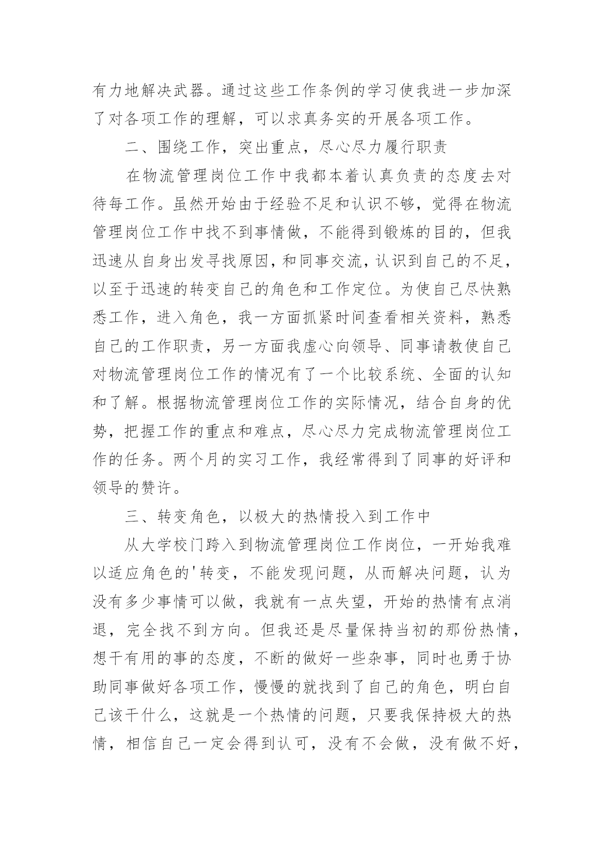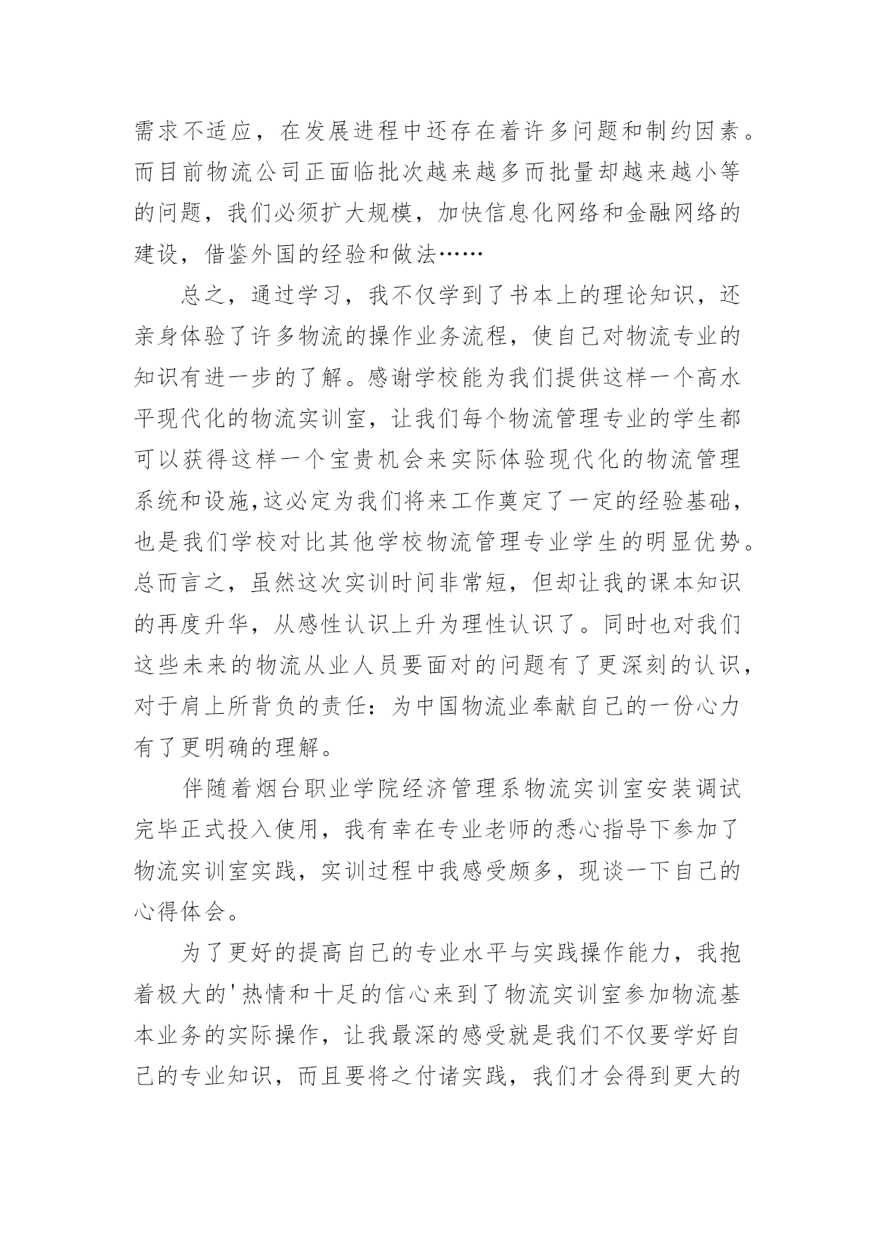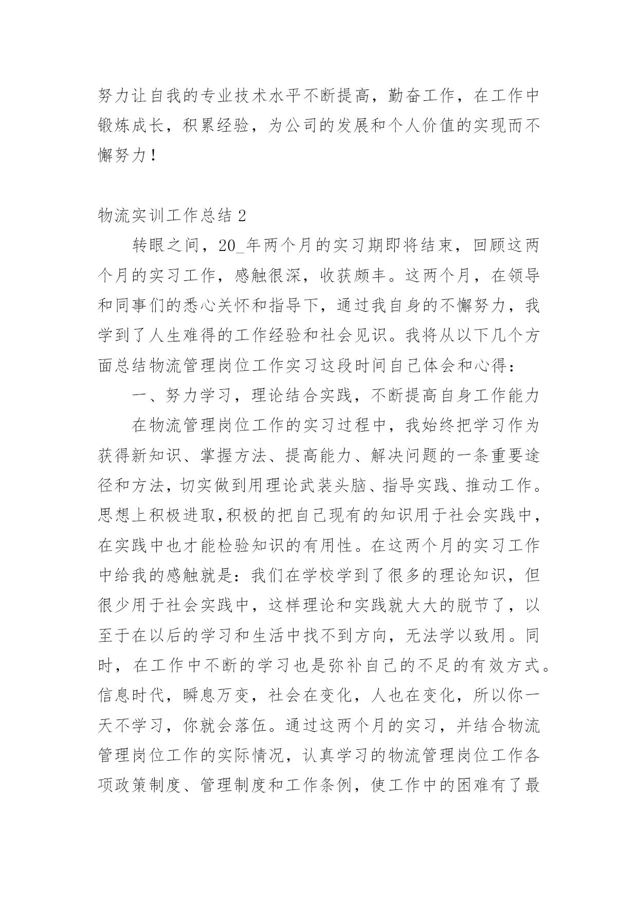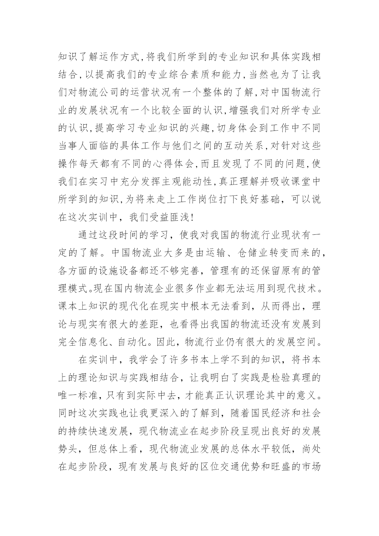 物流实训工作总结总结是在某一时期、某一项目或某些工作告一段落或者全部完成后进行回顾检查、分析评价,从而得出教训和一些规律性认识的一种书面材料,它可以使我们更有效率,是时候写一份总结了。总结怎么写才是正确的呢?下面是小编为大家整理的物流实训工作总结,仅供参考,希望能够帮助到大家。物流实训工作总结1光阴似箭,时间如梭。转眼间已来冲压物流班组三个月了,回首过去的三个月,内心不禁感慨万千。在各位领导的帮忙带领下,以及和同事的共同奋斗,和经过了自我的用心努力,我顺利地做好自我的工作,这也算经历了一段不平凡的考验和磨砺。还记得在我刚来冲压班组的时候,眼里到处都充满着好奇、陌生、甚至还有一丝的无助。而我们冲压物流班组的班组长吕作敬也早已觉察了这一点,安排了我们那里资格较老,各方面成绩都表现优异的老员工于德良同仁来做我的带教师傅,并且再三叮嘱我!安全乃所有工作中的重中之重!也是工作进行下去一个必要的先决条件!所以三级安全教育培训也成了眼下的当务之急,而做为我的带教师傅于德良对我也是尽心尽力、言传身教!并将自我所学到的知识和多年积累的丰富的宝贵经验传授给了我!比如教我进入车间务必正确穿戴PPE劳防用品,过卷帘门时要等卷帘门升至指定高度后,并按地面“停”“慢”标识及引导线透过,禁止边开车边使用对讲机或手机等等,我也是如饥似渴的吸收着和学习着这些宝贵的经验和丰富的知识!为在冲压以后的工作顺利的进行奠下了坚实的基础!在冲压物流班组的实习工作中,带教师傅严格要求我,贯彻“安全与健康第一”的原则,认真落实“安全与质量的三不原则”“GMS五大原则”和“八种浪费”等各项基本方针,并将所学到的知识用心的应用到了工作中!工作中我也是虚心向师傅请教,多问、多看、立足于工作岗位,不怕不会,就怕不学不问,由于我的勤奋好学和带教师傅的指导有方,很快我就对冲压班组就有了必须的了解,在领导的'关怀和师傅的支持与帮忙下,能够快速高效的完成领导分配的工作任务!三个月转瞬即逝,对于过去,我会吸取有利因素强化自我工作潜力,把不利因素在自我以后工作中排除,三个月的实习工作让我在成为一名合格员工道路上不断前进,我相信透过我努力和同事合作,以及领导们指导,我会成为一名优秀员工,充分发挥我个人潜力。也感谢领导给我这一个适宜工作位置,让我能为公司做出自我该有贡献。实习期间我做得虽然还不够最好,但我相信在今后工作中,我还会继续不断努力下去,我相信,只要我在岗位上一天,我就会做出自我最大努力,将自我所有精力和潜力用在工作上,相信自我必须能够做好!在以后的工作中也要加强学习,克服缺点,努力让自我的专业技术水平不断提高,勤奋工作,在工作中锻炼成长,积累经验,为公司的发展和个人价值的实现而不懈努力!物流实训工作总结2转眼之间,20_年两个月的实习期即将结束,回顾这两个月的实习工作,感触很深,收获颇丰。这两个月,在领导和同事们的悉心关怀和指导下,通过我自身的不懈努力,我学到了人生难得的工作经验和社会见识。我将从以下几个方面总结物流管理岗位工作实习这段时间自己体会和心得:一、努力学习,理论结合实践,不断提高自身工作能力在物流管理岗位工作的实习过程中,我始终把学习作为获得新知识、掌握方法、提高能力、解决问题的一条重要途径和方法,切实做到用理论武装头脑、指导实践、推动工作。思想上积极进取,积极的把自己现有的知识用于社会实践中,在实践中也才能检验知识的有用性。在这两个月的实习工作中给我的感触就是:我们在学校学到了很多的理论知识,但很少用于社会实践中,这样理论和实践就大大的脱节了,以至于在以后的学习和生活中找不到方向,无法学以致用。同时,在工作中不断的学习也是弥补自己的不足的有效方式。信息时代,瞬息万变,社会在变化,人也在变化,所以你一天不学习,你就会落伍。通过这两个月的实习,并结合物流管理岗位工作的实际情况,认真学习的物流管理岗位工作各项政策制度、管理制度和工作条例,使工作中的困难有了最有力地解决武器。通过这些工作条例的学习使我进一步加深了对各项工作的理解,可以求真务实的开展各项工作。二、围绕工作,突出重点,尽心尽力履行职责在物流管理岗位工作中我都本着认真负责的态度去对待每工作。虽然开始由于经验不足和认识不够,觉得在物流管理岗位工作中找不到事情做,不能得到锻炼的目的,但我迅速从自身出发寻找原因,和同事交流,认识到自己的不足,以至于迅速的转变自己的角色和工作定位。为使自己尽快熟悉工作,进入角色,我一方面抓紧时间查看相关资料,熟悉自己的工作职责,另一方面我虚心向领导、同事请教使自己对物流管理岗位工作的情况有了一个比较系统、全面的认知和了解。根据物流管理岗位工作的实际情况,结合自身的优势,把握工作的重点和难点,尽心尽力完成物流管理岗位工作的任务。两个月的实习工作,我经常得到了同事的好评和领导的赞许。三、转变角色,