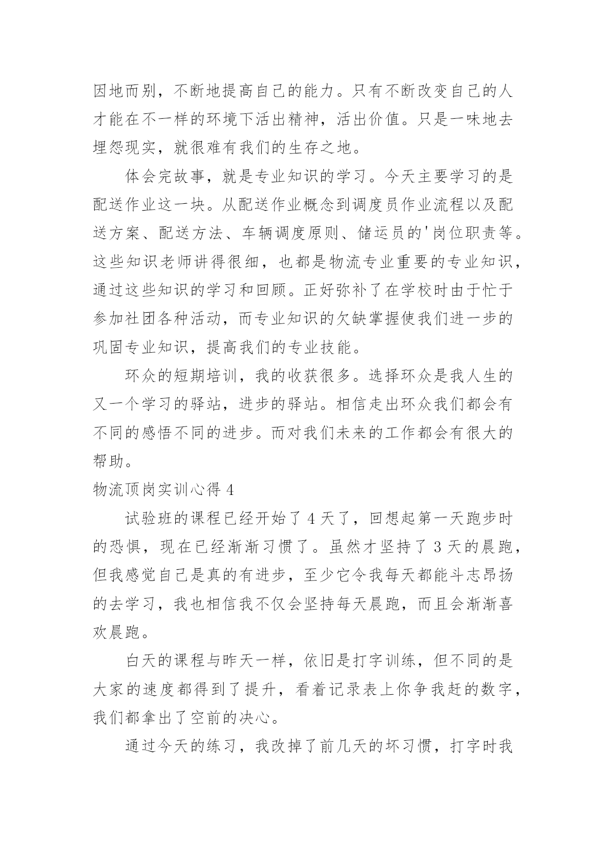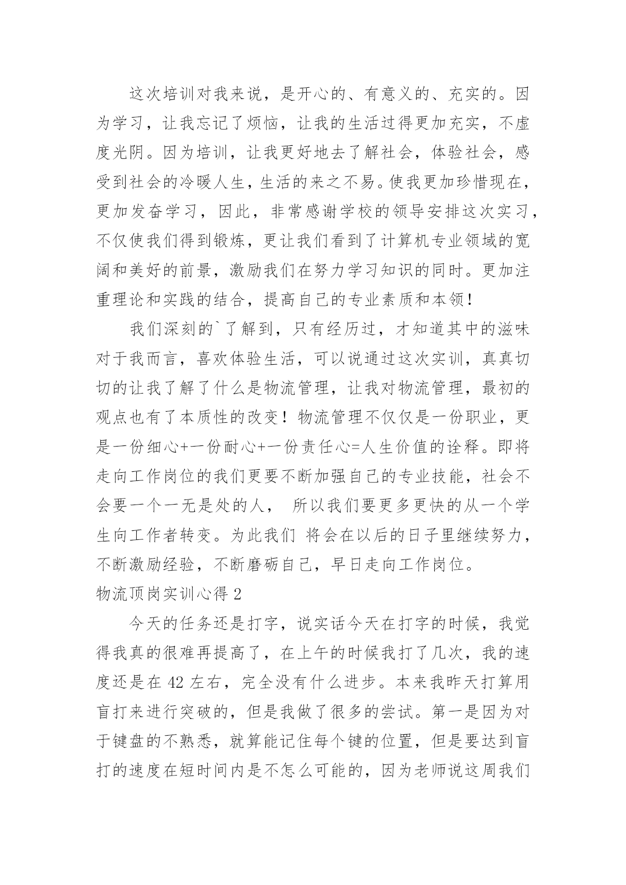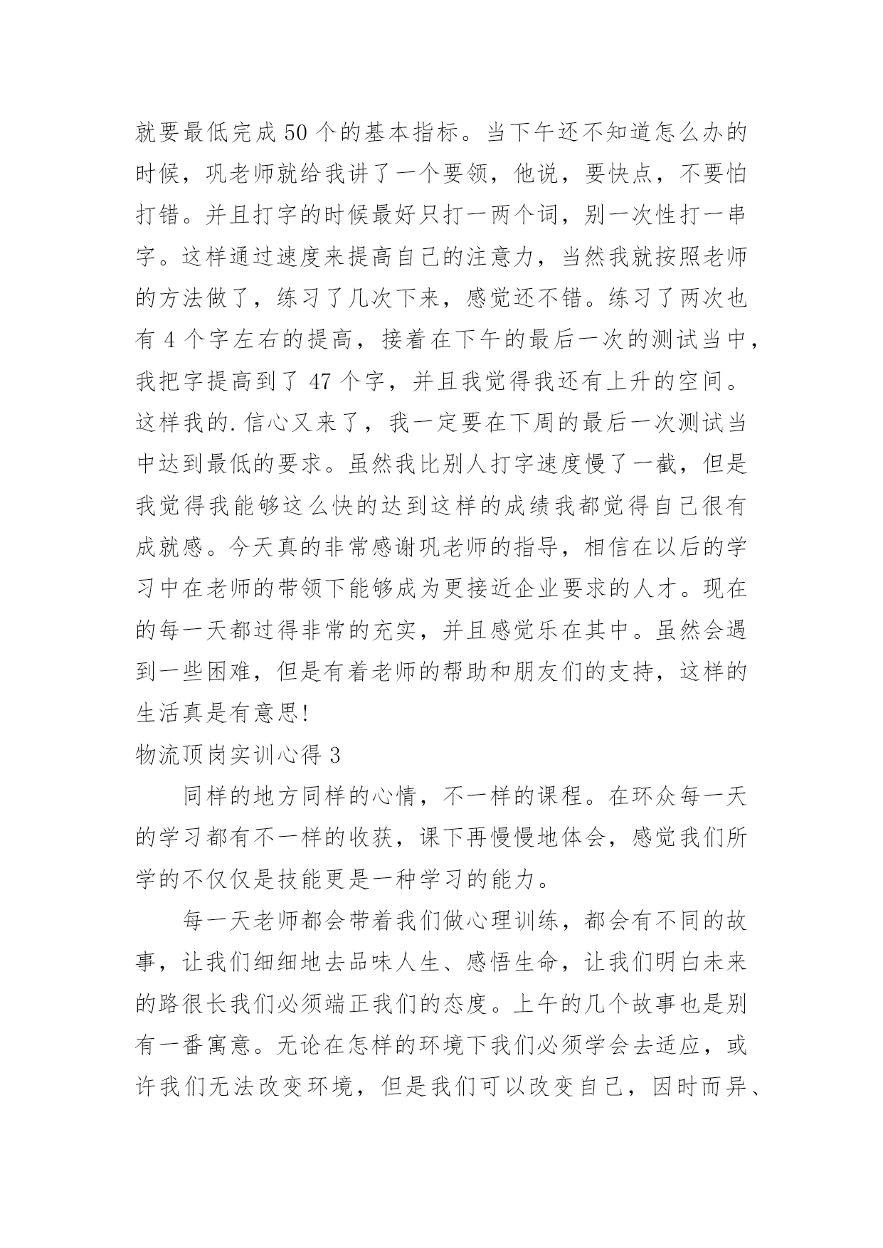 物流顶岗实训心得物流顶岗实训心得当我们备受启迪时,写心得体会是一个不错的选择,这样可以帮助我们总结以往思想、工作和学习。应该怎么写才合适呢?下面是小编收集整理的物流顶岗实训心得,希望对大家有所帮助。物流顶岗实训心得1这次东莞环众的培训让我在一瞬间长大:我们不可能永远呆在象牙塔中,过着一种无忧无虑的生活,我们总是要走上社会的,而社会,就是要靠我们这些年轻的一代来推动。这就是我两周周以来实训的心得和感受,而不久后的我,面临的是就业压力,还是继续深造,我想我应该好好经营自己的时间,充实、完善自我,不要让自己的人生留下任何空白!几天早上学习了物流条码技术,在学校老师对物流条码做过详细的讲解,今天再一次的巩固使对条码有了更深的理解。下午去观看了物流公司,我深深体会到了自己在专业知识方面的欠缺和不足,也意识到了自己作为物流管理专业的学生,要想在以后的职业中崭露头角,除了要有过硬的理论知识,健康的体魄外,还必须具备吃苦耐劳的精神,使自己在以后的途中无论经历什么样的困难,都立于不败之地。对这次实训,颇有体会。这次培训对我来说,是开心的、有意义的、充实的。因为学习,让我忘记了烦恼,让我的生活过得更加充实,不虚度光阴。因为培训,让我更好地去了解社会,体验社会,感受到社会的冷暖人生,生活的来之不易。使我更加珍惜现在,更加发奋学习,因此,非常感谢学校的领导安排这次实习,不仅使我们得到锻炼,更让我们看到了计算机专业领域的宽阔和美好的前景,激励我们在努力学习知识的同时。更加注重理论和实践的结合,提高自己的专业素质和本领!我们深刻的`了解到,只有经历过,才知道其中的滋味对于我而言,喜欢体验生活,可以说通过这次实训,真真切切的让我了解了什么是物流管理,让我对物流管理,最初的观点也有了本质性的改变!物流管理不仅仅是一份职业,更是一份细心+一份耐心+一份责任心=人生价值的诠释。即将走向工作岗位的我们更要不断加强自己的专业技能,社会不会要一个一无是处的人,所以我们要更多更快的从一个学生向工作者转变。为此我们将会在以后的日子里继续努力,不断激励经验,不断磨砺自己,早日走向工作岗位。物流顶岗实训心得2今天的任务还是打字,说实话今天在打字的时候,我觉得我真的很难再提高了,在上午的时候我打了几次,我的速度还是在42左右,完全没有什么进步。本来我昨天打算用盲打来进行突破的,但是我做了很多的尝试。第一是因为对于键盘的不熟悉,就算能记住每个键的位置,但是要达到盲打的速度在短时间内是不怎么可能的,因为老师说这周我们就要最低完成50个的基本指标。当下午还不知道怎么办的时候,巩老师就给我讲了一个要领,他说,要快点,不要怕打错。并且打字的时候最好只打一两个词,别一次性打一串字。这样通过速度来提高自己的注意力,当然我就按照老师的方法做了,练习了几次下来,感觉还不错。练习了两次也有4个字左右的提高,接着在下午的最后一次的测试当中,我把字提高到了47个字,并且我觉得我还有上升的空间。这样我的.信心又来了,我一定要在下周的最后一次测试当中达到最低的要求。虽然我比别人打字速度慢了一截,但是我觉得我能够这么快的达到这样的成绩我都觉得自己很有成就感。今天真的非常感谢巩老师的指导,相信在以后的学习中在老师的带领下能够成为更接近企业要求的人才。现在的每一天都过得非常的充实,并且感觉乐在其中。虽然会遇到一些困难,但是有着老师的帮助和朋友们的支持,这样的生活真是有意思!物流顶岗实训心得3同样的地方同样的心情,不一样的课程。在环众每一天的学习都有不一样的收获,课下再慢慢地体会,感觉我们所学的不仅仅是技能更是一种学习的能力。每一天老师都会带着我们做心理训练,都会有不同的故事,让我们细细地去品味人生、感悟生命,让我们明白未来的路很长我们必须端正我们的态度。上午的几个故事也是别有一番寓意。无论在怎样的环境下我们必须学会去适应,或许我们无法改变环境,但是我们可以改变自己,因时而异、因地而别,不断地提高自己的能力。只有不断改变自己的人才能在不一样的环境下活出精神,活出价值。只是一味地去埋怨现实,就很难有我们的生存之地。体会完故事,就是专业知识的学习。今天主要学习的是配送作业这一块。从配送作业概念到调度员作业流程以及配送方案、配送方法、车辆调度原则、储运员的'岗位职责等。这些知识老师讲得很细,也都是物流专业重要的专业知识,通过这些知识的学习和回顾。正好弥补了在学校时由于忙于参加社团各种活动,而专业知识的欠缺掌握使我们进一步的巩固专业知识,提高我们的专业技能。环众的短期培训,我的收获很多。选择环众是我人生的又一个学习的驿站,进步的驿站。相信走出环众我们都会有不同的感悟不同的进步。而对我们未来的工作都会有很大的帮助。物流顶岗实训心得4试验班的课程已经开始了4天了,回想起第一天跑步时的恐惧,现在已经渐渐习惯了。虽然才坚持了