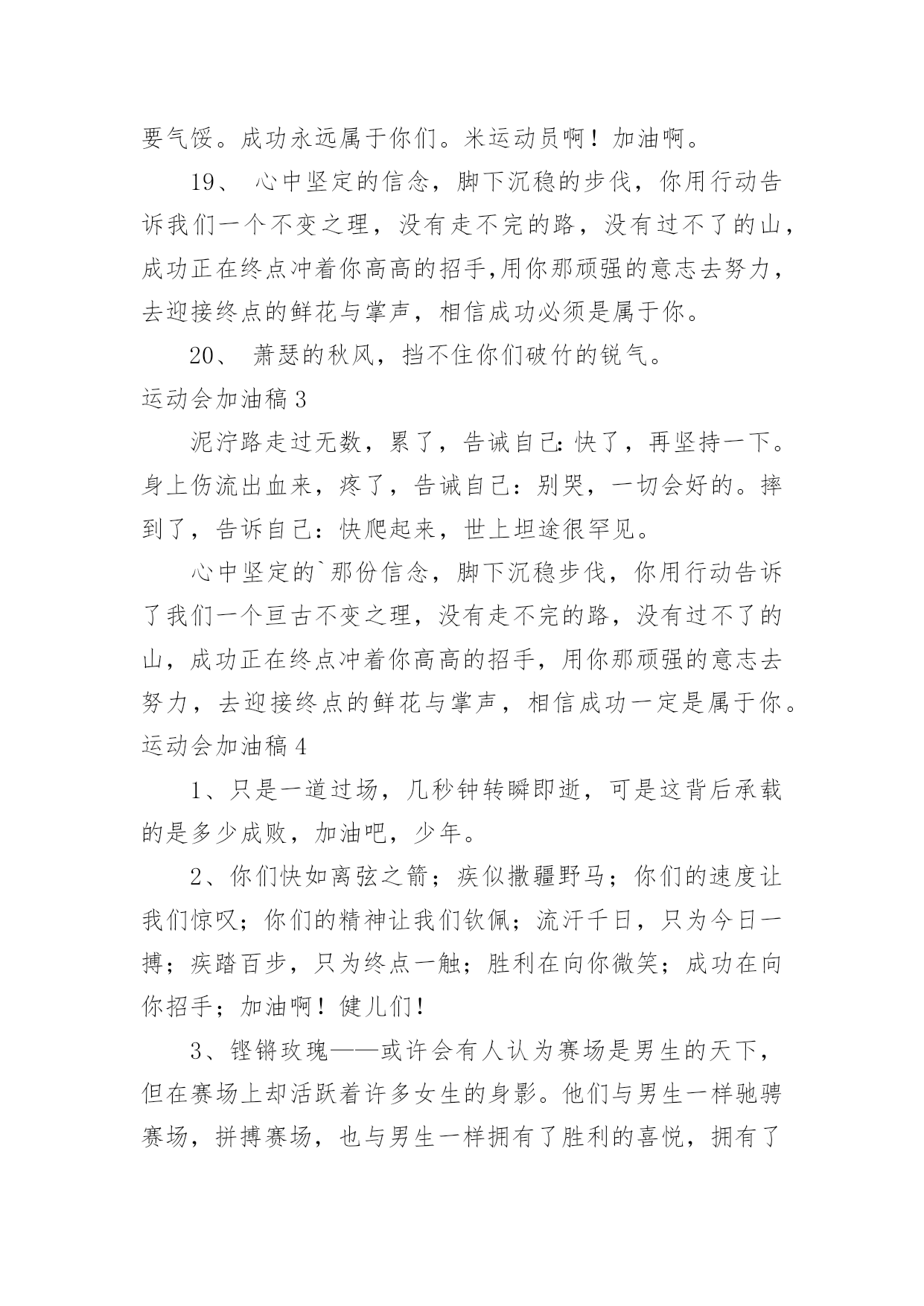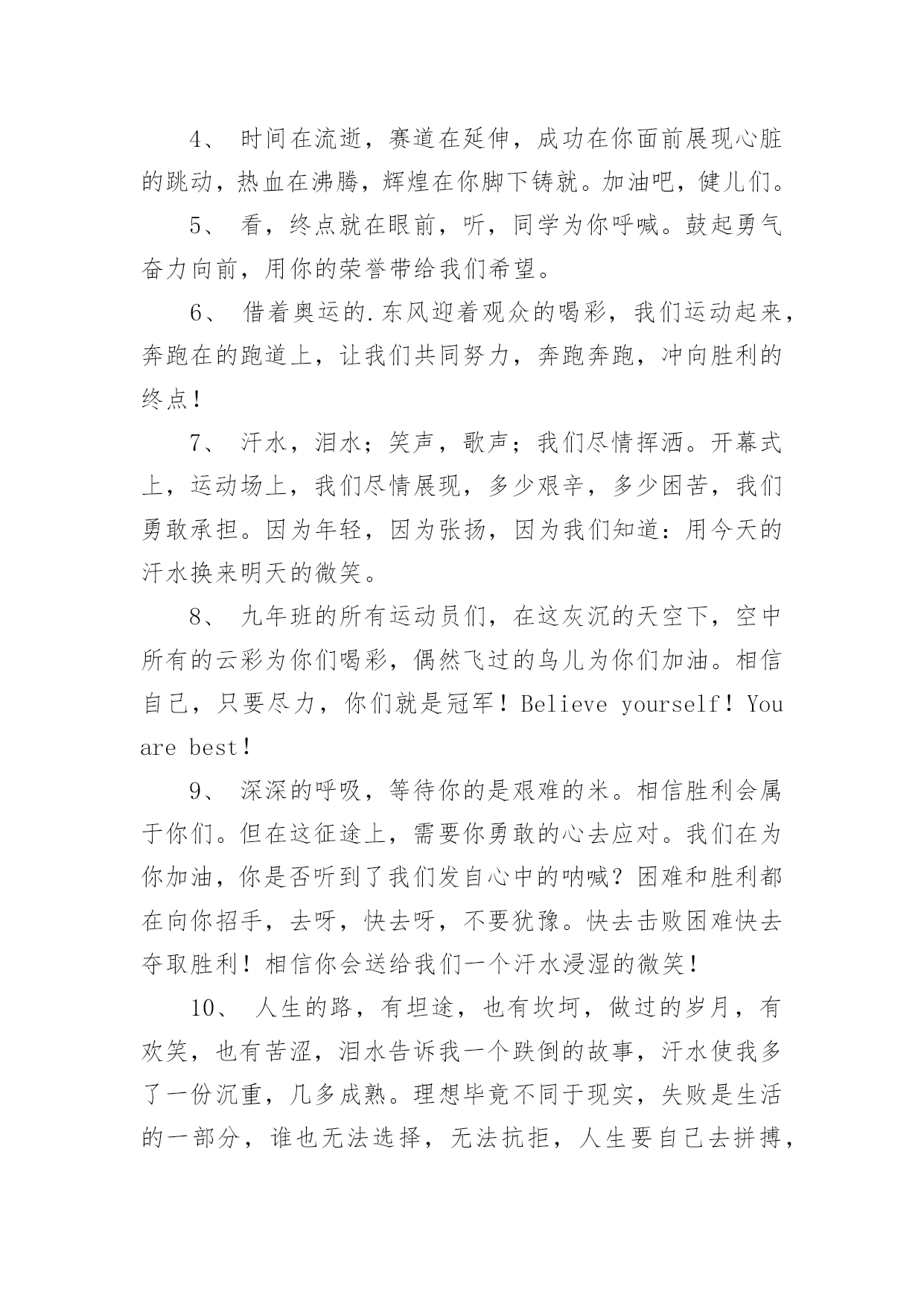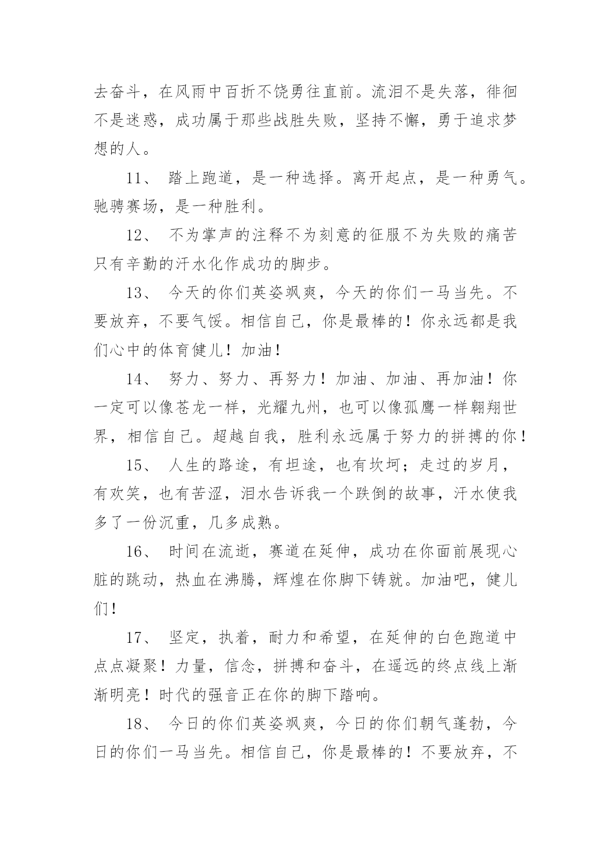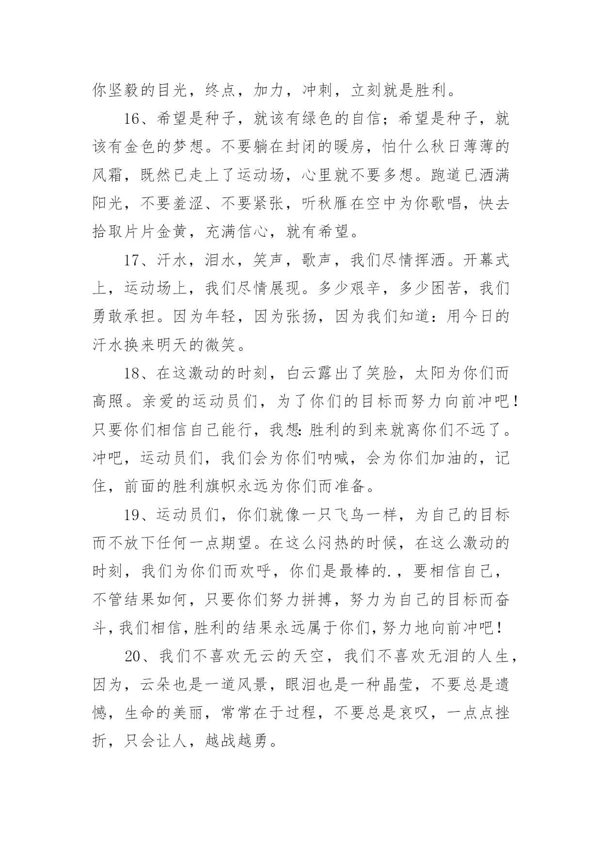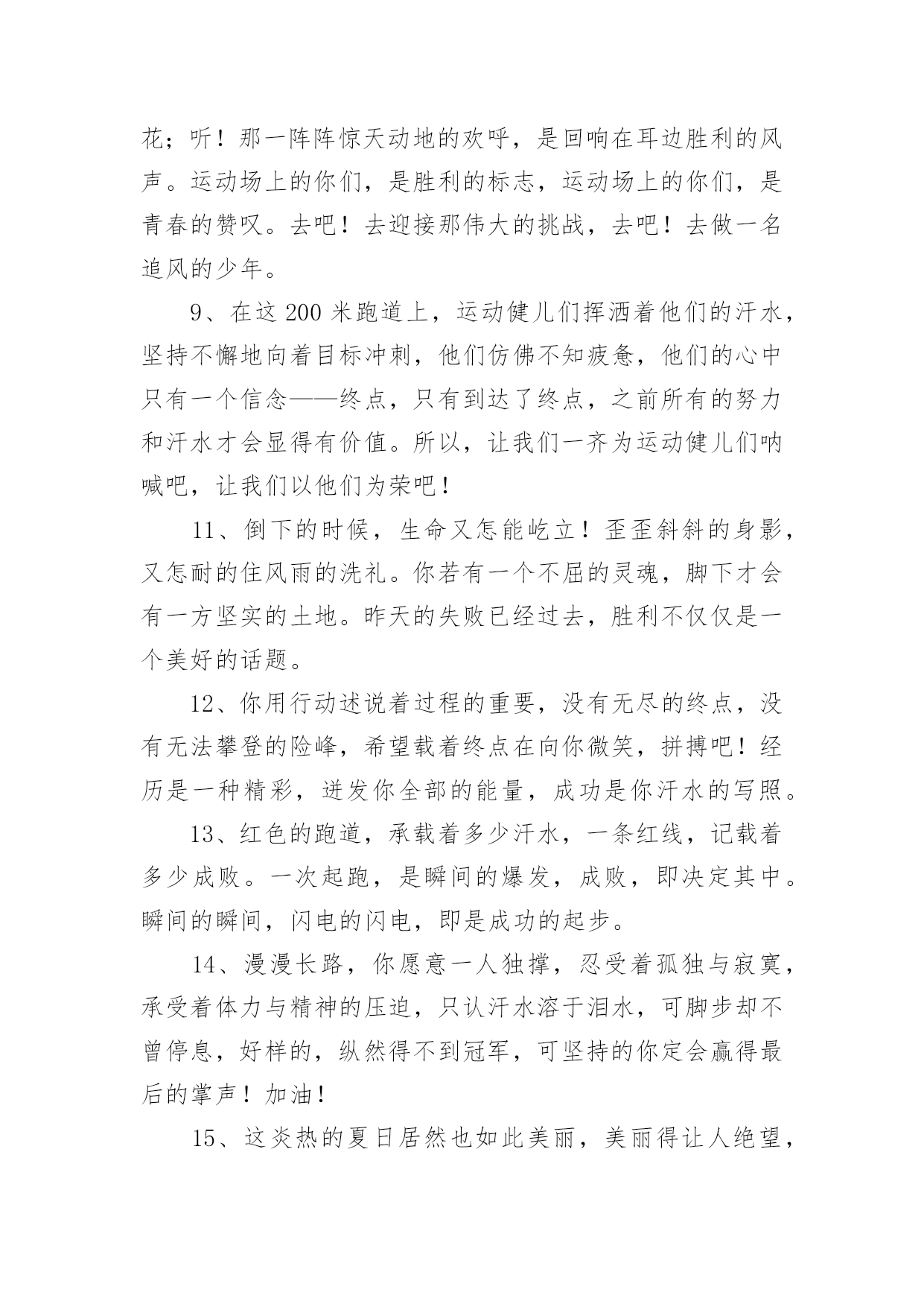 运动会加油稿运动会加油稿(合集15篇)在现在社会,越来越多人会去使用加油稿,借助加油稿可以活跃气氛,催人奋进。还是对加油稿一筹莫展吗?以下是小编精心整理的运动会加油稿,希望能够帮助到大家。运动会加油稿11.亲爱的班健儿们,你们要充满自信。比赛中没有挡风的墙,没有遮风的伞,也没有撑船的帆,更没有拉船的纤。事在人为,人定胜天。原你们养精蓄锐,对充满爱意的世界说:“我自信,我拼搏,我会赢。2.时间在流逝,赛道在延伸,成功在你面前展现心脏的跳动,热血在沸腾,辉煌在你脚下铸就。加油吧,健儿们!3.数不请你跨出了多少坚实的步履,数不请你留下了多少汗滴。只有那悦耳的加油声,在你耳边环绕,激励你超越极限,超越自我。应对成功你从不自傲,应对失败你也只是轻轻一笑,你知道,你是我们永远的骄傲!4.我们班可爱的“梁老大”“吴宝鸡”,我们会在身后默默支持你的!会永远记住你们标志性的动作的,无二,那将会是运动场上的亮点!5.是体育场上游走的火焰,是来去不息的脚步,是风中飞舞的树叶折射的金色光芒,藉此,能够诠释运动员兴奋的脸庞。那轻盈的步伐似飞鸟的翅膀,那清脆的枪声响彻天际,它粲然升起那跃动的渴望,起跑加速超越冲刺,一步一步延向胜利的曙光。那是力的比拼,素质的较量,是石榴树上,跃动的心脏。6.这是意志的拼搏。这是速度的挑战。胜利在向你们招手/胜利在向你们呼唤。7.你们快如离弦之箭;疾似撒疆野马;你们的速度让我们惊叹;你们的精神让我们钦佩;流汗千日,只为今日一搏;疾踏百步,只为终点一触;胜利再向你微笑;成功在向你招手;加油啊!健儿们!8.汗水,泪水;笑声,歌声;我们尽情挥洒。开幕式上,运动场上,我们尽情展现,多少艰辛,多少困苦,我们勇敢承担。因为年轻,因为张扬,因为我们知道:用今日的汗水换来明天的微笑9.萧瑟的秋风,挡不住你们破竹的锐气,10.也许流星并不少见,但它燃烧的刹那,留给人间最美丽的回忆!也许笑脸并不少见,但胜利的喜悦,总会留给世界精彩的一瞬!是的,那些以前美妙的东西只有短短的一瞬间,但那却把最辉煌的一刻留给了人间。胜利,是每个人所追求的,胜利的喜悦,是胜利与重新开始的转折,胜利是新的开始!11.看到你们努力的样貌,我真得很感动。美华新蕾,多谢你们的坚持。我明白成功并不是每个运动员都能获得,看到赛后你们痛苦的表情,我真得很为难,不知就应鼓励你们还是安慰你们。成功的花终会绽放,不在此时便是彼时。米算什么?12.应对艰苦的征程,你们毫不畏惧,接力棒在你们手中传递着群众的力量,听,我们在为你呐喊,你们诠释着奥运的精神,你们是我们心中的骄傲,深深的呼吸,等待你的是艰难的米。相信胜利会属于你们,但在这征途上,需要你勇敢的心去应对。我们在为你加油,你是否听到了我们发自内心的呐喊,困难和胜利都在向你招手,去呀,不要犹豫,快去击败困难,快去夺取胜利,相信你会送给我们一个汗水浸湿的微笑13.看完了九年级女子米比赛,她们苍白的面孔,发干的嘴唇,让人看了不免有些心痛。琼瑶曾生婷婷你们飒爽的英姿在跑道上展现,全班同学都会为你们加油的。为你们骄傲。14.灰暗的天空下有你们的身影,那矫健的身姿在长空下奔驰,向着目标前进。那值得你们洒下汗水的`地方,就在你们眼前闪耀,坚持住,你们是最棒的。加油,二班的运动员们!15.年轻的我们自信飞扬,青春的气息如同出生的朝阳,蓬勃的力量如同阳光的挥洒。此时此刻,跑道便是我们精彩的舞台,声声加油便是我们的奖项!论何成功,谈何荣辱,心中的信念只有一个:拼搏!16.超越对手,超越自我,是我们的目标,是我们的信念,在清凉的初冬,在喧嚣的田径场上,你们点燃了似火的热情,无论成败,我们都为你们感到自豪,你们永远是我们的骄傲!17.你是运动场的心脏,跳动梦想;你是漫长路的精神,激励辉煌;你们是将上下求索的人!风为你加油,云为你助兴,坚定,执着,耐力与希望,在延伸的白色跑道中点点凝聚!力量,信念,拼搏与奋斗,在遥远的终点线上渐渐明亮!时代的强音正在你的脚下踏响。18.微凉的清风吹过你们的脸颊,吹拂过每个运动员的笑脸。我们拥有同一个梦想,怀着同样炽热的心。有付出就有希望。不管你们是否成功,你们永远是我们班的骄傲。加油!八年班。运动会加油稿21、人生的路,有坦途,也有坎坷;做过的岁月,有欢笑,也有苦涩,泪水告诉我一个跌倒的故事,汗水使我多了一份沉重,几多成熟。2、虽然你们在场上的时间很短暂,但你们的身影依然停留在人们的脑海里,因为你们是赛场上最可爱的人。3、某一天,醒在梦的旁边;手指间,光线有些个性;我能看得见,看见光在变,变成七彩的寓言,飞向梦的起点。某一天,飞奔在跑道间;两腮间,汗水不断流出;我能感觉到,感觉你在变,变成生活的强者,奔向成功的边缘!虽然,天阴沉沉的,虽然,有些隐隐的寒意。但是,每个人都昂首向前,每个人都精神焕发,每个人都向着终点向着胜利冲