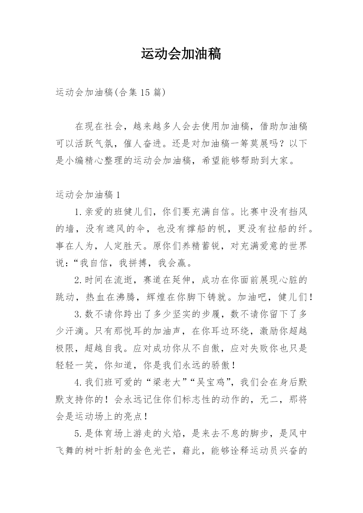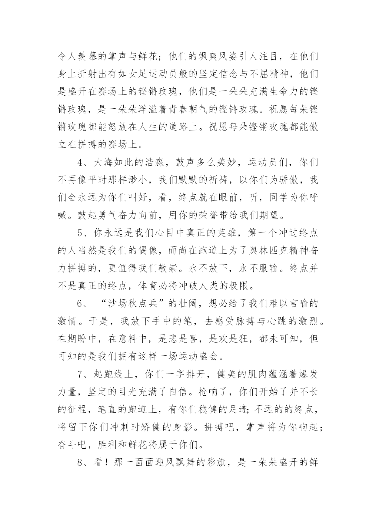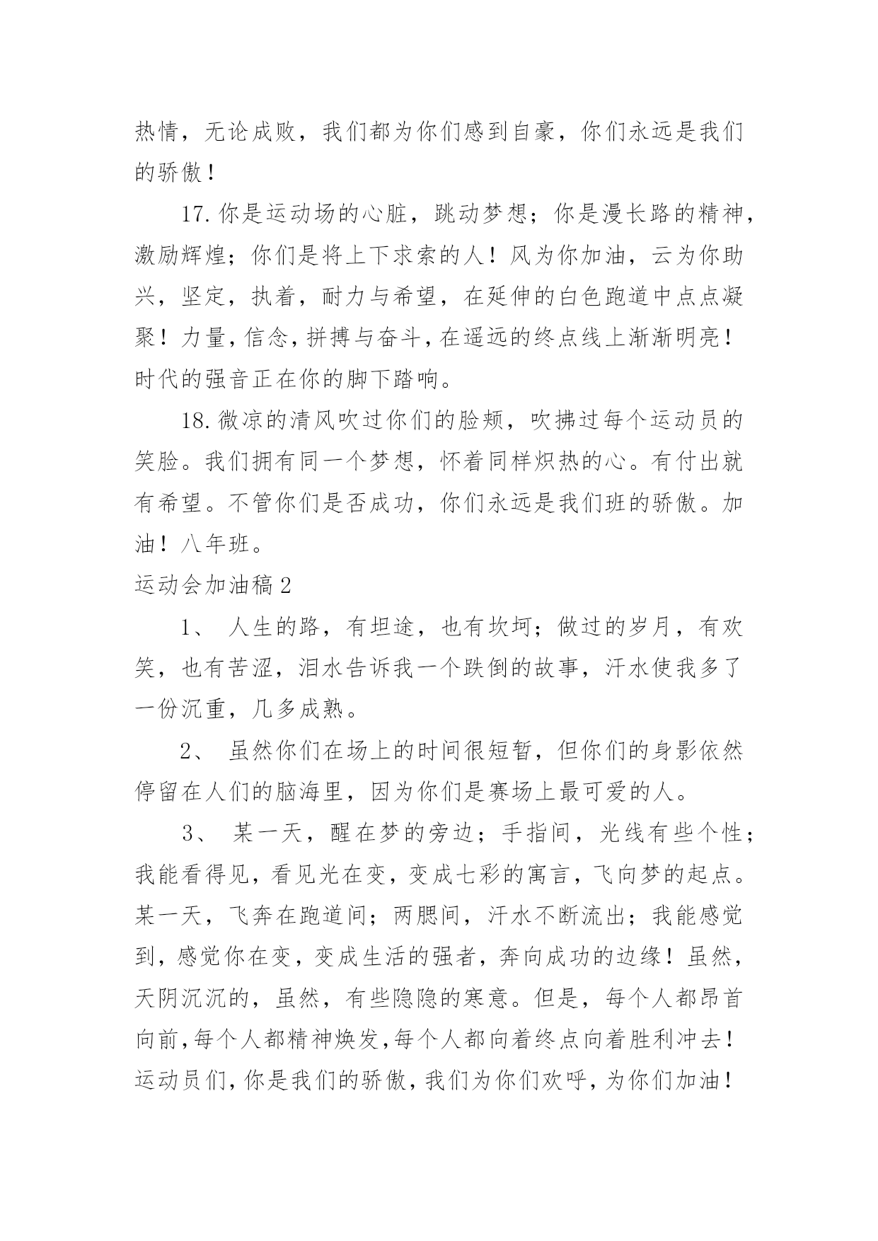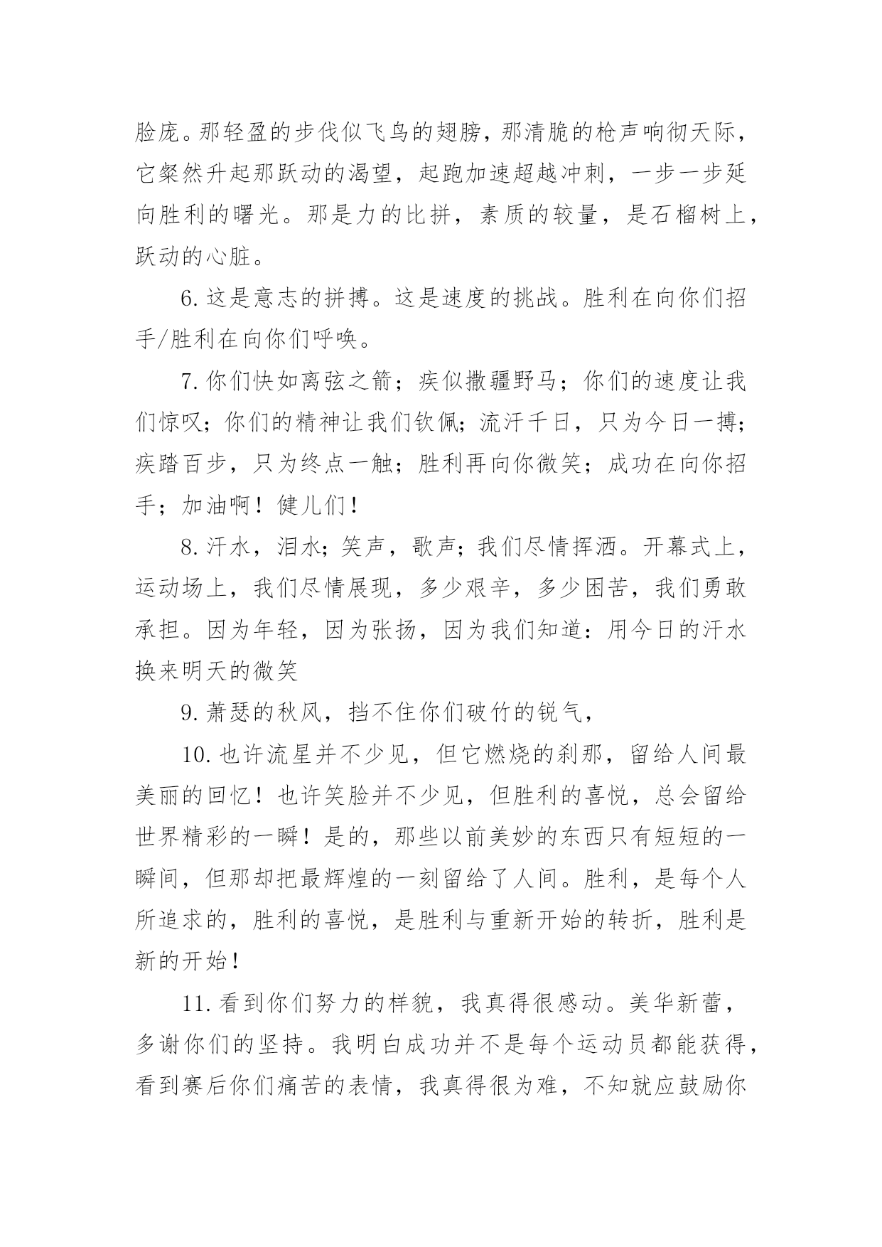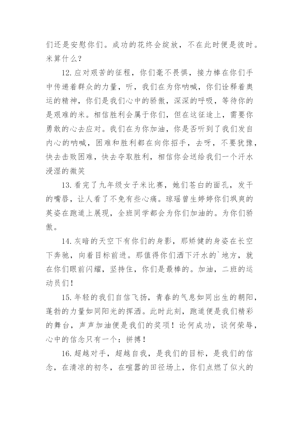 运动会加油稿运动会加油稿(合集15篇)在现在社会,越来越多人会去使用加油稿,借助加油稿可以活跃气氛,催人奋进。还是对加油稿一筹莫展吗?以下是小编精心整理的运动会加油稿,希望能够帮助到大家。运动会加油稿11.亲爱的班健儿们,你们要充满自信。比赛中没有挡风的墙,没有遮风的伞,也没有撑船的帆,更没有拉船的纤。事在人为,人定胜天。原你们养精蓄锐,对充满爱意的世界说:“我自信,我拼搏,我会赢。2.时间在流逝,赛道在延伸,成功在你面前展现心脏的跳动,热血在沸腾,辉煌在你脚下铸就。加油吧,健儿们!3.数不请你跨出了多少坚实的步履,数不请你留下了多少汗滴。只有那悦耳的加油声,在你耳边环绕,激励你超越极限,超越自我。应对成功你从不自傲,应对失败你也只是轻轻一笑,你知道,你是我们永远的骄傲!4.我们班可爱的“梁老大”“吴宝鸡”,我们会在身后默默支持你的!会永远记住你们标志性的动作的,无二,那将会是运动场上的亮点!5.是体育场上游走的火焰,是来去不息的脚步,是风中飞舞的树叶折射的金色光芒,藉此,能够诠释运动员兴奋的脸庞。那轻盈的步伐似飞鸟的翅膀,那清脆的枪声响彻天际,它粲然升起那跃动的渴望,起跑加速超越冲刺,一步一步延向胜利的曙光。那是力的比拼,素质的较量,是石榴树上,跃动的心脏。6.这是意志的拼搏。这是速度的挑战。胜利在向你们招手/胜利在向你们呼唤。7.你们快如离弦之箭;疾似撒疆野马;你们的速度让我们惊叹;你们的精神让我们钦佩;流汗千日,只为今日一搏;疾踏百步,只为终点一触;胜利再向你微笑;成功在向你招手;加油啊!健儿们!8.汗水,泪水;笑声,歌声;我们尽情挥洒。开幕式上,运动场上,我们尽情展现,多少艰辛,多少困苦,我们勇敢承担。因为年轻,因为张扬,因为我们知道:用今日的汗水换来明天的微笑9.萧瑟的秋风,挡不住你们破竹的锐气,10.也许流星并不少见,但它燃烧的刹那,留给人间最美丽的回忆!也许笑脸并不少见,但胜利的喜悦,总会留给世界精彩的一瞬!是的,那些以前美妙的东西只有短短的一瞬间,但那却把最辉煌的一刻留给了人间。胜利,是每个人所追求的,胜利的喜悦,是胜利与重新开始的转折,胜利是新的开始!11.看到你们努力的样貌,我真得很感动。美华新蕾,多谢你们的坚持。我明白成功并不是每个运动员都能获得,看到赛后你们痛苦的表情,我真得很为难,不知就应鼓励你们还是安慰你们。成功的花终会绽放,不在此时便是彼时。米算什么?12.应对艰苦的征程,你们毫不畏惧,接力棒在你们手中传递着群众的力量,听,我们在为你呐喊,你们诠释着奥运的精神,你们是我们心中的骄傲,深深的呼吸,等待你的是艰难的米。相信胜利会属于你们,但在这征途上,需要你勇敢的心去应对。我们在为你加油,你是否听到了我们发自内心的呐喊,困难和胜利都在向你招手,去呀,不要犹豫,快去击败困难,快去夺取胜利,相信你会送给我们一个汗水浸湿的微笑13.看完了九年级女子米比赛,她们苍白的面孔,发干的嘴唇,让人看了不免有些心痛。琼瑶曾生婷婷你们飒爽的英姿在跑道上展现,全班同学都会为你们加油的。为你们骄傲。14.灰暗的天空下有你们的身影,那矫健的身姿在长空下奔驰,向着目标前进。那值得你们洒下汗水的`地方,就在你们眼前闪耀,坚持住,你们是最棒的。加油,二班的运动员们!15.年轻的我们自信飞扬,青春的气息如同出生的朝阳,蓬勃的力量如同阳光的挥洒。此时此刻,跑道便是我们精彩的舞台,声声加油便是我们的奖项!论何成功,谈何荣辱,心中的信念只有一个:拼搏!16.超越对手,超越自我,是我们的目标,是我们的信念,在清凉的初冬,在喧嚣的田径场上,你们点燃了似火的热情,无论成败,我们都为你们感到自豪,你们永远是我们的骄傲!17.你是运动场的心脏,跳动梦想;你是漫长路的精神,激励辉煌;你们是将上下求索的人!风为你加油,云为你助兴,坚定,执着,耐力与希望,在延伸的白色跑道中点点凝聚!力量,信念,拼搏与奋斗,在遥远的终点线上渐渐明亮!时代的强音正在你的脚下踏响。18.微凉的清风吹过你们的脸颊,吹拂过每个运动员的笑脸。我们拥有同一个梦想,怀着同样炽热的心。有付出就有希望。不管你们是否成功,你们永远是我们班的骄傲。加油!八年班。运动会加油稿21、人生的路,有坦途,也有坎坷;做过的岁月,有欢笑,也有苦涩,泪水告诉我一个跌倒的故事,汗水使我多了一份沉重,几多成熟。2、虽然你们在场上的时间很短暂,但你们的身影依然停留在人们的脑海里,因为你们是赛场上最可爱的人。3、某一天,醒在梦的旁边;手指间,光线有些个性;我能看得见,看见光在变,变成七彩的寓言,飞向梦的起点。某一天,飞奔在跑道间;两腮间,汗水不断流出;我能感觉到,感觉你在变,变成生活的强者,奔向成功的边缘!虽然,天阴沉沉的,虽然,有些隐隐的寒意。但是,每个人都昂首向前,每个人都精神焕发,每个人都向着终点向着胜利冲