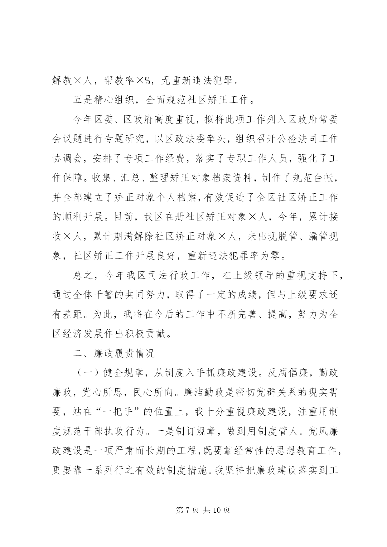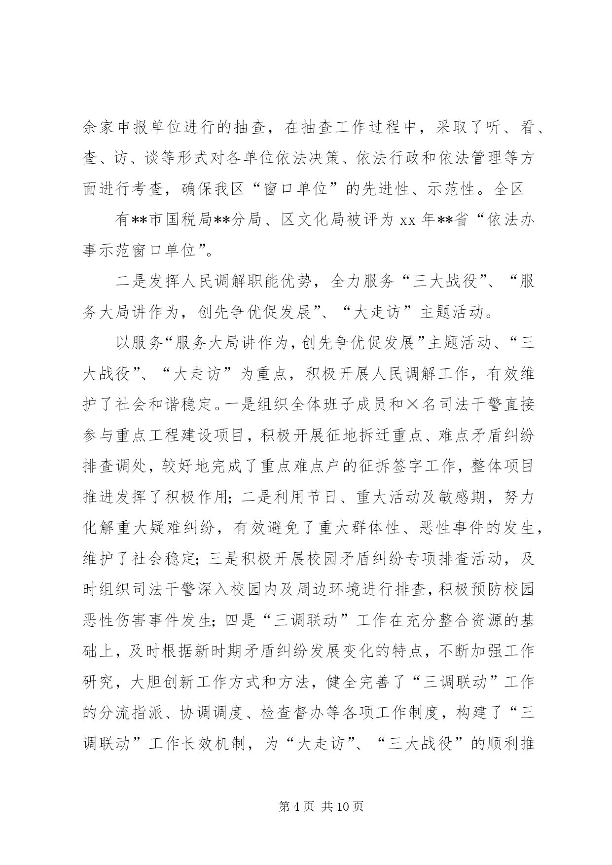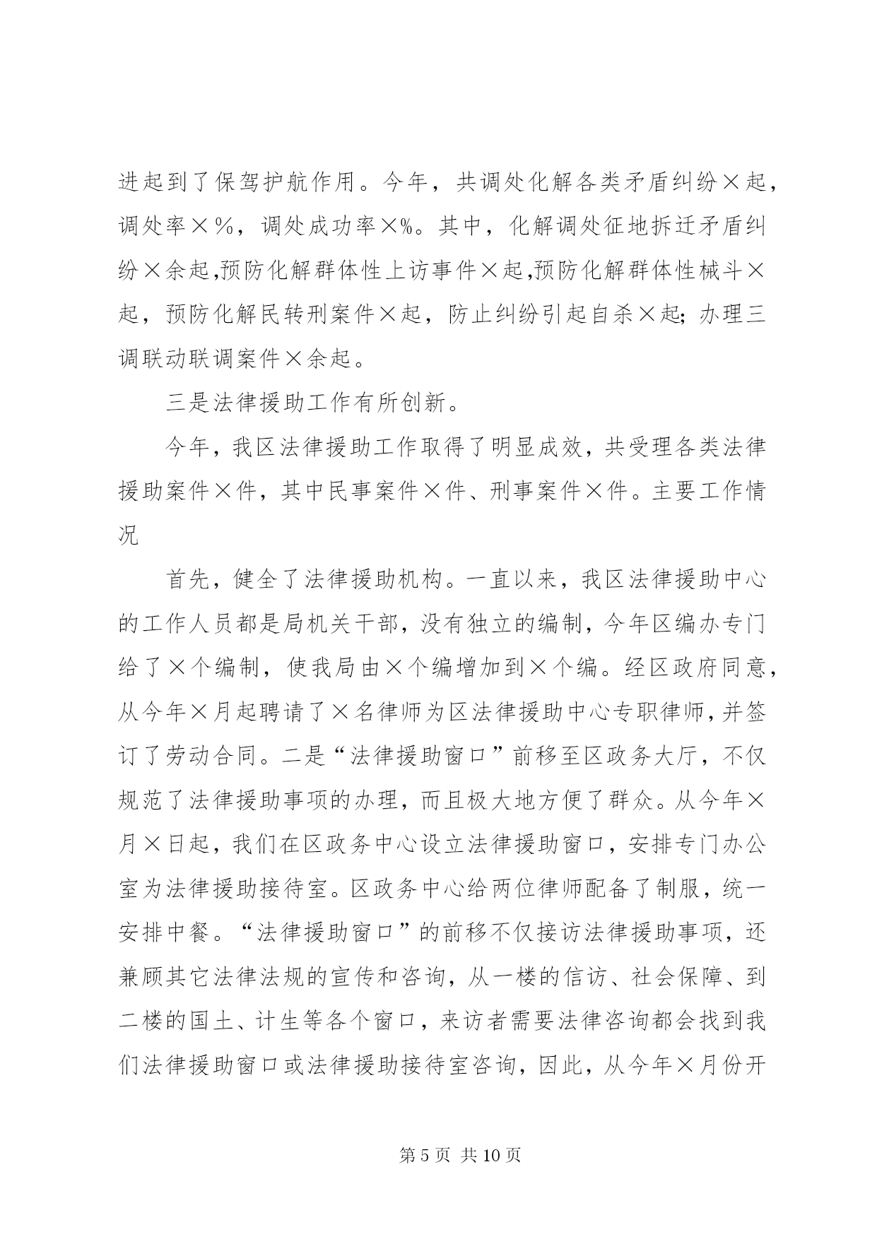 第PAGE\*Arabic\*MERGEFORMAT10页共NUMPAGES\*MERGEFORMAT10页XX年司法局长年终述职报告范文今年来,在区委、区政府的正确领导下,在区人大和区政协的指导监督下,我始终坚持贯彻落实科学发展观,突出抓好“法治**”和“平安**”建设,为“一年初见成效,三年大见成效,五年再造一个新**”的宏伟目标提供优良的司法保障体系。坚持忠心履职,率先垂范,锐意进取,推动了司法行政事业全面发展,为服务全市“三大战役”和全区“大走访”做出应有贡献。一、履职情况(一)立足本职、努力学习,不断提高政治思想水平和领导决策能力。本人始终在实践中掌握新知识、积累新经验、增强新本领,不断提高科学判断形势的能力、驾驭市场经济的能力、应付复杂局面的能力、依法执政的能力和总揽全局的能力。平时非常注重政治理论学习,重视用正确的理论武装头脑,积极学习上级政策文件,自觉用上级文件精神指导自己的行动。除参加业务培训班外,还认真学习了《党章》、《社会主义法治理念教育读本》、******七一讲话等内容,撰写了读书笔记、心得体会。通过一系列的政治、业务学习,思想觉悟不断提高,政治方向日益明确。在自己亲力亲为的带领下,局班子号召力和战斗不断提高。全局司法行政干警爱岗敬业、开拓进取、建功立业的思想已蔚然成风。(二)围绕中心工作,真抓实干、力求实效。一是深化普法依法治理工作,努力提高全民法律素质。今年是“xx”开局之年,也是“xx”普法启动年,为全面落实省、市相关工作精神。我们紧紧围绕“xx”普法规划暨“法治**”建设任务,深入贯彻落实科学发展观,以“xx”普法启动为重点,落实措施,突出特色,彰显亮点,全面深化法治创建活动,为建设和谐**做出新贡献。1、深入调查研究、为启动“xx”普治工作做好充分准备。为使“xx”普治工作有序、顺利的开展,我们深入基层开展大走访活动,召开座谈会,倾听群众声音、了解区情民意,就如何有效、深入推进“xx”普法,在普法形式、重点对象、重点内容,普法经费保障和考核奖惩机制等方面进行了探讨,研究制定了具有科学性、广泛性、针对性且符合我区实际的“xx”普法规划。2、狠抓法制宣传教育工作。一年来,我们从实际出发,带领全局先后开展了一系列以农村法制宣传教育活动。一是为配合市委宣传部主办的xx年**市“五下乡”活动,区依法治区办为农民朋友送去了“城镇居民读本”、“农民普法读本”“司法为民”的漫画手册等法制宣传教育读本近×册,并针对农民群众关注的土地纠纷、征地拆迁补偿和劳动权益保障等问题印发了宣传单×份,免费发放到农民群众手中,现场接受法律咨询百余人次。二是结合区情,先后制作了以征地拆迁、司法为民、人民调解、换届选举等为主题的《**市**区xx普法系列宣传漫画册》,深受全区居民群众欢迎。三是广泛开展街头宣传。组织区依法治区领导小组成员单位先后在合泰大街、红旗广场等繁华地段开展现场法律咨询活动,放发宣传资料近万份。现场解答法律咨询×余人次。如×月×日结合新修订的《**省法律援助条例》即将实施,在红旗广场开展了宣传和咨询活动,区公安局、区检察院、区法院、区各司法所等部门参加了这次活动。共接访了有关经济纠纷、土地承包、婚姻家庭、损害赔偿、职工合法权益、军人军属维权等方面的咨询×余人次,发放宣传资料×万余份,现场受理援助案件×件。有效促进了广大居民群众更深入地了解法律援助制度,掌握法律援助知识,扩大了社会影响。四是加大媒体宣传力度。以“**法治”为媒体宣传主阵地加强法制宣传教育。今年今年,我区在“**法治”网上上稿×篇,全市排名第一,全省排名第五。3、深入推进“法治**”创建工作。按照“法治**”创建工作实施意见和规划以及年初工作目标和要求,今年我们深入开展“法治机关”、“法治学校”等创建活动,进一步指导落实,建立完善政府及部门单位重大事项决策程序规定和依法决策、科学决策、民主决策机制,进一步推进创建工作责任制和监督检查、投入保障、奖惩激励机制的落实。主要是结合全区机关干部大走访活动的开展,深入全区各村、机关、单位、社区等突出对创建对象的过程指导与动态管理,进一步整合资源,健全区及其乡镇(街道)、村(社区)四级联动的创建网络,于×月×日对我区×余家申报单位进行的抽查,在抽查工作过程中,采取了听、看、查、访、谈等形式对各单位依法决策、依法行政和依法管理等方面进行考查,确保我区“窗口单位”的先进性、示范性。全区有**市国税局**分局、区文化局被评为xx年**省“依法办事示范窗口单位”。二是发挥人民调解职能优势,全力服务“三大战役”、“服务大局讲作为,创先争优促发展”、“大走访”主题活动。以服务“服务大局讲作为,创先争优促发展”主题活动、“三大战役”、“大走访”为重点,积极开展人民调解工作,有效维护了社会和谐稳定。一