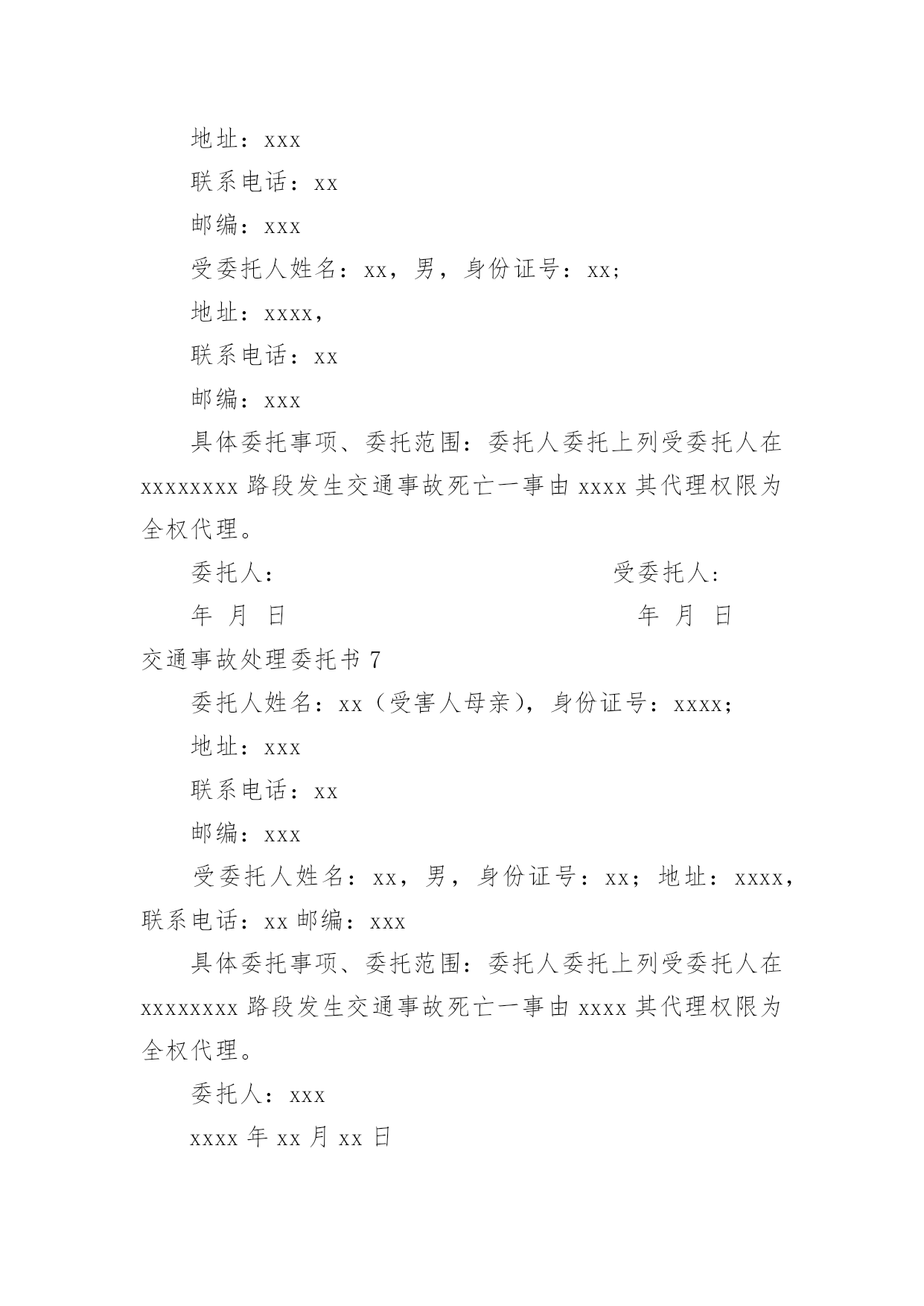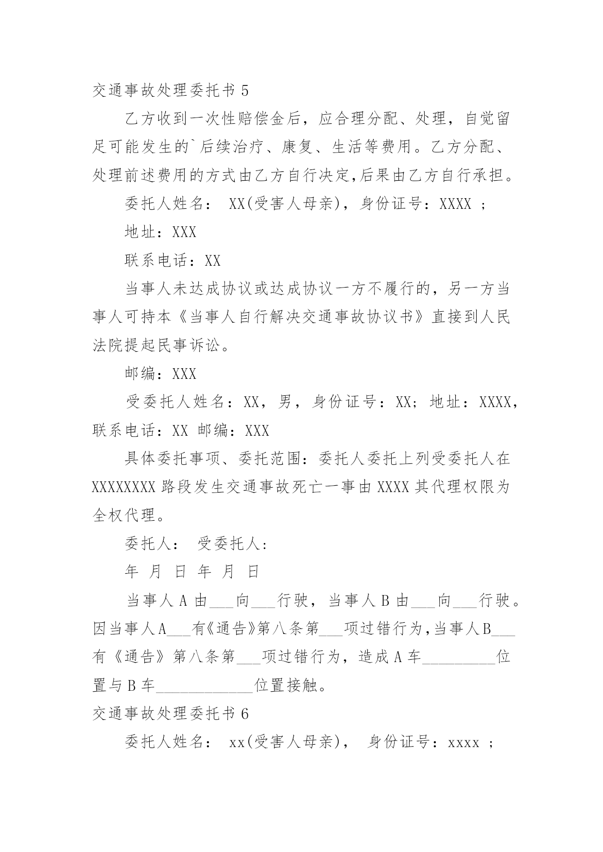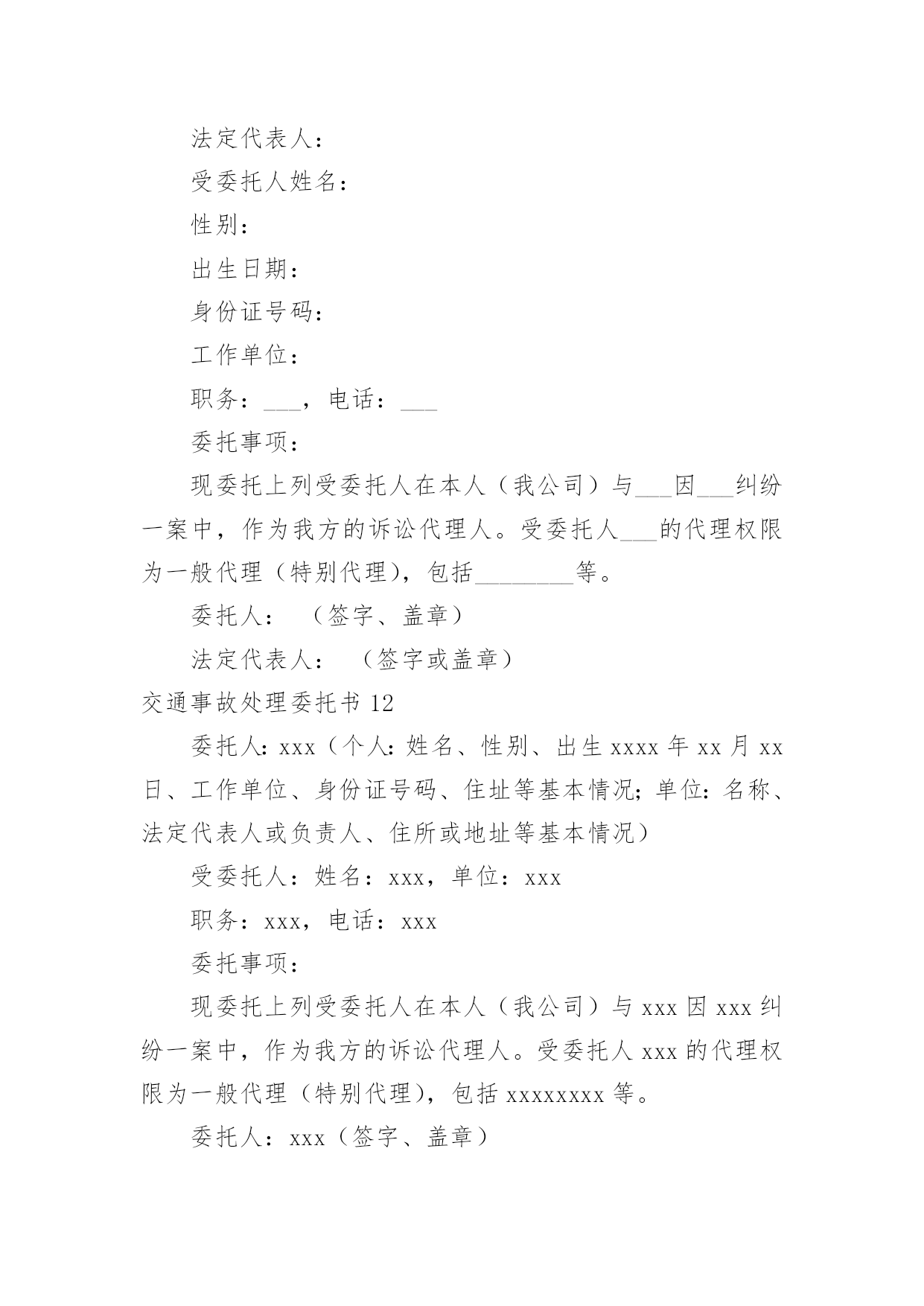 交通事故处理委托书交通事故处理委托书如果被委托人没有做出违背国家法律的任何权益,委托人无权终止委托协议。在充满活力,日益开放的今天,委托书在处理事务上使用的情况越来越多,在写之前,可以先参考范文,下面是小编收集整理的交通事故处理委托书,仅供参考,大家一起来看看吧。交通事故处理委托书1委托人姓名:xx(受害人母亲),身份证号:xxxx地址:xxx联系电话:xx邮编:xx受委托人姓名:xx,男,身份证号:xx;地址:xxx,联系电话:xxx邮编:xxx具体委托事项、委托范围:委托人委托上列受委托人在xxxx路段发生交通事故死亡一事由xxx其代理权限为全权代理。委托人:受委托人:年月日年月日交通事故处理委托书2委托单位:地址:法定代表人:受委托人姓名:性别:出生日期:身份证号码:工作单位:现委托上述授权责任人作为我单位在____日常管理上的`全权代表,代表法人签署相关文件,并承担相应的法律责任。本授权有效期为此授权书签发之日起至法人代表书面声明本授权作废为止。后附法定代表人身份证复印件(加盖人名章或签名)和法人授权责任人身份证复印件(加盖人名章或签名)。委托单位:(盖章)法定代表人:(签名或盖章)受托人:(签名或盖章)年月日说明:1、法人授权委托书所签发的代理期限必须涵盖代理人所有签字为有效时间。2、委托书内容填写要明确,文字要工整清楚,涂改无效。3、委托书不得转借、转让,不得买卖。4、代理人根据授权范围,以委托单位的名义签订合同,并将此委托书提交给对方作为合同附件。交通事故处理委托书3委托单位名称:住所地:当事人A由___向___行驶,当事人B由___向___行驶。因当事人A___有《通告》第八条第___项过错行为,当事人B___有《通告》第八条第___项过错行为,造成A车_________位置与B车____________位置接触。乙方收到一次性赔偿金后,应合理分配、处理,自觉留足可能发生的后续治疗、康复、生活等费用。乙方分配、处理前述费用的方式由乙方自行决定,后果由乙方自行承担。法定代表人或主要负责人姓名:职务:受委托人姓名:性别:年龄:工作单位:职务:住址:电话:现委托在我单位与交通事故一案中,作为我方参诉讼的委托代理人,委托权限如下:一、一般授权二、特别授权:授权范围:代为起诉,陈述事实,参加辩论和调解,代为提出、承认、放弃、变更诉讼请求,提出反诉、进行和解、撤诉、上诉、签收法律文书。委托单位:(公章)法定代表人:年月日注:1、法人或其他组织授权委托书,是当事人依法委托他人作为诉讼代理人,向人民法院提交的写明委托事项和权限的.文书。2、委托代理人须写明代理权限,特别授权的,应写明授权的具体范围:代为起诉,陈述事实,参加辩论和调解,代为提出、承认、放弃、变更诉讼请求,提出反诉、进行和解、撤诉、上诉、签收法律文书。3、上述两种授权方式不能同时适用,只能择一使用。交通事故处理委托书4委托人:受委托人:委托事项:现委托上列受委托人在本人(我公司)与xxx因xxx纠纷一案中,作为我方的诉讼代理人。受委托人xxx的代理权限为一般代理(特别代理),包括xxxxxxxxxxxxxxxxx等。委托人:20xx年xx月xx日交通事故处理委托书5乙方收到一次性赔偿金后,应合理分配、处理,自觉留足可能发生的`后续治疗、康复、生活等费用。乙方分配、处理前述费用的方式由乙方自行决定,后果由乙方自行承担。委托人姓名:XX(受害人母亲),身份证号:XXXX;地址:XXX联系电话:XX当事人未达成协议或达成协议一方不履行的,另一方当事人可持本《当事人自行解决交通事故协议书》直接到人民法院提起民事诉讼。邮编:XXX受委托人姓名:XX,男,身份证号:XX;地址:XXXX,联系电话:XX邮编:XXX具体委托事项、委托范围:委托人委托上列受委托人在XXXXXXXX路段发生交通事故死亡一事由XXXX其代理权限为全权代理。委托人:受委托人:年月日年月日当事人A由___向___行驶,当事人B由___向___行驶。因当事人A___有《通告》第八条第___项过错行为,当事人B___有《通告》第八条第___项过错行为,造成A车_________位置与B车____________位置接触。交通事故处理委托书6委托人姓名:xx(受害人母亲),身份证号:xxxx;地址:xxx联系电话:xx邮编:xxx受委托人姓名:xx,男,身份证号:xx;地址:xxxx,联系电话:xx邮编:xxx具体委托事项、委托范围:委托人委托上列受委托人在xxxxxxxx路段发生交通事故死亡一事由xxxx其代理权限为全权代理。委托人:受委托人:年月日年月日交通事故处理委托书7委托人姓名:xx(受害人母亲),身份证号:xxxx;地址:xxx联系电话:xx邮编:xxx受委托人姓名:xx,男,身份证号:xx;地