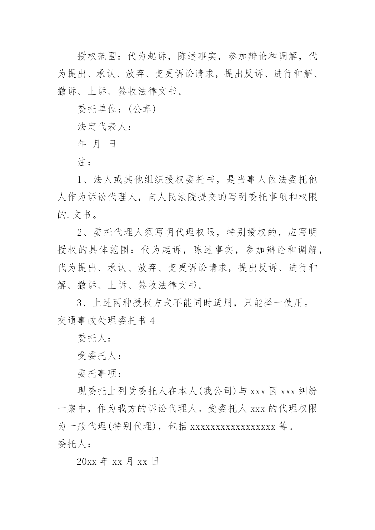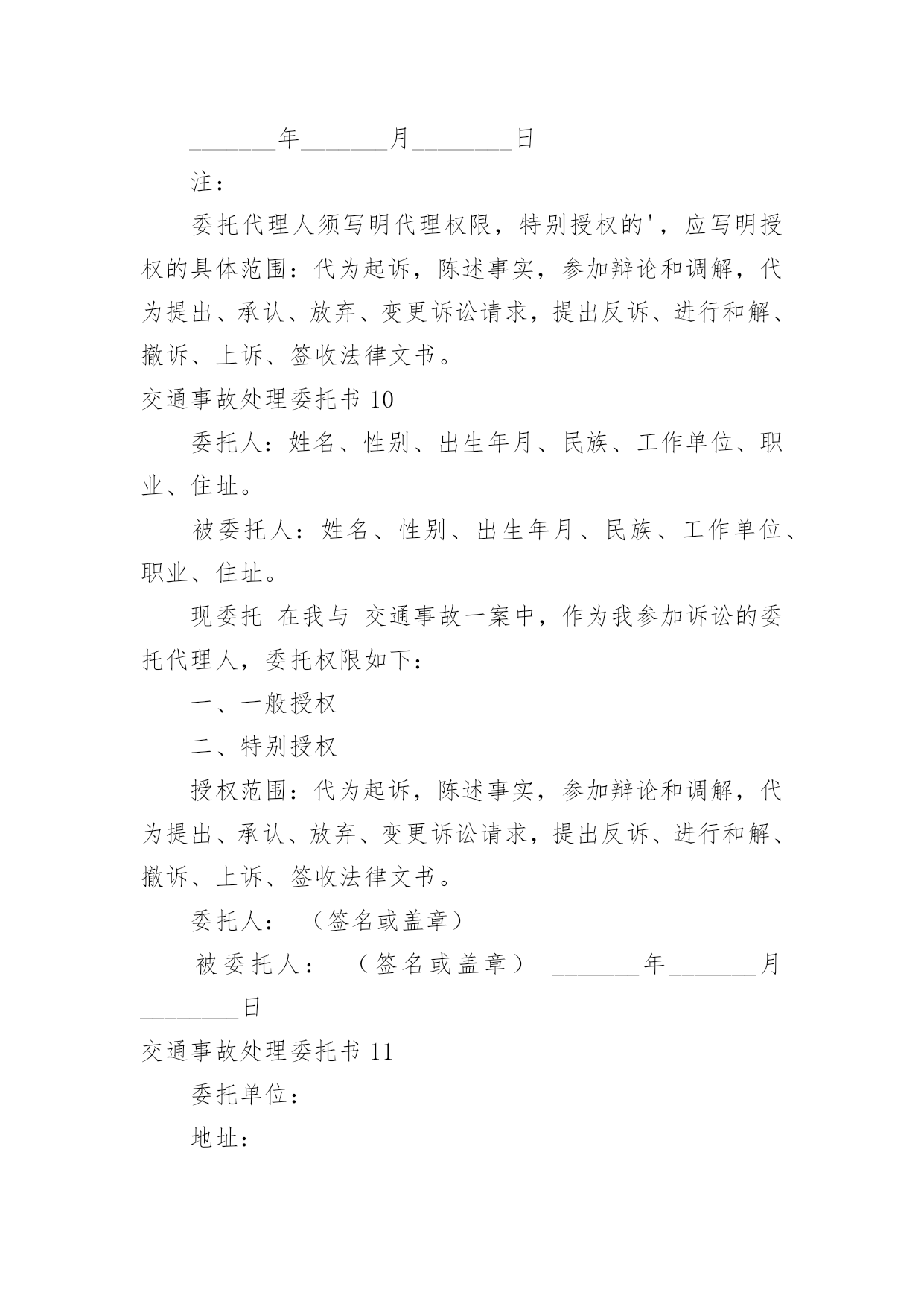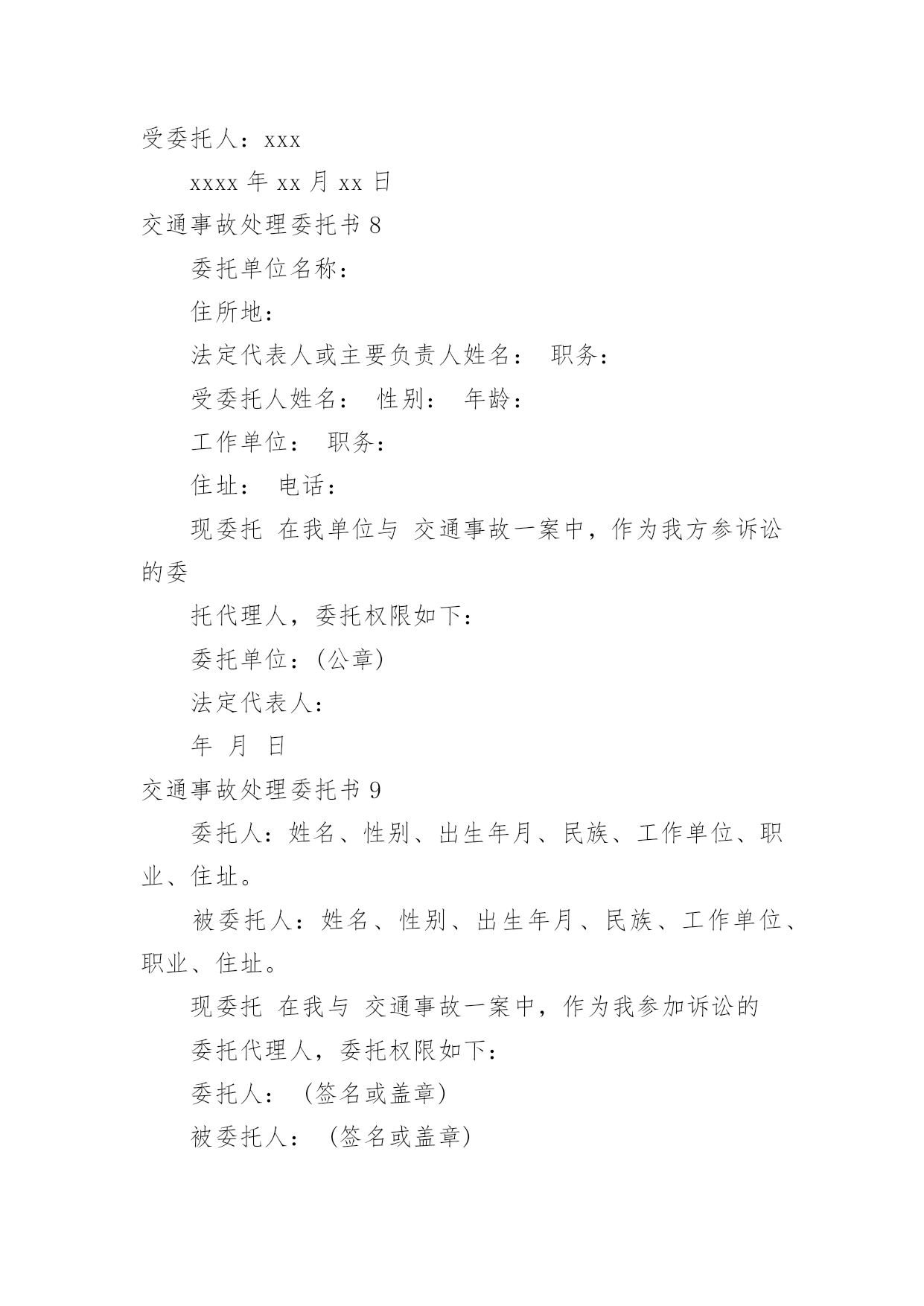 交通事故处理委托书交通事故处理委托书如果被委托人没有做出违背国家法律的任何权益,委托人无权终止委托协议。在充满活力,日益开放的今天,委托书在处理事务上使用的情况越来越多,在写之前,可以先参考范文,下面是小编收集整理的交通事故处理委托书,仅供参考,大家一起来看看吧。交通事故处理委托书1委托人姓名:xx(受害人母亲),身份证号:xxxx地址:xxx联系电话:xx邮编:xx受委托人姓名:xx,男,身份证号:xx;地址:xxx,联系电话:xxx邮编:xxx具体委托事项、委托范围:委托人委托上列受委托人在xxxx路段发生交通事故死亡一事由xxx其代理权限为全权代理。委托人:受委托人:年月日年月日交通事故处理委托书2委托单位:地址:法定代表人:受委托人姓名:性别:出生日期:身份证号码:工作单位:现委托上述授权责任人作为我单位在____日常管理上的`全权代表,代表法人签署相关文件,并承担相应的法律责任。本授权有效期为此授权书签发之日起至法人代表书面声明本授权作废为止。后附法定代表人身份证复印件(加盖人名章或签名)和法人授权责任人身份证复印件(加盖人名章或签名)。委托单位:(盖章)法定代表人:(签名或盖章)受托人:(签名或盖章)年月日说明:1、法人授权委托书所签发的代理期限必须涵盖代理人所有签字为有效时间。2、委托书内容填写要明确,文字要工整清楚,涂改无效。3、委托书不得转借、转让,不得买卖。4、代理人根据授权范围,以委托单位的名义签订合同,并将此委托书提交给对方作为合同附件。交通事故处理委托书3委托单位名称:住所地:当事人A由___向___行驶,当事人B由___向___行驶。因当事人A___有《通告》第八条第___项过错行为,当事人B___有《通告》第八条第___项过错行为,造成A车_________位置与B车____________位置接触。乙方收到一次性赔偿金后,应合理分配、处理,自觉留足可能发生的后续治疗、康复、生活等费用。乙方分配、处理前述费用的方式由乙方自行决定,后果由乙方自行承担。法定代表人或主要负责人姓名:职务:受委托人姓名:性别:年龄:工作单位:职务:住址:电话:现委托在我单位与交通事故一案中,作为我方参诉讼的委托代理人,委托权限如下:一、一般授权二、特别授权:授权范围:代为起诉,陈述事实,参加辩论和调解,代为提出、承认、放弃、变更诉讼请求,提出反诉、进行和解、撤诉、上诉、签收法律文书。委托单位:(公章)法定代表人:年月日注:1、法人或其他组织授权委托书,是当事人依法委托他人作为诉讼代理人,向人民法院提交的写明委托事项和权限的.文书。2、委托代理人须写明代理权限,特别授权的,应写明授权的具体范围:代为起诉,陈述事实,参加辩论和调解,代为提出、承认、放弃、变更诉讼请求,提出反诉、进行和解、撤诉、上诉、签收法律文书。3、上述两种授权方式不能同时适用,只能择一使用。交通事故处理委托书4委托人:受委托人:委托事项:现委托上列受委托人在本人(我公司)与xxx因xxx纠纷一案中,作为我方的诉讼代理人。受委托人xxx的代理权限为一般代理(特别代理),包括xxxxxxxxxxxxxxxxx等。委托人:20xx年xx月xx日交通事故处理委托书5乙方收到一次性赔偿金后,应合理分配、处理,自觉留足可能发生的`后续治疗、康复、生活等费用。乙方分配、处理前述费用的方式由乙方自行决定,后果由乙方自行承担。委托人姓名:XX(受害人母亲),身份证号:XXXX;地址:XXX联系电话:XX当事人未达成协议或达成协议一方不履行的,另一方当事人可持本《当事人自行解决交通事故协议书》直接到人民法院提起民事诉讼。邮编:XXX受委托人姓名:XX,男,身份证号:XX;地址:XXXX,联系电话:XX邮编:XXX具体委托事项、委托范围:委托人委托上列受委托人在XXXXXXXX路段发生交通事故死亡一事由XXXX其代理权限为全权代理。委托人:受委托人:年月日年月日当事人A由___向___行驶,当事人B由___向___行驶。因当事人A___有《通告》第八条第___项过错行为,当事人B___有《通告》第八条第___项过错行为,造成A车_________位置与B车____________位置接触。交通事故处理委托书6委托人姓名:xx(受害人母亲),身份证号:xxxx;地址:xxx联系电话:xx邮编:xxx受委托人姓名:xx,男,身份证号:xx;地址:xxxx,联系电话:xx邮编:xxx具体委托事项、委托范围:委托人委托上列受委托人在xxxxxxxx路段发生交通事故死亡一事由xxxx其代理权限为全权代理。委托人:受委托人:年月日年月日交通事故处理委托书7委托人姓名:xx(受害人母亲),身份证号:xxxx;地址:xxx联系电话:xx邮编:xxx受委托人姓名:xx,男,身份证号:xx;地