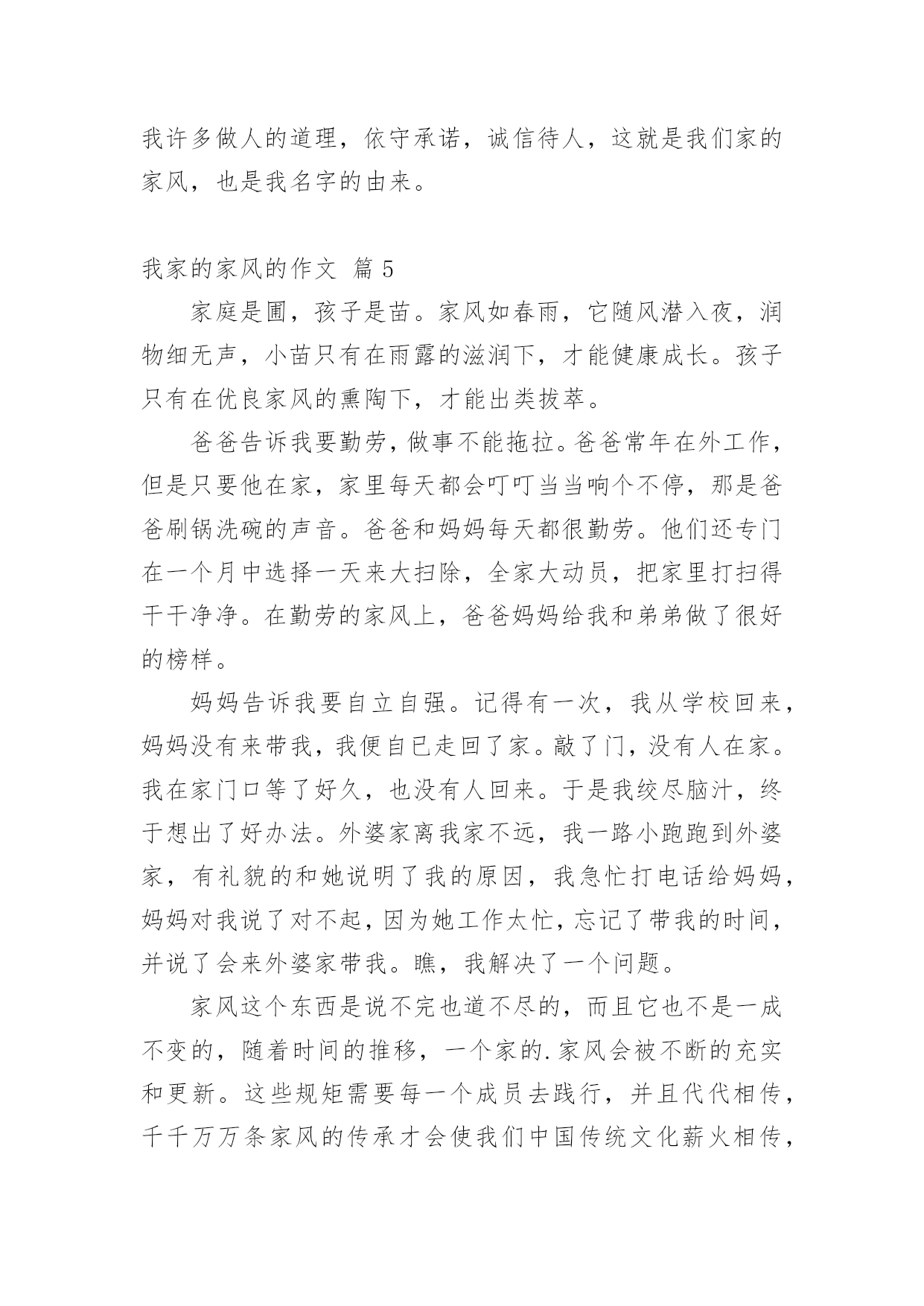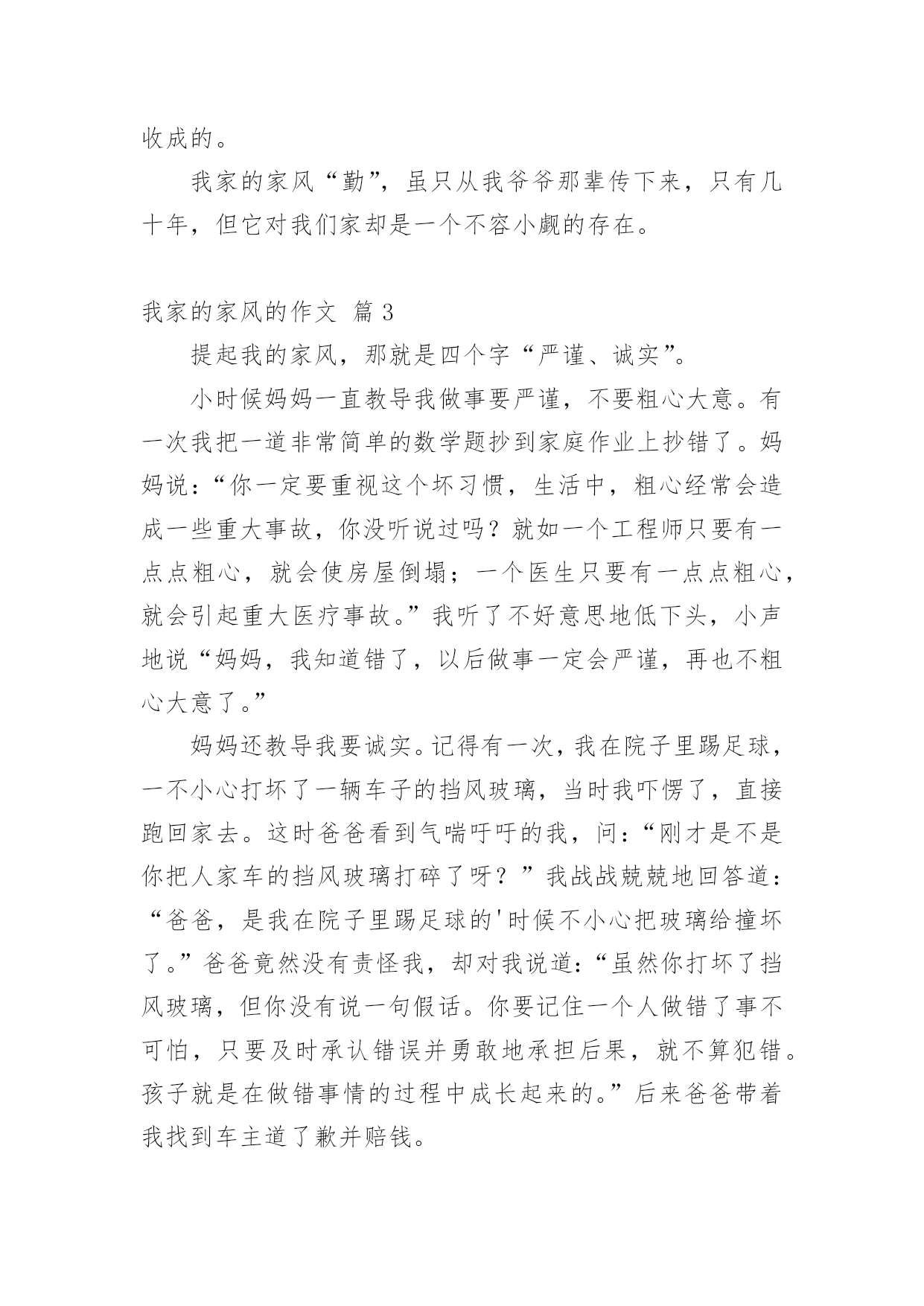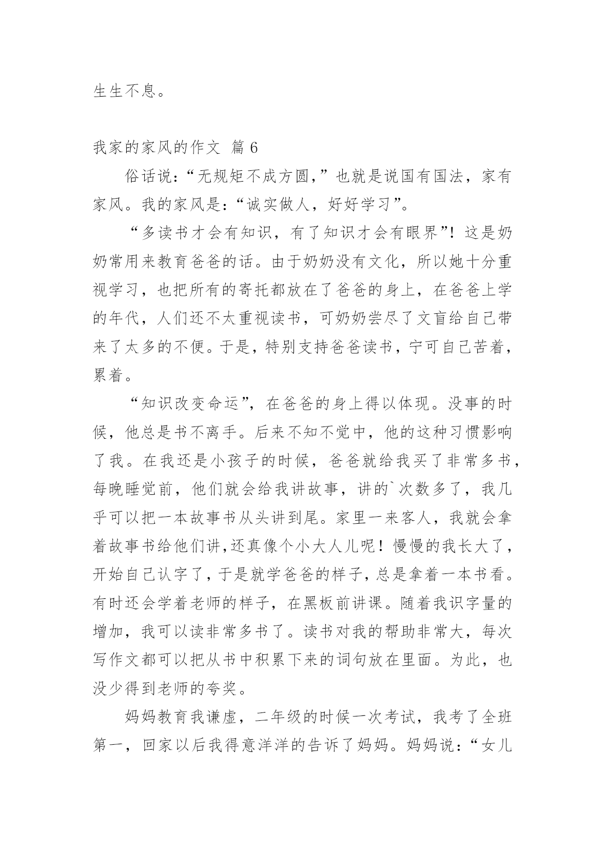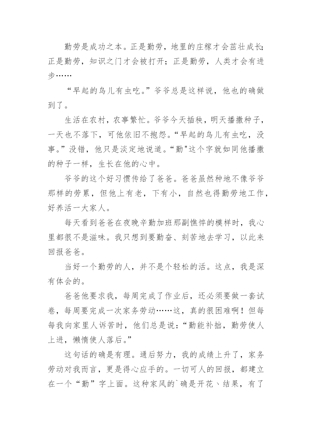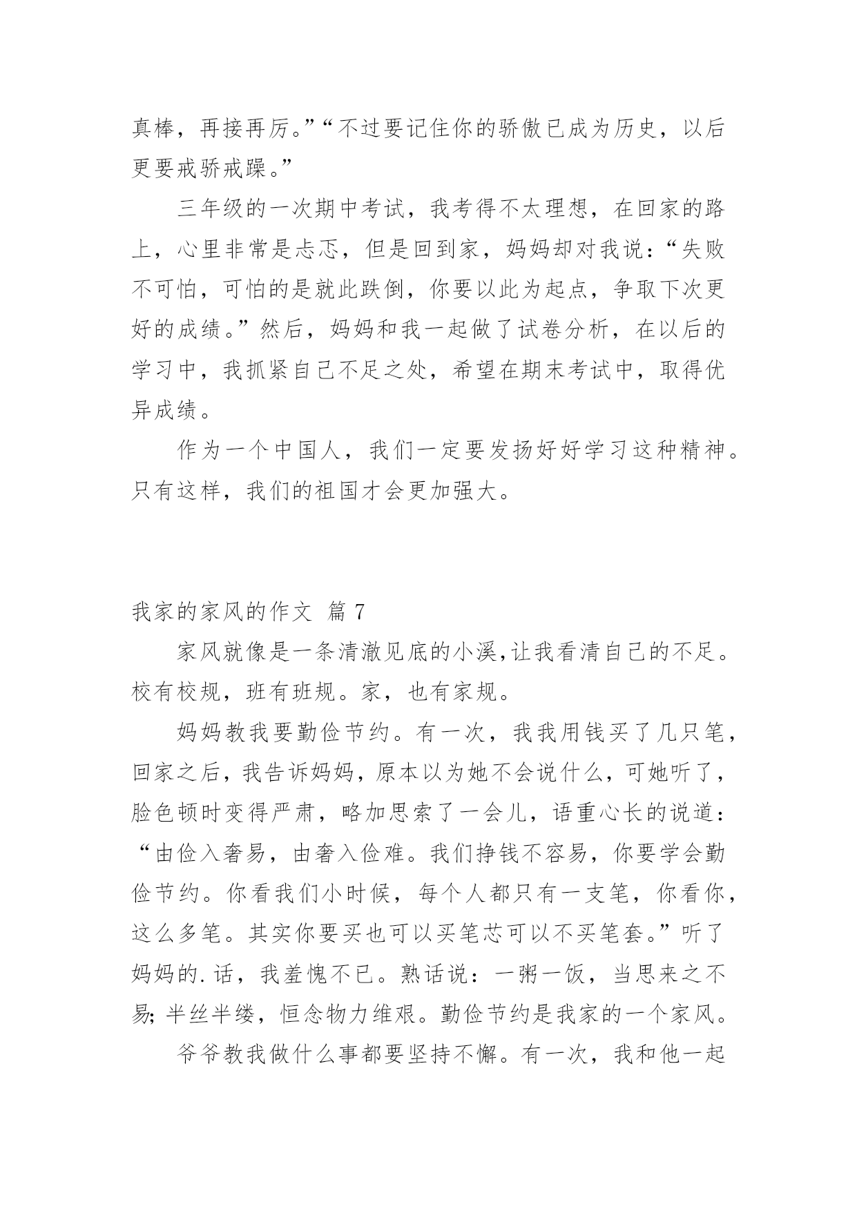 我家的家风的作文我家的家风的作文(范例10篇)无论是身处学校还是步入社会,大家或多或少都会接触过作文吧,作文根据体裁的不同可以分为记叙文、说明文、应用文、议论文。你所见过的作文是什么样的呢?以下是小编帮大家整理的我家的家风的作文10篇,仅供参考,大家一起来看看吧。我家的家风的作文篇1中国,自古以来就是一个文明礼仪之邦。五千年的悠久历史让每个家庭都有了各自的家风家规。古有孟母三迁,岳母刺字等至今仍旧脍炙人口的有关家庭风气的故事。而今,我所在的家庭虽然只是一个普通的小家庭,却也有着自己的家风。多交朋友,严于律已,宽以待人是我家的家风。爸爸妈妈总是鼓励我广泛交友,多和不同年龄段的人交往。在与人相处时,又常常给我讲一些古今中外宽厚待人的故事。父母让我懂得:只有以宽容之心对待别人,才能得到别人的真心相待。当我刚刚懂事的`时候,妈妈就经常用孔子的话“不与小人同坐”来教导我。妈妈说多交朋友是好的,但不要和品德不好的人交朋友。孔子对待品德不好的人连坐在一起都不愿意,何况是交朋友呢?妈妈还告诉我“近朱者赤,近墨者黑”与品德不好的人交往会受到不好的影响,与品德高尚的人交往,时间久了,自己的品德也会得到提升。守时诚信,互相尊重是我家的家风。我从来不允许自己上学迟到,同时我要求自己讲诚信,答应别人的事一定去办。在我家,爸爸妈妈很尊重我,把我这个小孩子的地位提高了不少,家里的事情我也可以参与讨论,提出自己的意见,这让我自豪不已。这也让我学会了尊重别人,要听取别人的意见才能做出正确的判断。多读书,好学习,尊敬长辈是我家的家风。我坚持每周去图书馆看书,读书后要还做笔记,写心得。多读书才会有知识,有了知识才会有眼界。妈妈时时不忘父母的养育之恩,为我树立了尊老爱幼的好榜样。无论工作多忙,妈妈都会抽出时间带着我看望姥姥姥爷,陪姥姥姥爷说说话,做做家务。于是,我渐渐明白了尊敬长辈的含义:对于成年人来说,尊敬长辈不是给父母锦衣玉食,而是愿意在百忙之中抽出一点时间常回家看看。对于小小年纪的我而言,尊敬长辈就是帮妈妈洗几次碗,帮爸爸端上一盆洗脚水这么简单。树立端正的家风,继承优秀的家规和家训,是值得弘扬的民族文化。如今社会一些不良习气已逐渐退出人们的视线,“正能量”得以传递,如果再加上优良家风的弘扬,那我们社会的风气将会更加纯洁,人民的生活将会更加美好,国家的未来将会更加繁荣昌盛!我家的家风的作文篇2“勤”是我家的家风。勤劳是成功之本。正是勤劳,地里的庄稼才会茁壮成长;正是勤劳,知识之门才会被打开;正是勤劳,人类才会有进步……“早起的鸟儿有虫吃。”爷爷总是这样说,他也的确做到了。生活在农村,农事繁忙。爷爷今天插秧,明天播撒种子,一天也不落下,可他依旧不抱怨。“早起的鸟儿有虫吃,没事。”没错,他只是淡定地说道。“勤"这个字就如同他播撒的种子一样,生长在他的心中。爷爷的这个好习惯传给了爸爸。爸爸虽然种地不像爷爷那样的劳累,但他上有老,下有小,自然也得勤劳地工作,好养活一大家人。每天看到爸爸在夜晚辛勤加班那副憔悴的模样时,我心里都很不是滋味。我只想到要勤奋、刻苦地去学习,以此来回报爸爸。当好一个勤劳的人,并不是个轻松的活。这点,我是深有体会的。爸爸他要求我,每周完成了作业后,还必须要做一套试卷,每周要完成一次家务劳动……这,真的很困难啊!但每每我向家里人诉苦时,他们总是说:“勤能补拙,勤劳使人上进,懒惰使人落后。”这句话的确是有理。通后努力,我的成绩上升了,家务劳动对我而言,更是得心应手的。一切可人的回报,都建立在一个“勤”字上面。这种家风的`确是开花丶结果,有了收成的。我家的家风“勤”,虽只从我爷爷那辈传下来,只有几十年,但它对我们家却是一个不容小觑的存在。我家的家风的作文篇3提起我的家风,那就是四个字“严谨、诚实”。小时候妈妈一直教导我做事要严谨,不要粗心大意。有一次我把一道非常简单的数学题抄到家庭作业上抄错了。妈妈说:“你一定要重视这个坏习惯,生活中,粗心经常会造成一些重大事故,你没听说过吗?就如一个工程师只要有一点点粗心,就会使房屋倒塌;一个医生只要有一点点粗心,就会引起重大医疗事故。”我听了不好意思地低下头,小声地说“妈妈,我知道错了,以后做事一定会严谨,再也不粗心大意了。”妈妈还教导我要诚实。记得有一次,我在院子里踢足球,一不小心打坏了一辆车子的挡风玻璃,当时我吓愣了,直接跑回家去。这时爸爸看到气喘吁吁的我,问:“刚才是不是你把人家车的挡风玻璃打碎了呀?”我战战兢兢地回答道:“爸爸,是我在院子里踢足球的'时候不小心把玻璃给撞坏了。”爸爸竟然没有责怪我,却对我说道:“虽然你打坏了挡风玻璃,但你没有说一句假话。你要记住一个人做错了事不可怕,只要及时承认错误并勇敢地承担后果,就不算犯错。孩子就是在做错事情的过程中成长起来的。”后来爸爸带着我找到车主道了歉并赔钱。这就