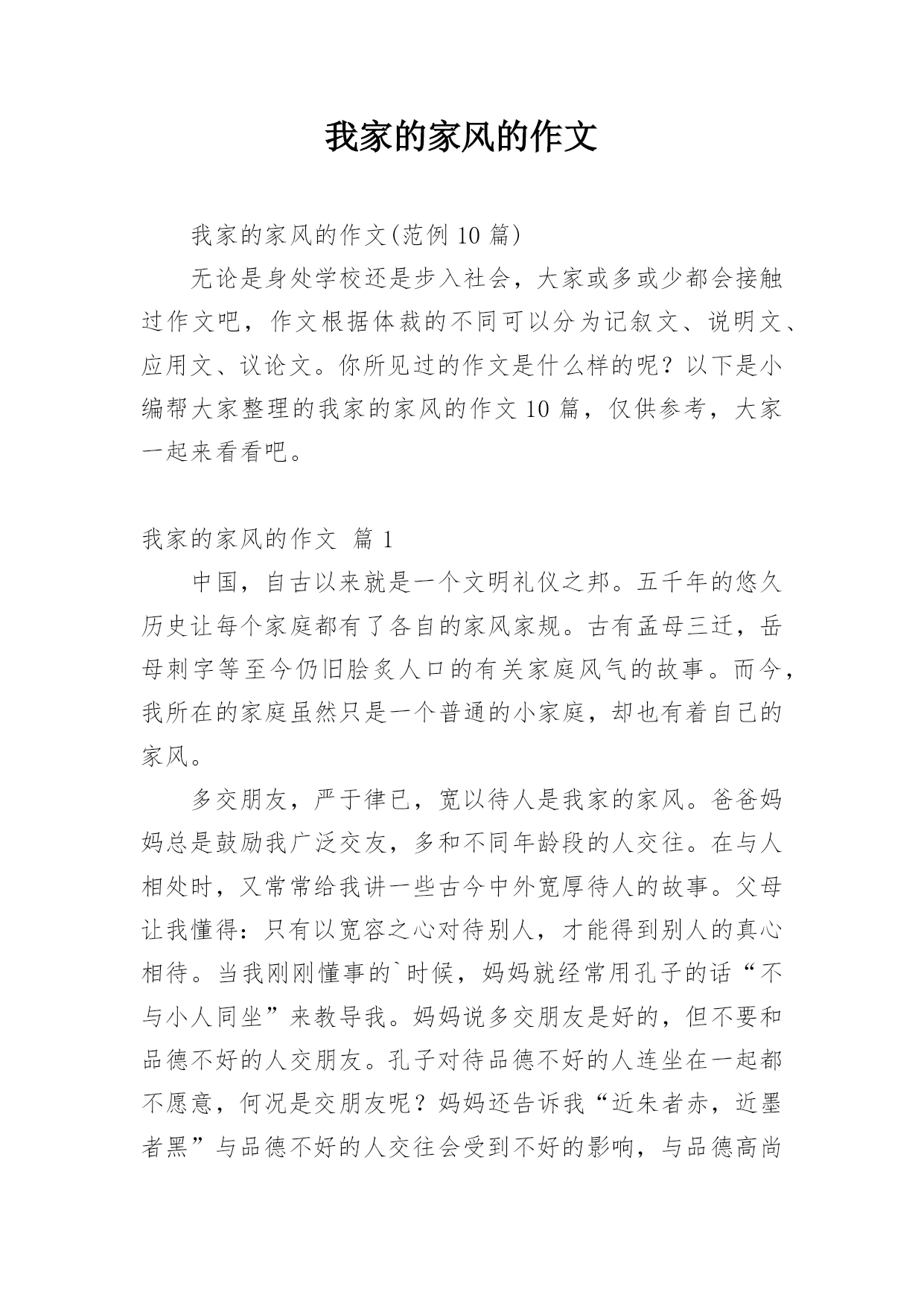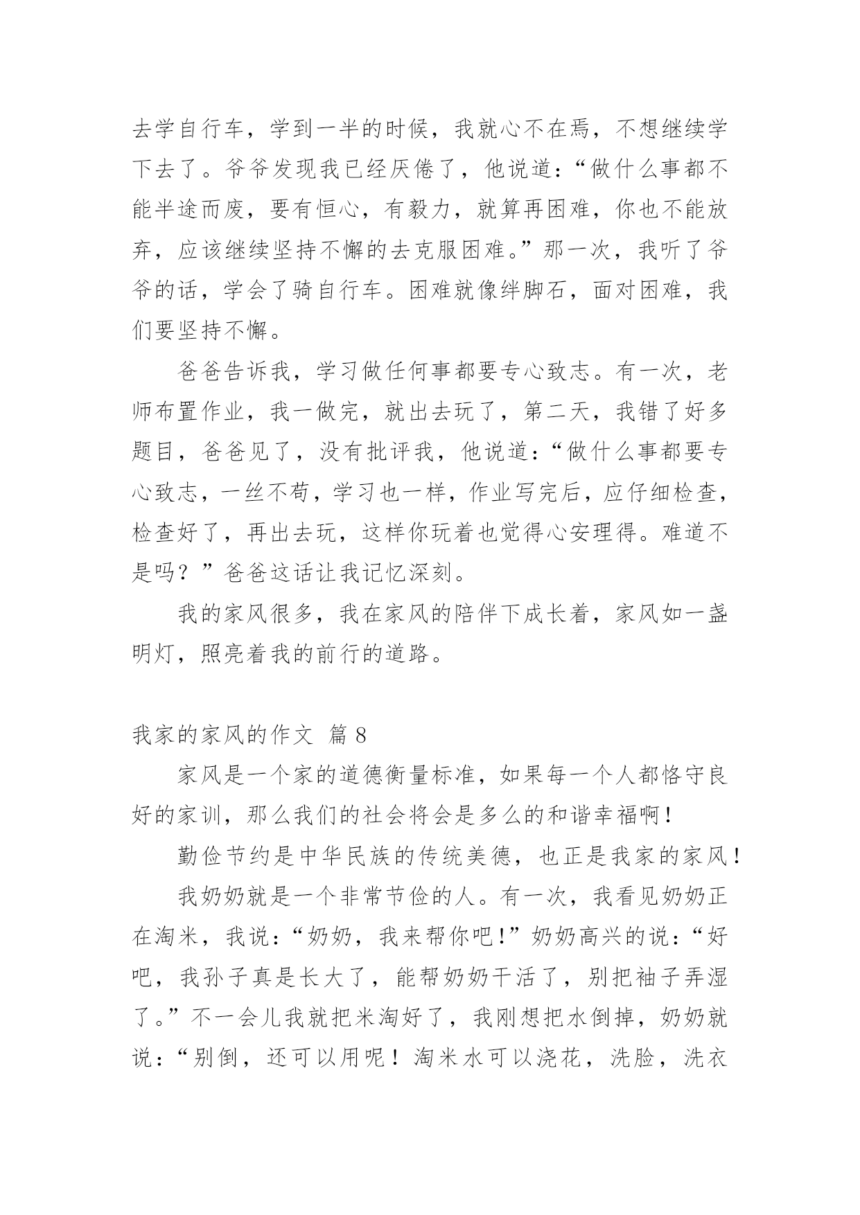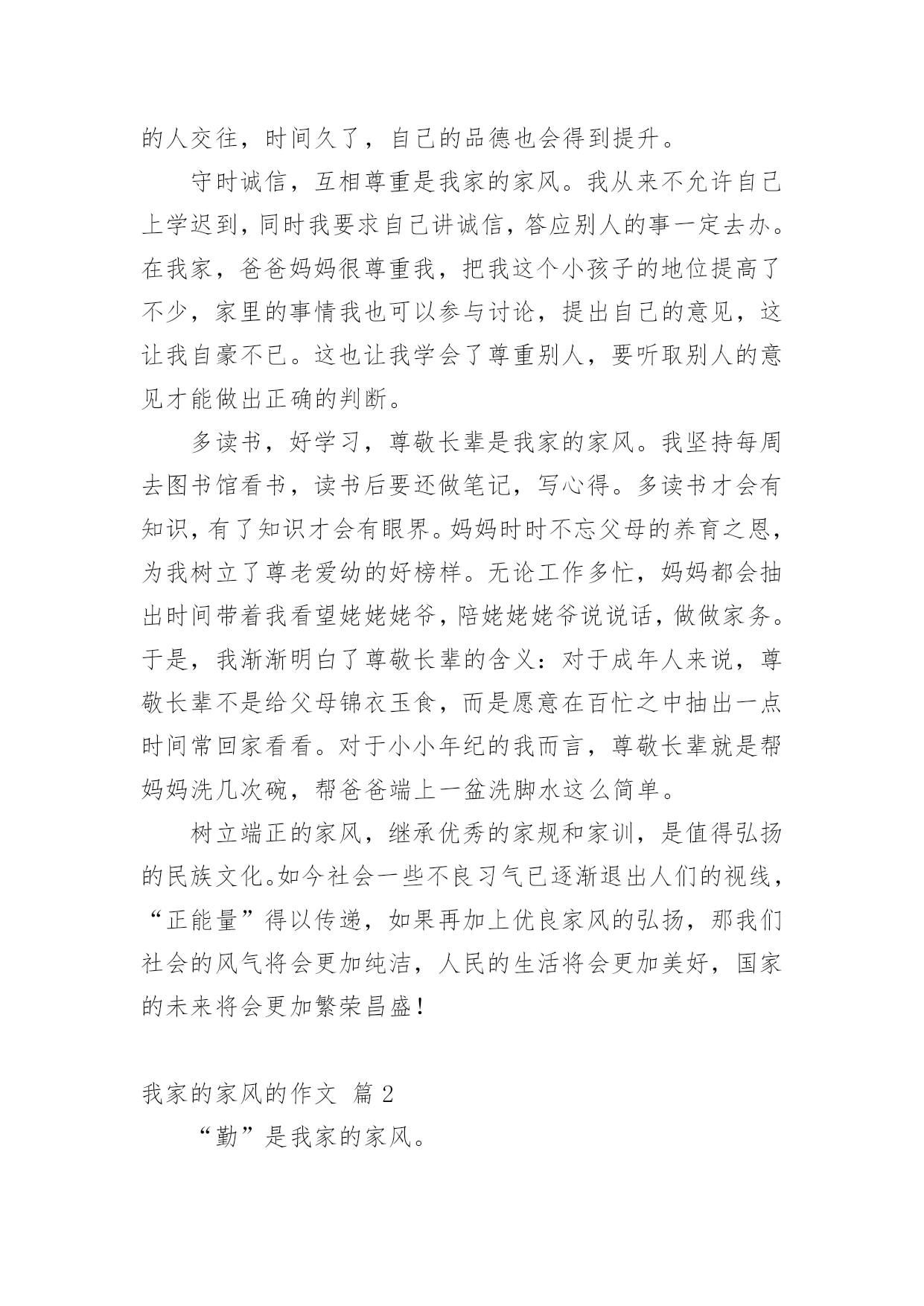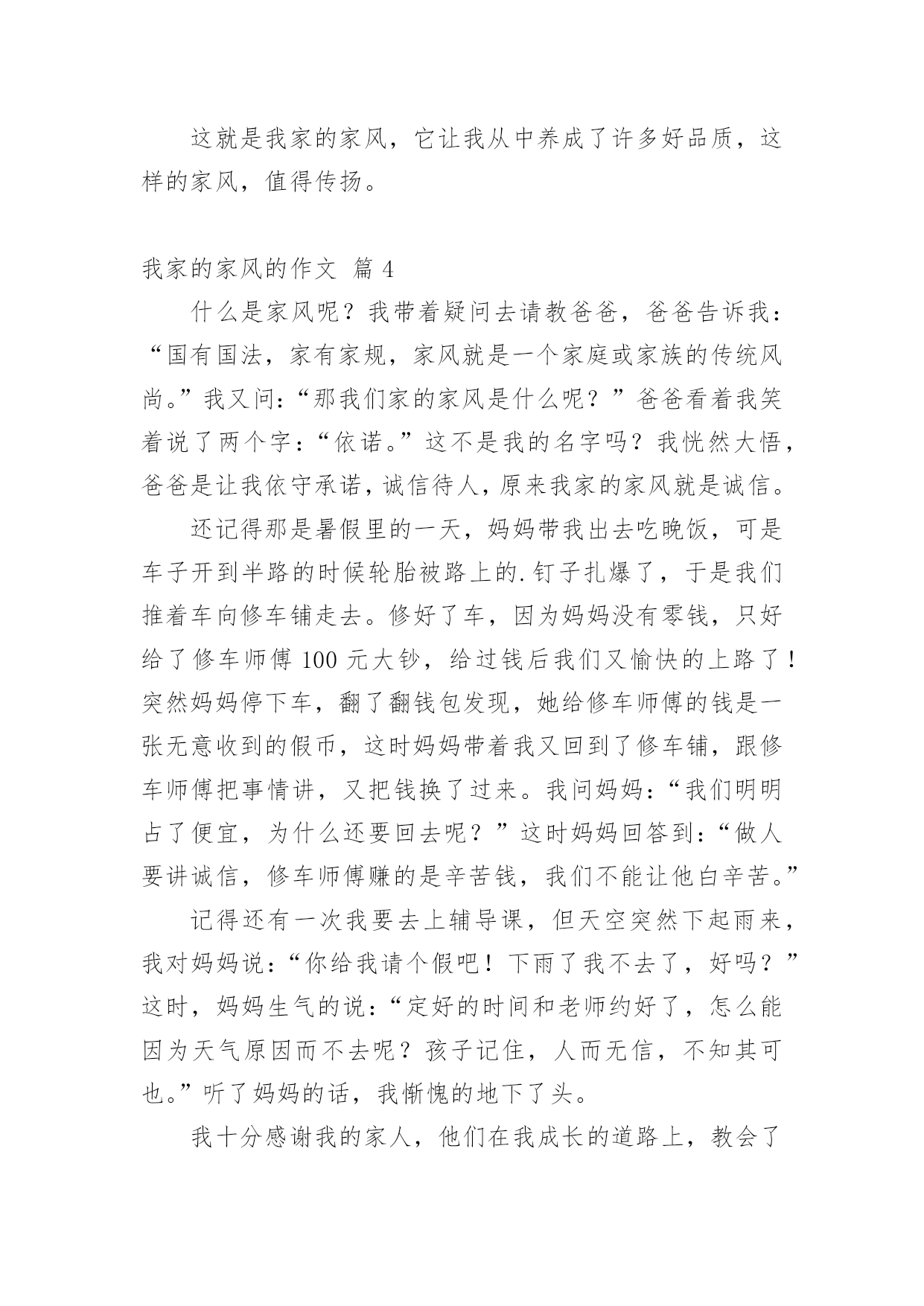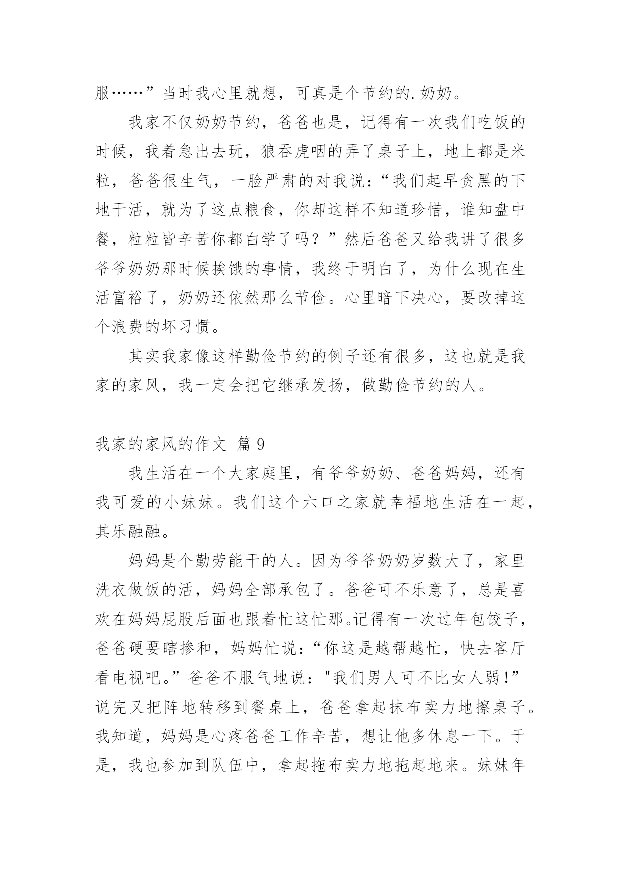 我家的家风的作文我家的家风的作文(范例10篇)无论是身处学校还是步入社会,大家或多或少都会接触过作文吧,作文根据体裁的不同可以分为记叙文、说明文、应用文、议论文。你所见过的作文是什么样的呢?以下是小编帮大家整理的我家的家风的作文10篇,仅供参考,大家一起来看看吧。我家的家风的作文篇1中国,自古以来就是一个文明礼仪之邦。五千年的悠久历史让每个家庭都有了各自的家风家规。古有孟母三迁,岳母刺字等至今仍旧脍炙人口的有关家庭风气的故事。而今,我所在的家庭虽然只是一个普通的小家庭,却也有着自己的家风。多交朋友,严于律已,宽以待人是我家的家风。爸爸妈妈总是鼓励我广泛交友,多和不同年龄段的人交往。在与人相处时,又常常给我讲一些古今中外宽厚待人的故事。父母让我懂得:只有以宽容之心对待别人,才能得到别人的真心相待。当我刚刚懂事的`时候,妈妈就经常用孔子的话“不与小人同坐”来教导我。妈妈说多交朋友是好的,但不要和品德不好的人交朋友。孔子对待品德不好的人连坐在一起都不愿意,何况是交朋友呢?妈妈还告诉我“近朱者赤,近墨者黑”与品德不好的人交往会受到不好的影响,与品德高尚的人交往,时间久了,自己的品德也会得到提升。守时诚信,互相尊重是我家的家风。我从来不允许自己上学迟到,同时我要求自己讲诚信,答应别人的事一定去办。在我家,爸爸妈妈很尊重我,把我这个小孩子的地位提高了不少,家里的事情我也可以参与讨论,提出自己的意见,这让我自豪不已。这也让我学会了尊重别人,要听取别人的意见才能做出正确的判断。多读书,好学习,尊敬长辈是我家的家风。我坚持每周去图书馆看书,读书后要还做笔记,写心得。多读书才会有知识,有了知识才会有眼界。妈妈时时不忘父母的养育之恩,为我树立了尊老爱幼的好榜样。无论工作多忙,妈妈都会抽出时间带着我看望姥姥姥爷,陪姥姥姥爷说说话,做做家务。于是,我渐渐明白了尊敬长辈的含义:对于成年人来说,尊敬长辈不是给父母锦衣玉食,而是愿意在百忙之中抽出一点时间常回家看看。对于小小年纪的我而言,尊敬长辈就是帮妈妈洗几次碗,帮爸爸端上一盆洗脚水这么简单。树立端正的家风,继承优秀的家规和家训,是值得弘扬的民族文化。如今社会一些不良习气已逐渐退出人们的视线,“正能量”得以传递,如果再加上优良家风的弘扬,那我们社会的风气将会更加纯洁,人民的生活将会更加美好,国家的未来将会更加繁荣昌盛!我家的家风的作文篇2“勤”是我家的家风。勤劳是成功之本。正是勤劳,地里的庄稼才会茁壮成长;正是勤劳,知识之门才会被打开;正是勤劳,人类才会有进步……“早起的鸟儿有虫吃。”爷爷总是这样说,他也的确做到了。生活在农村,农事繁忙。爷爷今天插秧,明天播撒种子,一天也不落下,可他依旧不抱怨。“早起的鸟儿有虫吃,没事。”没错,他只是淡定地说道。“勤"这个字就如同他播撒的种子一样,生长在他的心中。爷爷的这个好习惯传给了爸爸。爸爸虽然种地不像爷爷那样的劳累,但他上有老,下有小,自然也得勤劳地工作,好养活一大家人。每天看到爸爸在夜晚辛勤加班那副憔悴的模样时,我心里都很不是滋味。我只想到要勤奋、刻苦地去学习,以此来回报爸爸。当好一个勤劳的人,并不是个轻松的活。这点,我是深有体会的。爸爸他要求我,每周完成了作业后,还必须要做一套试卷,每周要完成一次家务劳动……这,真的很困难啊!但每每我向家里人诉苦时,他们总是说:“勤能补拙,勤劳使人上进,懒惰使人落后。”这句话的确是有理。通后努力,我的成绩上升了,家务劳动对我而言,更是得心应手的。一切可人的回报,都建立在一个“勤”字上面。这种家风的`确是开花丶结果,有了收成的。我家的家风“勤”,虽只从我爷爷那辈传下来,只有几十年,但它对我们家却是一个不容小觑的存在。我家的家风的作文篇3提起我的家风,那就是四个字“严谨、诚实”。小时候妈妈一直教导我做事要严谨,不要粗心大意。有一次我把一道非常简单的数学题抄到家庭作业上抄错了。妈妈说:“你一定要重视这个坏习惯,生活中,粗心经常会造成一些重大事故,你没听说过吗?就如一个工程师只要有一点点粗心,就会使房屋倒塌;一个医生只要有一点点粗心,就会引起重大医疗事故。”我听了不好意思地低下头,小声地说“妈妈,我知道错了,以后做事一定会严谨,再也不粗心大意了。”妈妈还教导我要诚实。记得有一次,我在院子里踢足球,一不小心打坏了一辆车子的挡风玻璃,当时我吓愣了,直接跑回家去。这时爸爸看到气喘吁吁的我,问:“刚才是不是你把人家车的挡风玻璃打碎了呀?”我战战兢兢地回答道:“爸爸,是我在院子里踢足球的'时候不小心把玻璃给撞坏了。”爸爸竟然没有责怪我,却对我说道:“虽然你打坏了挡风玻璃,但你没有说一句假话。你要记住一个人做错了事不可怕,只要及时承认错误并勇敢地承担后果,就不算犯错。孩子就是在做错事情的过程中成长起来的。”后来爸爸带着我找到车主道了歉并赔钱。这就
