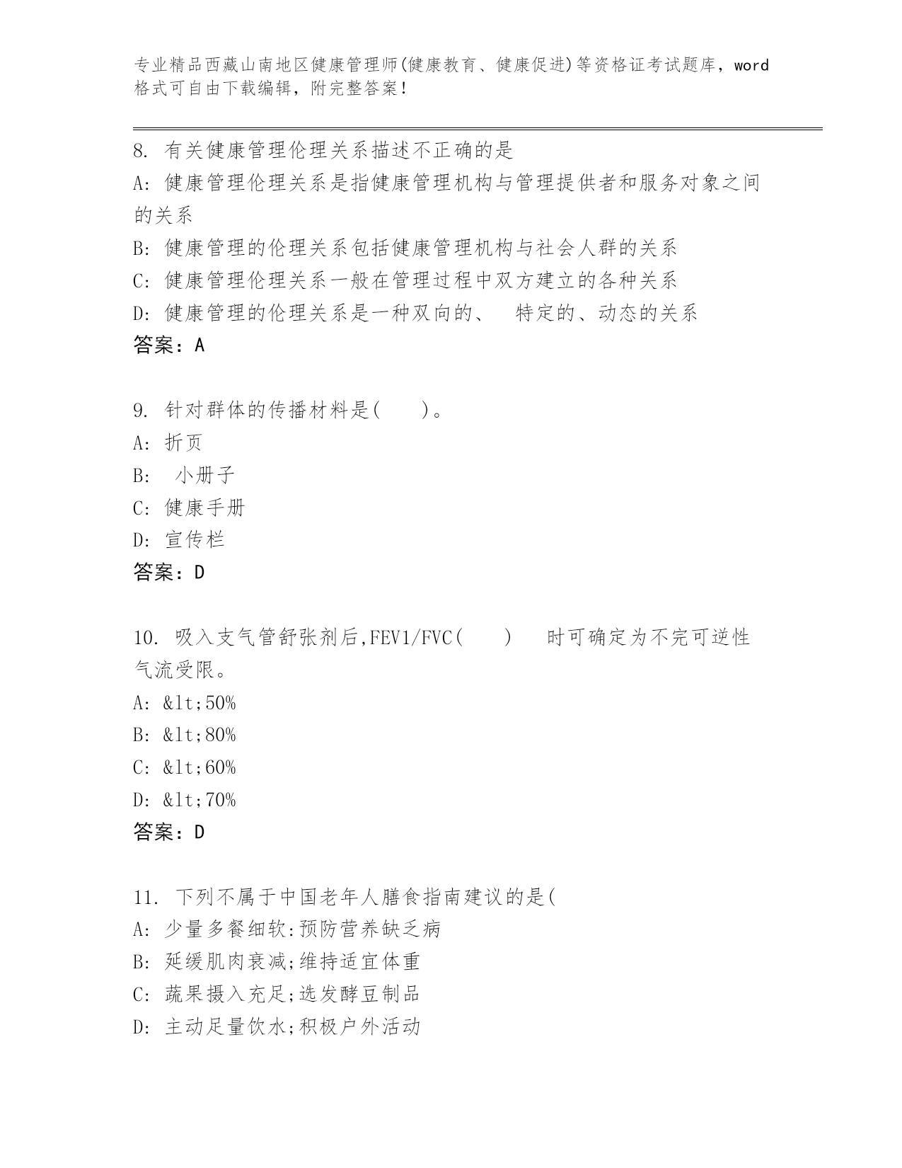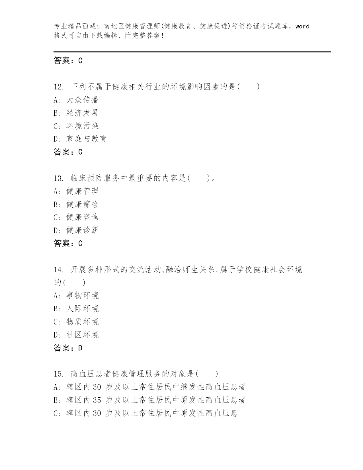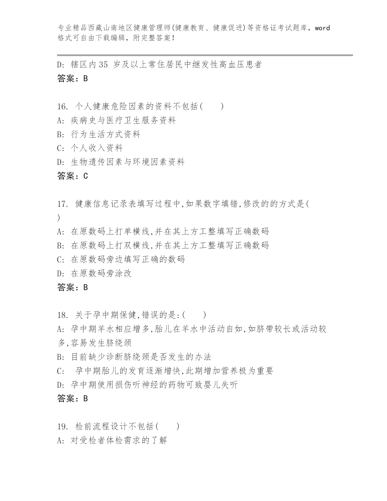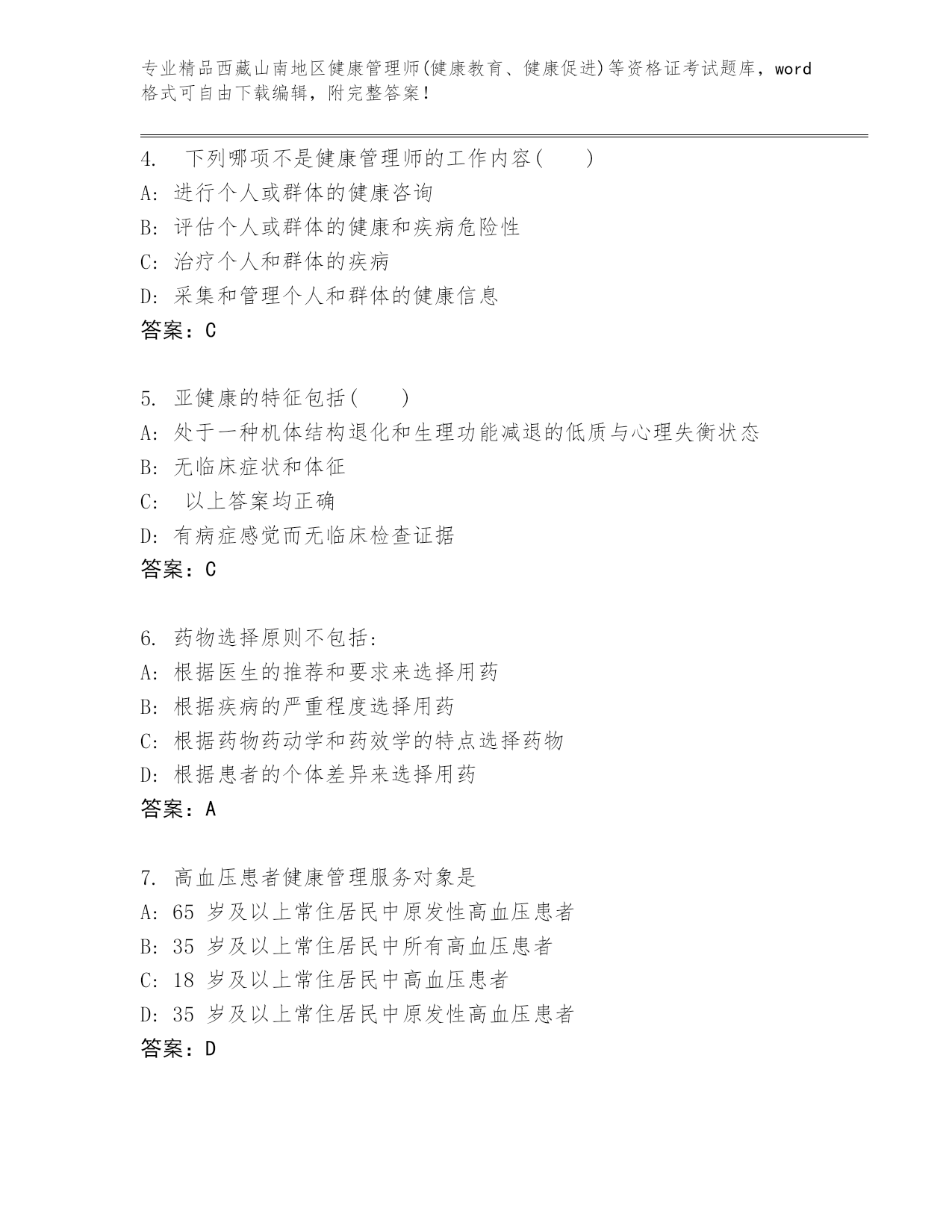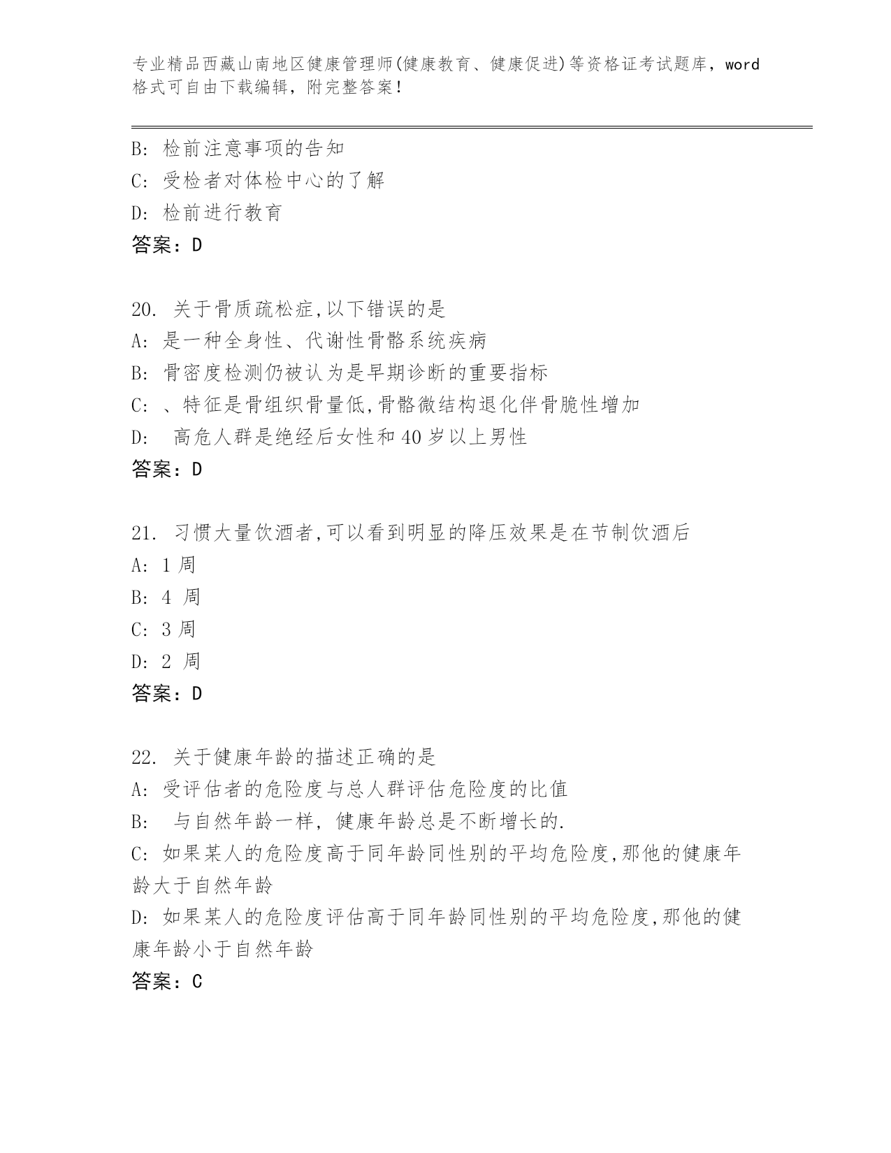 精品西藏山南地区健康管理师(健康教育、健康促进)等资格证考试通用题库含答案(培优A卷)