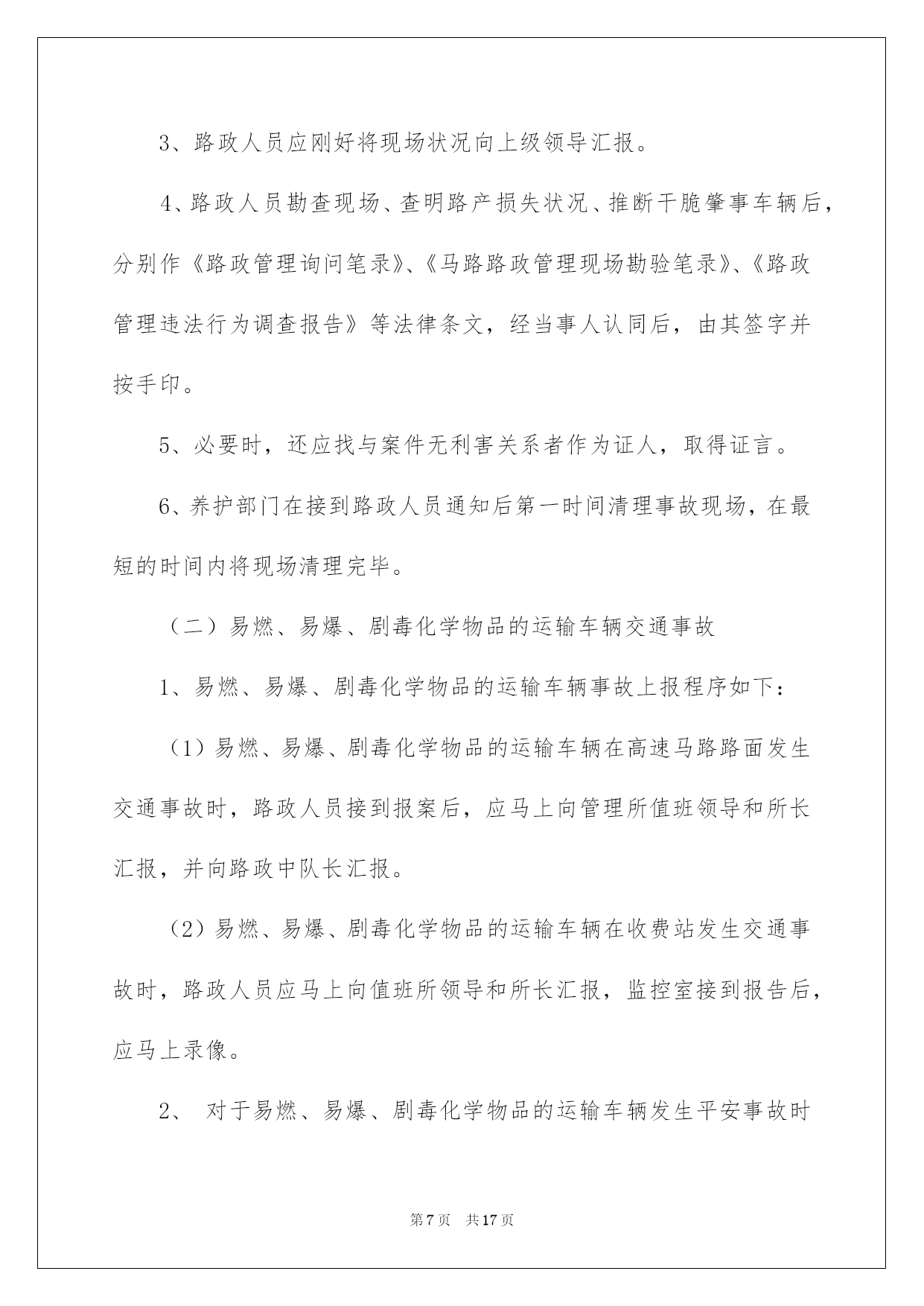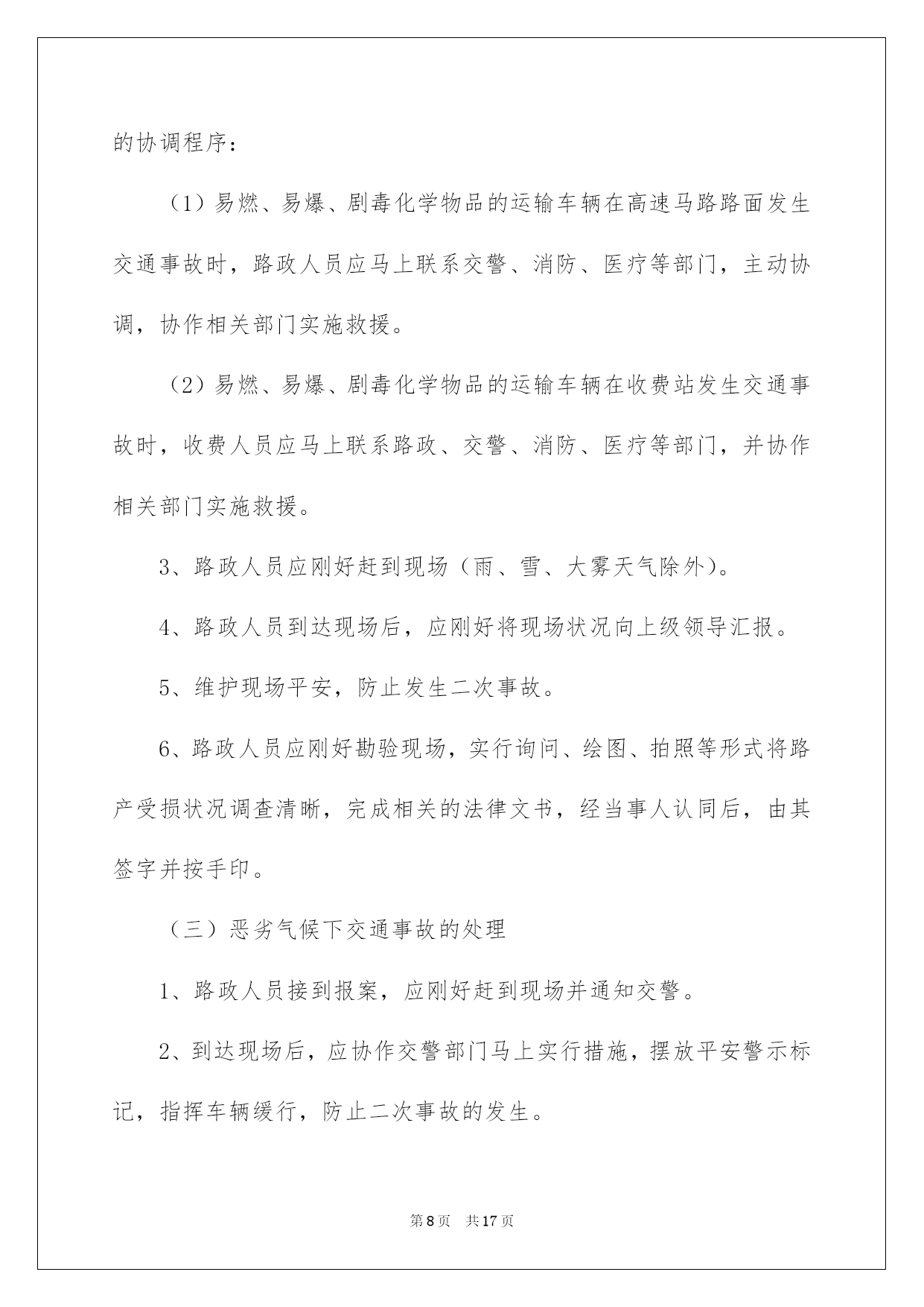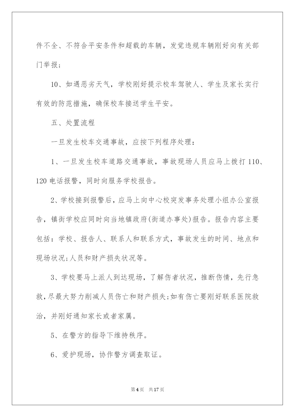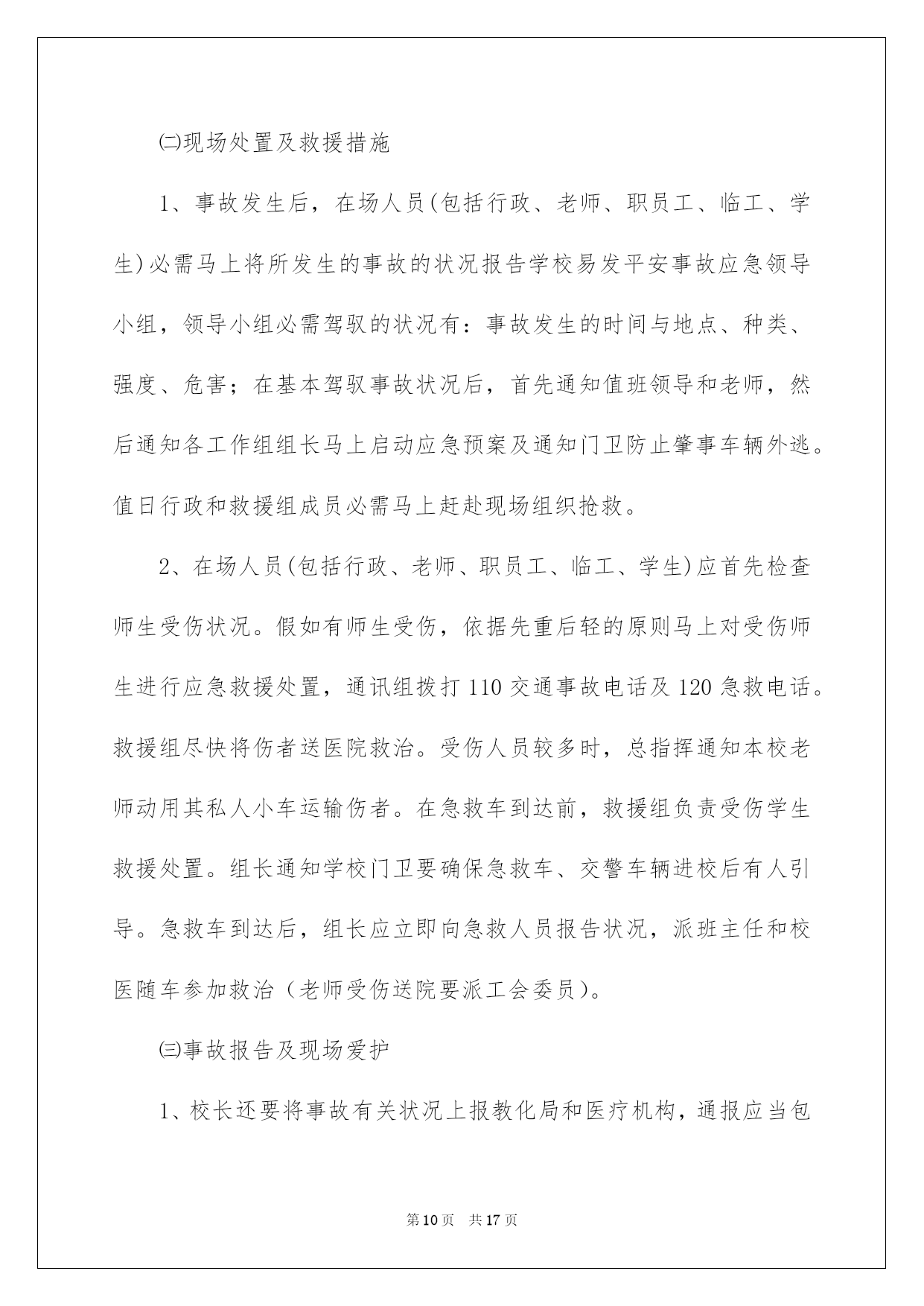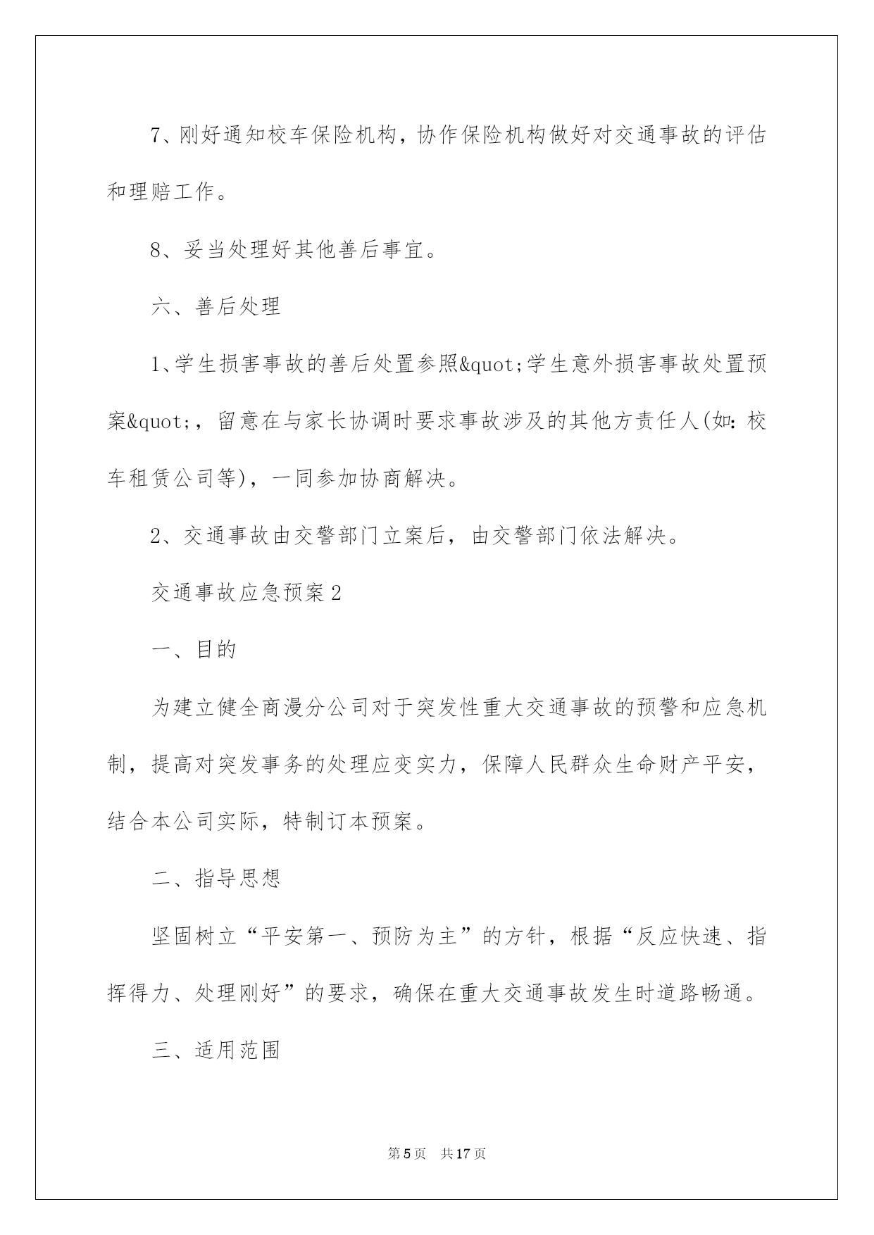 第PAGE\*Arabic\*MERGEFORMAT17页共NUMPAGES\*Arabic\*MERGEFORMAT17页第PAGE\*MERGEFORMAT17页共NUMPAGES\*MERGEFORMAT17页第PAGE\*MERGEFORMAT17页共NUMPAGES\*MERGEFORMAT17页第PAGE\*MERGEFORMAT17页共NUMPAGES\*MERGEFORMAT17页第PAGE\*MERGEFORMAT17页共NUMPAGES\*MERGEFORMAT17页第PAGE\*MERGEFORMAT17页共NUMPAGES\*MERGEFORMAT17页第PAGE\*MERGEFORMAT17页共NUMPAGES\*MERGEFORMAT17页第PAGE\*MERGEFORMAT17页共NUMPAGES\*MERGEFORMAT17页第PAGE\*MERGEFORMAT17页共NUMPAGES\*MERGEFORMAT17页第PAGE\*MERGEFORMAT17页共NUMPAGES\*MERGEFORMAT17页第PAGE\*MERGEFORMAT17页共NUMPAGES\*MERGEFORMAT17页2022交通事故应急预案交通事故应急预案在现实生活或工作学习中,难免会面对无法预料的突发事务,为了可以第一时间作出应急响应,经常要依据详细状况预先编制应急预案。应急预案要怎么编制呢?下面是我收集整理的物业公司交通事故应急预案(精选5篇),欢迎大家借鉴与参考,希望对大家有所帮助。交通事故应急预案1一、指导思想为加强校车运行监督管理,防范校车道路交通事故,确保乘车学生人身平安,依据国务院《校车平安管理条例》以及诸城市人民政府《接送学生车辆配备管理实施方案》、《关于成立校车管理工作委员会的通知》等有关文件,制定本方案。二、适用范围适用于发生在接送学生途中(有学生在车上)的校车交通事故。三、组织机构1、学校成立学生宿舍事故应急处理小组,由学校分管领导负责协调指挥,包括:人员救援组、疏散引导组、通讯联络组、沟通协调组。要求责任落实到详细人员。2、人员救援组负责为受伤学生供应刚好有效的救援,并在第一时间就近送至区级以上医院;疏散引导组负责疏散其他学生;通讯联络组负责对内对外的联络汇报工作;沟通协调组负责与家长的沟通协调安抚工作、与交警部门、校车租赁公司的沟通协调等工作。四、预警预防(一)、分析可能引发事故的缘由1、环境因素,如大雾、雨雪等恶劣天气,或道路湿滑等;2、未按时进行平安技术检验或日常检修维护不到位,导致校车平安技术条件不达标;3、没有校车驾驶资格的人员驾驶校车;4、校车驾驶人未遵守道路交通平安法律法规,未严格根据机动车道路通行规则和驾驶操作规范驾驶;5、校车驾驶人员素养不高,平安意识淡薄,追逐利益忽视平安,超速超员运营,不按规定路途行驶,酒后驾车等;6、未配备随车照管人员,或随车照管人员未仔细履行职责;7、学生、家长交通平安意识不强,交通平安学问不足;8、其他可能造成校车道路交通事故的缘由。(二)、实行针对性的预防措施1、校车应经教化、公安、交通等部门审批备案,取得校车运用许可,办理校车标牌,每半年进行一次机动车平安技术检验;2、校车车主按规定做好校车的平安维护,建立平安维护档案,保证校车处于良好技术状态;3、驾驶员必需为取得校车驾驶资格的驾驶人,思想素养好,平安意识强;4、校车驾驶人应当遵守道路交通平安法律法规,严格根据机动车道路通行规则和驾驶操作规范平安驾驶、文明驾驶;5、校车载人不得超过核定的人数,不得以任何理由超员;6、校车驾驶人严禁酒后驾驶校车;7、严格按规定路途行驶,严禁随意变更行车路途;8、照管人员应随校车全程照管乘车学生,仔细履行职责;9、学校要加强对学生的乘车平安教化,坚决不乘坐拼装车、报废车、外地机动车、货运汽车、三轮汽车、拖拉机等违规车辆及其他证件不全、不符合平安条件和超载的车辆,发觉违规车辆刚好向有关部门举报;10、如遇恶劣天气,学校刚好提示校车驾驶人、学生及家长实行有效的防范措施,确保校车接送学生平安。五、处置流程一旦发生校车交通事故,应按下列程序处理:1、一旦发生校车道路交通事故,事故现场人员应马上拨打110、120电话报警,同时向服务学校报告。2、学校接到报警后,应马上向中心校突发事务处理小组办公室报告,镇街学校应同时向当地镇政府(街道办事处)报告。报告内容主要包括:学校、报告人、联系人和联系方式,事故发生的时间、地点和现场状况;人员和财产损失状况等。3、学校要马上派人到达现场,了解伤者状况,推断伤情,先行急救,尽最大努