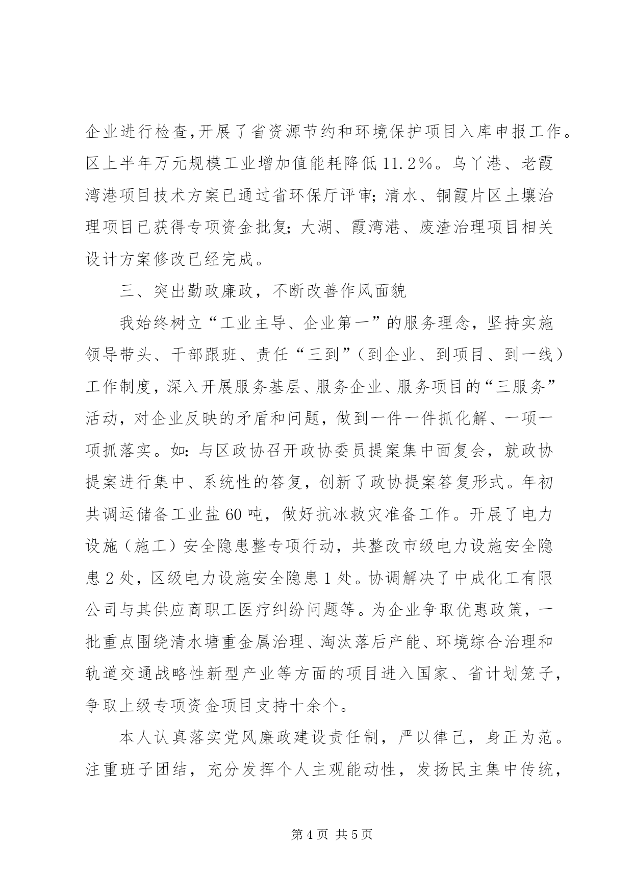 第PAGE\*Arabic\*MERGEFORMAT5页共NUMPAGES\*MERGEFORMAT5页最新公务员上半年述职报告下面是我们文秘114的小编给大家推荐的最新公务员上半年述职报告供大家参阅。xxxx年上半年,在区委、区政府的正确领导下,在区人大和区政协的监督支持下,我团结带领全局一班人,以深入推进“能力建设年”活动为抓手,围绕“两个率先”、“四个翻番”的总目标,开拓创新,扎实工作,坚持不懈地夯基础、调结构、兴产业、优服务,加速推进新型工业化,加快经济发展方式转变步伐,促进了全区工业经济的良性发展。现述职汇报如下。一、突出学习教育,不断提高政治素养一是加强理论学习。始终把学习作为提高自身素养、完善自我的首要任务。认真学习党的xxxx大会议精神、马列主义、毛泽东思想、邓小平理论和“三个代表”重要思想;自觉学习新形势下党的执政理论和方针、政策,对党的执政基础、执政方式、执政目标、执政路线有深刻认识;自觉学习有关法律法规、业务知识,增强了决策的科学性和民主性,为今后开展工作提供了丰富的知识储备和理论基础。二是深入调查研究。落实区委“五个一”文件精神,带领局一班子开展“深入企业、深入项目”走访调研活动,与xxxx社区、xxxx、xxxx等企业面对面交流探讨,共收集问题36个,目前大部分已得到解决。5月初迎接了国家发改委及中咨公司来区现场核查,进一步完善《xxxx老工业区搬迁改造实施方案》,并上报国家发改委,目前正在根据专家意见进一步修改方案。我还利用学习、考察等机会,到外省、先进县市区和企业进行调研,学习和借鉴先进经验。接待了市人大副主席xxxx一行对我区中小企业发展的调研、参与了区委、区政府组织的的对我区轨道交通产业发展形势的调研,以及市园区办、市经委、其它县(市)区等部门的各类调研等,撰写了汇报材料。二、突出履职服务,不断增强工作能力(一)全心全力保增长xxxx年,我局进一步完善了全区重点工业企业跟踪服务机制,不断强化重点工业企业的运行监测,定期分析研究企业生产运行情况,把握发展态势,确保工业经济基本稳定。加强对重点企业点对点服务,及时了解掌握企业开工建设和生产经营中碰到的困难和问题,想方设法帮助解决,促进工业经济平稳增长。1-6月,全区完成规模工业总产值338.9亿元,同比增长3.7%,完成规模工业增加值108.8亿元,同比增长5%,完成工业固定资产投资35.7亿元,同比增长31.8%。xxxx2年度获全省新型工业化考核第4名,全市新型工业化考核一等奖。对xxxx2年度全区新型工业化先进单位、优秀企业和优秀企业统计部门进行了表彰。(二)建设项目增后功加快征拆力度,加速项目落地开工建设,一批园区产业项目、基础设施项目、环境治理项目全面实施,加快推进。今年主要抓好南车株洲所igbt产业化一期项目、标准厂房、田林路一期、田心高科园路网一期、铜霞路二期等项目的开工建设;顺利完成了株机磁悬浮和erp项目、株所变流器产业化提升、九方装备新基地建设、株冶锌浸出直接炼铅等项目的竣工投产;加快推进了清水塘地区霞湾港、大湖、废渣治理工程。投资额xxxx0万元以上的产业开工项目13个,竣工项目14个。(三)企业改制添活力全区改革领导小组办公室设在我局,我兼任办公室主任。目前,市建陶总厂、市xxxx泥厂、市中亚人造板厂职工安置工作已基本完成,市啤酒厂今年上半年已启动职工安置工作,其他企业职工安置方案、改制资金筹措等安置前期启动准备工作进展顺利。共筹措改革资金2亿余元,安置职工1252人,实现结余8000多万元,取得较好的经济和社会效益。同时抓好改制企业信访维稳工作,接待上访职工30余批次,回复市长热线投诉5个、处理应急事件3起,确保了企业改革稳定和安定。(四)环境治理有成效制定了xxxx年工业节能工作方案和淘汰落后产能计划。做好xxxx2年度国家淘汰落后产能专项资金核查工作、国家关闭小企业专项资金审核拨付工作,落实好27家关停企业补助资金发放,第三批620.72万元已经发放到位。对辖区6家钢铁、铸造企业进行检查,开展了省资源节约和环境保护项目入库申报工作。区上半年万元规模工业增加值能耗降低11.2%。乌丫港、老霞湾港项目技术方案已通过省环保厅评审;清水、铜霞片区土壤治理项目已获得专项资金批复;大湖、霞湾港、废渣治理项目相关设计方案修改已经完成。三、突出勤政廉政,不断改善作风面貌我始终树立“工业主导、企业第一”的服务理念,坚持实施领导带头、干部跟班、责任“三到”(到企业、到项目、到一线)工作制度,深入开展服务基层、服务企业、服务项目的“三服务”活动,对企业反映的矛盾和问题,做到一件一件抓化解、一项一项抓落实。如:与区政协召开政协委员提案集中面复会,就政协提案进行集中、系统性的答复,创新了政协提案答复形式。年初共调运储备