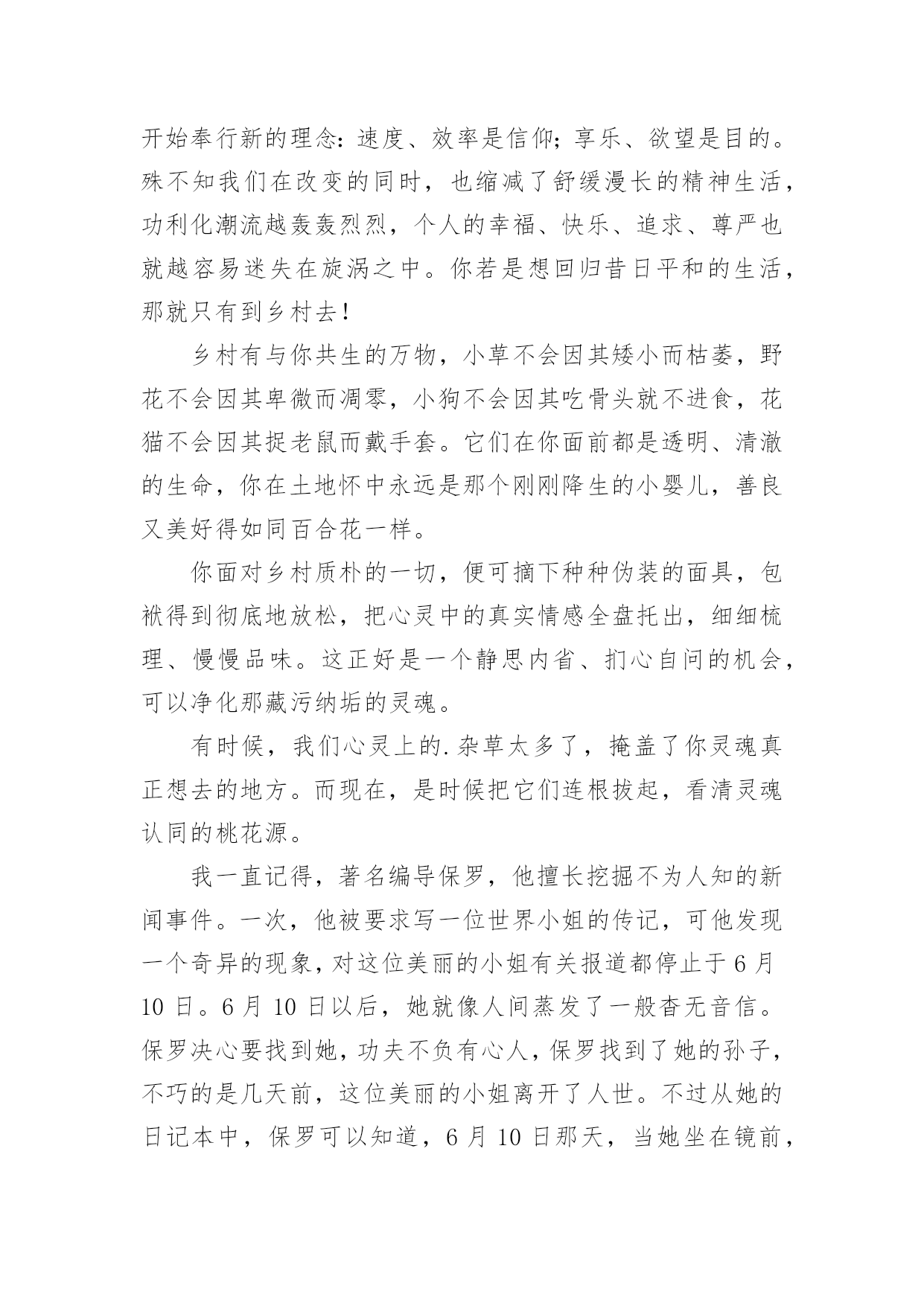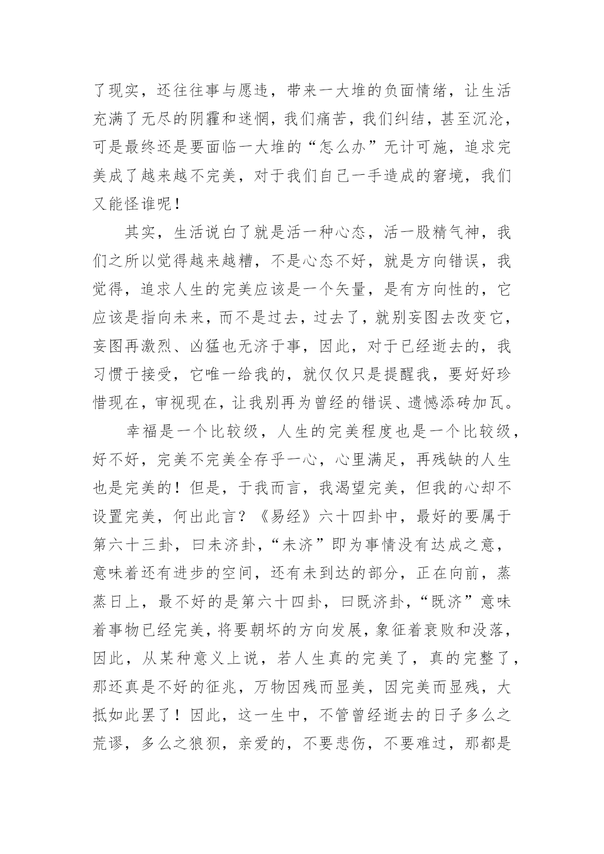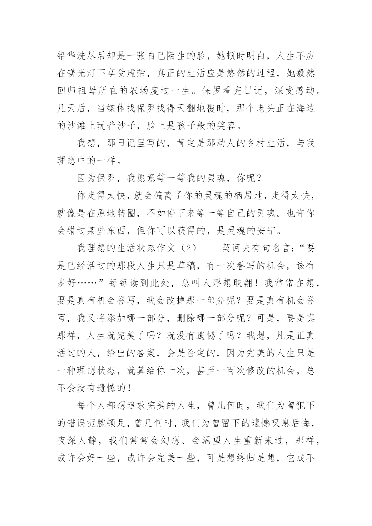 我理想的生活状态作文我理想的生活状态作文导语:我理想的生活比较简单,只能心里能够获得一种简单的幸福就好了。以下是小编为大家整理的我理想的生活状态作文,欢迎大家阅读与借鉴!我理想的生活状态作文(1)我一直向往在乡村生活,自由自在地躺在油菜花田的田埂上,叼着狗尾巴草徜徉一个下午,看门前大狼狗异常警觉地对每个陌生人一脸凶相,在牛背上吹着悠扬的牧笛,在屋顶上出神地望着星星月亮……我想,查理曼大帝是知道田园生活的魅力的,因为当年罗马带着葡萄种子到达高卢的博纳时,发现这里充沛的阳光和肥沃的土地特别适合种植葡萄,于是边种葡萄边酿酒,与当地农民没什么两样。谁知三年后,开拔时,有近半的士兵都留了下来,尽管“罗马征服了世界”,但“博纳征服了罗马”。其实,是心灵的归宿征服了帝王的野心,只有乡村的生活才能亘古长存。我想,“一杯咖啡能喝一天”的希腊人也是同样明白乡村生活的内涵的,他们虽身处都市,却也享受着超然世外的宁静与安逸。保留完好的古迹,星罗棋布的小岛,蔚蓝色的天空下碧绿的水,盛开的鲜花,高大的树木,不是乡村,胜似乡村。我想,大多数人是无法领略那种平和的。现代社会人们开始奉行新的理念:速度、效率是信仰;享乐、欲望是目的。殊不知我们在改变的同时,也缩减了舒缓漫长的精神生活,功利化潮流越轰轰烈烈,个人的幸福、快乐、追求、尊严也就越容易迷失在旋涡之中。你若是想回归昔日平和的生活,那就只有到乡村去!乡村有与你共生的万物,小草不会因其矮小而枯萎,野花不会因其卑微而凋零,小狗不会因其吃骨头就不进食,花猫不会因其捉老鼠而戴手套。它们在你面前都是透明、清澈的生命,你在土地怀中永远是那个刚刚降生的小婴儿,善良又美好得如同百合花一样。你面对乡村质朴的一切,便可摘下种种伪装的面具,包袱得到彻底地放松,把心灵中的真实情感全盘托出,细细梳理、慢慢品味。这正好是一个静思内省、扪心自问的机会,可以净化那藏污纳垢的灵魂。有时候,我们心灵上的.杂草太多了,掩盖了你灵魂真正想去的地方。而现在,是时候把它们连根拔起,看清灵魂认同的桃花源。我一直记得,著名编导保罗,他擅长挖掘不为人知的新闻事件。一次,他被要求写一位世界小姐的传记,可他发现一个奇异的现象,对这位美丽的小姐有关报道都停止于6月10日。6月10日以后,她就像人间蒸发了一般杳无音信。保罗决心要找到她,功夫不负有心人,保罗找到了她的孙子,不巧的是几天前,这位美丽的小姐离开了人世。不过从她的日记本中,保罗可以知道,6月10日那天,当她坐在镜前,铅华洗尽后却是一张自己陌生的脸,她顿时明白,人生不应在镁光灯下享受虚荣,真正的生活应是悠然的过程,她毅然回归祖母所在的农场度过一生。保罗看完日记,深受感动。几天后,当媒体找保罗找得天翻地覆时,那个老头正在海边的沙滩上玩着沙子,脸上是孩子般的笑容。我想,那日记里写的,肯定是那动人的乡村生活,与我理想中的一样。因为保罗,我愿意等一等我的灵魂,你呢?你走得太快,就会偏离了你的灵魂的柄居地,走得太快,就像是在原地转圈,不如停下来等一等自己的灵魂。也许你会错过某些东西,但你可以获得的,是灵魂的安宁。我理想的生活状态作文(2)契诃夫有句名言:“要是已经活过的那段人生只是草稿,有一次誊写的机会,该有多好……”每每读到此处,总叫人浮想联翩!我常常在想,要是真有机会誊写,我会改掉那一部分呢?要是真有机会誊写,我又将添加哪一部分,删除哪一部分呢?可是,要是真那样,人生就完美了吗?就没有遗憾了吗?我想,凡是正真活过的人,给出的答案,会是否定的,因为完美的人生只是一种理想状态,就算给你十次,甚至一百次修改的机会,总不会没有遗憾的!每个人都想追求完美的人生,曾几何时,我们为曾犯下的错误扼腕顿足,曾几何时,我们为曾留下的遗憾叹息后悔,夜深人静,我们常常会幻想、会渴望人生重新来过,那样,或许会好一些,或许会完美一些,可是想终归是想,它成不了现实,还往往事与愿违,带来一大堆的负面情绪,让生活充满了无尽的阴霾和迷惘,我们痛苦,我们纠结,甚至沉沦,可是最终还是要面临一大堆的“怎么办”无计可施,追求完美成了越来越不完美,对于我们自己一手造成的窘境,我们又能怪谁呢!其实,生活说白了就是活一种心态,活一股精气神,我们之所以觉得越来越糟,不是心态不好,就是方向错误,我觉得,追求人生的完美应该是一个矢量,是有方向性的,它应该是指向未来,而不是过去,过去了,就别妄图去改变它,妄图再激烈、凶猛也无济于事,因此,对于已经逝去的,我习惯于接受,它唯一给我的,就仅仅只是提醒我,要好好珍惜现在,审视现在,让我别再为曾经的错误、遗憾添砖加瓦。幸福是一个比较级,人生的完美程度也是一个比较级,好不好,完美不完美全存乎一心,心里满足,再残缺的人生也是完美的!但是,于我而言,我渴望完美,但我的心却不设置完美,何出此言?《易经》六十四卦中,最好的要属于第六十