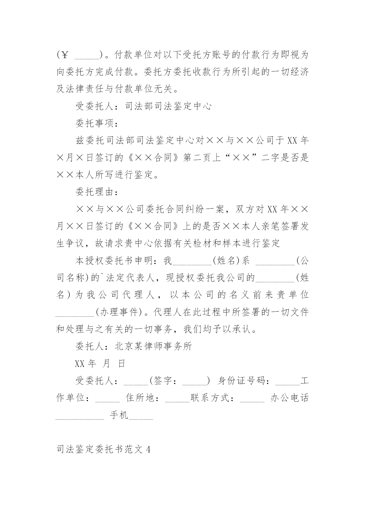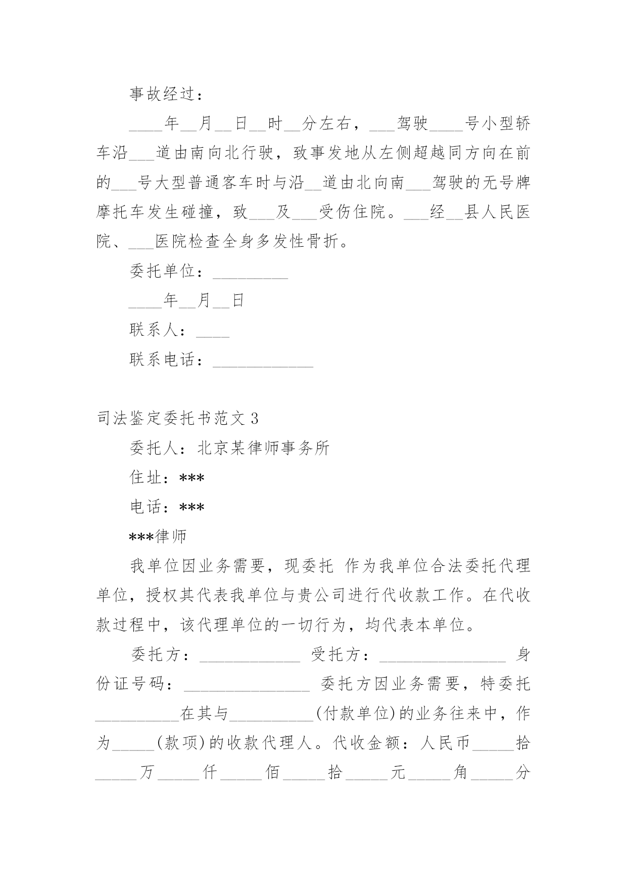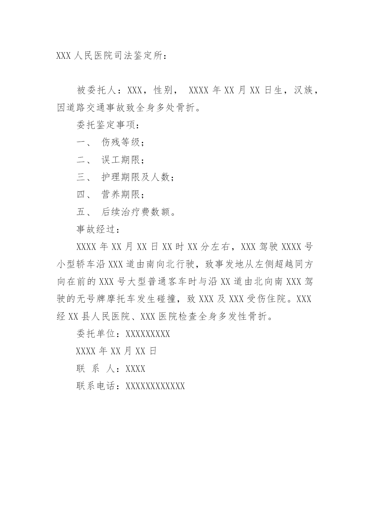 司法鉴定委托书司法鉴定委托书范文委托人不得以任何理由反悔被委托人的委托书上的合法权益。在充满活力,日益开放的今天,很多时候处理事务都会使用到委托书,委托书的注意事项有许多,你确定会写吗?下面是小编为大家整理的司法鉴定委托书范文,希望对大家有所帮助。司法鉴定委托书范文1编号:委托方:受托方:兹有____我单位____建筑工程现存在_______问题,特委托进行鉴定。一、工程概况:1、工程名称:见委托鉴定项目清单2、工程地址:见委托鉴定项目清单3、建造年份:见委托鉴定项目清单4、设计单位:见委托鉴定项目清单5、施工单位:见委托鉴定项目清单6、建筑面积、层数:见委托鉴定项目清单7、结构类型:二、委托鉴定的目的、内容:对房屋主体结构安全性进行鉴定。三、委托鉴定要求1、乙方须按照相关法律、法规、技术规范、规程进行鉴定,鉴定报告合法有效。2、鉴定费用:按元/平方米(按评估发证面积)进行结算。四、委托方按下列要求提供资料或材料:所提供的材料要求均为A4纸张,并承诺提供的`资料全部属实,可作为该建设工程质量安全问题鉴定的原始依据。(委托方实际提供的资料或材料见详细清单)1、原始资料:包括①岩土工程勘察报告;②设计计算书(含设计变更文件);③施工图纸(含施工变更单);④工程竣工图;⑤定点观测记录;⑥工程质检及验收文件;⑦事故处理记录;⑧维修记录;⑨历次加固改造记录;⑩历次鉴定情况记录。2、目前质量安全等问题的现状描述材料(可另附页/图纸等说明):①建设工程裂缝情况;②建设工程腐蚀、锈蚀、老化、风化等情况;③建设工程变形(下沉、倾斜)等情况;④建设工程渗漏、积水等情况;3、建设工程历史情况说明(可另附页/图纸等说明):①原始施工情况;②历次修缮、改造、用途改变、使用条件改变;③受灾情况;④装修情况;⑤可能影响该建设工程的周边情况。委托时间:____年____月____日委托方联系人/电话:委托方签章:司法鉴定委托书范文2___人民医院司法鉴定所:被委托人:___,性别,____年__月__日生,汉族,因道路交通事故致全身多处骨折。委托鉴定事项:一、伤残等级;二、误工期限;三、护理期限及人数;四、营养期限;五、后续治疗费数额。事故经过:____年__月__日__时__分左右,___驾驶____号小型轿车沿___道由南向北行驶,致事发地从左侧超越同方向在前的___号大型普通客车时与沿__道由北向南___驾驶的无号牌摩托车发生碰撞,致___及___受伤住院。___经__县人民医院、___医院检查全身多发性骨折。委托单位:_____________年__月__日联系人:____联系电话:____________司法鉴定委托书范文3委托人:北京某律师事务所住址:***电话:******律师我单位因业务需要,现委托作为我单位合法委托代理单位,授权其代表我单位与贵公司进行代收款工作。在代收款过程中,该代理单位的一切行为,均代表本单位。委托方:____________受托方:_______________身份证号码:_______________委托方因业务需要,特委托__________在其与__________(付款单位)的业务往来中,作为_____(款项)的收款代理人。代收金额:人民币_____拾_____万_____仟_____佰_____拾_____元_____角_____分(¥_____)。付款单位对以下受托方账号的付款行为即视为向委托方完成付款。委托方委托收款行为所引起的一切经济及法律责任与付款单位无关。受委托人:司法部司法鉴定中心委托事项:兹委托司法部司法鉴定中心对××与××公司于XX年×月×日签订的《××合同》第二页上“××”二字是否是××本人所写进行鉴定。委托理由:××与××公司委托合同纠纷一案,双方对XX年××月××日签订的《××合同》上的是否××本人亲笔签署发生争议,故请求贵中心依据有关检材和样本进行鉴定本授权委托书申明:我________(姓名)系________(公司名称)的`法定代表人,现授权委托我公司的________(姓名)为我公司代理人,以本公司的名义前来贵单位________(办理事件)。代理人在此过程中所签署的一切文件和处理与之有关的一切事务,我们均予以承认。委托人:北京某律师事务所XX年月日受委托人:_____(签字:_____)身份证号码:_____工作单位:_____住所地:_____联系方式:_____办公电话__________手机_____司法鉴定委托书范文4XXX人民医院司法鉴定所:被委托人:XXX,性别,XXXX年XX月XX日生,汉族,因道路交通事故致全身多处骨折。委托鉴定事项:一、伤残等级;二、误工期限;三、护理期限及人数;四、营养期限;五、后续治疗费数额。事故经过:XXXX年XX月XX日XX时XX分