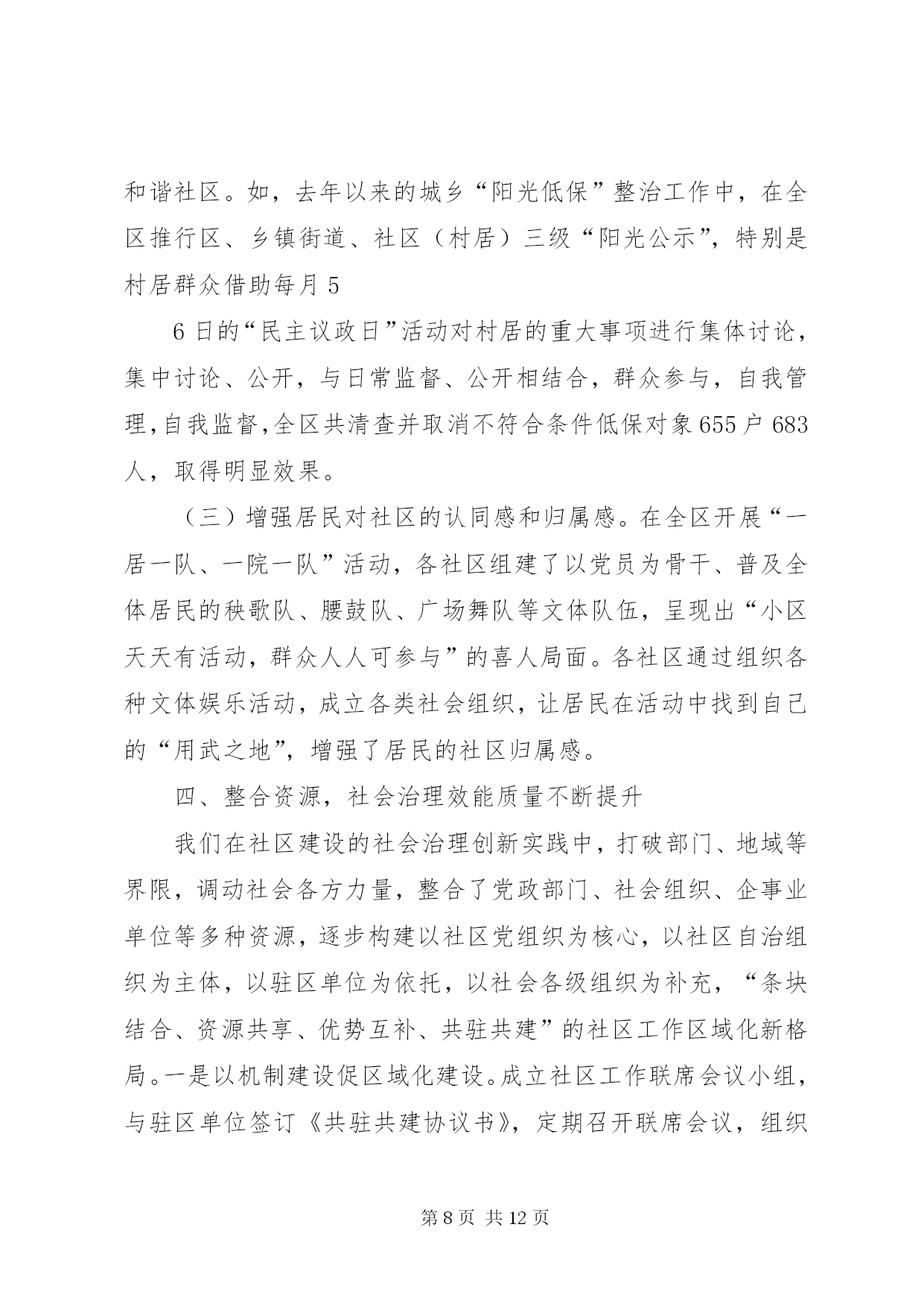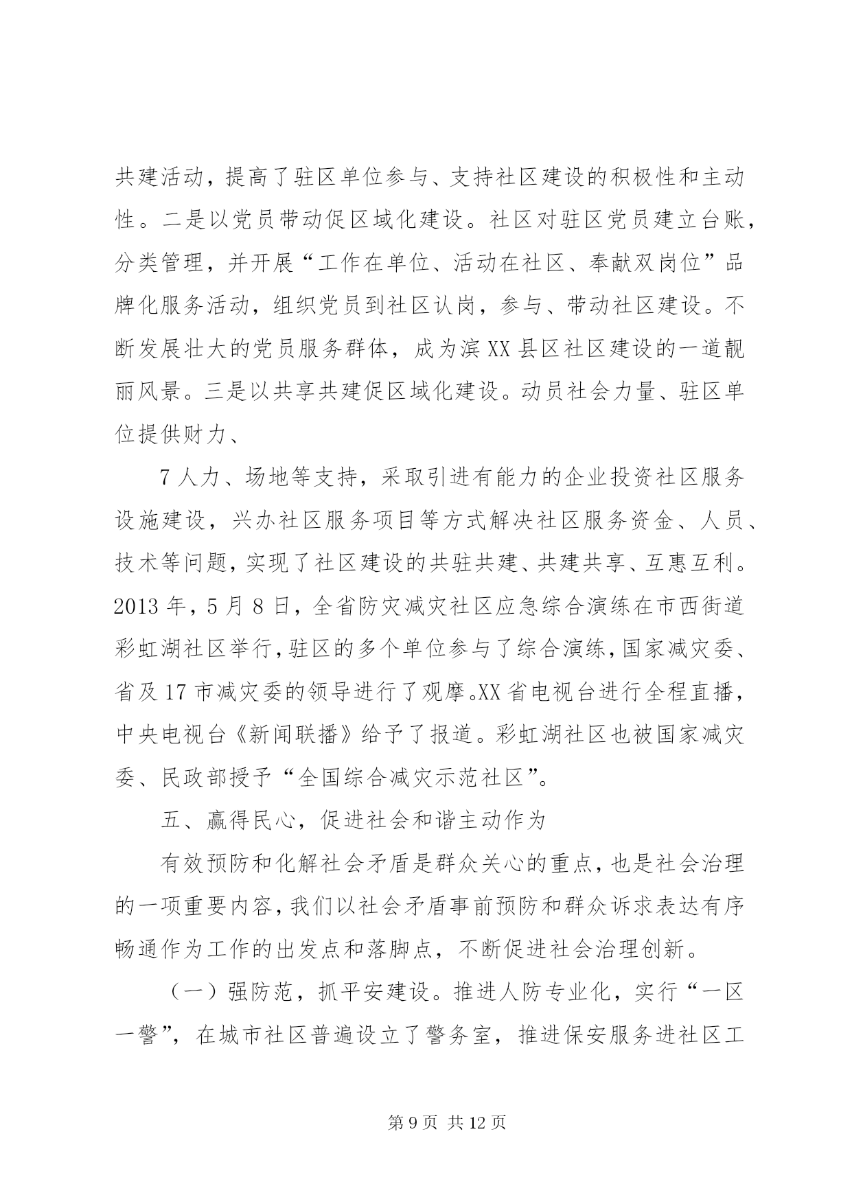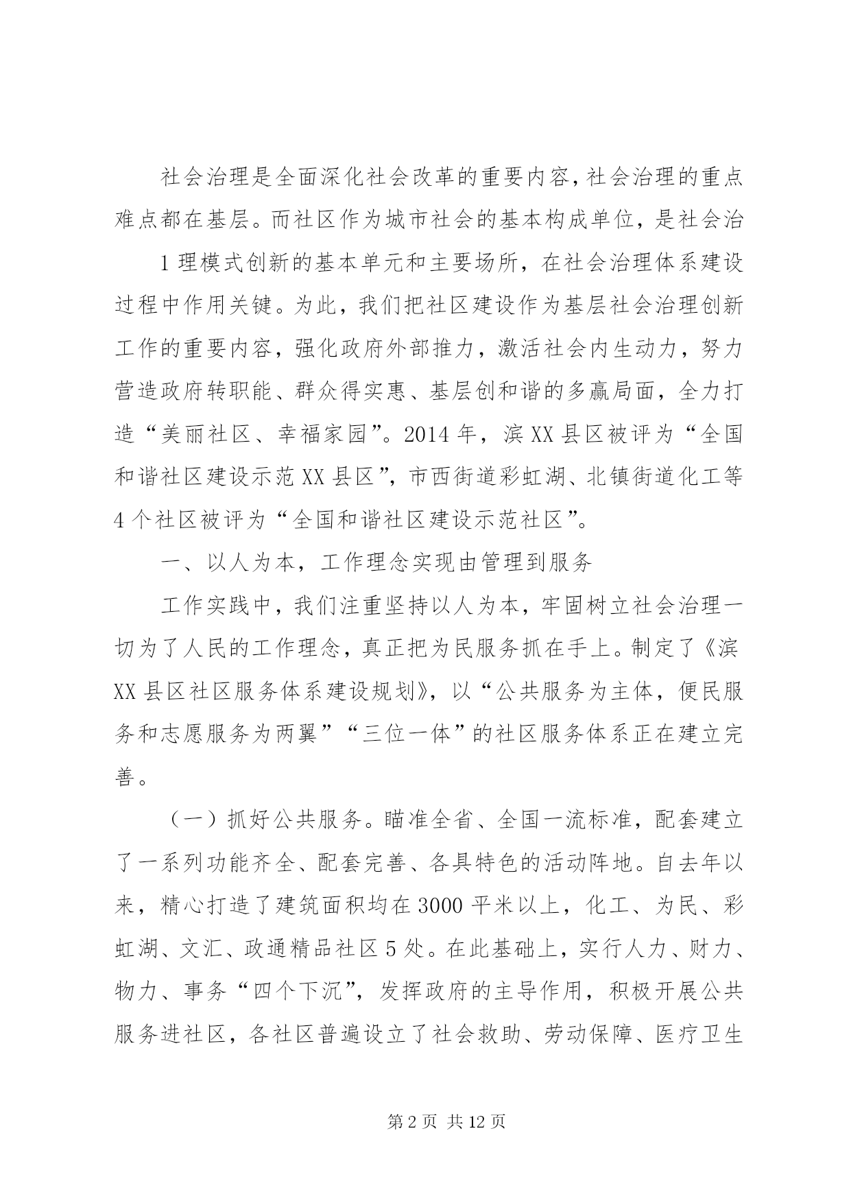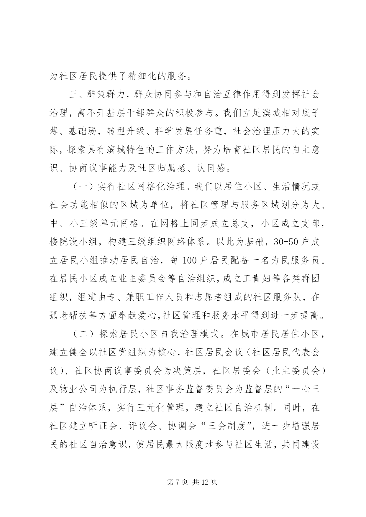 第PAGE\*Arabic\*MERGEFORMAT12页共NUMPAGES\*MERGEFORMAT12页关于创新社会治理论述创新社会治理思路增强社会发展活力滨XX县区地处黄河三角洲高效生态经济区、环渤海经济圈和济南城市群的叠加地带,东与XX市接壤,南与XX县区、XX市毗邻。西与XX县区、XX县区相连,北与沾化区交界,是XX县区委、市政府驻地,全市政治、经济、文化、交通中心,“四环五海”规划区的核心区,鲁北地区人流、物流、信息流的重要集散地。全区版图面积696.99平方公里,辖1乡2镇7个街道,总人口49万。滨XX县区区位优越,水利资源充足,黄河横贯境内38.5公里,徒骇河穿境而过。石油、天然气等矿藏储量甚丰,是中国第二大油田—胜利油田的重要产区之一。产业基础雄厚,是全国著名的家纺基地,拥有家纺服装、机械电子等六大主导产业。文化底蕴丰厚,秦皇台遗址历经2000多年风霜依然矗立,明清望族“一门十二进士”、“父子五翰林”的滨城杜家享誉天下。坚持稳中求进的工作总基调,积极抢抓“两区一圈”机遇,加快建设生态和谐富裕现代化新滨城。2014年,全年实现地区生产总值366.9亿元、地方财政收入35.68亿元,农民人均纯收入13172元。荣获“全国‘六五’普法中期先进县区”、“全国和谐社区建设示范XX县区”、“全省流动人口计生协会建设示范区”、“省级食品药品安全示范区”和“XX省知识产权试点示范优秀单位”等荣誉称号。社会治理是全面深化社会改革的重要内容,社会治理的重点难点都在基层。而社区作为城市社会的基本构成单位,是社会治1理模式创新的基本单元和主要场所,在社会治理体系建设过程中作用关键。为此,我们把社区建设作为基层社会治理创新工作的重要内容,强化政府外部推力,激活社会内生动力,努力营造政府转职能、群众得实惠、基层创和谐的多赢局面,全力打造“美丽社区、幸福家园”。2014年,滨XX县区被评为“全国和谐社区建设示范XX县区”,市西街道彩虹湖、北镇街道化工等4个社区被评为“全国和谐社区建设示范社区”。一、以人为本,工作理念实现由管理到服务工作实践中,我们注重坚持以人为本,牢固树立社会治理一切为了人民的工作理念,真正把为民服务抓在手上。制定了《滨XX县区社区服务体系建设规划》,以“公共服务为主体,便民服务和志愿服务为两翼”“三位一体”的社区服务体系正在建立完善。(一)抓好公共服务。瞄准全省、全国一流标准,配套建立了一系列功能齐全、配套完善、各具特色的活动阵地。自去年以来,精心打造了建筑面积均在3000平米以上,化工、为民、彩虹湖、文汇、政通精品社区5处。在此基础上,实行人力、财力、物力、事务“四个下沉”,发挥政府的主导作用,积极开展公共服务进社区,各社区普遍设立了社会救助、劳动保障、医疗卫生等“一站式”为民公共服务窗口,实现公共服务项目的全覆盖。同时,找准社区公共服务的切入点,在社区建立老年人日间照料中心,实行无偿、低偿、有偿服务相结合,为老年人提供生活照料、配餐服务、健康保健等服务。目前,市西街道彩虹湖社区,彭李街道黄河社区、为民社区、大河社区,北镇街道春晓社区、市东街道政通社区相继成立了社区日间照料中心。今年初,总建筑面积214330平方米、占地100亩,总投资近1亿元的市级重点工程—滨州殡仪馆正式投入使用,新馆按照国家民政部一级馆标准建设,倡导“绿色殡葬”,打造“生命最美的送行者”服务品牌,提高了殡葬服务水平。(二)发展便民服务。重点打造具有滨城特点的“一刻钟便民服务圈”,在社区开展餐饮、家政、医疗等10大类便民服务,设立便民服务网点,通过分发便民服务手册、便民联系卡等措施,较好地实现了社区服务网点与居民需求的无缝对接。同时,各社区以满足社区居民需求为着力点,搭建社区服务有效载体,积极开展“品牌社区”创建活动,逐步探索拓宽社区服务新途径。市西街道彩虹湖社区打造了“彩虹民生一号”服务品牌,内容丰富、形式多样,并包含众多子品牌服务项目;政和社区创建了“3351”便民服务模式,成功吸引加盟商户150家,惠及居民2740户;化工社区打造“五园一湾”服务品牌,成立了“7110”便民服务队,收到良好效果;利民社区以校园学知识、社区学实践为宗旨,通过社区、学校联合为学生形成“社校同心圆”,以打造“社校同心圆”品牌开展了文艺表演、体育比赛等活动,构建社区、学校一体化“大教育”模式;为民社区的“4l”服务模式和政通社区的“手护工程”等服务模式也都有效地提升了社区服务水平。目前,全区城市社区共创建各类品牌33个,“一社区一特色,一社区一品牌”的格局已经形成。(三)培育志愿队伍。我们做好社会关注、群众急需、志愿者专长三个方面的“结合”文章,先后组织开展了以帮助困难群众为内容的“一助一”长期结对服务,“关爱老人、情暖社区”志愿者集中服务月