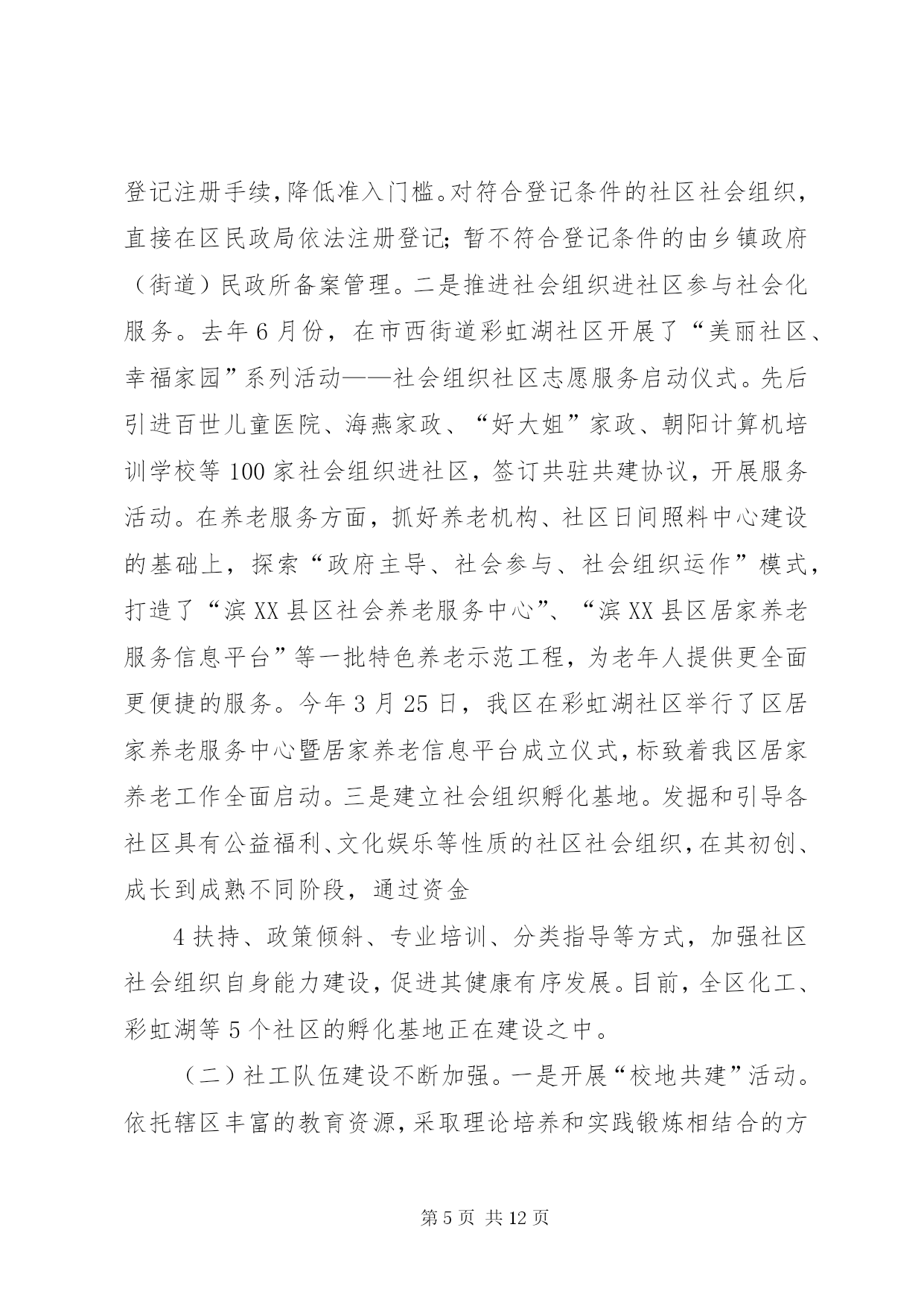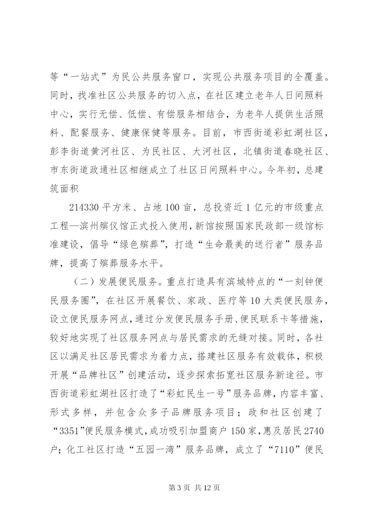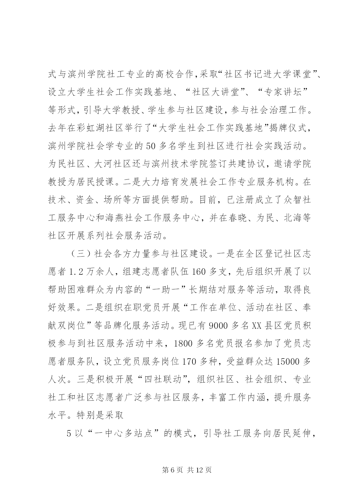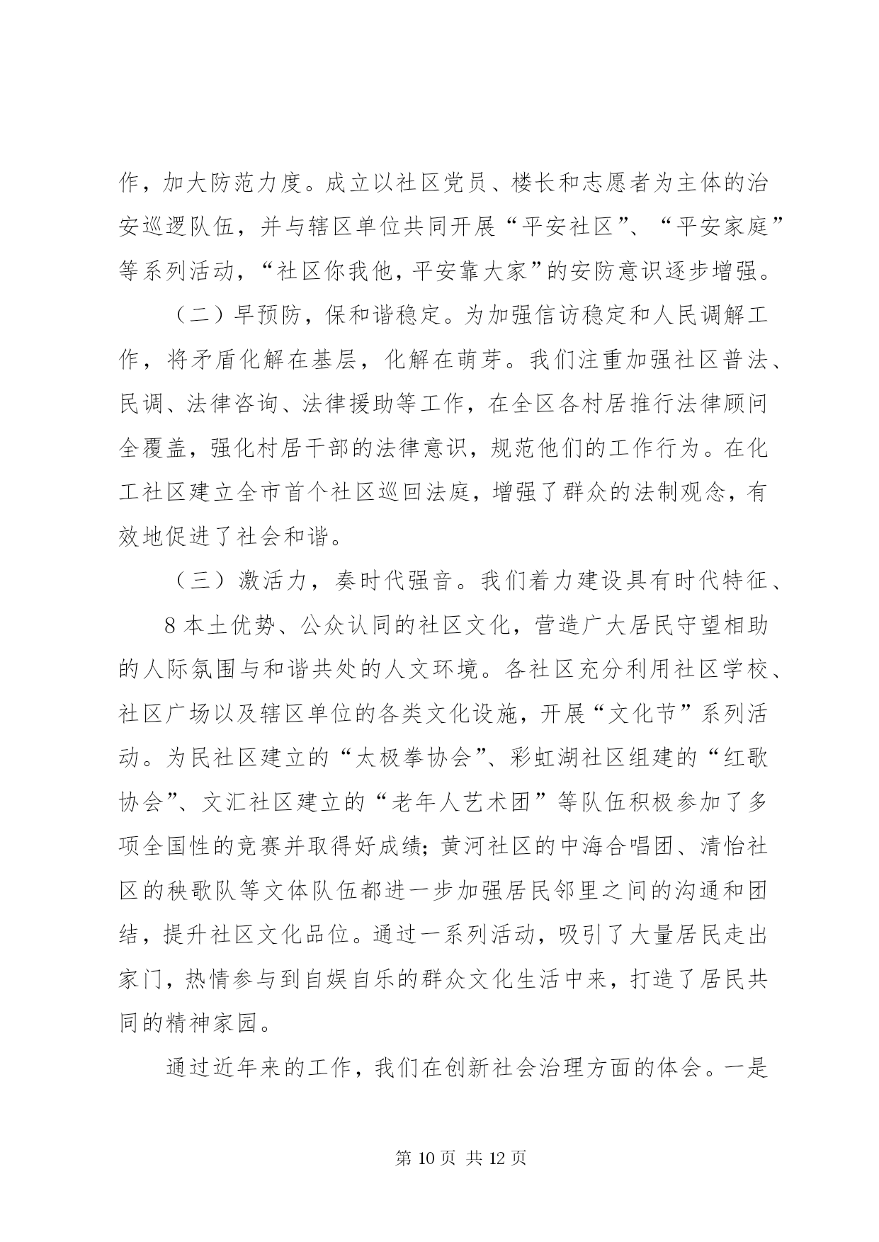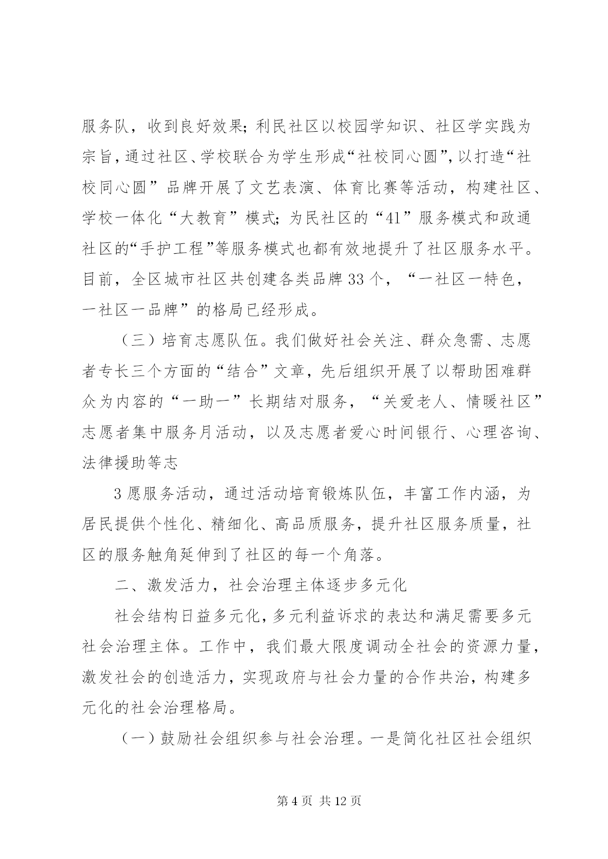 第PAGE\*Arabic\*MERGEFORMAT12页共NUMPAGES\*MERGEFORMAT12页关于创新社会治理论述创新社会治理思路增强社会发展活力滨XX县区地处黄河三角洲高效生态经济区、环渤海经济圈和济南城市群的叠加地带,东与XX市接壤,南与XX县区、XX市毗邻。西与XX县区、XX县区相连,北与沾化区交界,是XX县区委、市政府驻地,全市政治、经济、文化、交通中心,“四环五海”规划区的核心区,鲁北地区人流、物流、信息流的重要集散地。全区版图面积696.99平方公里,辖1乡2镇7个街道,总人口49万。滨XX县区区位优越,水利资源充足,黄河横贯境内38.5公里,徒骇河穿境而过。石油、天然气等矿藏储量甚丰,是中国第二大油田—胜利油田的重要产区之一。产业基础雄厚,是全国著名的家纺基地,拥有家纺服装、机械电子等六大主导产业。文化底蕴丰厚,秦皇台遗址历经2000多年风霜依然矗立,明清望族“一门十二进士”、“父子五翰林”的滨城杜家享誉天下。坚持稳中求进的工作总基调,积极抢抓“两区一圈”机遇,加快建设生态和谐富裕现代化新滨城。2014年,全年实现地区生产总值366.9亿元、地方财政收入35.68亿元,农民人均纯收入13172元。荣获“全国‘六五’普法中期先进县区”、“全国和谐社区建设示范XX县区”、“全省流动人口计生协会建设示范区”、“省级食品药品安全示范区”和“XX省知识产权试点示范优秀单位”等荣誉称号。社会治理是全面深化社会改革的重要内容,社会治理的重点难点都在基层。而社区作为城市社会的基本构成单位,是社会治1理模式创新的基本单元和主要场所,在社会治理体系建设过程中作用关键。为此,我们把社区建设作为基层社会治理创新工作的重要内容,强化政府外部推力,激活社会内生动力,努力营造政府转职能、群众得实惠、基层创和谐的多赢局面,全力打造“美丽社区、幸福家园”。2014年,滨XX县区被评为“全国和谐社区建设示范XX县区”,市西街道彩虹湖、北镇街道化工等4个社区被评为“全国和谐社区建设示范社区”。一、以人为本,工作理念实现由管理到服务工作实践中,我们注重坚持以人为本,牢固树立社会治理一切为了人民的工作理念,真正把为民服务抓在手上。制定了《滨XX县区社区服务体系建设规划》,以“公共服务为主体,便民服务和志愿服务为两翼”“三位一体”的社区服务体系正在建立完善。(一)抓好公共服务。瞄准全省、全国一流标准,配套建立了一系列功能齐全、配套完善、各具特色的活动阵地。自去年以来,精心打造了建筑面积均在3000平米以上,化工、为民、彩虹湖、文汇、政通精品社区5处。在此基础上,实行人力、财力、物力、事务“四个下沉”,发挥政府的主导作用,积极开展公共服务进社区,各社区普遍设立了社会救助、劳动保障、医疗卫生等“一站式”为民公共服务窗口,实现公共服务项目的全覆盖。同时,找准社区公共服务的切入点,在社区建立老年人日间照料中心,实行无偿、低偿、有偿服务相结合,为老年人提供生活照料、配餐服务、健康保健等服务。目前,市西街道彩虹湖社区,彭李街道黄河社区、为民社区、大河社区,北镇街道春晓社区、市东街道政通社区相继成立了社区日间照料中心。今年初,总建筑面积214330平方米、占地100亩,总投资近1亿元的市级重点工程—滨州殡仪馆正式投入使用,新馆按照国家民政部一级馆标准建设,倡导“绿色殡葬”,打造“生命最美的送行者”服务品牌,提高了殡葬服务水平。(二)发展便民服务。重点打造具有滨城特点的“一刻钟便民服务圈”,在社区开展餐饮、家政、医疗等10大类便民服务,设立便民服务网点,通过分发便民服务手册、便民联系卡等措施,较好地实现了社区服务网点与居民需求的无缝对接。同时,各社区以满足社区居民需求为着力点,搭建社区服务有效载体,积极开展“品牌社区”创建活动,逐步探索拓宽社区服务新途径。市西街道彩虹湖社区打造了“彩虹民生一号”服务品牌,内容丰富、形式多样,并包含众多子品牌服务项目;政和社区创建了“3351”便民服务模式,成功吸引加盟商户150家,惠及居民2740户;化工社区打造“五园一湾”服务品牌,成立了“7110”便民服务队,收到良好效果;利民社区以校园学知识、社区学实践为宗旨,通过社区、学校联合为学生形成“社校同心圆”,以打造“社校同心圆”品牌开展了文艺表演、体育比赛等活动,构建社区、学校一体化“大教育”模式;为民社区的“4l”服务模式和政通社区的“手护工程”等服务模式也都有效地提升了社区服务水平。目前,全区城市社区共创建各类品牌33个,“一社区一特色,一社区一品牌”的格局已经形成。(三)培育志愿队伍。我们做好社会关注、群众急需、志愿者专长三个方面的“结合”文章,先后组织开展了以帮助困难群众为内容的“一助一”长期结对服务,“关爱老人、情暖社区”志愿者集中服务月