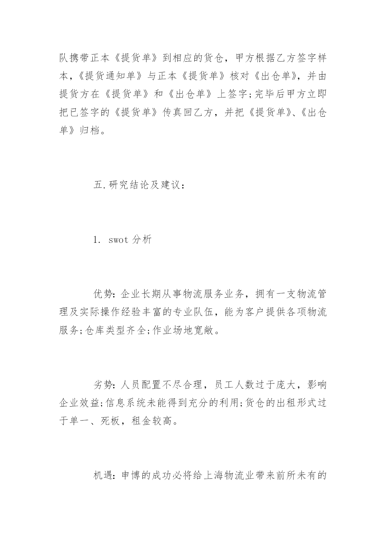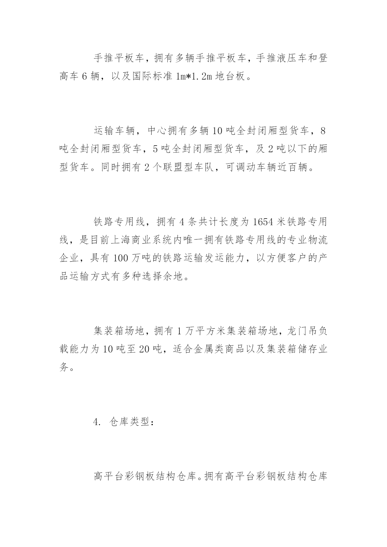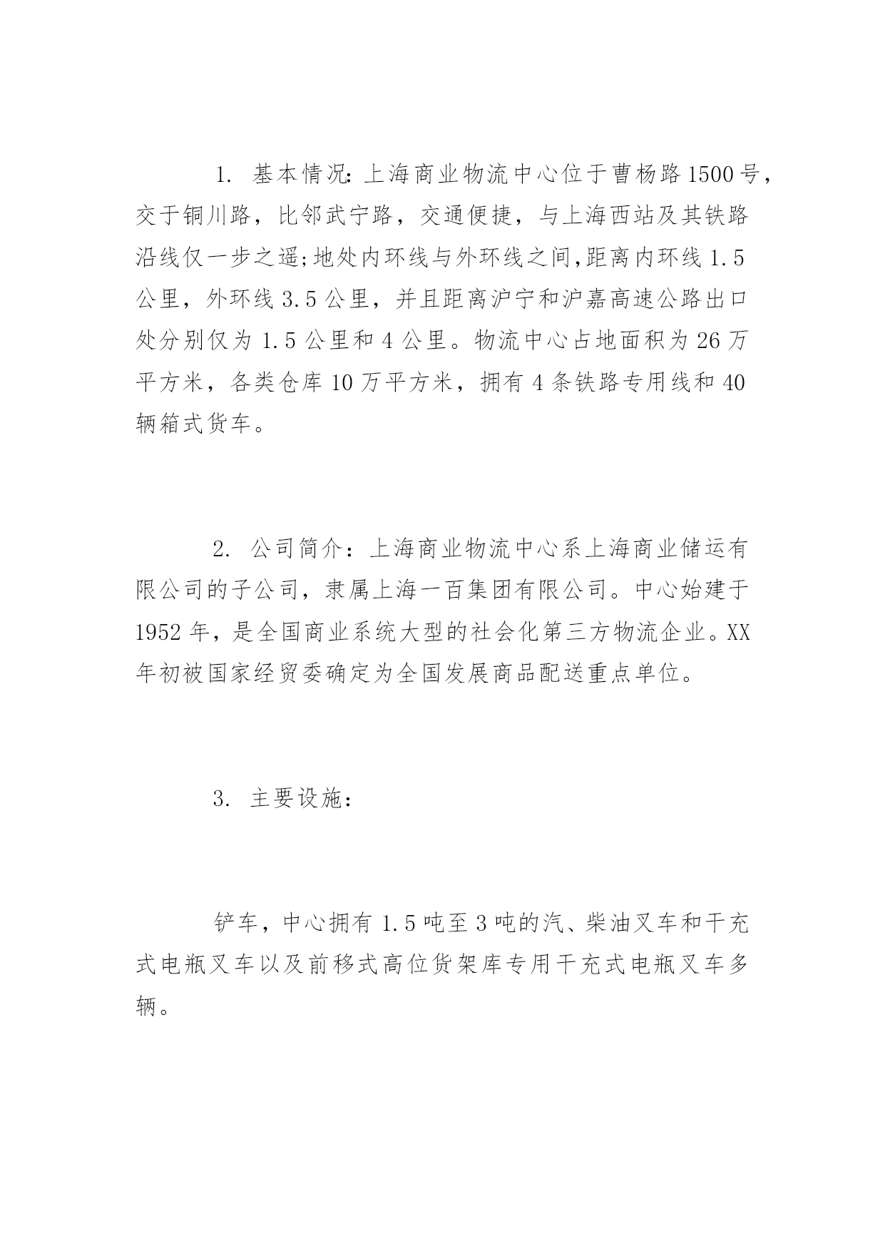 物流实习周记2013物流实习周记一.研究动机:经过一学期《物流基础》的学习,对物流的定义、基本功能、各个作业流程有了一定的理论基础,通过实习将这些理论与实际的操作相结合,在实践中提高运用知识的能力。二.研究目的:了解第三方物流服务的特点、主要设备和作业流程,对其进行分析,并结合所学的理论提出改进意见。三.研究方法:访问法、资料收集法。资料收集的方法:网上收集。四.公司概况1.基本情况:上海商业物流中心位于曹杨路1500号,交于铜川路,比邻武宁路,交通便捷,与上海西站及其铁路沿线仅一步之遥;地处内环线与外环线之间,距离内环线1.5公里,外环线3.5公里,并且距离沪宁和沪嘉高速公路出口处分别仅为1.5公里和4公里。物流中心占地面积为26万平方米,各类仓库10万平方米,拥有4条铁路专用线和40辆箱式货车。2.公司简介:上海商业物流中心系上海商业储运有限公司的子公司,隶属上海一百集团有限公司。中心始建于1952年,是全国商业系统大型的社会化第三方物流企业。XX年初被国家经贸委确定为全国发展商品配送重点单位。3.主要设施:铲车,中心拥有1.5吨至3吨的汽、柴油叉车和干充式电瓶叉车以及前移式高位货架库专用干充式电瓶叉车多辆。手推平板车,拥有多辆手推平板车,手推液压车和登高车6辆,以及国际标准1m*1.2m地台板。运输车辆,中心拥有多辆10吨全封闭厢型货车,8吨全封闭厢型货车,5吨全封闭厢型货车,及2吨以下的厢型货车。同时拥有2个联盟型车队,可调动车辆近百辆。铁路专用线,拥有4条共计长度为1654米铁路专用线,是目前上海商业系统内唯一拥有铁路专用线的专业物流企业,具有100万吨的铁路运输发运能力,以方便客户的产品运输方式有多种选择余地。集装箱场地,拥有1万平方米集装箱场地,龙门吊负载能力为10吨至20吨,适合金属类商品以及集装箱储存业务。4.仓库类型:高平台彩钢板结构仓库。拥有高平台彩钢板结构仓库计24621平方米,可利用空间高度为7-8米,1700平方米的仓库已安装了高位货架,该类型仓库的优点是建筑结构合理,面积利用率高,防汛、防潮、隔热性能良好,全部有雨棚和外平台,库外周转场地大,便于商品装卸及进出仓。高平台铝合金结构仓库。拥有高平台铝合金结构仓库计16800平方米,可利用空间高度为6.5米,该类型的仓库的优点是防汛、防潮性能良好,库外周转场地大,特别适合于进出仓频繁的大宗商品的储存。楼层恒温库。拥有楼层恒温库10100平方米,可利用空间高度为5米,该类型仓库的建筑条件为满足某些产品在温度控制上的不同要求提供了先决条件。铝合金结构平房库。拥有铝合金板平房库5700平方米,可利用空间高度为6米,该类型仓库的优点是库外周转场地大,特别适合于进出仓频繁的大宗商品的储存。易燃品仓库。拥有可储存易燃品仓库1000平方米,该类型仓库能提供属于易燃危险品类的特殊商品储存。其它库房40000平方米,该类型仓库多数属于砖木结构,单幢仓库面积小于上述仓库类型,具有冬暖夏凉的自然调节功能。5.仓储系统服务:市内/国内配送,单品/综合配送,常温/冷藏配送。备有各式车型,承运商品包括:百货用品、冷藏保温、特殊商品。贵重物品配送。提供门到门的服务,确保商品的安全抵达用户手中。隔日零担配送。对于零担配送,公司承诺货物隔日上车、发车。上架陈列。对于市内各大商场、各类超市、连锁网点的配送服务,公司还提供协助客户商品上架陈列的服务。6.仓储系统服务:常温/恒温仓库储存,高层/堆垛货架储存。存货即时控制。有效的货卡登记制度,可随时了解库存商品的数量。确保商品质量,随时检查,出现质量问题及时上报、调整。定时观察库房条件,确保库房内温湿度不超标。加工整理。提供完善的分拣、换包装等加工服务,物流中心内还设有专门的包装加工单位,可随时满足客户的各种要求。订单处理。对订单处理要求做到及时、准确、高效,并承诺:单据收到15分钟内,操作人员到达现场,可开始收发货。退货处理。全力协助货主公司进行退货收货作业,并且填写收货单和进仓单,并及时反馈货主公司,以便货主公司尽快对退货做出处理决定。退货收货时,对于原封箱之产品如无货主公司特别指令,即可作为商品入库处理。非原封箱退货按货主公司指令要求,做到清点、分类、整理后方能入库。7.信息系统服务:物流信息系统设计。分析客户物流流程,提供物流系统设计,系统咨询。仓储管理系统设计。依据客户对仓储条件的要求和储存商品特点,进行仓储管理系统的个性化设计。运输配送管理系统设计。针对大企业配送系统,专门设计了一套配送订单管理系统,实现单证处理的通用化,以适应各种客户对配送的要求。销售供货分析。从客户利益出发,进行常规供货、出货、流通周转、及安全库存的定量分析,替客户计算出最经济的租仓面