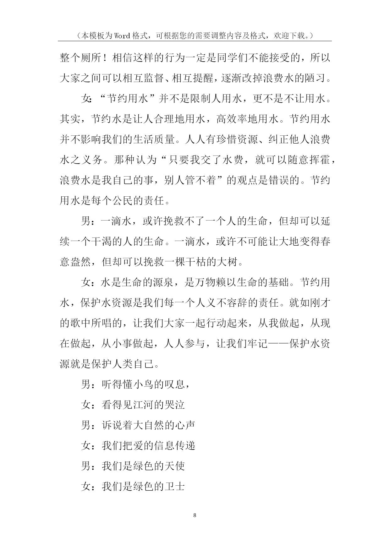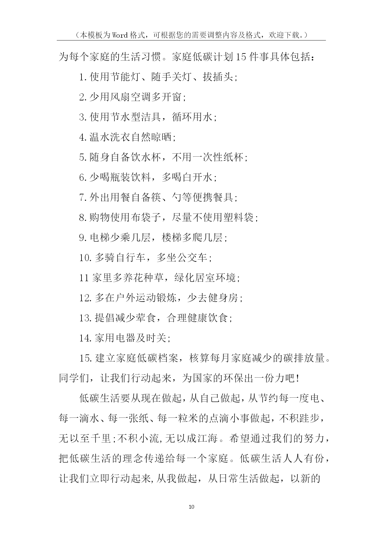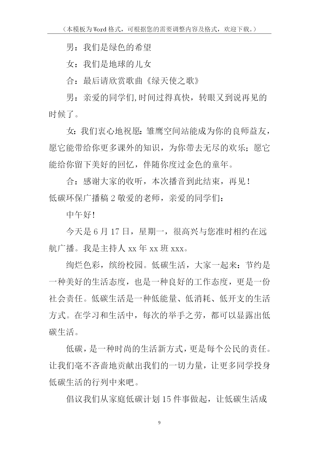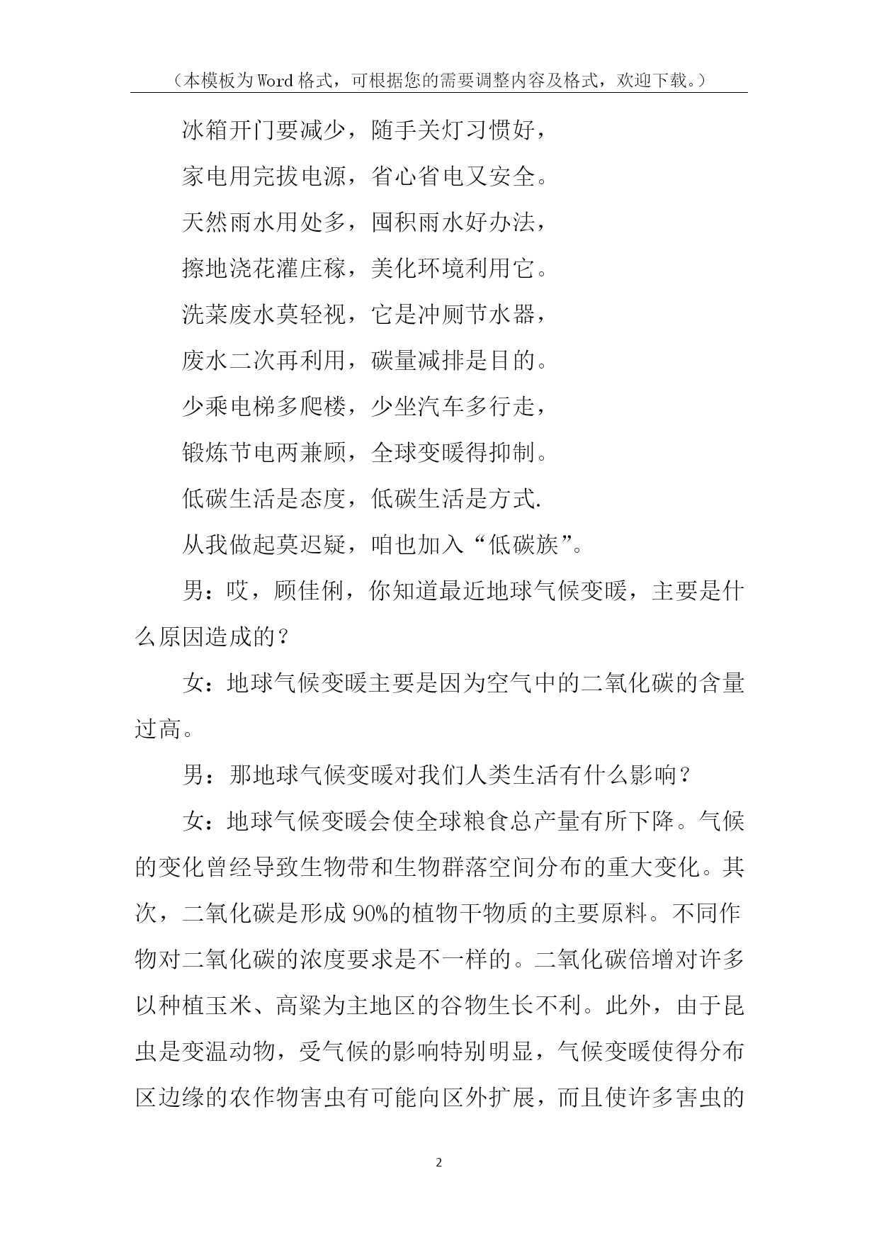 (本模板为Word格式,可根据您的需要调整内容及格式,欢迎下载。)PAGE\*MERGEFORMAT26低碳环保广播稿低碳环保广播稿1(播放音乐:《世界因爱而发光》(渐弱)男:采撷一缕阳光,编织成七彩的花环。女:留住一阵清风,播撒出希望的明天。男:付出一份真诚,打造出温馨的世界。女:带走一丝烦恼,让快乐与我们同行。男:敬爱的老师!女:亲爱的同学们!合:大家好!女:伴着和煦的阳光,雏鹰空间站又和大家见面了。男:我是新安小学的王书程。女:我是新安小学的顾佳俐。女:这一次的雏鹰空间站由我俩为大家主持,希望大家能喜欢。男:首先,让我们进入《阳光童谣》栏目:请欣赏两篇有关环保知识的童谣:空调耗电量最大,不到炎热不用它,用时调高一两度,节约能源益处多。冰箱开门要减少,随手关灯习惯好,家电用完拔电源,省心省电又安全。天然雨水用处多,囤积雨水好办法,擦地浇花灌庄稼,美化环境利用它。洗菜废水莫轻视,它是冲厕节水器,废水二次再利用,碳量减排是目的。少乘电梯多爬楼,少坐汽车多行走,锻炼节电两兼顾,全球变暖得抑制。低碳生活是态度,低碳生活是方式.从我做起莫迟疑,咱也加入“低碳族”。男:哎,顾佳俐,你知道最近地球气候变暖,主要是什么原因造成的?女:地球气候变暖主要是因为空气中的二氧化碳的含量过高。男:那地球气候变暖对我们人类生活有什么影响?女:地球气候变暖会使全球粮食总产量有所下降。气候的变化曾经导致生物带和生物群落空间分布的重大变化。其次,二氧化碳是形成90%的植物干物质的主要原料。不同作物对二氧化碳的浓度要求是不一样的。二氧化碳倍增对许多以种植玉米、高粱为主地区的谷物生长不利。此外,由于昆虫是变温动物,受气候的影响特别明显,气候变暖使得分布区边缘的农作物害虫有可能向区外扩展,而且使许多害虫的越冬存活率提高,会导致疾病和病虫害的发生率增大。地球气候变暖的后果十分严重,它还会使自然灾害频繁发生。干旱、土地沙漠化、海平面上升、龙卷风等自然灾害都与气候变暖有关。男:地球气候变暖对我们人类生活影响真大!那,我们现在提倡的低碳生活就是指人们生活作息时所耗用能量要减少,从而降低碳,特别是二氧化碳的排放。顾佳俐,我说的对吗?女:对,低碳生活听上去好像离我们普通人的生活很遥远,其实大家平时注意省电、省水、垃圾回收以及绿色出行,就是在积极实践着低碳生活。男:简单来说,低碳就是一种生活习惯,是一种自然而然去节约身边各种资源的习惯,只要你愿意主动去约束自己,改善自己的生活习惯,你就可以加入进来。这是态度问题,而不是能力,我们应该积极提倡并去实践低碳生活,注意节电、节油、节气。女:在此我们呼吁亲爱的同学们做到以下几点:1、节约每一张纸。纸要双面用。2、随手关灯,不用的电器及时拔下插头。3、少扔垃圾。4、少用塑料袋,多用环保袋。5、不使用一次性用品,如一次性筷子、餐盒等。6、少燃放鞭炮,少排放污水、废气。7、多植树,如果有条件多种花草也可以。8、不吃零食,好好吃饭。剩菜冷却后,用保鲜膜包好再送进冰箱;热气不仅增加冰箱做功,还会结霜,双重费电;冰箱内存放食物的量以占容积的80%为宜,放得过多或过少,都会费电;9、不吃口香糖,坚持早晚刷牙,饭后漱口。10、上学放学坚持步行,少开车,既环保又锻炼身体。合:希望大家按照以上的几条约束自己,让我们增强低碳意识,节能减排,养成低碳生活习惯。小手拉大手,让低碳生活永远在我们身边。女:接下来请欣赏歌曲《我是绿叶》男:我是一片绿叶,一片小小的绿叶,从一点一滴的小事做起,去保护我们的家园,用行动去改变这个世界,让未来变的更完美。说得多好啊!女:是啊,只要我们每个人,从小事做起,就能保护我们赖以生存的地球,让我们的生活变得更幸福。可在现实生活中,往往有些人却做不到。男:是啊,我们一起都知道人类的生存和发展离不开水。粮食的生长离不开水,工业的生产离不开水,我们人类更是离不开水,但是,身在江南水乡的我们,似乎已习惯大手大脚地用水,总觉得水对于我们来说是取之不尽用之不竭的,其实,全世界的水百分之九十三是咸水,不能喝。淡水只占有百分之七,而能喝的水只有百分之零点八。全世界五十亿人口,就靠饮用这只占百分之零点八的淡水,看,水多可贵呀!女:嗯,水是生命之源,没有水,地球上就没有植物,没有动物,更没有人类,如果人类无止境地浪费水,那么,人类自身将会受到大自然无情的惩罚。男:虽然地球上的水约有14亿立方千米,但是,海洋(不能食用的)就占有13.7亿立方千米。如果我们还像现在这样浪费水,30年后这片神州大地上,可饮用的水将会枯竭。我们可以算一笔帐,如果每人节约1升水,那么,全国就可节约130万吨水,这些水可供多少人喝呀!女:黄河被人称为母亲河,它是中华民族的摇篮。几千年来,它一直浇灌着中华大地,源源不断地为人类提供着衣食之便。可是如今,黄河这条中国