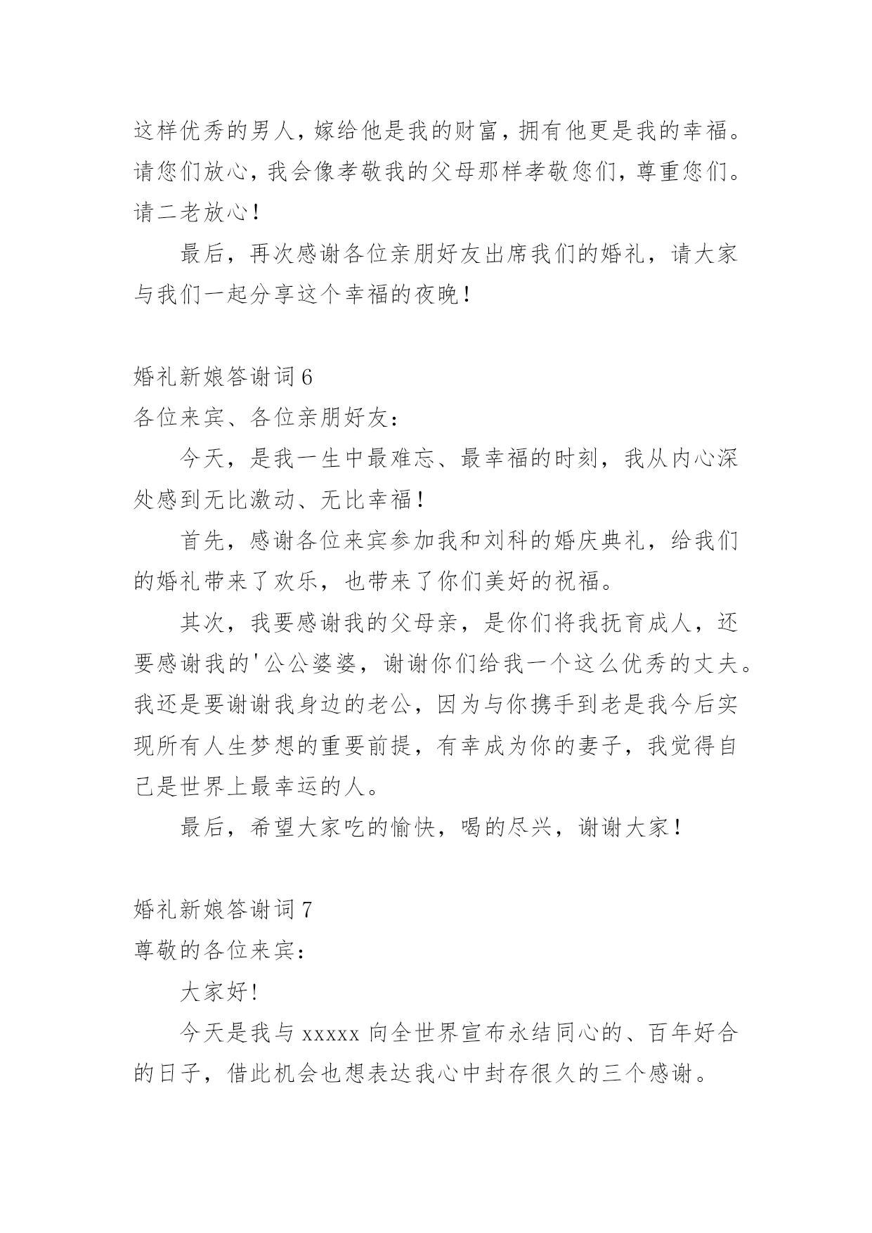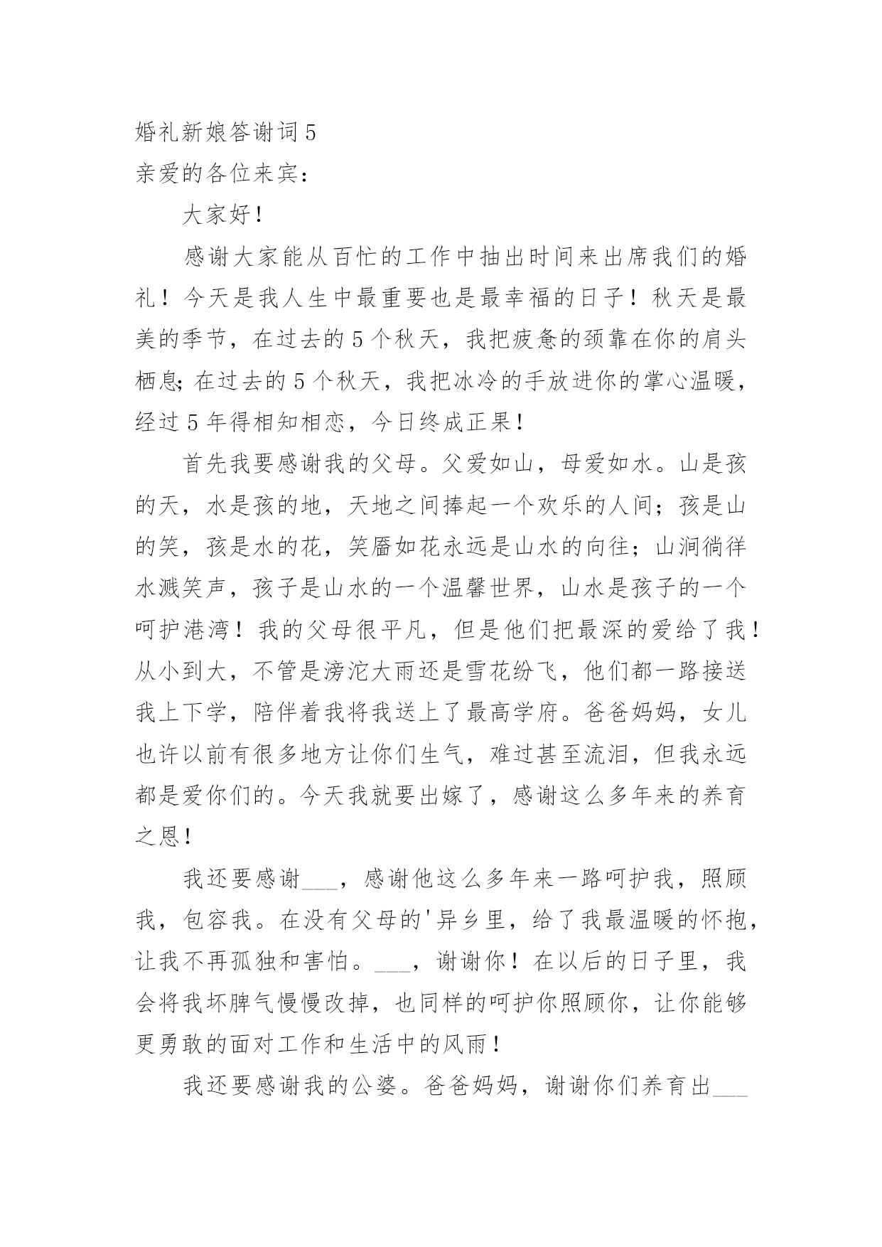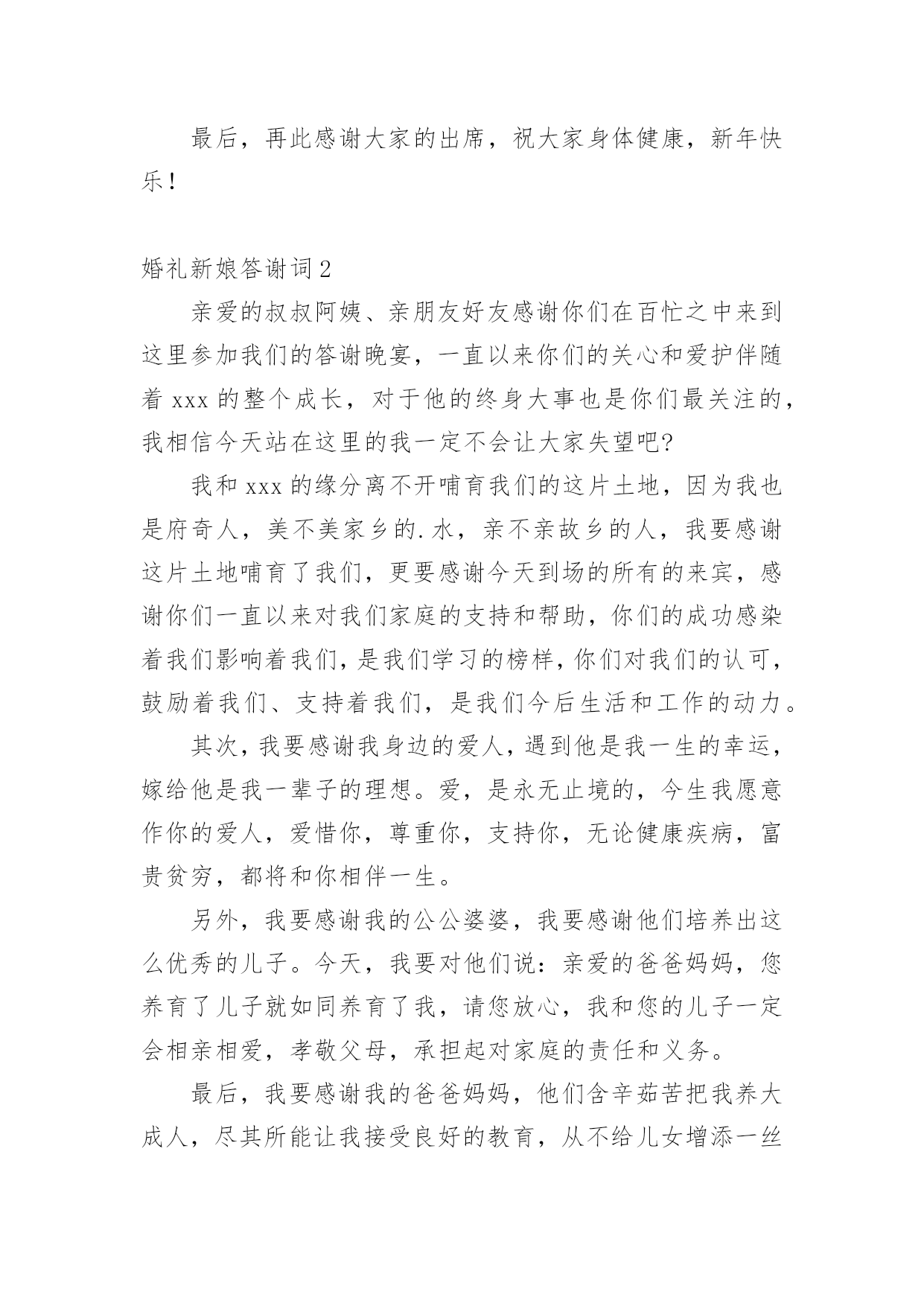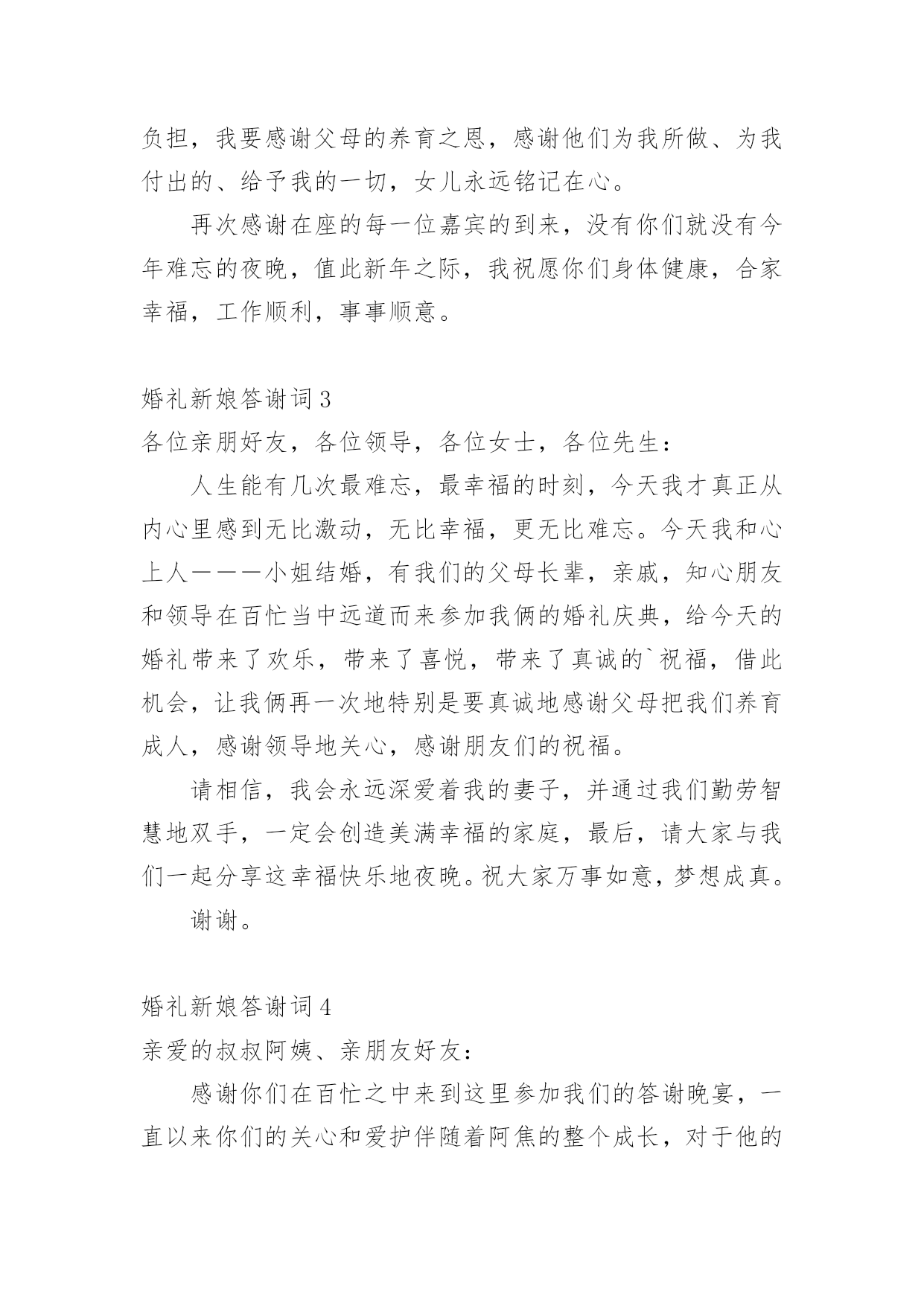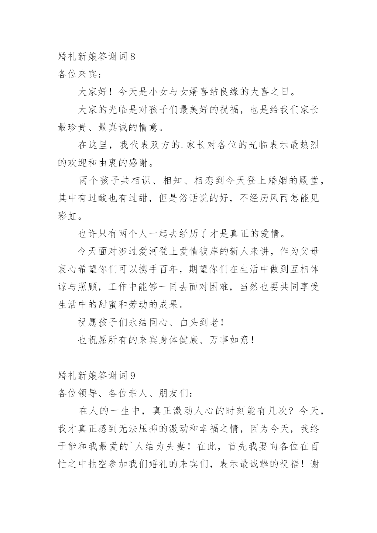 婚礼新娘答谢词婚礼新娘答谢词(必备)在不断进步的时代,很多地方都会使用到答谢词,与其他的演讲文书一样,答谢词是诉诸听觉的,应将优美雅洁的书面语与活泼生动的口语有机融合一体。写答谢词可马虎不得哦,下面是小编帮大家整理的婚礼新娘答谢词,希望对大家有所帮助。婚礼新娘答谢词1各位来宾:大家中午好!首先真挚的感谢在座的各位,百忙之中出席婚礼,见证我们的这份爱情。更要感谢双方父母对我们的支持、关爱和祝福。常州与甘泉距离1千多公里,我和xx的爱情真可谓是穿越了千山万水。今天,我们终于结婚了。虽然由于工作和路途原因,我的亲友没有能参加我们的婚礼。但是我并没有感到失望和孤单。因为从今天开始,在座的各位来宾都成为了我的亲友。在此,我要特别的感谢我的.爸爸妈妈对我的培养和关爱,我相信此时刻,他们一定能感受到我们的幸福和快乐。借此机会,我想对他们说,爸爸妈妈,请放心。你们的女儿找到了一个美好的归宿,我相信xx会是一个优秀的丈夫,我们一定会相亲相爱,白头偕老。最后,再此感谢大家的出席,祝大家身体健康,新年快乐!婚礼新娘答谢词2亲爱的叔叔阿姨、亲朋友好友感谢你们在百忙之中来到这里参加我们的答谢晚宴,一直以来你们的关心和爱护伴随着xxx的整个成长,对于他的终身大事也是你们最关注的,我相信今天站在这里的我一定不会让大家失望吧?我和xxx的缘分离不开哺育我们的这片土地,因为我也是府奇人,美不美家乡的.水,亲不亲故乡的人,我要感谢这片土地哺育了我们,更要感谢今天到场的所有的来宾,感谢你们一直以来对我们家庭的支持和帮助,你们的成功感染着我们影响着我们,是我们学习的榜样,你们对我们的认可,鼓励着我们、支持着我们,是我们今后生活和工作的动力。其次,我要感谢我身边的爱人,遇到他是我一生的幸运,嫁给他是我一辈子的理想。爱,是永无止境的,今生我愿意作你的爱人,爱惜你,尊重你,支持你,无论健康疾病,富贵贫穷,都将和你相伴一生。另外,我要感谢我的公公婆婆,我要感谢他们培养出这么优秀的儿子。今天,我要对他们说:亲爱的爸爸妈妈,您养育了儿子就如同养育了我,请您放心,我和您的儿子一定会相亲相爱,孝敬父母,承担起对家庭的责任和义务。最后,我要感谢我的爸爸妈妈,他们含辛茹苦把我养大成人,尽其所能让我接受良好的教育,从不给儿女增添一丝负担,我要感谢父母的养育之恩,感谢他们为我所做、为我付出的、给予我的一切,女儿永远铭记在心。再次感谢在座的每一位嘉宾的到来,没有你们就没有今年难忘的夜晚,值此新年之际,我祝愿你们身体健康,合家幸福,工作顺利,事事顺意。婚礼新娘答谢词3各位亲朋好友,各位领导,各位女士,各位先生:人生能有几次最难忘,最幸福的时刻,今天我才真正从内心里感到无比激动,无比幸福,更无比难忘。今天我和心上人―――小姐结婚,有我们的父母长辈,亲戚,知心朋友和领导在百忙当中远道而来参加我俩的婚礼庆典,给今天的婚礼带来了欢乐,带来了喜悦,带来了真诚的`祝福,借此机会,让我俩再一次地特别是要真诚地感谢父母把我们养育成人,感谢领导地关心,感谢朋友们的祝福。请相信,我会永远深爱着我的妻子,并通过我们勤劳智慧地双手,一定会创造美满幸福的家庭,最后,请大家与我们一起分享这幸福快乐地夜晚。祝大家万事如意,梦想成真。谢谢。婚礼新娘答谢词4亲爱的叔叔阿姨、亲朋友好友:感谢你们在百忙之中来到这里参加我们的答谢晚宴,一直以来你们的关心和爱护伴随着阿焦的整个成长,对于他的终身大事也是你们最关注的,我相信今天站在这里的我一定不会让大家失望吧?我和阿焦的缘分离不开哺育我们的这片土地,因为我也是府奇人,美不美家乡的水,亲不亲故乡的人,我要感谢这片土地哺育了我们,更要感谢今天到场的所有的来宾,感谢你们一直以来对我们家庭的支持和帮助,你们的成功感染着我们影响着我们,是我们学习的榜样,你们对我们的认可,鼓励着我们、支持着我们,是我们今后生活和工作的动力。其次,我要感谢我身边的爱人,遇到他是我一生的幸运,嫁给他是我一辈子的理想。爱,是永无止境的,今生我愿意作你的爱人,爱惜你,尊重你,支持你,无论健康疾病,富贵贫穷,都将和你相伴一生。另外,我要感谢我的公公婆婆,我要感谢他们培养出这么优秀的儿子。今天,我要对他们说:亲爱的`爸爸妈妈,您养育了儿子就如同养育了我,请您放心,我和您的儿子一定会相亲相爱,孝敬父母,承担起对家庭的责任和义务。最后,我要感谢我的爸爸妈妈,他们含辛茹苦把我养大成人,尽其所能让我接受良好的教育,从不给儿女增添一丝负担,我要感谢父母的养育之恩,感谢他们为我所做、为我付出的、给予我的一切,女儿永远铭记在心。再次感谢在座的每一位嘉宾的到来,没有你们就没有今年难忘的夜晚,值此新年之际,我祝愿你们身体健康,合家幸福,工作顺利,事事顺意。婚礼新娘答谢词5亲爱的各位来宾:大家好!感谢大家能从百忙的工作中抽出时间来出席我们的