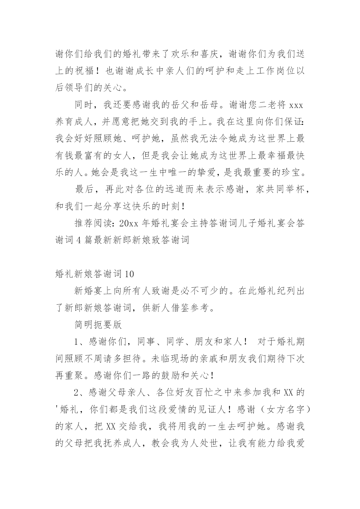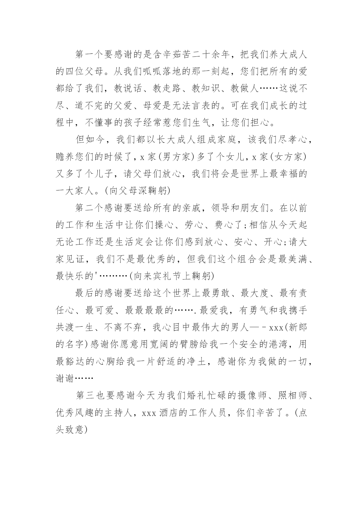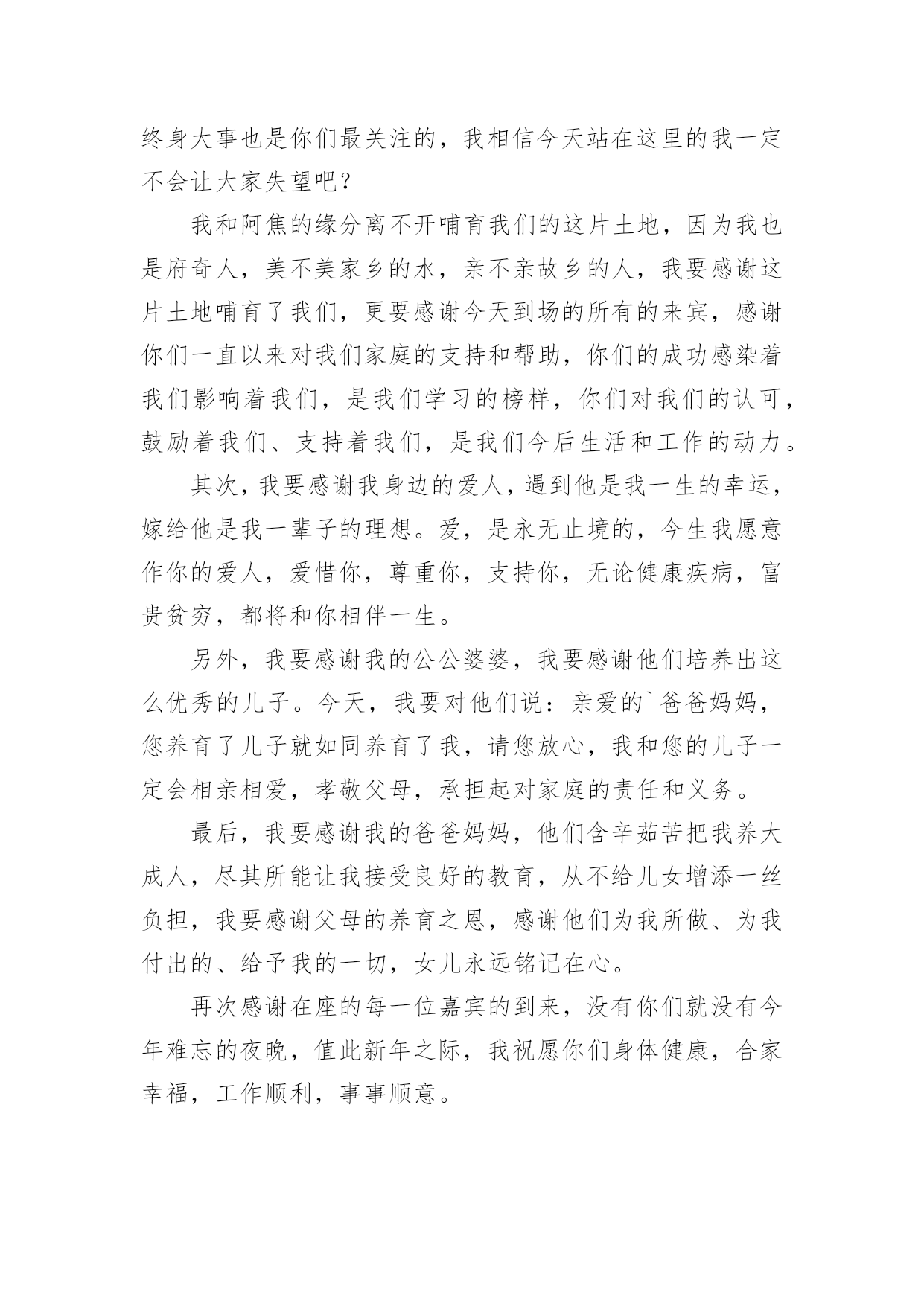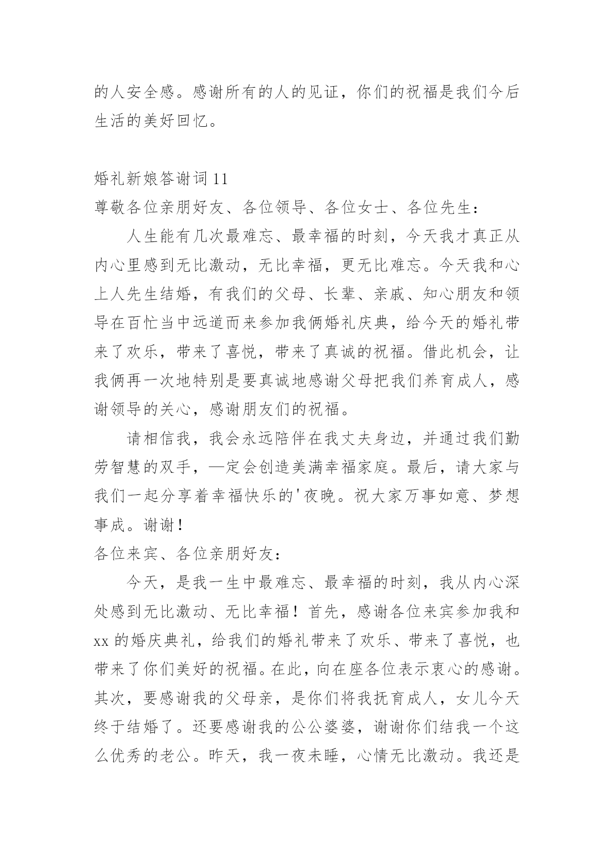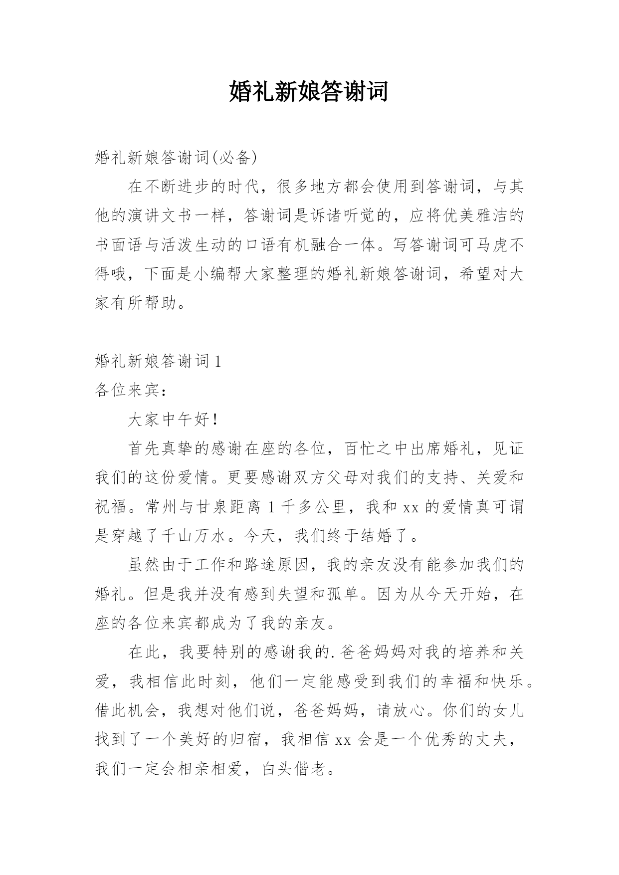 婚礼新娘答谢词婚礼新娘答谢词(必备)在不断进步的时代,很多地方都会使用到答谢词,与其他的演讲文书一样,答谢词是诉诸听觉的,应将优美雅洁的书面语与活泼生动的口语有机融合一体。写答谢词可马虎不得哦,下面是小编帮大家整理的婚礼新娘答谢词,希望对大家有所帮助。婚礼新娘答谢词1各位来宾:大家中午好!首先真挚的感谢在座的各位,百忙之中出席婚礼,见证我们的这份爱情。更要感谢双方父母对我们的支持、关爱和祝福。常州与甘泉距离1千多公里,我和xx的爱情真可谓是穿越了千山万水。今天,我们终于结婚了。虽然由于工作和路途原因,我的亲友没有能参加我们的婚礼。但是我并没有感到失望和孤单。因为从今天开始,在座的各位来宾都成为了我的亲友。在此,我要特别的感谢我的.爸爸妈妈对我的培养和关爱,我相信此时刻,他们一定能感受到我们的幸福和快乐。借此机会,我想对他们说,爸爸妈妈,请放心。你们的女儿找到了一个美好的归宿,我相信xx会是一个优秀的丈夫,我们一定会相亲相爱,白头偕老。最后,再此感谢大家的出席,祝大家身体健康,新年快乐!婚礼新娘答谢词2亲爱的叔叔阿姨、亲朋友好友感谢你们在百忙之中来到这里参加我们的答谢晚宴,一直以来你们的关心和爱护伴随着xxx的整个成长,对于他的终身大事也是你们最关注的,我相信今天站在这里的我一定不会让大家失望吧?我和xxx的缘分离不开哺育我们的这片土地,因为我也是府奇人,美不美家乡的.水,亲不亲故乡的人,我要感谢这片土地哺育了我们,更要感谢今天到场的所有的来宾,感谢你们一直以来对我们家庭的支持和帮助,你们的成功感染着我们影响着我们,是我们学习的榜样,你们对我们的认可,鼓励着我们、支持着我们,是我们今后生活和工作的动力。其次,我要感谢我身边的爱人,遇到他是我一生的幸运,嫁给他是我一辈子的理想。爱,是永无止境的,今生我愿意作你的爱人,爱惜你,尊重你,支持你,无论健康疾病,富贵贫穷,都将和你相伴一生。另外,我要感谢我的公公婆婆,我要感谢他们培养出这么优秀的儿子。今天,我要对他们说:亲爱的爸爸妈妈,您养育了儿子就如同养育了我,请您放心,我和您的儿子一定会相亲相爱,孝敬父母,承担起对家庭的责任和义务。最后,我要感谢我的爸爸妈妈,他们含辛茹苦把我养大成人,尽其所能让我接受良好的教育,从不给儿女增添一丝负担,我要感谢父母的养育之恩,感谢他们为我所做、为我付出的、给予我的一切,女儿永远铭记在心。再次感谢在座的每一位嘉宾的到来,没有你们就没有今年难忘的夜晚,值此新年之际,我祝愿你们身体健康,合家幸福,工作顺利,事事顺意。婚礼新娘答谢词3各位亲朋好友,各位领导,各位女士,各位先生:人生能有几次最难忘,最幸福的时刻,今天我才真正从内心里感到无比激动,无比幸福,更无比难忘。今天我和心上人―――小姐结婚,有我们的父母长辈,亲戚,知心朋友和领导在百忙当中远道而来参加我俩的婚礼庆典,给今天的婚礼带来了欢乐,带来了喜悦,带来了真诚的`祝福,借此机会,让我俩再一次地特别是要真诚地感谢父母把我们养育成人,感谢领导地关心,感谢朋友们的祝福。请相信,我会永远深爱着我的妻子,并通过我们勤劳智慧地双手,一定会创造美满幸福的家庭,最后,请大家与我们一起分享这幸福快乐地夜晚。祝大家万事如意,梦想成真。谢谢。婚礼新娘答谢词4亲爱的叔叔阿姨、亲朋友好友:感谢你们在百忙之中来到这里参加我们的答谢晚宴,一直以来你们的关心和爱护伴随着阿焦的整个成长,对于他的终身大事也是你们最关注的,我相信今天站在这里的我一定不会让大家失望吧?我和阿焦的缘分离不开哺育我们的这片土地,因为我也是府奇人,美不美家乡的水,亲不亲故乡的人,我要感谢这片土地哺育了我们,更要感谢今天到场的所有的来宾,感谢你们一直以来对我们家庭的支持和帮助,你们的成功感染着我们影响着我们,是我们学习的榜样,你们对我们的认可,鼓励着我们、支持着我们,是我们今后生活和工作的动力。其次,我要感谢我身边的爱人,遇到他是我一生的幸运,嫁给他是我一辈子的理想。爱,是永无止境的,今生我愿意作你的爱人,爱惜你,尊重你,支持你,无论健康疾病,富贵贫穷,都将和你相伴一生。另外,我要感谢我的公公婆婆,我要感谢他们培养出这么优秀的儿子。今天,我要对他们说:亲爱的`爸爸妈妈,您养育了儿子就如同养育了我,请您放心,我和您的儿子一定会相亲相爱,孝敬父母,承担起对家庭的责任和义务。最后,我要感谢我的爸爸妈妈,他们含辛茹苦把我养大成人,尽其所能让我接受良好的教育,从不给儿女增添一丝负担,我要感谢父母的养育之恩,感谢他们为我所做、为我付出的、给予我的一切,女儿永远铭记在心。再次感谢在座的每一位嘉宾的到来,没有你们就没有今年难忘的夜晚,值此新年之际,我祝愿你们身体健康,合家幸福,工作顺利,事事顺意。婚礼新娘答谢词5亲爱的各位来宾:大家好!感谢大家能从百忙的工作中抽出时间来出席我们的