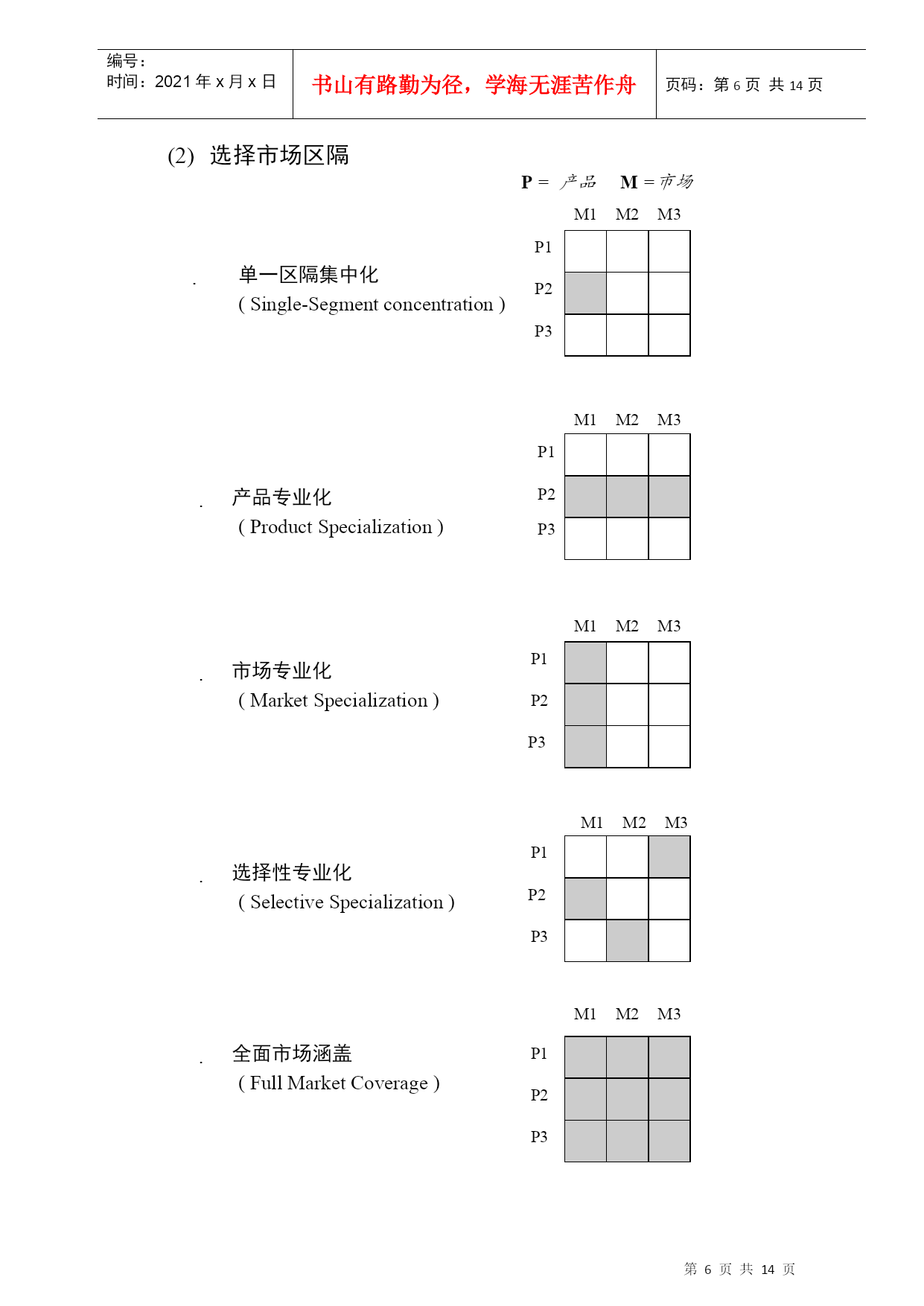 编号:时间:2021年x月x日书山有路勤为径,学海无涯苦作舟页码:第PAGE14页共NUMPAGES14页第PAGE\*MERGEFORMAT14页共NUMPAGES\*MERGEFORMAT14页目标市场分析与确定市场区隔化,选择目标市场及产品定位之步骤5.为每一目标市场发展产品定位.。6.针对每一目标市场发展一套行销组合。1.确认市场区隔化的基础。2.描述各市场区隔的概况。市场区隔化选择目标市场产品地位3.衡量市场区隔的吸引力。4.选择目标市场。市场区隔(MarketSegmentation)区隔市场的一般方式大量行销(Massmarketing)卖方以大量生产,广泛的配销通路及大量的促销活动来推销产品,为日常用品。产品多样化行销(Product-variety)卖方提供两种或多种不同外形,风格,品质,规格的产品。目标行销(Targetmarketing)小量行销,把市场分割成各具有独特风格的“迷你”市场,发展适合于每个市场区隔的产品和行销组合。市场区隔化的类型同质偏好(Homogeneouspreference)市场中所有消费者的偏好大致相同。分散偏好(Diffusedpreference)消费者对产品的需求极不相同。集群偏好(Clusteredpreference)自然市场区隔。市场中显示不同的偏好。市场区隔化之程序调查阶段了解:决策属性与重要性评比;产品使用形态;对各产品种类的消费态度;受访者在人口统计,心理与媒体选择方面的特性。分析阶段因素分析(Factoranalysis):剔除相关性高的变数。集群分析(Clusteranalysis):因素分析之后,确立不同特质的集群。剖划阶段依据分析结果,描述各集团的明确态度,行为,人口统计,心理特质,媒体消费特性等剖面。区隔消费者市场之基础地理变数地区,国家,行政区划,人口密度,气候。人口变数年龄,性别,家庭人数,家庭生命周期,所得,职业,教育水准,宗教信仰,种族,国籍。心理变数社会阶层,生活形态,个性(冲动,合群,权威,野心)。行为变数购买时机(经常性,特定性)追求利益(品质,服务,经济)使用者状况(非使用者;曾经,潜在,初次,经常使用者)使用率(轻度,中度,重度)忠诚度(绝对,适度,转移,变换)购买准备阶段(不知道,知道,很清楚,感兴趣,想买,决定买)态度(热衷,正面,无差异,负面,敌意)变数的交叉使用交叉变数的使用,可使市场区隔化,更为准确;并适用于不同时机、不同地区、、不同文化的,复杂又相关的市场变数。市场区隔的程序第一步列出可用的区隔变数第二步分析顾客的决策程序第三步运用区隔变数找出区隔第四步描述各区隔的特性(轮廓)第五步评估各市场区隔第六步选择目标市场有效区隔化之必备条件可衡量性(Measurability)市场区隔的大小及购买力可衡量的程度。足量性(Substantiality)市场区隔的大小及获利的程度,必须值得采取个别行销方案。可接近性(Accessibility)市场区隔能有效达到和有效为之服务的程度。购物地点固定,接触某一特定媒体的集群较易接近。持久性(Sustainability)市场区隔便于厂商巩固其产品的市场地位便于市场的长期培养。可行性(Actionability)公司由实力为各个区隔制定有效的行销方案。选择目标市场(Markettargeting)评估市场区隔市场区隔大小与成长(Segmentsize&growth)市场区隔大小与公司规模相对而言,成长可能性即潜在能力。市场区隔结构性吸引力(Segmentstructuralattractiveness)决定市场区隔结构性吸引力的五大力量:(流动性的威胁)潜在的进入者购买者(购买者议价力量)产业的竞争者(市场区隔内的对抗)供应商(供应商议价力量)替代品(替代性产品的威胁)竞争者多且强的市场区隔不具吸引力;会吸引新竞争者的则不是最理想;有潜在或可行替代品时,吸引力不高;购买者具强大议价力量的,不够吸引人。选择市场区隔P=产品M=市场M3M2M1P1单一区隔集中化(Single-Segmentconcentration)P2P3M3M2M1P1P2产品专业化(ProductSpecialization)P3P1M3M2M1市场专业化(MarketSpecialization)P2P3P1M3M2M1选择性专业化(Selec
