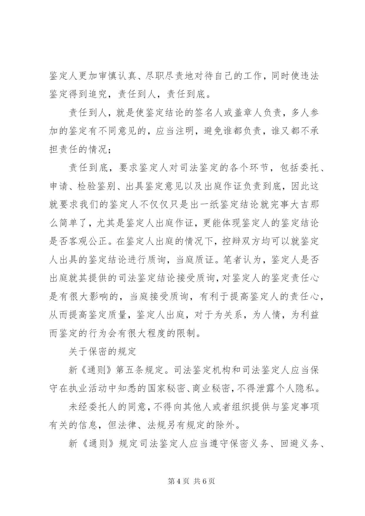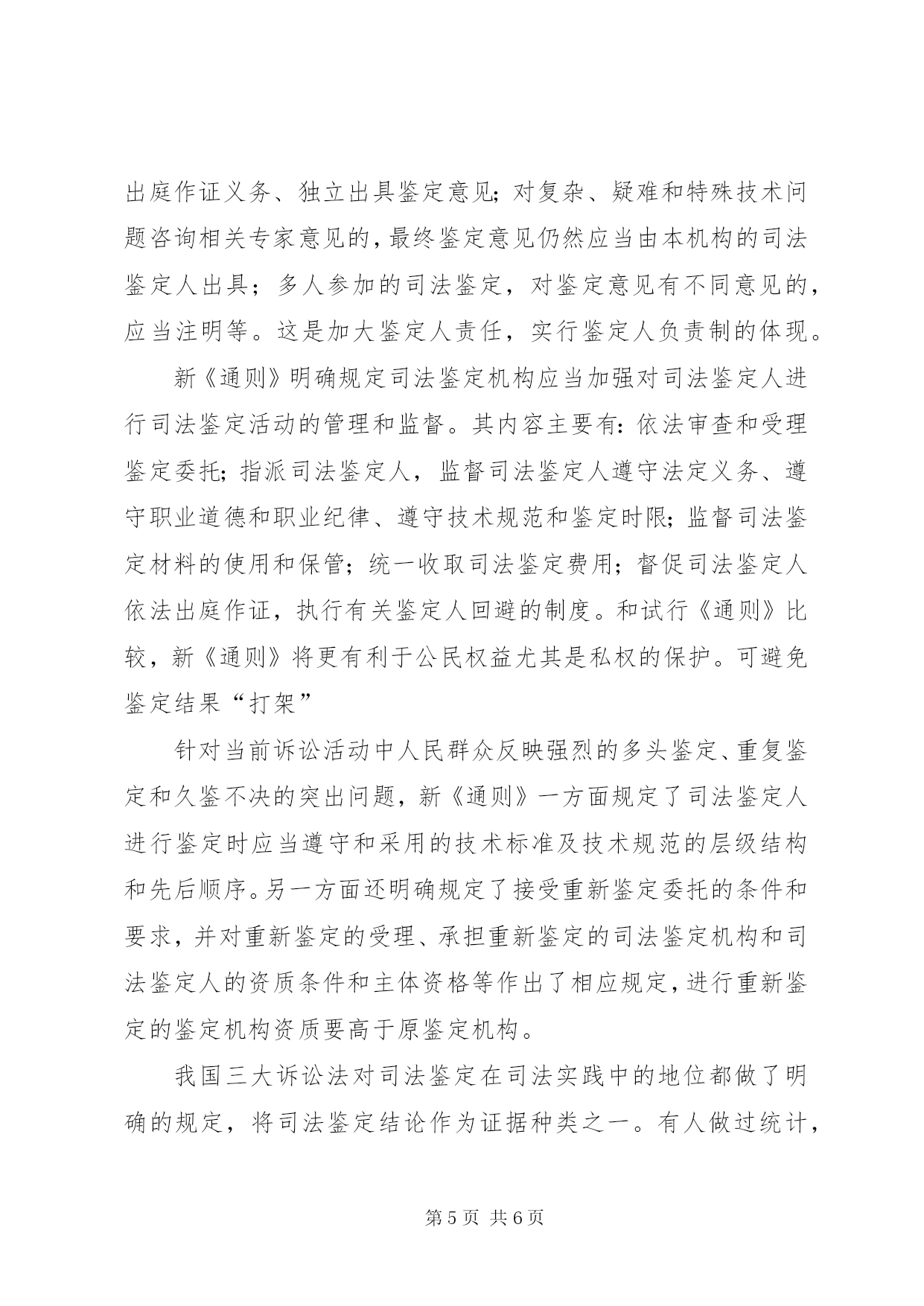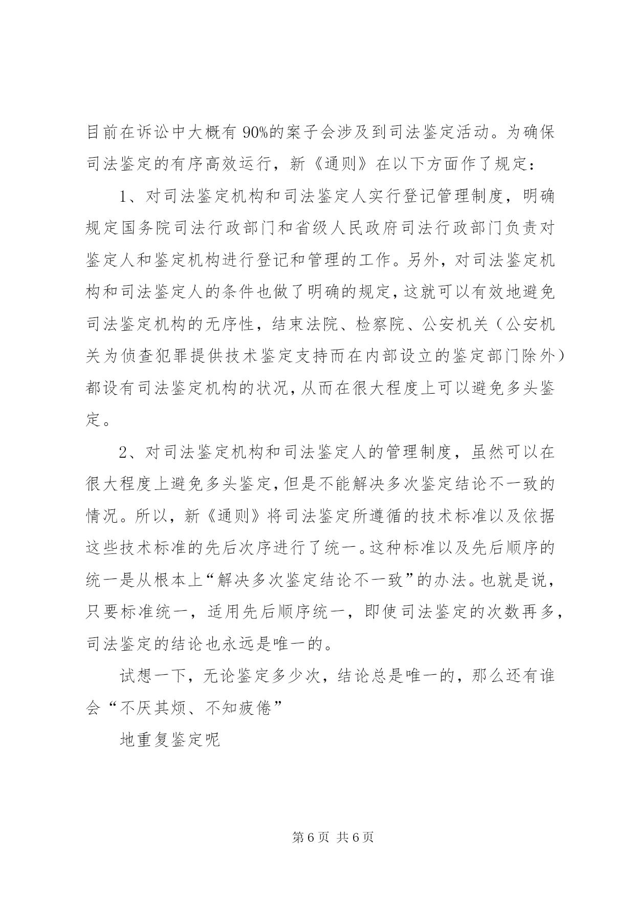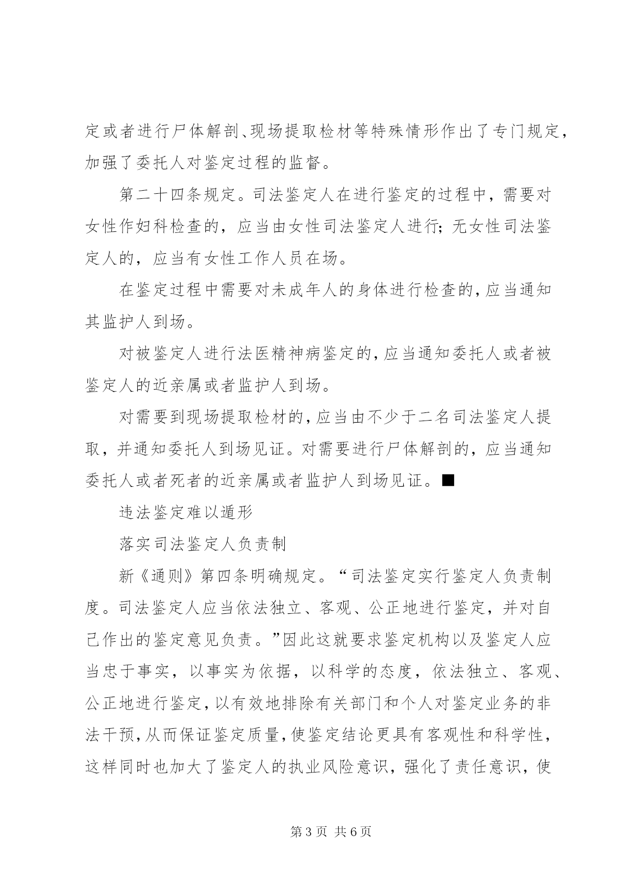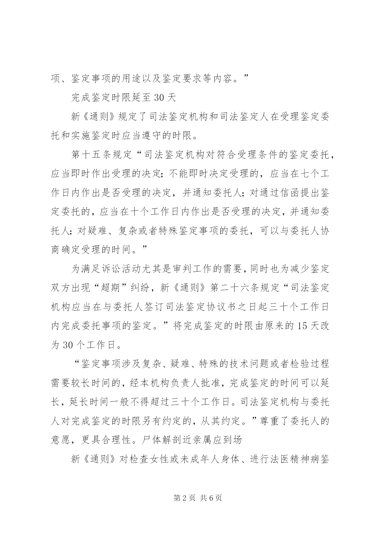 第PAGE\*Arabic\*MERGEFORMAT6页共NUMPAGES\*MERGEFORMAT6页聚焦新《司法鉴定程序通则》司法部于8月7日发布了新的《司法鉴定程序通则》(以下简称新《通则》),自2007年10月1日起施行,原《司法鉴定程序通则(试行)》同时废止。和试行了6年的原《通则》(试行)相比,新《通则》有哪些值得关注的变化呢。本版约请三位律师对此一一作了探讨。对突出问题作了调整新《通则》针对试行《通则》在鉴定实践中存在的突出问题,对许多内容作了调整和补充,主要体现在以下方面:个人委托将不再受限新《通则》对委托人限制的取消,使公民个人委托司法鉴定的渠道更加畅通。试行《通则》规定。“司法鉴定机构接受司法机关、仲裁案件当事人的司法鉴定委托。在诉讼案件中,在当事人负有举证责任的情况下,司法鉴定机构也可以接受当事人的司法鉴定委托。当事人委托司法鉴定时一般通过律师事务所进行。”虽然个人也可委托司法鉴定,但有着颇多限制条件。为了确保司法鉴定活动依法规范进行,新《通则》还增加了“司法鉴定协议书”的内容和司法鉴定机构不得受理委托的一些情形。新《通则》第十二条规定:“鉴定委托书应当载明委托人的名称或者姓名、拟委托的司法鉴定机构的名称、委托鉴定的事项、鉴定事项的用途以及鉴定要求等内容。”完成鉴定时限延至30天新《通则》规定了司法鉴定机构和司法鉴定人在受理鉴定委托和实施鉴定时应当遵守的时限。第十五条规定“司法鉴定机构对符合受理条件的鉴定委托,应当即时作出受理的决定;不能即时决定受理的,应当在七个工作日内作出是否受理的决定,并通知委托人;对通过信函提出鉴定委托的,应当在十个工作日内作出是否受理的决定,并通知委托人;对疑难、复杂或者特殊鉴定事项的委托,可以与委托人协商确定受理的时间。”为满足诉讼活动尤其是审判工作的需要,同时也为减少鉴定双方出现“超期”纠纷,新《通则》第二十六条规定“司法鉴定机构应当在与委托人签订司法鉴定协议书之日起三十个工作日内完成委托事项的鉴定。”将完成鉴定的时限由原来的15天改为30个工作日。“鉴定事项涉及复杂、疑难、特殊的技术问题或者检验过程需要较长时间的,经本机构负责人批准,完成鉴定的时间可以延长,延长时间一般不得超过三十个工作日。司法鉴定机构与委托人对完成鉴定的时限另有约定的,从其约定。”尊重了委托人的意愿,更具合理性。尸体解剖近亲属应到场新《通则》对检查女性或未成年人身体、进行法医精神病鉴定或者进行尸体解剖、现场提取检材等特殊情形作出了专门规定,加强了委托人对鉴定过程的监督。第二十四条规定。司法鉴定人在进行鉴定的过程中,需要对女性作妇科检查的,应当由女性司法鉴定人进行;无女性司法鉴定人的,应当有女性工作人员在场。在鉴定过程中需要对未成年人的身体进行检查的,应当通知其监护人到场。对被鉴定人进行法医精神病鉴定的,应当通知委托人或者被鉴定人的近亲属或者监护人到场。对需要到现场提取检材的,应当由不少于二名司法鉴定人提取,并通知委托人到场见证。对需要进行尸体解剖的,应当通知委托人或者死者的近亲属或者监护人到场见证。■违法鉴定难以遁形落实司法鉴定人负责制新《通则》第四条明确规定。“司法鉴定实行鉴定人负责制度。司法鉴定人应当依法独立、客观、公正地进行鉴定,并对自己作出的鉴定意见负责。”因此这就要求鉴定机构以及鉴定人应当忠于事实,以事实为依据,以科学的态度,依法独立、客观、公正地进行鉴定,以有效地排除有关部门和个人对鉴定业务的非法干预,从而保证鉴定质量,使鉴定结论更具有客观性和科学性,这样同时也加大了鉴定人的执业风险意识,强化了责任意识,使鉴定人更加审慎认真、尽职尽责地对待自己的工作,同时使违法鉴定得到追究,责任到人,责任到底。责任到人,就是使鉴定结论的签名人或盖章人负责,多人参加的鉴定有不同意见的,应当注明,避免谁都负责,谁又都不承担责任的情况;责任到底,要求鉴定人对司法鉴定的各个环节,包括委托、申请、检验鉴别、出具鉴定意见以及出庭作证负责到底,因此这就要求我们的鉴定人不仅仅只是出一纸鉴定结论就完事大吉那么简单了,尤其是鉴定人出庭作证,更能体现鉴定人的鉴定结论是否客观公正。在鉴定人出庭的情况下,控辩双方均可以就鉴定人出具的鉴定结论进行质询,当庭质证。笔者认为,鉴定人是否出庭就其提供的司法鉴定结论接受质询,对鉴定人的鉴定责任心是有很大影响的,当庭接受质询,有利于提高鉴定人的责任心,从而提高鉴定质量,鉴定人出庭,对于为关系,为人情,为利益而鉴定的行为会有很大程度的限制。关于保密的规定新《通则》第五条规定。司法鉴定机构和司法鉴定人应当保守在执业活动中知悉的国家秘密、商业秘密,不得泄露个人隐私。未经委托人的同意,不得向其他人或者组织提供与鉴定事项有关的信息,但法律、法规另有规定的除外。新《通则》规定司法鉴定