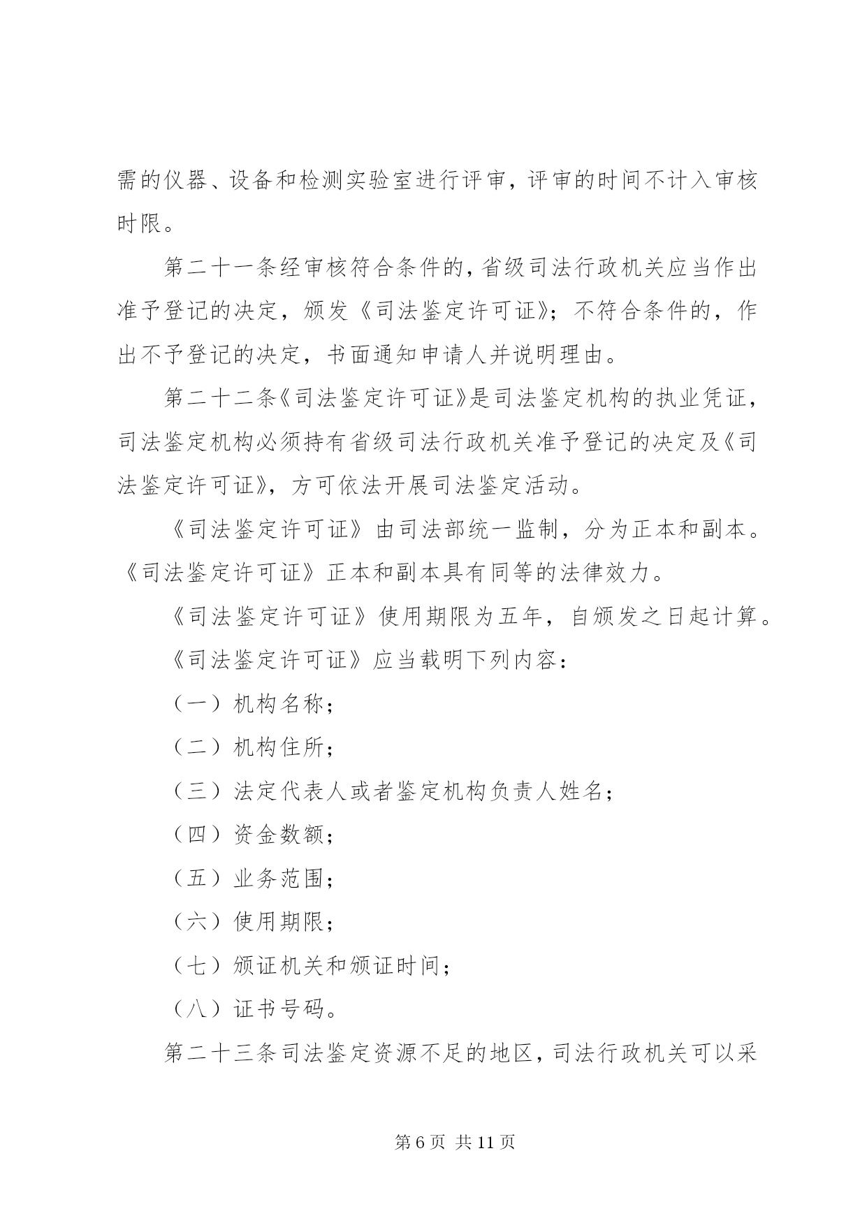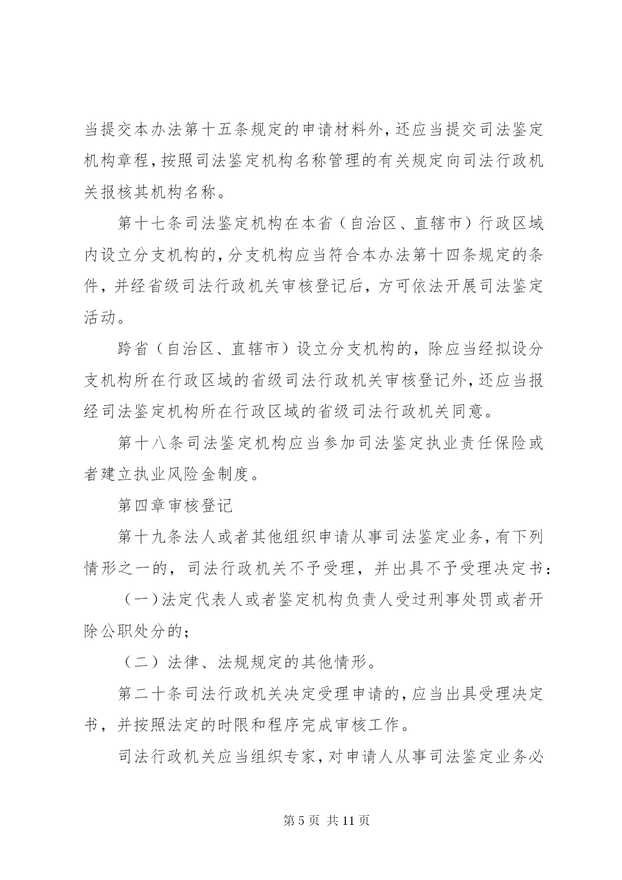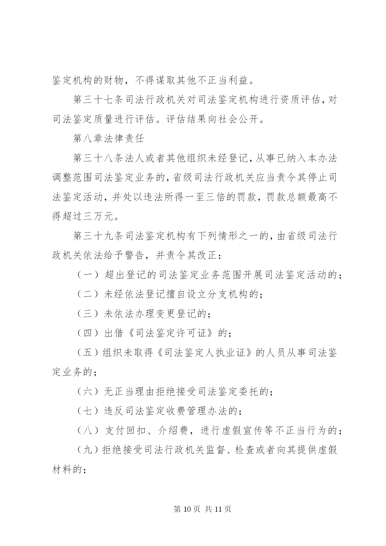 第PAGE\*Arabic\*MERGEFORMAT11页共NUMPAGES\*MERGEFORMAT11页司法鉴定机构管理制度第一章总则第一条为了加强对司法鉴定机构的管理,规范司法鉴定活动,建立统一的司法鉴定管理体制,适应司法机关和公民、组织的诉讼需要,保障当事人的诉讼权利,促进司法公正与效率,根据《全国人民代表大会常务委员会关于司法鉴定管理问题的决定》和其他相关法律、法规,制定本办法。第二条司法鉴定机构从事《全国人民代表大会常务委员会关于司法鉴定管理问题的决定》第二条规定的司法鉴定业务,适用本办法。第三条本办法所称的司法鉴定机构是指从事《全国人民代表大会常务委员会关于司法鉴定管理问题的决定》第二条规定的司法鉴定业务的法人或者其他组织。司法鉴定机构是司法鉴定人的执业机构,应当具备本办法规定的条件,经省级司法行政机关审核登记,取得《司法鉴定许可证》,在登记的司法鉴定业务范围内,开展司法鉴定活动。第四条司法鉴定管理实行行政管理与行业管理相结合的管理制度。司法行政机关对司法鉴定机构及其司法鉴定活动依法进行指导、管理和监督、检查。司法鉴定行业协会依法进行自律管理。第五条全国实行统一的司法鉴定机构及司法鉴定人审核登记、名册编制和名册公告制度。第六条司法鉴定机构的发展应当符合统筹规划、合理布局、优化结构、有序发展的要求。第七条司法鉴定机构开展司法鉴定活动应当遵循合法、中立、规范、及时的原则。第八条司法鉴定机构统一接受委托,组织所属的司法鉴定人开展司法鉴定活动,遵守法律、法规和有关制度,执行统一的司法鉴定实施程序、技术标准和技术操作规范。第二章主管机关第九条司法部负责全国司法鉴定机构的登记管理工作,依法履行下列职责:(一)制定全国司法鉴定发展规划并指导实施;(二)指导和监督省级司法行政机关对司法鉴定机构的审核登记、名册编制和名册公告工作;(三)制定全国统一的司法鉴定机构资质管理评估制度和司法鉴定质量管理评估制度并指导实施;(四)组织制定全国统一的司法鉴定实施程序、技术标准和技术操作规范等司法鉴定技术管理制度并指导实施;(五)指导司法鉴定科学技术研究、开发、引进与推广,组织司法鉴定业务的中外交流与合作;(六)法律、法规规定的其他职责。第十条省级司法行政机关负责本行政区域内司法鉴定机构登记管理工作,依法履行下列职责:(一)制定本行政区域司法鉴定发展规划并组织实施;(二)负责司法鉴定机构的审核登记、名册编制和名册公告工作;(三)负责司法鉴定机构的资质管理评估和司法鉴定质量管理评估工作;(四)负责对司法鉴定机构进行监督、检查;(五)负责对司法鉴定机构违法违纪的执业行为进行调查处理;(六)组织司法鉴定科学技术开发、推广和应用;(七)法律、法规和规章规定的其他职责。第十一条省级司法行政机关可以委托下一级司法行政机关协助办理本办法第十条规定的有关工作。第十二条司法行政机关负责监督指导司法鉴定行业协会及其专业委员会依法开展活动。第三章申请登记第十三条司法鉴定机构的登记事项包括。名称、住所、法定代表人或者鉴定机构负责人、资金数额、仪器设备和实验室、司法鉴定人、司法鉴定业务范围等。第十四条法人或者其他组织申请从事司法鉴定业务,应当具备下列条件:(一)有自己的名称、住所;(二)有不少于二十万至一百万元人民币的资金;(三)有明确的司法鉴定业务范围;(四)有在业务范围内进行司法鉴定必需的仪器、设备;(五)有在业务范围内进行司法鉴定必需的依法通过计量认证或者实验室认可的检测实验室;(六)每项司法鉴定业务有三名以上司法鉴定人。第十五条法人或者其他组织申请从事司法鉴定业务,应当提交下列申请材料:(一)申请表;(二)证明申请者身份的相关文件;(三)住所证明和资金证明;(四)相关的行业资格、资质证明;(五)仪器、设备说明及所有权凭证;(六)检测实验室相关资料;(七)司法鉴定人申请执业的相关材料;(八)相关的内部管理制度材料;(九)应当提交的其他材料。申请人应当对申请材料的真实性、完整性和可靠性负责。第十六条申请设立具有独立法人资格的司法鉴定机构,除应当提交本办法第十五条规定的申请材料外,还应当提交司法鉴定机构章程,按照司法鉴定机构名称管理的有关规定向司法行政机关报核其机构名称。第十七条司法鉴定机构在本省(自治区、直辖市)行政区域内设立分支机构的,分支机构应当符合本办法第十四条规定的条件,并经省级司法行政机关审核登记后,方可依法开展司法鉴定活动。跨省(自治区、直辖市)设立分支机构的,除应当经拟设分支机构所在行政区域的省级司法行政机关审核登记外,还应当报经司法鉴定机构所在行政区域的省级司法行政机关同意。第十八条司法鉴定机构应当参加司法鉴定执业责任保险或者建立执业风险金制度。第四章审核登记第十九条法人或者其他组织申请从事司法鉴定业务,有下列情形之一的,司