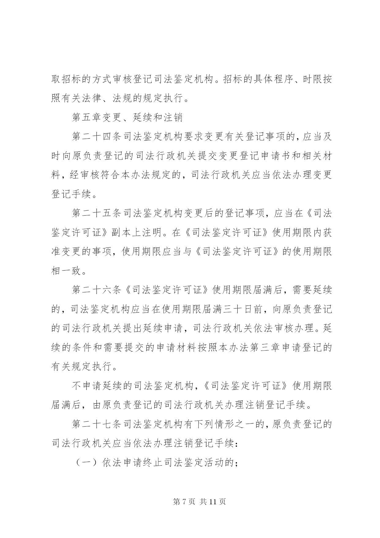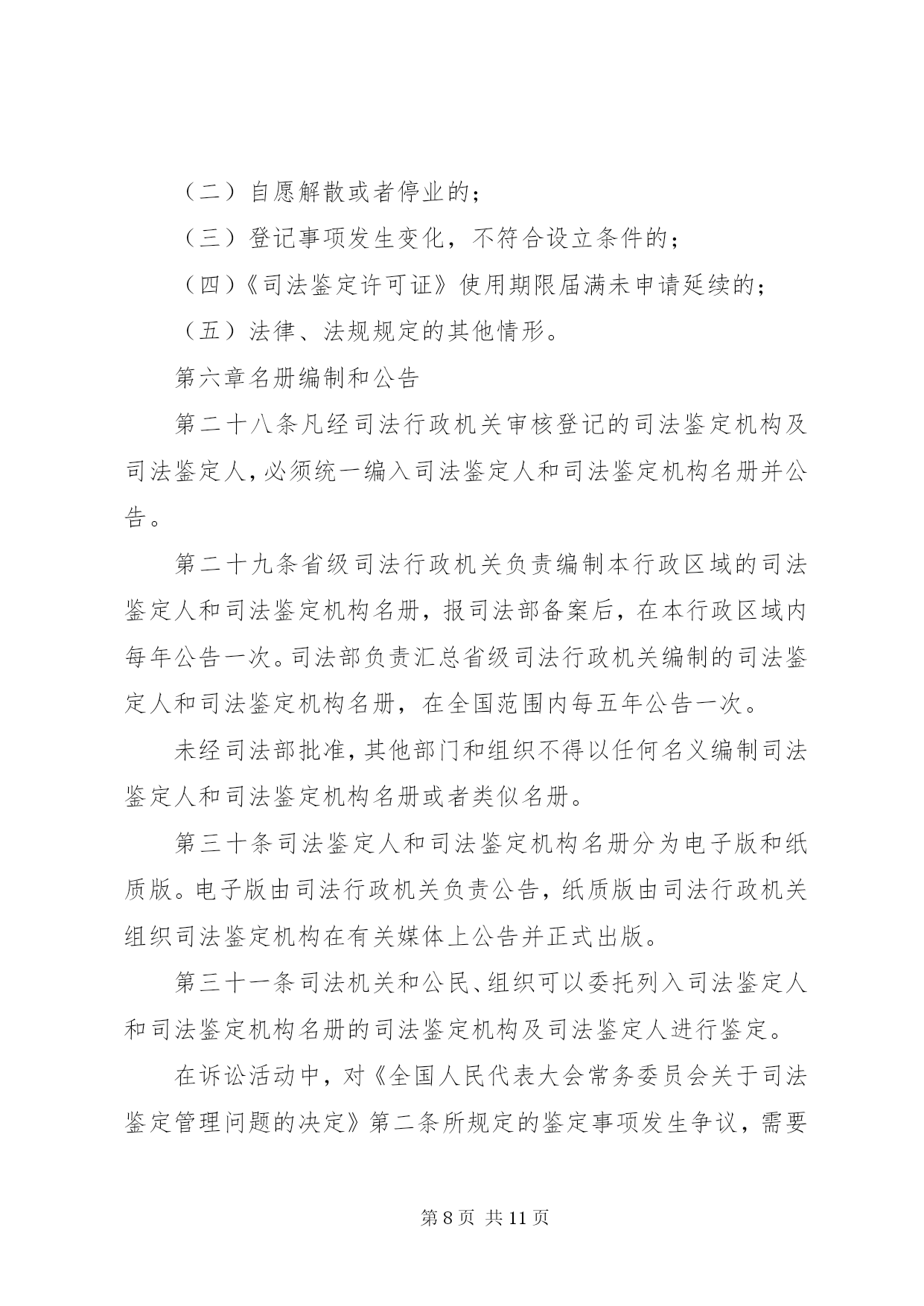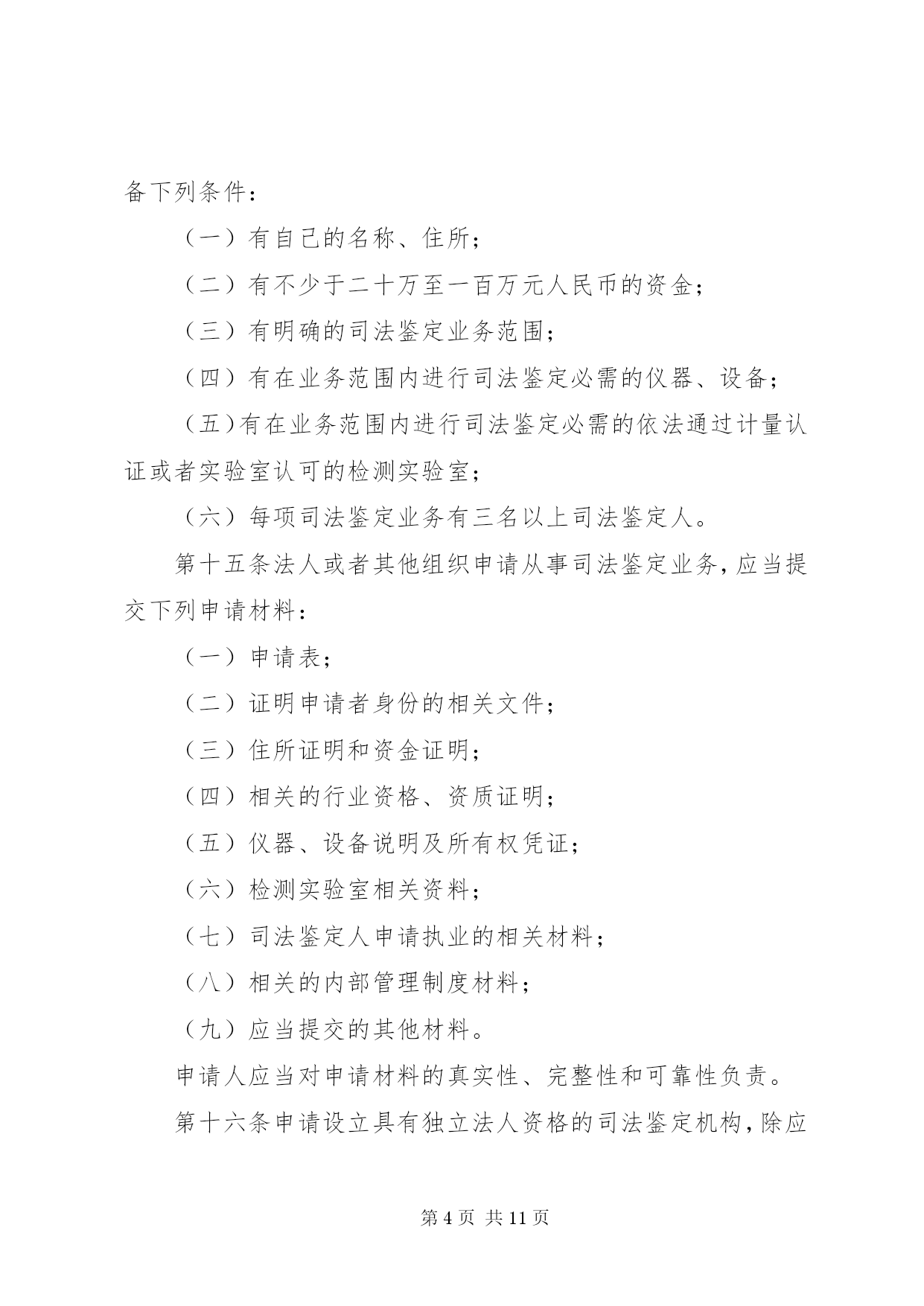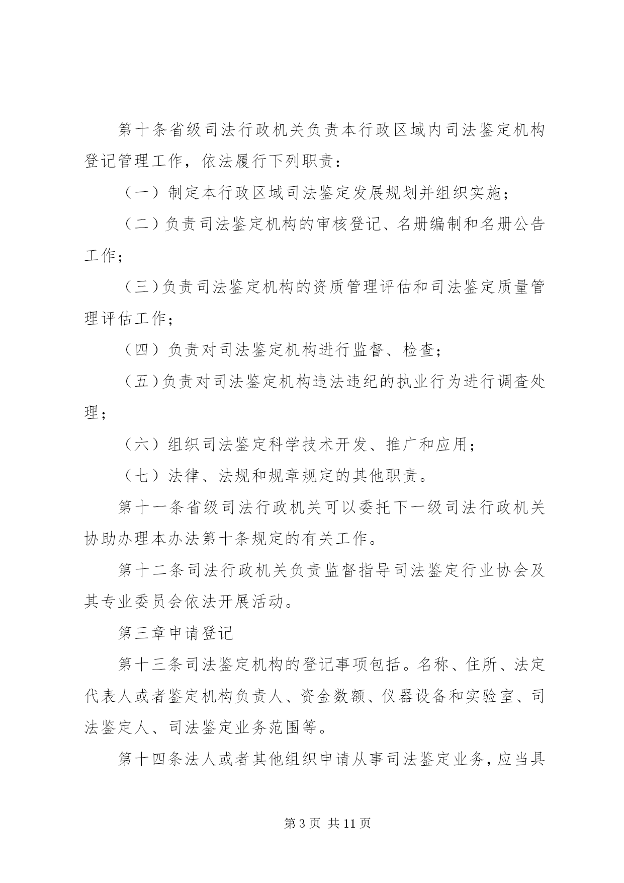 第PAGE\*Arabic\*MERGEFORMAT11页共NUMPAGES\*MERGEFORMAT11页司法鉴定机构管理制度第一章总则第一条为了加强对司法鉴定机构的管理,规范司法鉴定活动,建立统一的司法鉴定管理体制,适应司法机关和公民、组织的诉讼需要,保障当事人的诉讼权利,促进司法公正与效率,根据《全国人民代表大会常务委员会关于司法鉴定管理问题的决定》和其他相关法律、法规,制定本办法。第二条司法鉴定机构从事《全国人民代表大会常务委员会关于司法鉴定管理问题的决定》第二条规定的司法鉴定业务,适用本办法。第三条本办法所称的司法鉴定机构是指从事《全国人民代表大会常务委员会关于司法鉴定管理问题的决定》第二条规定的司法鉴定业务的法人或者其他组织。司法鉴定机构是司法鉴定人的执业机构,应当具备本办法规定的条件,经省级司法行政机关审核登记,取得《司法鉴定许可证》,在登记的司法鉴定业务范围内,开展司法鉴定活动。第四条司法鉴定管理实行行政管理与行业管理相结合的管理制度。司法行政机关对司法鉴定机构及其司法鉴定活动依法进行指导、管理和监督、检查。司法鉴定行业协会依法进行自律管理。第五条全国实行统一的司法鉴定机构及司法鉴定人审核登记、名册编制和名册公告制度。第六条司法鉴定机构的发展应当符合统筹规划、合理布局、优化结构、有序发展的要求。第七条司法鉴定机构开展司法鉴定活动应当遵循合法、中立、规范、及时的原则。第八条司法鉴定机构统一接受委托,组织所属的司法鉴定人开展司法鉴定活动,遵守法律、法规和有关制度,执行统一的司法鉴定实施程序、技术标准和技术操作规范。第二章主管机关第九条司法部负责全国司法鉴定机构的登记管理工作,依法履行下列职责:(一)制定全国司法鉴定发展规划并指导实施;(二)指导和监督省级司法行政机关对司法鉴定机构的审核登记、名册编制和名册公告工作;(三)制定全国统一的司法鉴定机构资质管理评估制度和司法鉴定质量管理评估制度并指导实施;(四)组织制定全国统一的司法鉴定实施程序、技术标准和技术操作规范等司法鉴定技术管理制度并指导实施;(五)指导司法鉴定科学技术研究、开发、引进与推广,组织司法鉴定业务的中外交流与合作;(六)法律、法规规定的其他职责。第十条省级司法行政机关负责本行政区域内司法鉴定机构登记管理工作,依法履行下列职责:(一)制定本行政区域司法鉴定发展规划并组织实施;(二)负责司法鉴定机构的审核登记、名册编制和名册公告工作;(三)负责司法鉴定机构的资质管理评估和司法鉴定质量管理评估工作;(四)负责对司法鉴定机构进行监督、检查;(五)负责对司法鉴定机构违法违纪的执业行为进行调查处理;(六)组织司法鉴定科学技术开发、推广和应用;(七)法律、法规和规章规定的其他职责。第十一条省级司法行政机关可以委托下一级司法行政机关协助办理本办法第十条规定的有关工作。第十二条司法行政机关负责监督指导司法鉴定行业协会及其专业委员会依法开展活动。第三章申请登记第十三条司法鉴定机构的登记事项包括。名称、住所、法定代表人或者鉴定机构负责人、资金数额、仪器设备和实验室、司法鉴定人、司法鉴定业务范围等。第十四条法人或者其他组织申请从事司法鉴定业务,应当具备下列条件:(一)有自己的名称、住所;(二)有不少于二十万至一百万元人民币的资金;(三)有明确的司法鉴定业务范围;(四)有在业务范围内进行司法鉴定必需的仪器、设备;(五)有在业务范围内进行司法鉴定必需的依法通过计量认证或者实验室认可的检测实验室;(六)每项司法鉴定业务有三名以上司法鉴定人。第十五条法人或者其他组织申请从事司法鉴定业务,应当提交下列申请材料:(一)申请表;(二)证明申请者身份的相关文件;(三)住所证明和资金证明;(四)相关的行业资格、资质证明;(五)仪器、设备说明及所有权凭证;(六)检测实验室相关资料;(七)司法鉴定人申请执业的相关材料;(八)相关的内部管理制度材料;(九)应当提交的其他材料。申请人应当对申请材料的真实性、完整性和可靠性负责。第十六条申请设立具有独立法人资格的司法鉴定机构,除应当提交本办法第十五条规定的申请材料外,还应当提交司法鉴定机构章程,按照司法鉴定机构名称管理的有关规定向司法行政机关报核其机构名称。第十七条司法鉴定机构在本省(自治区、直辖市)行政区域内设立分支机构的,分支机构应当符合本办法第十四条规定的条件,并经省级司法行政机关审核登记后,方可依法开展司法鉴定活动。跨省(自治区、直辖市)设立分支机构的,除应当经拟设分支机构所在行政区域的省级司法行政机关审核登记外,还应当报经司法鉴定机构所在行政区域的省级司法行政机关同意。第十八条司法鉴定机构应当参加司法鉴定执业责任保险或者建立执业风险金制度。第四章审核登记第十九条法人或者其他组织申请从事司法鉴定业务,有下列情形之一的,司