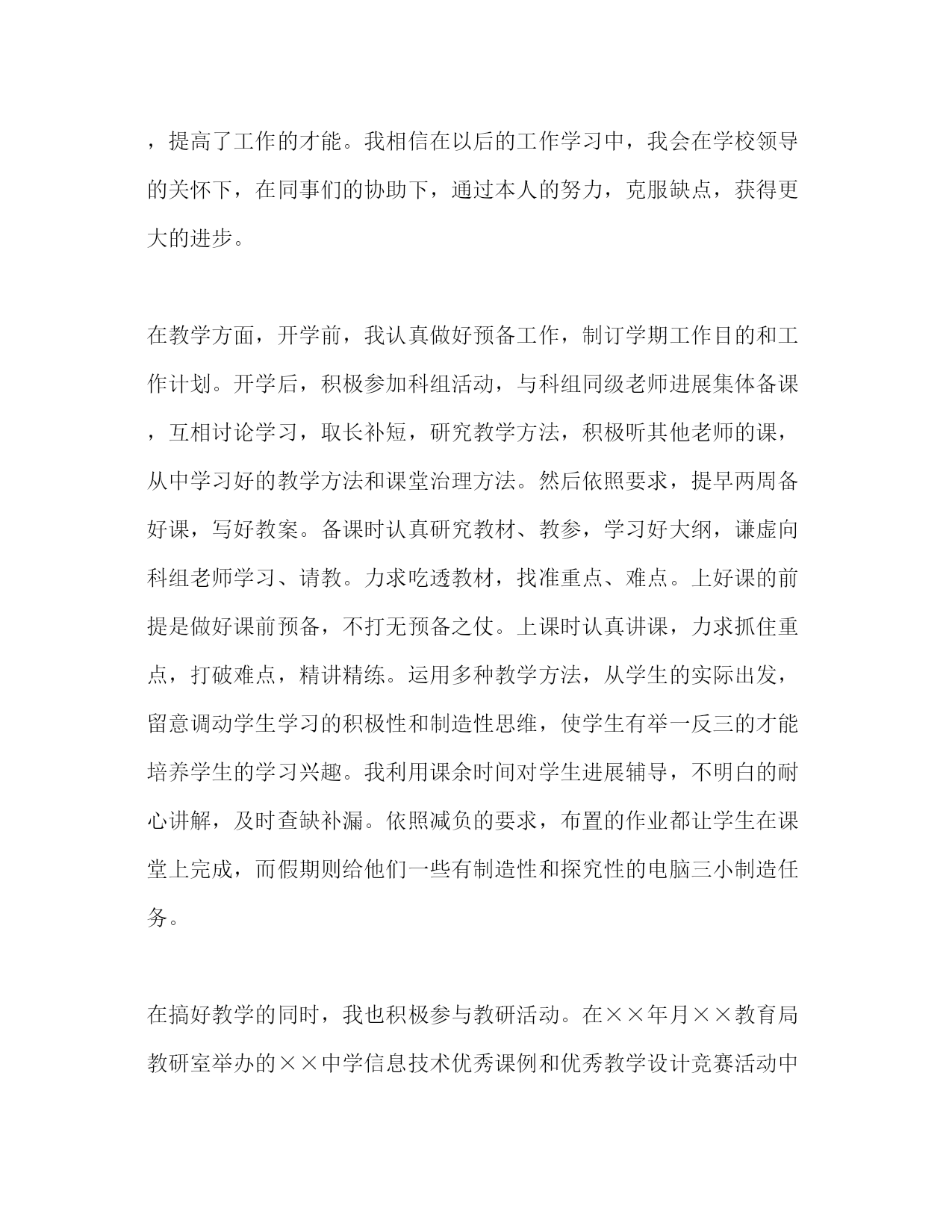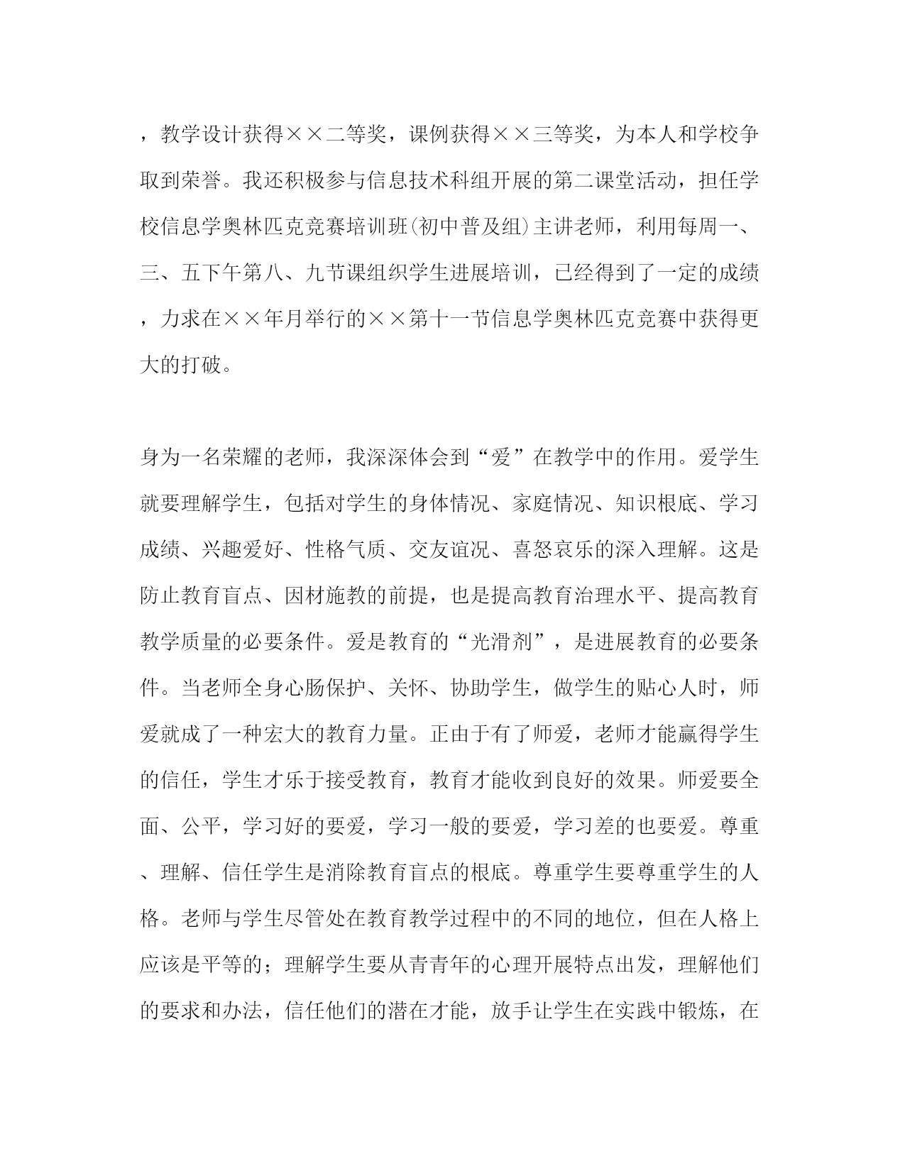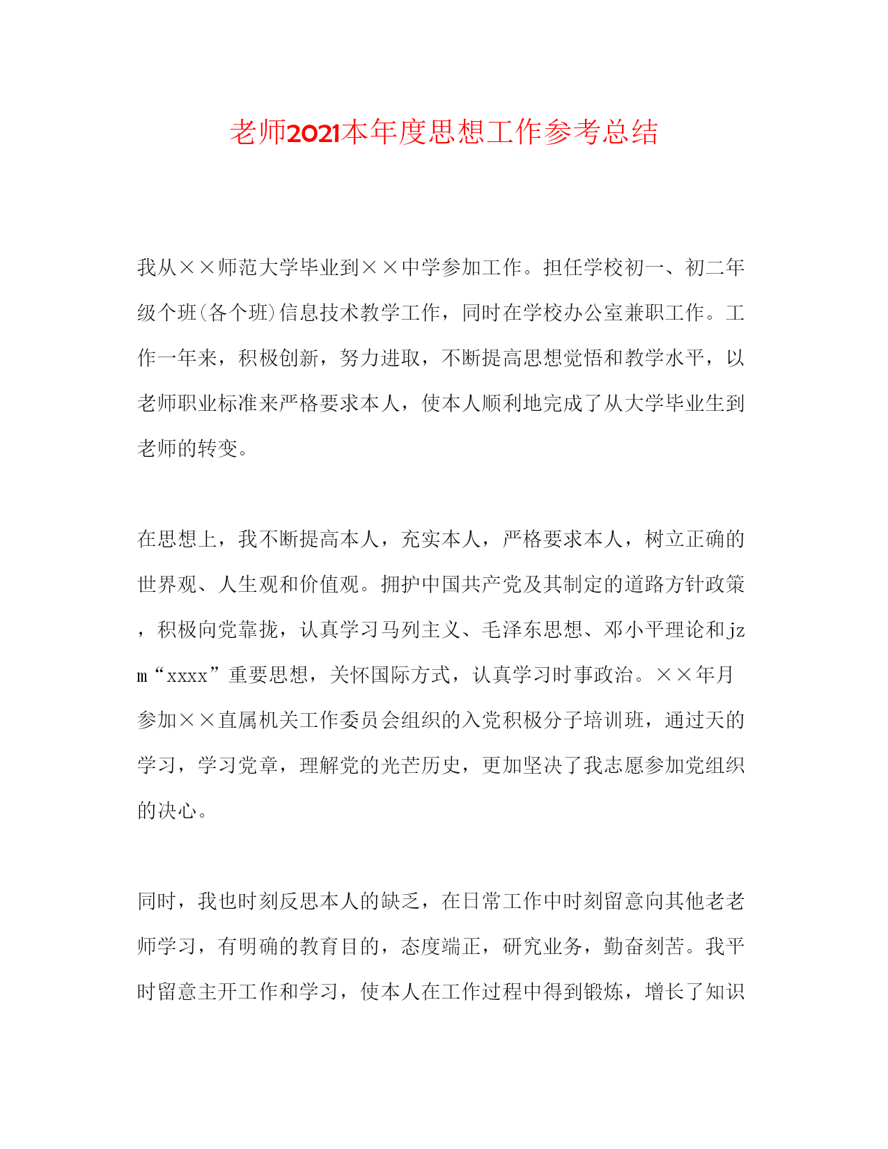 老师2021本年度思想工作参考总结我从××师范大学毕业到××中学参加工作。担任学校初一、初二年级个班(各个班)信息技术教学工作,同时在学校办公室兼职工作。工作一年来,积极创新,努力进取,不断提高思想觉悟和教学水平,以老师职业标准来严格要求本人,使本人顺利地完成了从大学毕业生到老师的转变。在思想上,我不断提高本人,充实本人,严格要求本人,树立正确的世界观、人生观和价值观。拥护中国共产党及其制定的道路方针政策,积极向党靠拢,认真学习马列主义、毛泽东思想、邓小平理论和jzm“xxxx”重要思想,关怀国际方式,认真学习时事政治。××年月参加××直属机关工作委员会组织的入党积极分子培训班,通过天的学习,学习党章,理解党的光芒历史,更加坚决了我志愿参加党组织的决心。同时,我也时刻反思本人的缺乏,在日常工作中时刻留意向其他老老师学习,有明确的教育目的,态度端正,研究业务,勤奋刻苦。我平时留意主开工作和学习,使本人在工作过程中得到锻炼,增长了知识,提高了工作的才能。我相信在以后的工作学习中,我会在学校领导的关怀下,在同事们的协助下,通过本人的努力,克服缺点,获得更大的进步。在教学方面,开学前,我认真做好预备工作,制订学期工作目的和工作计划。开学后,积极参加科组活动,与科组同级老师进展集体备课,互相讨论学习,取长补短,研究教学方法,积极听其他老师的课,从中学习好的教学方法和课堂治理方法。然后依照要求,提早两周备好课,写好教案。备课时认真研究教材、教参,学习好大纲,谦虚向科组老师学习、请教。力求吃透教材,找准重点、难点。上好课的前提是做好课前预备,不打无预备之仗。上课时认真讲课,力求抓住重点,打破难点,精讲精练。运用多种教学方法,从学生的实际出发,留意调动学生学习的积极性和制造性思维,使学生有举一反三的才能培养学生的学习兴趣。我利用课余时间对学生进展辅导,不明白的耐心讲解,及时查缺补漏。依照减负的要求,布置的作业都让学生在课堂上完成,而假期则给他们一些有制造性和探究性的电脑三小制造任务。在搞好教学的同时,我也积极参与教研活动。在××年月××教育局教研室举办的××中学信息技术优秀课例和优秀教学设计竞赛活动中,教学设计获得××二等奖,课例获得××三等奖,为本人和学校争取到荣誉。我还积极参与信息技术科组开展的第二课堂活动,担任学校信息学奥林匹克竞赛培训班(初中普及组)主讲老师,利用每周一、三、五下午第八、九节课组织学生进展培训,已经得到了一定的成绩,力求在××年月举行的××第十一节信息学奥林匹克竞赛中获得更大的打破。身为一名荣耀的老师,我深深体会到“爱”在教学中的作用。爱学生就要理解学生,包括对学生的身体情况、家庭情况、知识根底、学习成绩、兴趣爱好、性格气质、交友谊况、喜怒哀乐的深入理解。这是防止教育盲点、因材施教的前提,也是提高教育治理水平、提高教育教学质量的必要条件。爱是教育的“光滑剂”,是进展教育的必要条件。当老师全身心肠保护、关怀、协助学生,做学生的贴心人时,师爱就成了一种宏大的教育力量。正由于有了师爱,老师才能赢得学生的信任,学生才乐于接受教育,教育才能收到良好的效果。师爱要全面、公平,学习好的要爱,学习一般的要爱,学习差的也要爱。尊重、理解、信任学生是消除教育盲点的根底。尊重学生要尊重学生的人格。老师与学生尽管处在教育教学过程中的不同的地位,但在人格上应该是平等的;理解学生要从青青年的心理开展特点出发,理解他们的要求和办法,信任他们的潜在才能,放手让学生在实践中锻炼,在磨练中成长。只有如此,学生才能与老师缩小心理间隔,学生才会对老师产生情感。我更深入地认识到老师要热爱每一个学生,尤其是对待后进生要多给一些暖和,用“爱”字改变他们,理解尊重信任他们。爱学生确实是要严格要求学生,对其缺点错误,不纵容、不姑息、不放任。师爱既包含着强烈的情感色彩,又表现出深入的理智,不仅着眼于学生目前的得失和苦乐,更注重学生将来的开展和前途。