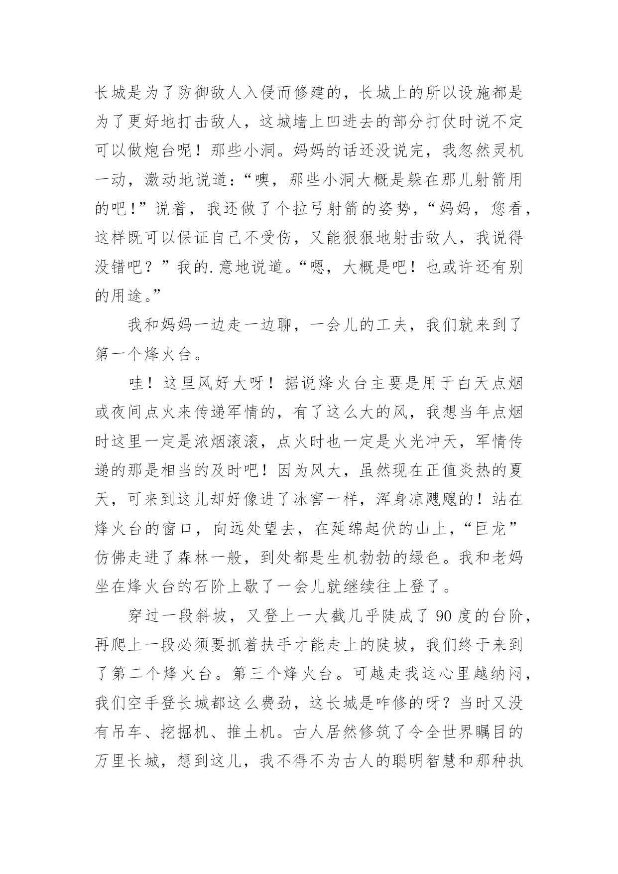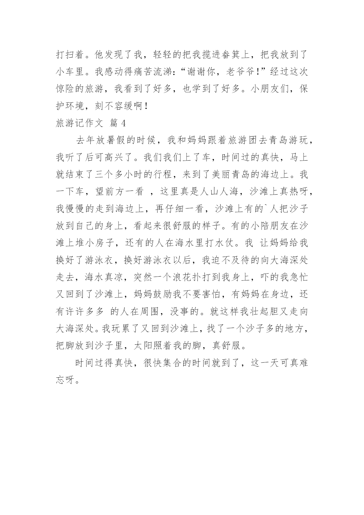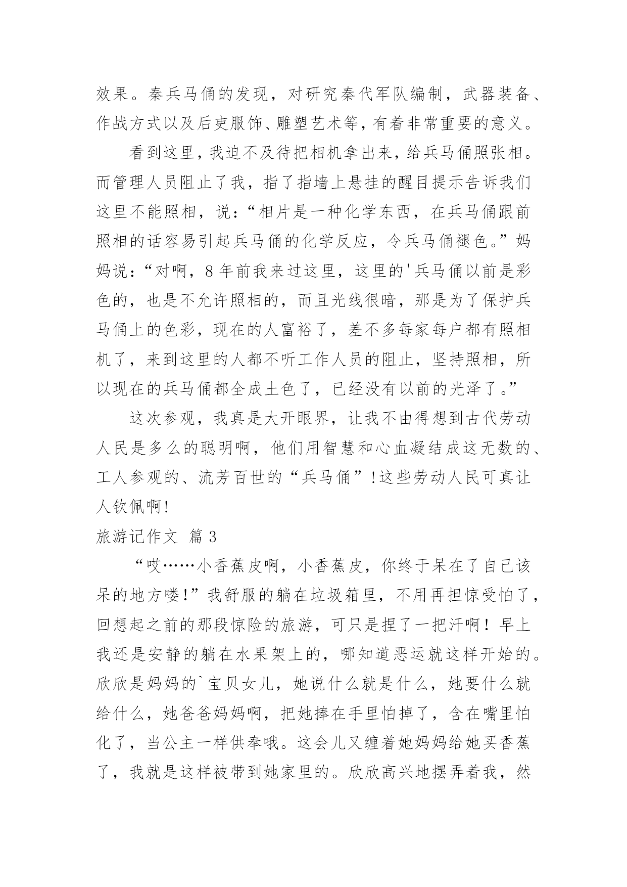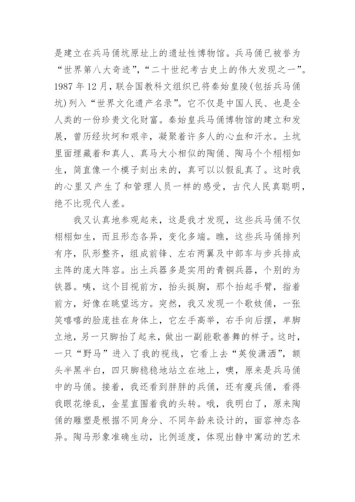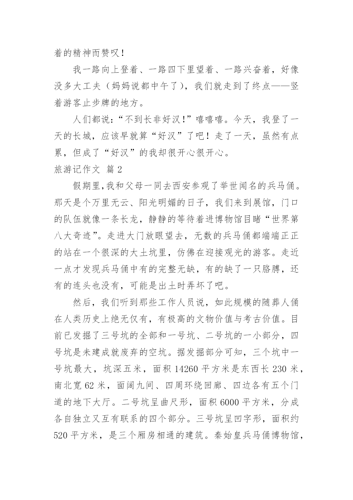 旅游记作文有关旅游记作文四篇在平平淡淡的学习、工作、生活中,说到作文,大家肯定都不陌生吧,作文可分为小学作文、中学作文、大学作文(论文)。相信写作文是一个让许多人都头痛的问题,以下是小编为大家整理的旅游记作文4篇,欢迎阅读与收藏。旅游记作文篇1哇噻!今天又是一个美丽的日子,一大早,妈妈就宣布——今天我们登长城!吃过早饭后,我们坐上公交车走啊走啊,走得在高速路上我都看到距呼和浩特还有400多公里的路标了居然还没到长城,又走了好一阵,车子终于“嘎吱”一声停了下来——八达岭长城到了。站在长城的脚下,我抬头望去,天呢!长城真比巨龙还巨龙呢!我使劲儿伸长脖子,用力眺望,也没能望到它的头和尾在哪儿,我想:就算我拿天文望远镜也不一定能望到它的尽头吧!我激动地看着想着走着,不知不觉已经登上了长城。沿着城墙,我一步步地往前上走,一步步的向上登,脑子里的疑问也在随着脚步往上升,“妈妈!”我终于忍不住问道:“这城墙上开着的往下斜的小洞是干嘛用的呀?还有这城墙为什么一凹一凸而不砌成齐刷刷的呢?是为了节省用料吗?”“呵呵。”妈妈笑道:“怎么会是为了节约用料呢?”长城是为了防御敌人入侵而修建的,长城上的所以设施都是为了更好地打击敌人,这城墙上凹进去的部分打仗时说不定可以做炮台呢!那些小洞。妈妈的话还没说完,我忽然灵机一动,激动地说道:“噢,那些小洞大概是躲在那儿射箭用的吧!”说着,我还做了个拉弓射箭的姿势,“妈妈,您看,这样既可以保证自己不受伤,又能狠狠地射击敌人,我说得没错吧?”我的.意地说道。“嗯,大概是吧!也或许还有别的用途。”我和妈妈一边走一边聊,一会儿的工夫,我们就来到了第一个烽火台。哇!这里风好大呀!据说烽火台主要是用于白天点烟或夜间点火来传递军情的,有了这么大的风,我想当年点烟时这里一定是浓烟滚滚,点火时也一定是火光冲天,军情传递的那是相当的及时吧!因为风大,虽然现在正值炎热的夏天,可来到这儿却好像进了冰窖一样,浑身凉飕飕的!站在烽火台的窗口,向远处望去,在延绵起伏的山上,“巨龙”仿佛走进了森林一般,到处都是生机勃勃的绿色。我和老妈坐在烽火台的石阶上歇了一会儿就继续往上登了。穿过一段斜坡,又登上一大截几乎陡成了90度的台阶,再爬上一段必须要抓着扶手才能走上的陡坡,我们终于来到了第二个烽火台。第三个烽火台。可越走我这心里越纳闷,我们空手登长城都这么费劲,这长城是咋修的呀?当时又没有吊车、挖掘机、推土机。古人居然修筑了令全世界瞩目的万里长城,想到这儿,我不得不为古人的聪明智慧和那种执着的精神而赞叹!我一路向上登着、一路四下里望着、一路兴奋着,好像没多大工夫(妈妈说都中午了),我们就走到了终点——竖着游客止步牌的地方。人们都说:“不到长非好汉!”嘻嘻嘻。今天,我登了一天的长城,应该早就算“好汉”了吧!走了一天,虽然有点累,但成了“好汉”的我却很开心很开心。旅游记作文篇2假期里,我和父母一同去西安参观了举世闻名的兵马俑。那天是个万里无云、阳光明媚的日子,我们来到展馆,门口的队伍就像一条长龙,静静的等待着进博物馆目睹“世界第八大奇迹”。走进大门放眼望去,无数的兵马俑都端端正正的站在一个很深的大土坑里,仿佛在迎接观光的游客。走近一点才发现兵马俑中有的完整无缺,有的缺了一只胳膊,还有的连头也没有,可能是出土时弄坏了吧。然后,我们听到那些工作人员说,如此规模的随葬人俑在人类历史上绝无仅有,有极高的文物价值与考古价值。目前已发掘了三号坑的全部和一号坑、二号坑的一小部分,四号坑是未建成就废弃的空坑。据发掘部分可知,三个坑中一号坑最大,坑深五米,面积14260平方米是东西长230米,南北宽62米,面阔九间、四周环绕回廊、四边各有五个门道的地下大厅。二号坑呈曲尺形,面积6000平方米,分成各自独立又互有联系的四个部分。三号坑呈凹字形,面积约520平方米,是三个厢房相通的建筑。秦始皇兵马俑博物馆,是建立在兵马俑坑原址上的遗址性博物馆。兵马俑已被誉为“世界第八大奇迹”,“二十世纪考古史上的伟大发现之一”。1987年12月,联合国教科文组织已将秦始皇陵(包括兵马俑坑)列入“世界文化遗产名录”。它不仅是中国人民、也是全人类的一份珍贵文化财富。秦始皇兵马俑博物馆的建立和发展,曾历经坎坷和艰辛,凝聚着许多人的心血和汗水。土坑里面埋藏着和真人、真马大小相似的陶俑、陶马个个栩栩如生,简直像一个模子刻出来的,真可以以假乱真了。这时我的心里又产生了和管理人员一样的感受,古代人民真聪明,绝不比现代人差。我又认真地参观起来,这是我才发现,这些兵马俑不仅栩栩如生,而且形态各异,变化多端。瞧,这些兵马俑排列有序,队形整齐,组成前锋、左右两翼及中部车与步兵排成主阵的庞大阵容。出土兵器多是实用的青铜兵器,个别的为铁器。咦,这个目视前方,抬头挺胸,那个抬起手臂,指着前方,好像在眺望远方。突然,