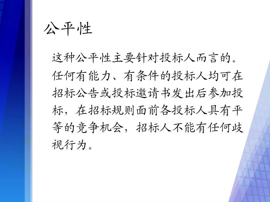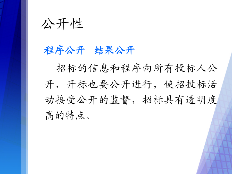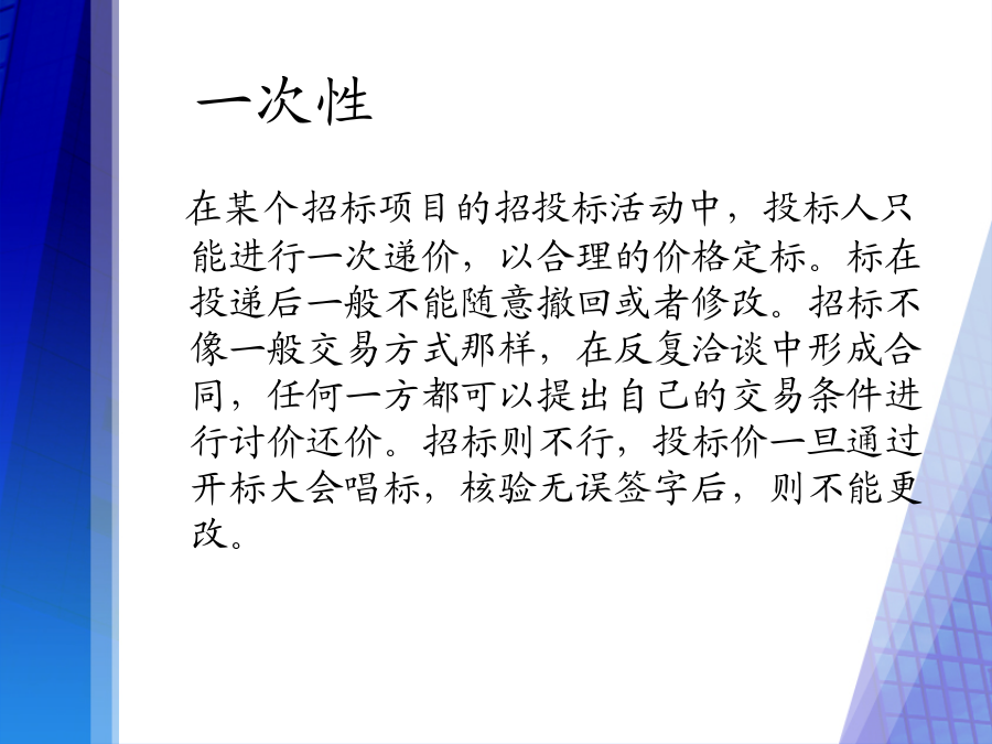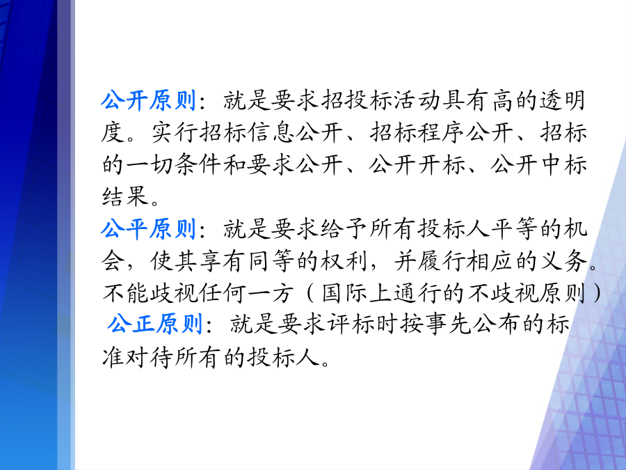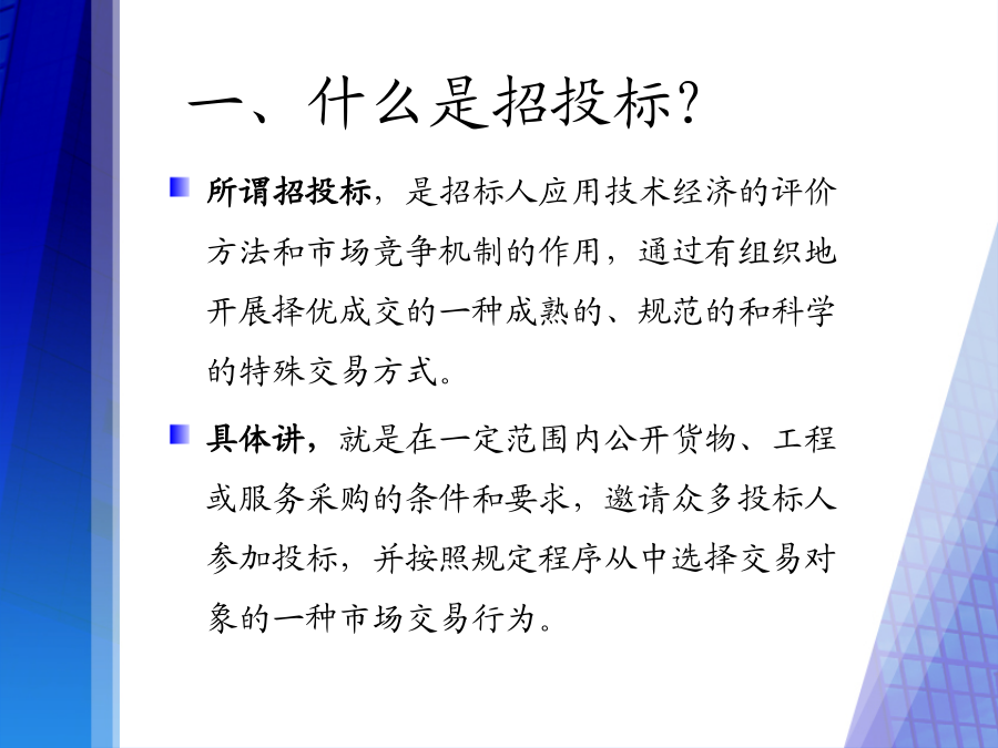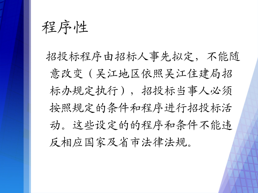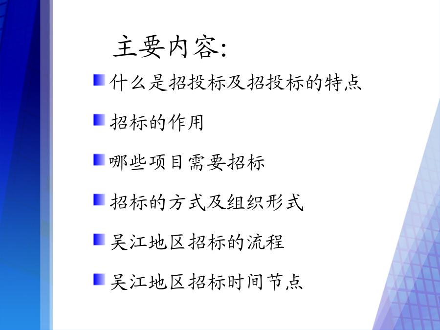 吴江招投标制度要点主要内容:一、什么是招投标?招标的特点(四大特征)程序性公开性一次性公平性招标的基本原则:公开原则:就是要求招投标活动具有高的透明度。实行招标信息公开、招标程序公开、招标的一切条件和要求公开、公开开标、公开中标结果。公平原则:就是要求给予所有投标人平等的机会,使其享有同等的权利,并履行相应的义务。不能歧视任何一方(国际上通行的不歧视原则)公正原则:就是要求评标时按事先公布的标准对待所有的投标人。诚实信用原则:就是我们平时讲的诚信原则。在招投标活动中诚信也还体现在不得规避招标、串通投标、泄漏标底、划小标段、骗取中标,非法允许转包等。二、招标的作用规范的招投标活动要求依法定的程序公开进行,是公开的竞争,有相当高的透明度,有利于防止采购中的不正当竞争、钱权交易、索贿受贿等非法和腐败行为。有利于深化企业改革,推进企业技术进步。实行招标采购,有利于企业提高资金利用率,提高技术引进的成功率和实用性,促进企业的消化吸收,推动企业技术进步;另一方面,投标方为中标成功,必然提供先进技术、合理价格,满足企业需求,从而激励企业重视技术进步,提高市场竞争力。三、哪些项目需要招标四、常用招标的方式单一来源采购(或议标):直接与选定的承包商进行协商签约,即为谈判性采购。最大的特点就是允许就报价及技术性条款进行一对一的谈判询价:直接向符合要求的供应商询问价格(不少于二家),以报价为依据确定供应商。公开招标与邀请招标的区别五、吴江地区招标的流程及时间节点第一阶段:立项一个项目的建立,首先要有必要的审批,核准或备案手续,其次要有必要的资金来源。滨投集团主要形式为政府采购项目,即由财政部或地方财政厅预算部门批准。在立项工作细节中应注意以下问题:可行性研究报告中将招标范围、招标方式(公开招标或邀请招标)、招标组织形式(自行招标或委托招标)等有关招标内容报住建局核准。住建局应当将核准招标内容意见抄送纪委监察部门。需审批项目的《可研报告》包括项目的《初步设计书》以及《环境评估报告》时,应该注意突出项目的节能性和环境保护性。第二阶段:委托招标代理小型项目或者特殊项目,可向太湖新城小型招标委员会申请小型招标流程。其他项目则应委托招标代理作为中介为其办理所有招标事宜。填写申请表于城投造价科处,确定招标代理单位。在委托招标代理时,应要注意以下问题:招标公司应该具有我国相关管理部门核发的适合项目性质的相当资质等级的《资质证书》;招标公司为项目所安排的项目经理等人员的一般经验和类似项目经验符合要求;业主与招标公司之间的工作分工应该在《委托代理协议》中给予明确规定;常规招标代理工作范围:1)拟定招标方案,编制和出售招标文件和资格预审文件;2)审查投标人资格;3)划分施工界面、编制标底;4)组织投标人踏勘现场;5)组织开标,评标,协助招标人定标;6)招标人委托的其它事宜(如:发中标通知)第三阶段:准备招标文件招标文件基本上由商务和技术两部分所组成,两个部分既有不同又互相有联系,要避免在内容中出现互相矛盾的描述。项目专业技术工程师和成本管理组应当仔细核查标书的各细节,避免出现矛盾,发标以后无法弥补。招标文件一般包括下列内容:(1)投标邀请书;(2)投标人须知;(3)投标文件格式;(4)技术规格、参数及其他要求;(5)评标标准和方法;(6)合同主要条款。招标文件编制的其他注意点:招标项目需要划分标段的,招标人应合理划分标段,确定各标段的界面范围,并在招标文件中如实载明。划分标段的注意事项:(1)必须有利于整体项目进度控制、成本控制;(2)必须有利于项目整体与局部风格对应。第四阶段:发布招标公告(1)招标人的名称和地址;(2)招标货物的名称、数量、技术规格、资金来源;(3)交货的地点和时间;(4)获取招标文件或者资格预审文件的地点和时间;(5)对招标文件或者资格预审文件收取的费用;(6)提交资格预审申请书或者投标文件的地点和截止日期;(7)对投标人的资格要求。注:公告的发布要根据我国有关招标管理部门的规定,在国家制定的报刊或信息网络上刊登公告。吴江住建网(http://www.jswjcin.gov.cn/wjjs/default.aspx)吴江日报(http://epaper.wjdaily.com/html/2013-06/18/node_2.htm)第五阶段:发售标书招标人应当按招标公告或者投标邀请书规定的时间、地点发出招标文件或者资格预审文件。自招标文件或者资格预审文件发出之日起至停止发出之日止,最短不得少于五个工作日。发售标书时注意点:(1)任何投标人都有权在购买标书之前前来查看标书,以确定自己是否有资格投标;(2)标书的售价只可以包含标书的工本费和邮寄费。(3)招标文件