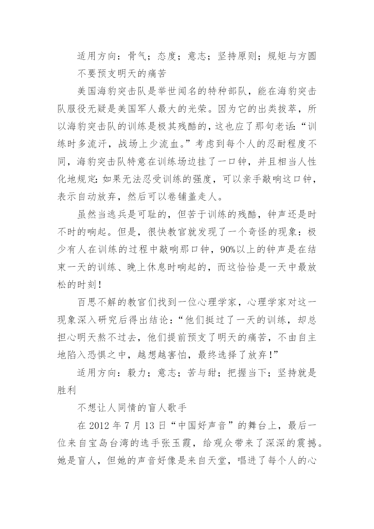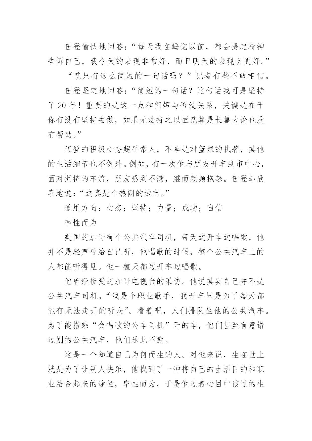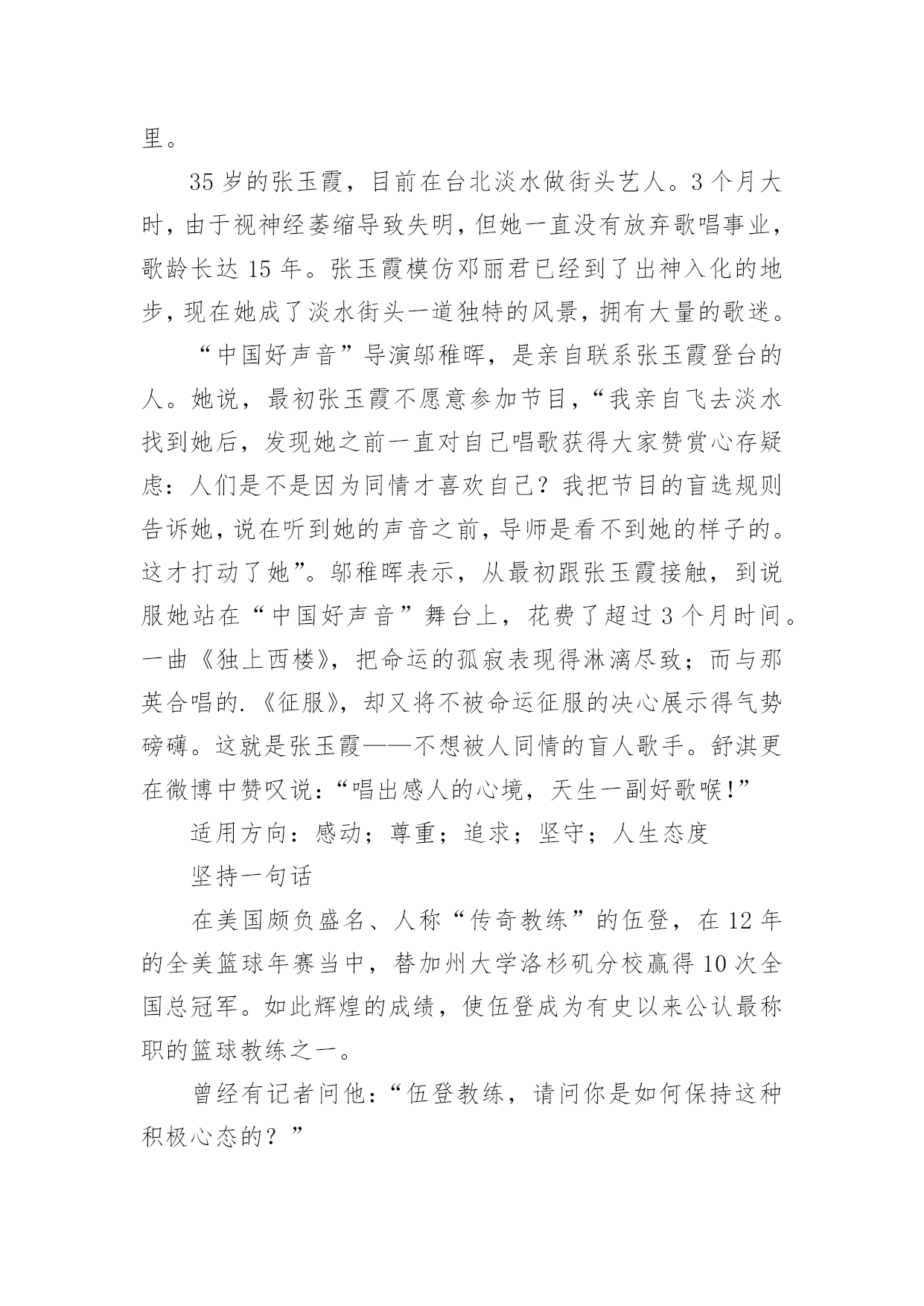 优秀高考作文素材优秀高考作文素材精选以下是cnfla小编为大家整理的作文素材,欢迎阅读。苏雄的傲气现任BBDO广告公司亚太区董事长的苏雄认为:如果每一个广告公司都坚持自己的原则,那么整个广告圈的环境也就可以健康起来。而现在的情况是你不做,后面有一大堆公司在排队。他说:“前段时间,我们在台湾的分公司出了这样一件事,我们有一个已经服务了10年的客户,他们的成功可以说有一半是我们服务的功劳,前段时间他们提出比稿(即广告公司为客户产品所做的市场预测报告,可以由广告公司主动来做,也可按客户的要求来做),比稿后,他们要求谈价钱,但并没有按照比稿的结果来比较价格,而是让所有参加比稿的公司一起报价,结果另一家国际广告公司报出的是我们原先收费三分之一的价格,客户问我能不能出比他们还低的价钱,我当即决定这笔业务不做了,尽管他们占了台湾公司50%的业务额,但是我觉得作为广告人我们要有这个骨气。”国有国法,行有行规。不按规矩出牌,最终损害的将是整体的利益。有些人和企业只图一时的获利,缺乏长远的眼光,因小失大,最终难以做大做强。适用方向:骨气;态度;意志;坚持原则;规矩与方圆不要预支明天的痛苦美国海豹突击队是举世闻名的特种部队,能在海豹突击队服役无疑是美国军人最大的光荣。因为它的出类拔萃,所以海豹突击队的训练是极其残酷的,这也应了那句老话:“训练时多流汗,战场上少流血。”考虑到每个人的忍耐程度不同,海豹突击队特意在训练场边挂了一口钟,并且相当人性化地规定:如果无法忍受训练的强度,可以亲手敲响这口钟,表示自动放弃,然后可以卷铺盖走人。虽然当逃兵是可耻的,但苦于训练的残酷,钟声还是时不时的响起。但是,很快教官就发现了一个奇怪的现象:极少有人在训练的过程中敲响那口钟,90%以上的钟声是在结束一天的训练、晚上休息时响起的,而这恰恰是一天中最放松的时刻!百思不解的教官们找到一位心理学家,心理学家对这一现象深入研究后得出结论:“他们挺过了一天的训练,却总担心明天熬不过去,他们提前预支了明天的痛苦,不由自主地陷入恐惧之中,越想越害怕,最终选择了放弃!”适用方向:毅力;意志;苦与甜;把握当下;坚持就是胜利不想让人同情的盲人歌手在2012年7月13日“中国好声音”的舞台上,最后一位来自宝岛台湾的选手张玉霞,给观众带来了深深的震撼。她是盲人,但她的声音好像是来自天堂,唱进了每个人的心里。35岁的张玉霞,目前在台北淡水做街头艺人。3个月大时,由于视神经萎缩导致失明,但她一直没有放弃歌唱事业,歌龄长达15年。张玉霞模仿邓丽君已经到了出神入化的地步,现在她成了淡水街头一道独特的风景,拥有大量的歌迷。“中国好声音”导演邬稚晖,是亲自联系张玉霞登台的人。她说,最初张玉霞不愿意参加节目,“我亲自飞去淡水找到她后,发现她之前一直对自己唱歌获得大家赞赏心存疑虑:人们是不是因为同情才喜欢自己?我把节目的盲选规则告诉她,说在听到她的声音之前,导师是看不到她的样子的。这才打动了她”。邬稚晖表示,从最初跟张玉霞接触,到说服她站在“中国好声音”舞台上,花费了超过3个月时间。一曲《独上西楼》,把命运的孤寂表现得淋漓尽致;而与那英合唱的.《征服》,却又将不被命运征服的决心展示得气势磅礴。这就是张玉霞——不想被人同情的盲人歌手。舒淇更在微博中赞叹说:“唱出感人的心境,天生一副好歌喉!”适用方向:感动;尊重;追求;坚守;人生态度坚持一句话在美国颇负盛名、人称“传奇教练”的伍登,在12年的全美篮球年赛当中,替加州大学洛杉矶分校赢得10次全国总冠军。如此辉煌的成绩,使伍登成为有史以来公认最称职的篮球教练之一。曾经有记者问他:“伍登教练,请问你是如何保持这种积极心态的?”伍登愉快地回答:“每天我在睡觉以前,都会提起精神告诉自己,我今天的表现非常好,而且明天的表现会更好。”“就只有这么简短的一句话吗?”记者有些不敢相信。伍登坚定地回答:“简短的一句话?这句话我可是坚持了20年!重要的是这一点和简短与否没关系,关键是在于你有没有坚持去做,如果无法持之以恒就算是长篇大论也没有帮助。”伍登的积极心态超乎常人,不单是对篮球的执著,其他的生活细节也不例外。例如,有一次他与朋友开车到市中心,面对拥挤的车流,朋友感到不满,继而频频抱怨。伍登却欣喜地说:“这真是个热闹的城市。”适用方向:心态;坚持;力量;成功;自信率性而为美国芝加哥有个公共汽车司机,每天边开车边唱歌,他并不是轻声哼给自己听,他唱歌的时候,整个公共汽车上的人都能听得见。他一整天都边开车边唱歌。他曾经接受芝加哥电视台的采访。他说其实自己并不是公共汽车司机,“我是个职业歌手,我开车只是为了每天都能有无法走开的听众”。看着吧,人们排队坐他的公共汽车。为了能搭乘“会唱歌的公车司机”开的车,他们甚至有意错过别的公共汽车,他们乐此不疲。这是一个知道自己为何而生的人。对他来