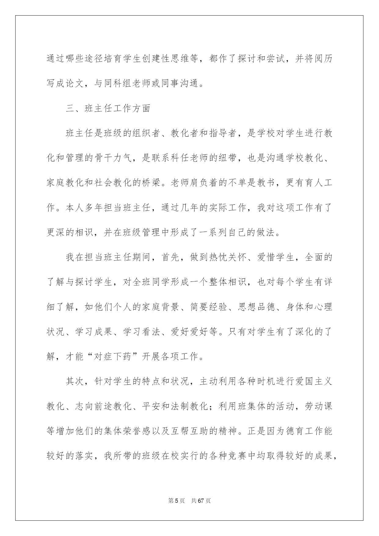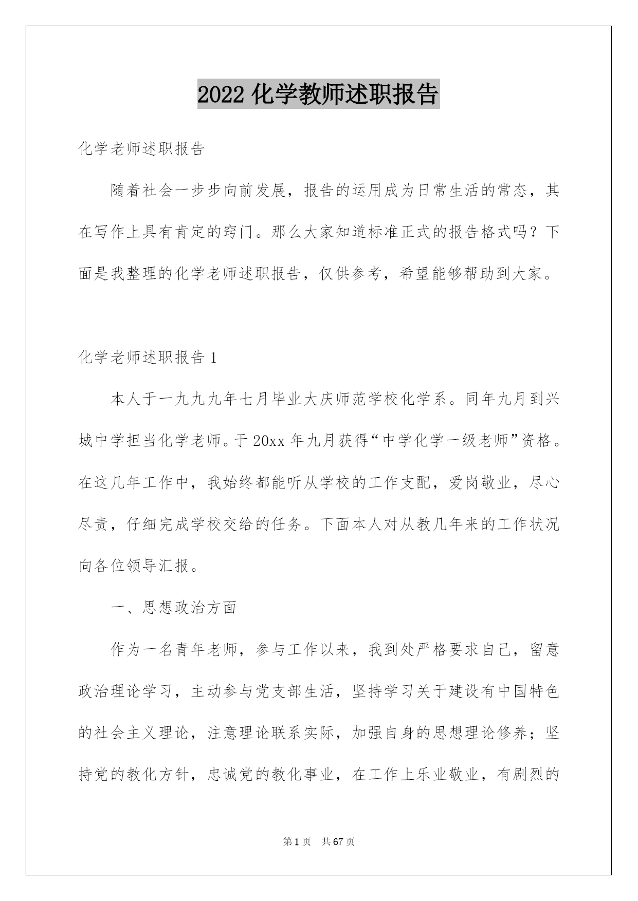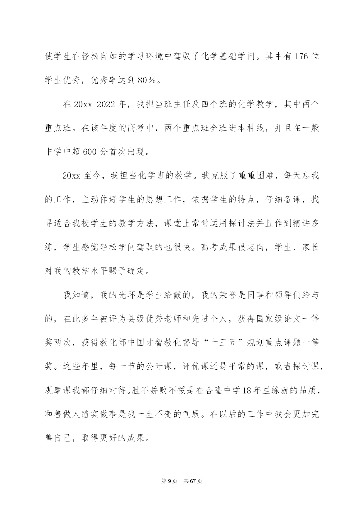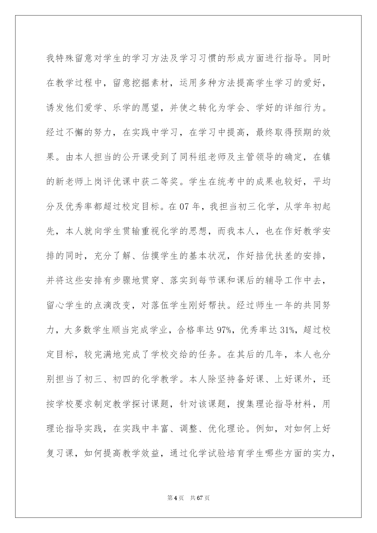 第PAGE\*Arabic\*MERGEFORMAT67页共NUMPAGES\*Arabic\*MERGEFORMAT67页第PAGE\*MERGEFORMAT67页共NUMPAGES\*MERGEFORMAT67页第PAGE\*MERGEFORMAT67页共NUMPAGES\*MERGEFORMAT67页第PAGE\*MERGEFORMAT67页共NUMPAGES\*MERGEFORMAT67页第PAGE\*MERGEFORMAT67页共NUMPAGES\*MERGEFORMAT67页第PAGE\*MERGEFORMAT67页共NUMPAGES\*MERGEFORMAT67页第PAGE\*MERGEFORMAT67页共NUMPAGES\*MERGEFORMAT67页第PAGE\*MERGEFORMAT67页共NUMPAGES\*MERGEFORMAT67页第PAGE\*MERGEFORMAT67页共NUMPAGES\*MERGEFORMAT67页第PAGE\*MERGEFORMAT67页共NUMPAGES\*MERGEFORMAT67页第PAGE\*MERGEFORMAT67页共NUMPAGES\*MERGEFORMAT67页2022化学教师述职报告化学老师述职报告随着社会一步步向前发展,报告的运用成为日常生活的常态,其在写作上具有肯定的窍门。那么大家知道标准正式的报告格式吗?下面是我整理的化学老师述职报告,仅供参考,希望能够帮助到大家。化学老师述职报告1本人于一九九九年七月毕业大庆师范学校化学系。同年九月到兴城中学担当化学老师。于20xx年九月获得“中学化学一级老师”资格。在这几年工作中,我始终都能听从学校的工作支配,爱岗敬业,尽心尽责,仔细完成学校交给的任务。下面本人对从教几年来的工作状况向各位领导汇报。一、思想政治方面作为一名青年老师,参与工作以来,我到处严格要求自己,留意政治理论学习,主动参与党支部生活,坚持学习关于建设有中国特色的社会主义理论,注意理论联系实际,加强自身的思想理论修养;坚持党的教化方针,忠诚党的教化事业,在工作上乐业敬业,有剧烈的事业心和责任感,满腔热忱地投身到工作中。与学校领导、同事间保持融洽协作的关系,使自己的教学工作在大家的支持和帮助下得以顺当进行。在工作中我坚持做到为人师表,关切学生,帮助学生养成精益求精、肃穆仔细、一丝不苟的良好习惯,做到管教管导,言传身教,教书育人,得到学校领导、同事和学生的确定和好评。二、教学、教研方面老师总是通过所任教的学科进行教学和教化活动,引导学生相识世界,发展智力,培育高尚品德和情操的。所以我认为,衡量一个老师优秀与否的最重要因素教学水平的凹凸,而要有较高的教学水平,就必需有扎实的专业学问、教学基本功和教学的艺术。为此我把初中到中学的化学课本进行深化细致的阅读、探讨,并把高校学问与中学学问相联系,力求追根溯源,融会贯穿;在教学基本功方面,我特殊留意在语言表达实力、组织管理实力、书写实力,总结实力方面下功夫;在教学方法及艺术方面,我虚心向有阅历的老师请教,主动听课,仔细阅读有关教化教学的书籍杂志,努力提高教学艺术。作为一名工作阅历不够丰富的青年老师,我始终都坚持学习教化教学理论,并于一九九九年五月报考化学教学的本科自考学习,三年来都坚持利用课余时间自学,以使自己有更高的理论水平来指导更好地开展教学工作。并于20xx年七月以优秀成果顺当毕业。俗话说“好的起先是胜利的一半”,我决心要为自己的教学工作开创一个良好的开端。于是我主动从几方面做好:(1)仔细备好每节课。“磨刀不误砍柴功”。课上得好与坏,备课是关键。每备一节课,本人都花费较多的时间去分析教材、钻研大纲、学习教参、钻研教法。并多从学生“学”的角度去考虑怎样上好一节课,做到既备教材、又备学生;既备教法又备学法,为上课作好充分打算;(2)多听同科组或其他科组老师的优质课,学习别人丰富的教学阅历。每学期都先后在本校或其他兄弟学校听课三十多节,学到了许多学生时代学不到的珍贵的实际操作阅历,使自己的教学快速走向成熟;(3)主动试行各种教学方法,以提高学生学习化学的爱好,进而提高教学质量。化学科的内容一下子比初中加大加深了很多,许多即使在初中成果较好的同学,都因为在初三学不好,而导致整个初中阶段的化学都学不好,从而使成果急转直下。针对这种状况,在教学上,我特殊留意对学生的学习方法及学习习惯的形成方面进行指导。同时在教学过程中,留意挖掘素材,运用多种方法提高学生学习的爱好,诱发他们爱学、乐学的愿望,并使之转化为学会、学好的详细行为。经过不懈的努力,在实践中学习,在学习中